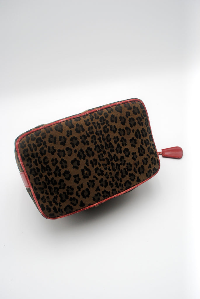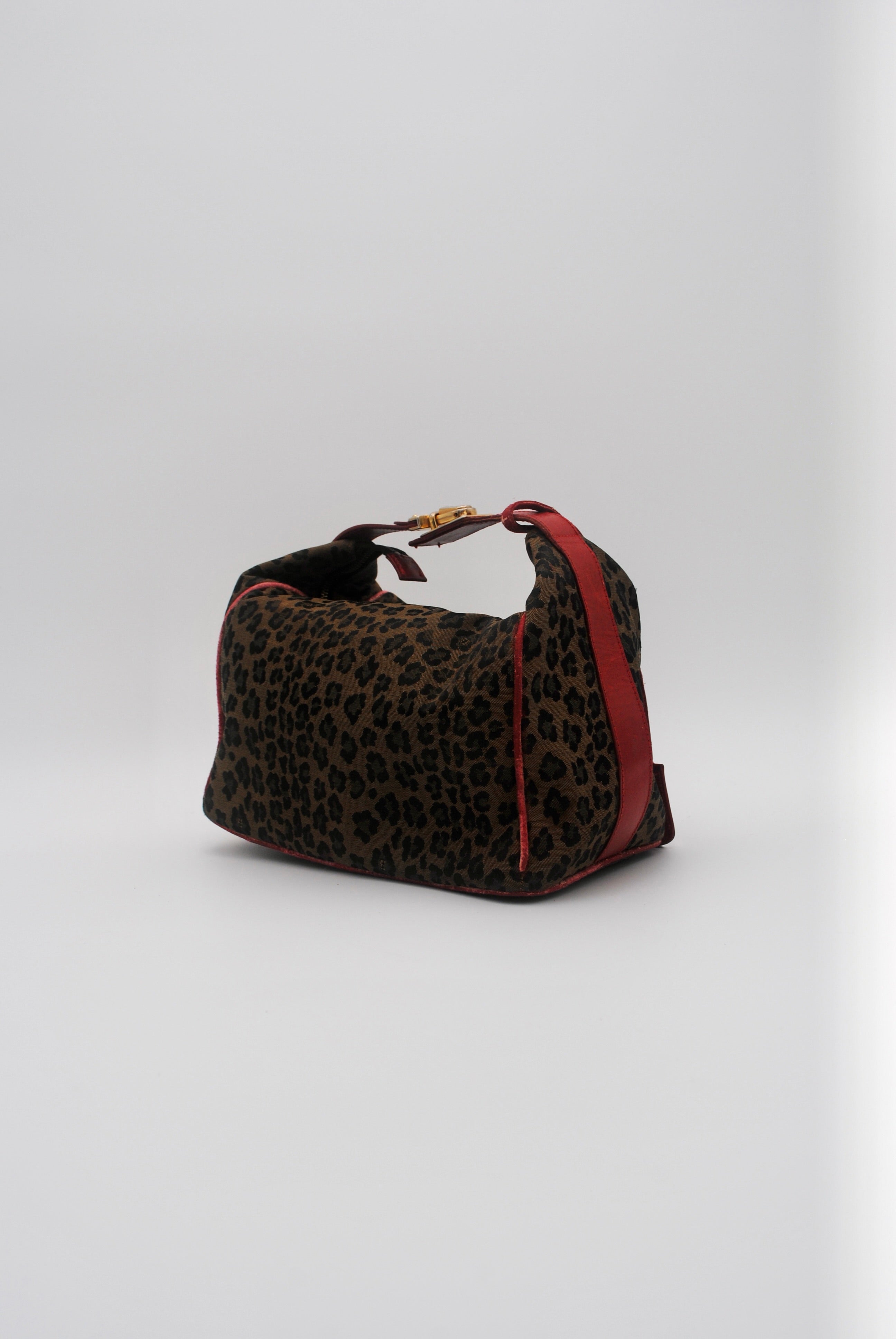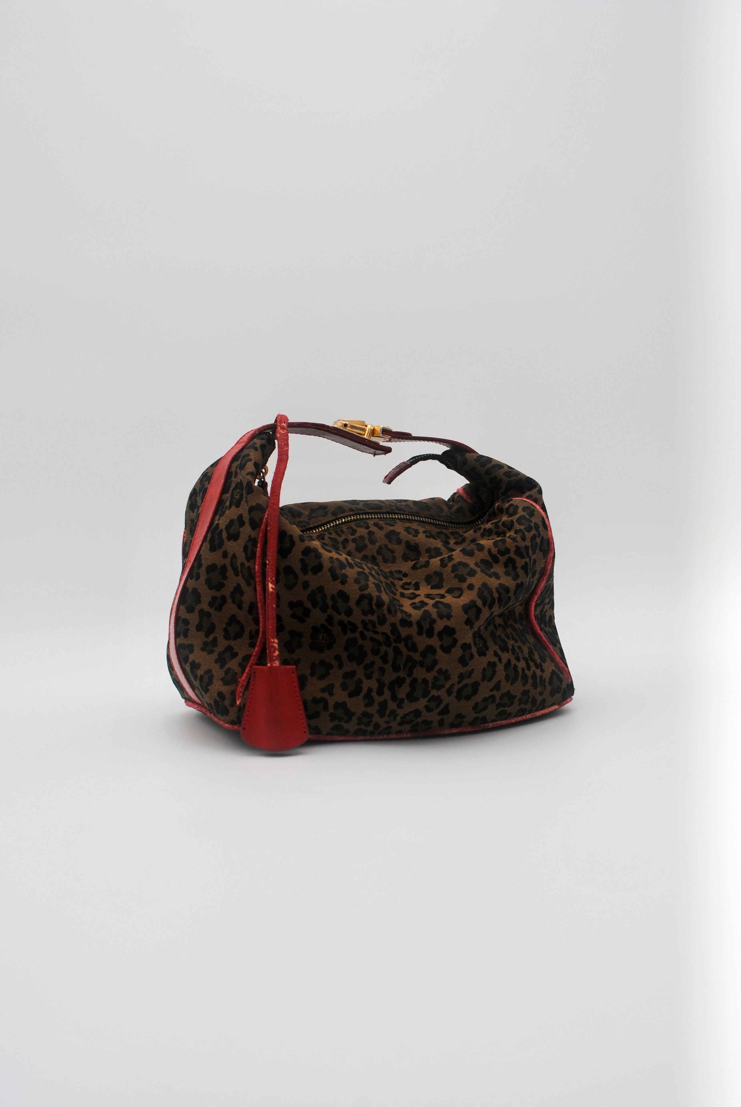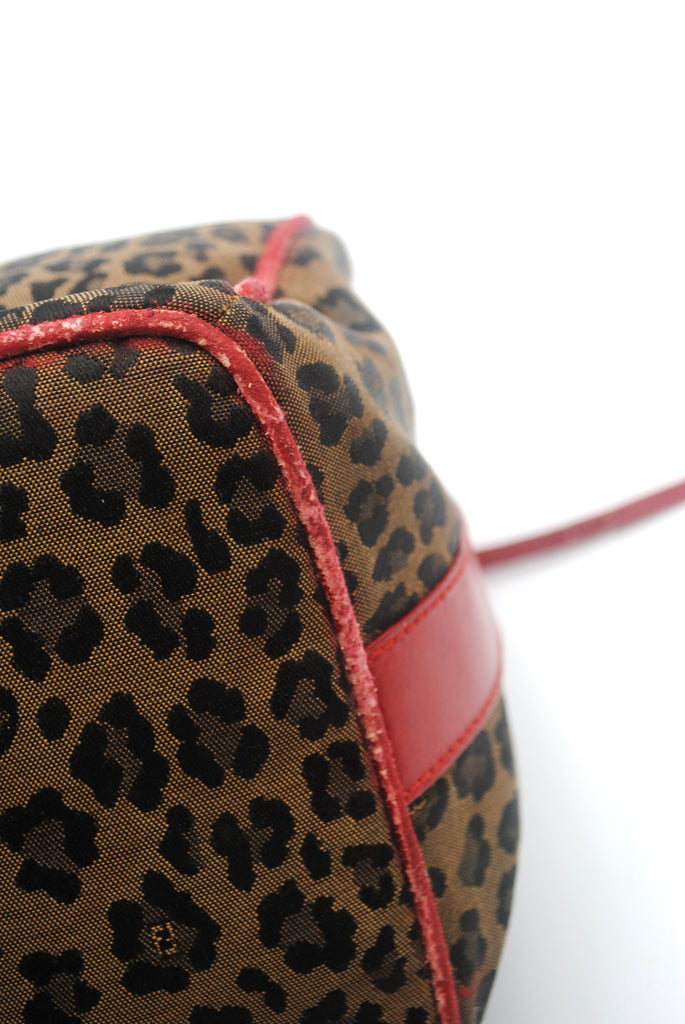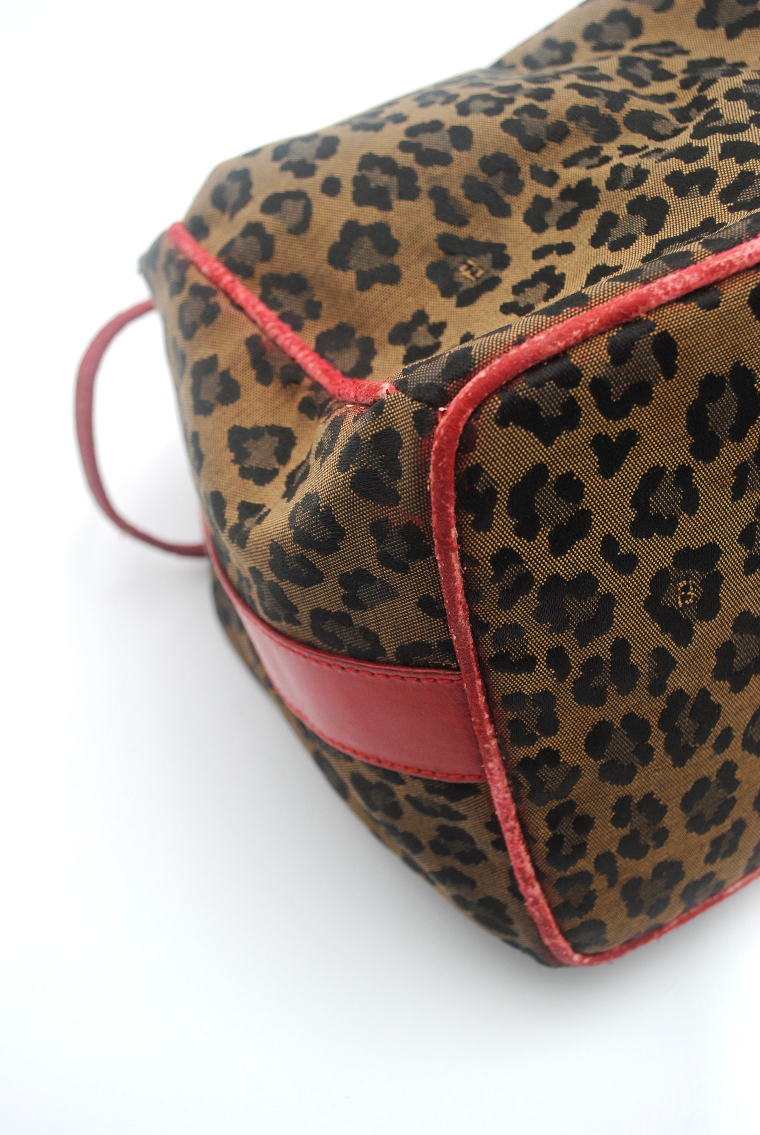 Tweedehands FENDI leopard bag met een rode leren strap met een slotje incl de sleutel, deze werkt ook nog. De tas sluit met een rits en heeft één binnenvakje met rits. Het item verkeert in een vintage staat, met gebruikssporen en wat slijtage. de tas wordt geleverd in onze mooie Moon flower dustbag.
