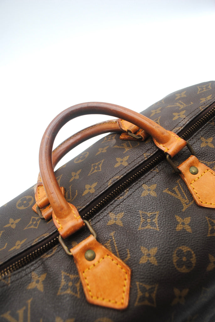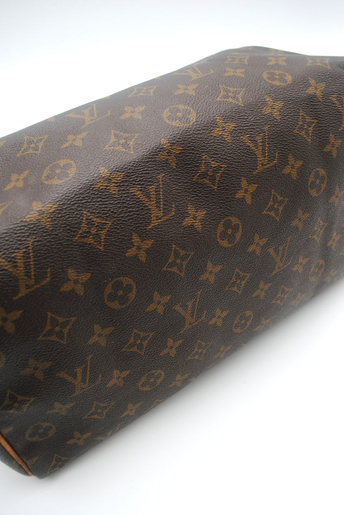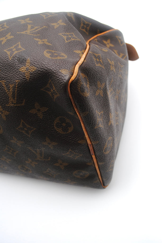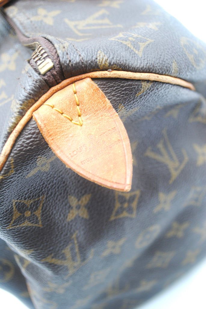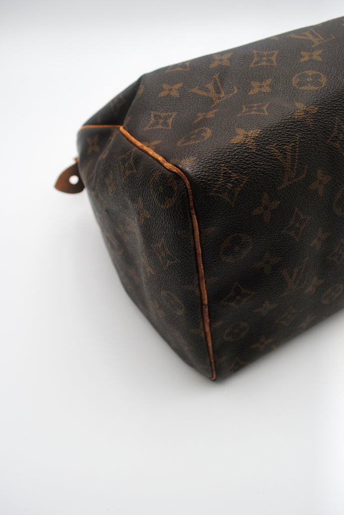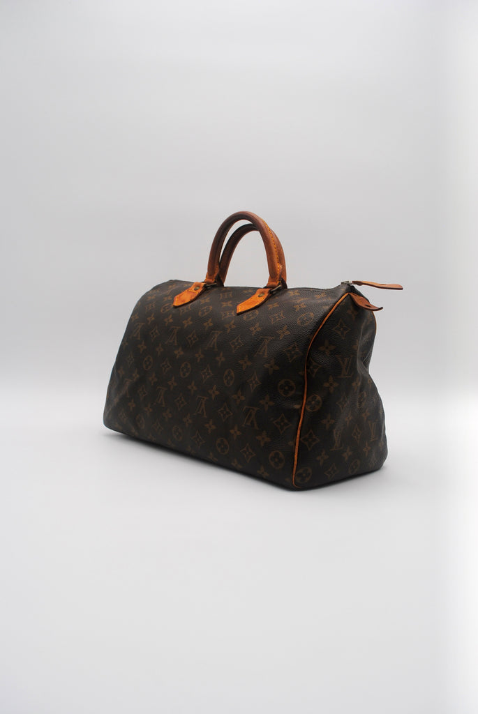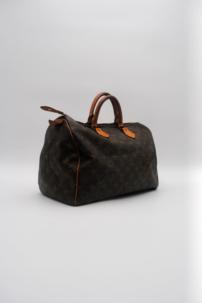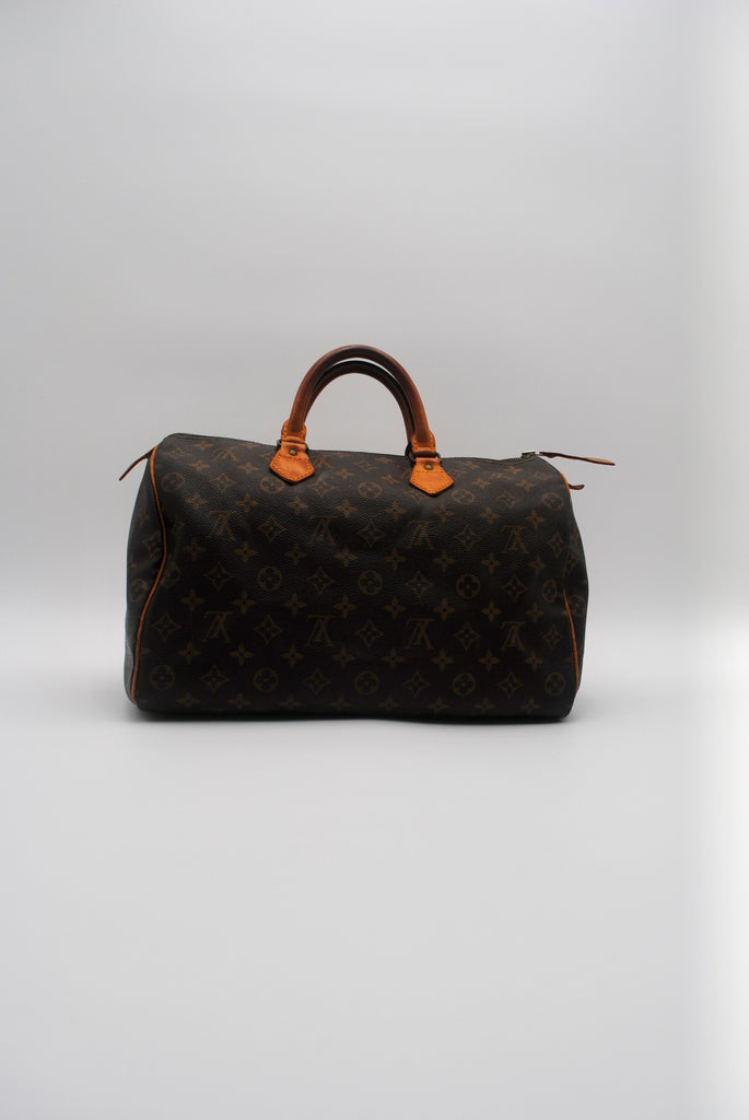Tweedehands LOUIS VUITTON Monogram Speedy 35 bag en gouden hardware. Er past een kleine laptop in de tas. Het item verkeert in een zeer goede vintage staat, met algemene gebruikssporen. De tas wordt geleverd in onze mooie Moon flower dustbag.