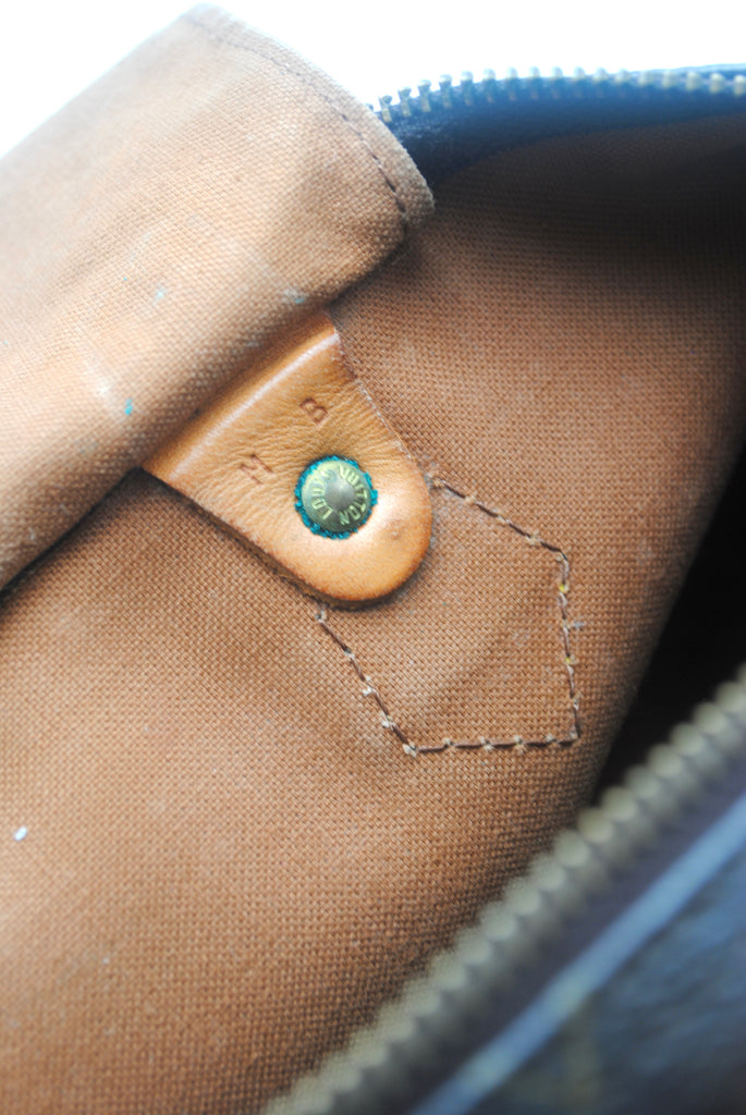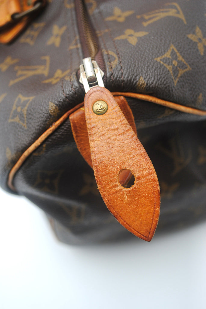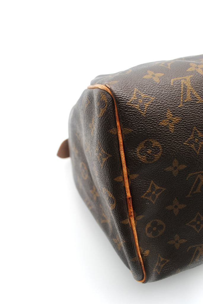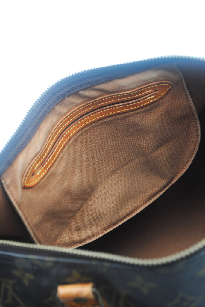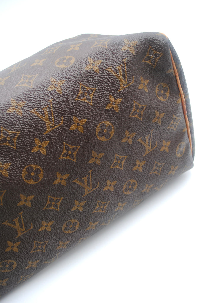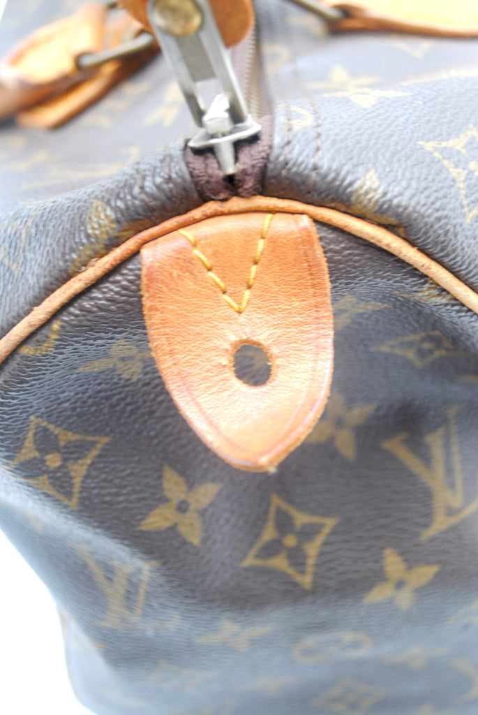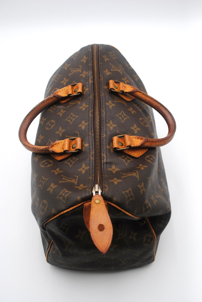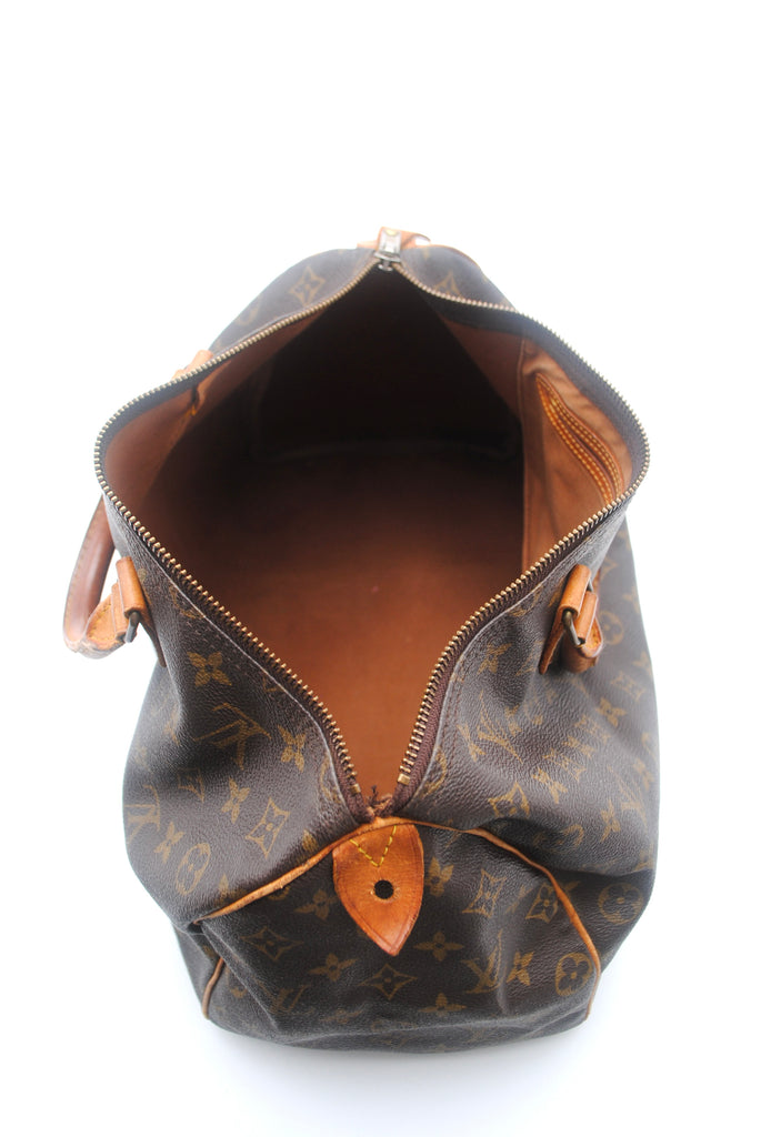 Tweedehands LOUIS VUITTON Monogram Speedy 35 bag en gouden hardware. Er past een kleine laptop in de tas. Het item verkeert in een zeer goede vintage staat, met algemene gebruikssporen. De tas wordt geleverd in onze mooie Moon flower dustbag.