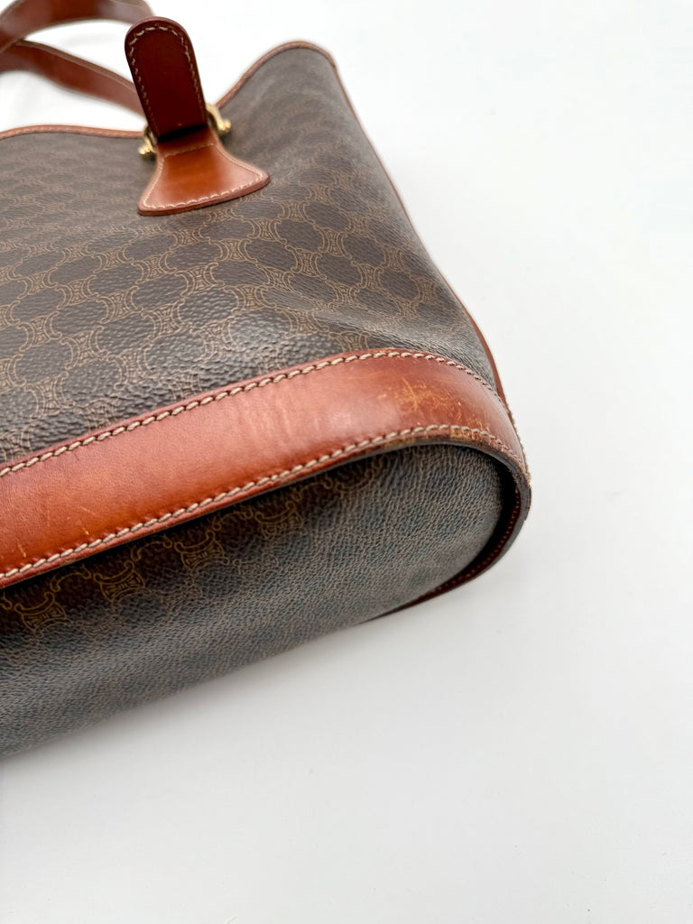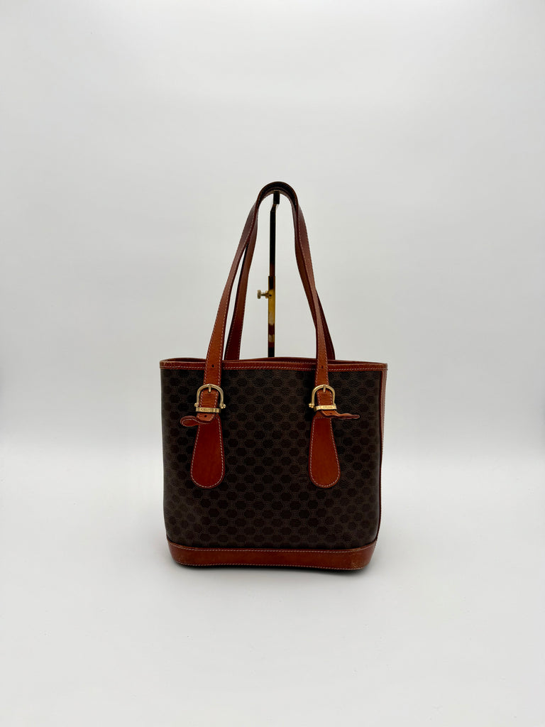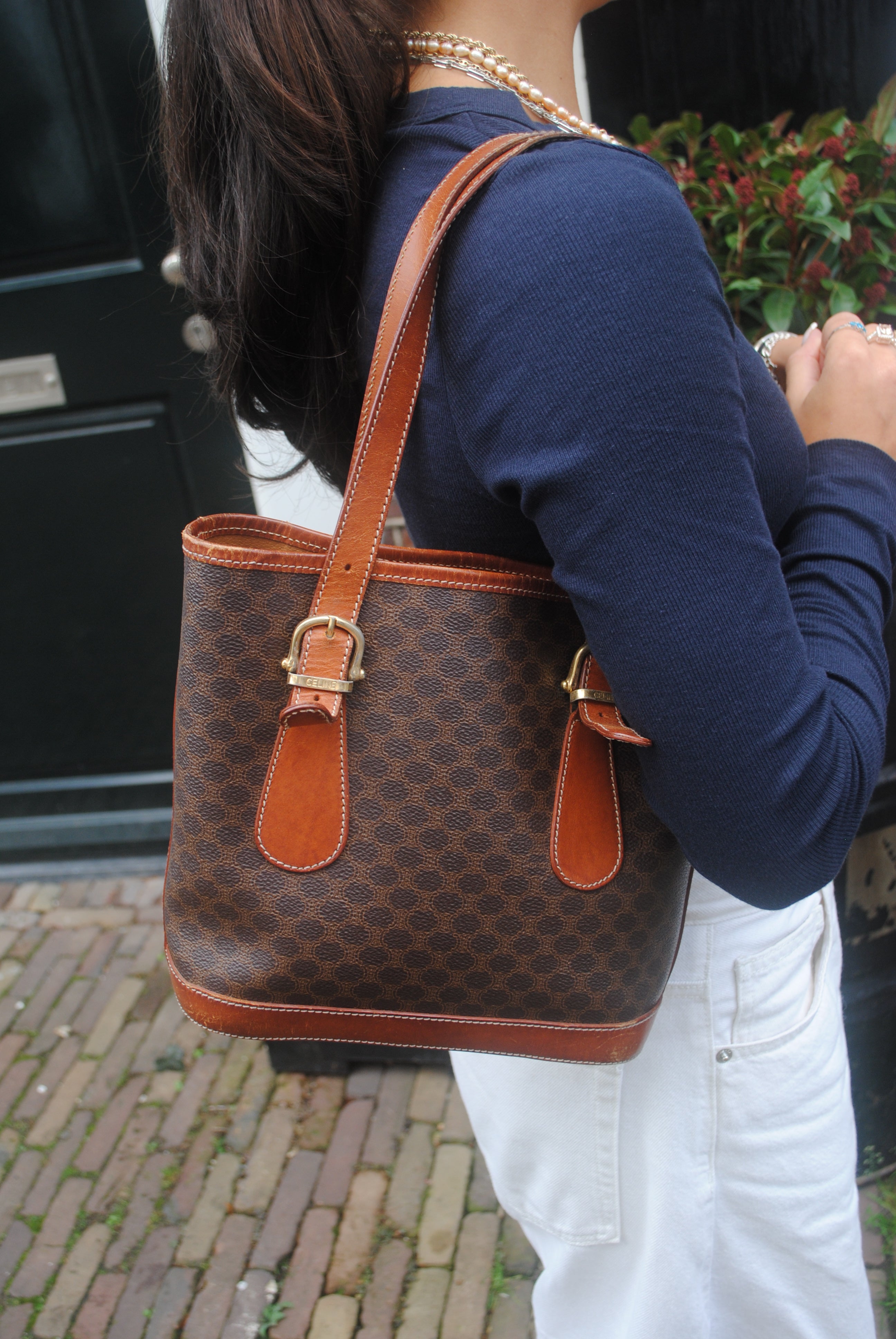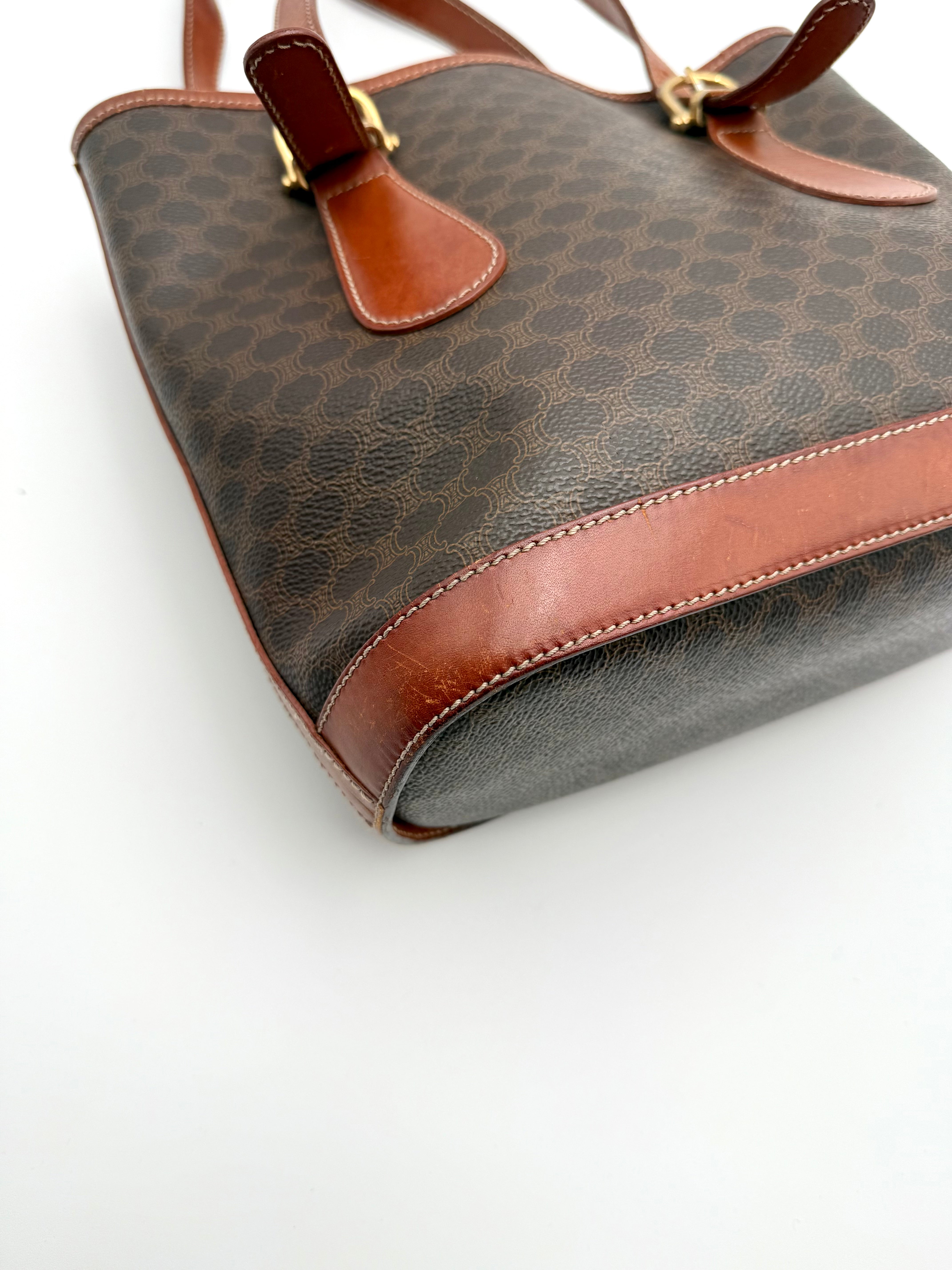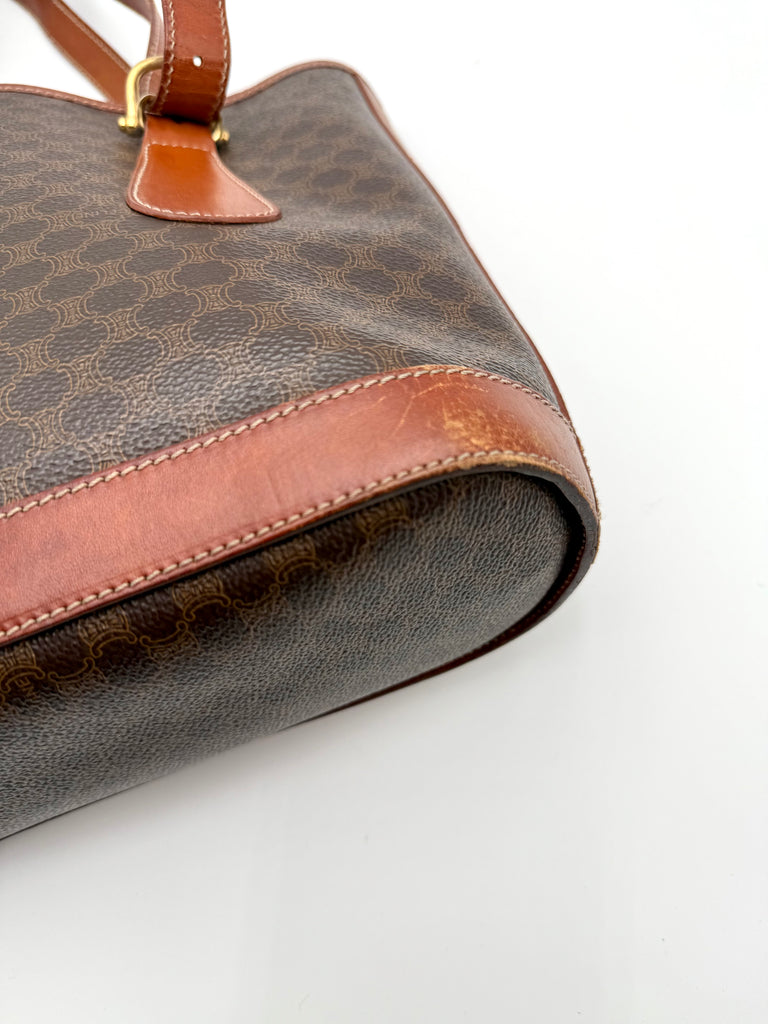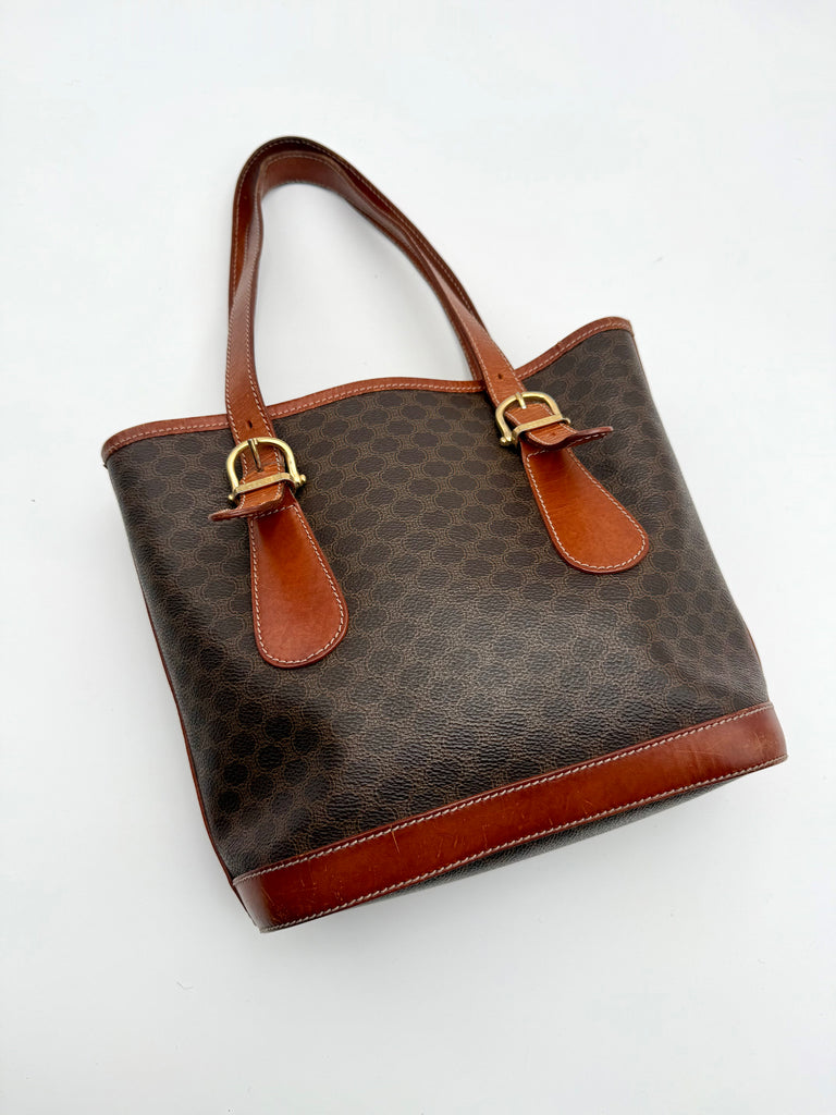 Tweedehands CELINE macadam canvas tote bag met leren handvaten. De tas beschikt over drie binnenvakken waarvan één met rits. Het item verkeert in een zeer goede vintage staat, met algemene gebruikssporen. De tas wordt geleverd in onze mooie Moon flower dustbag.