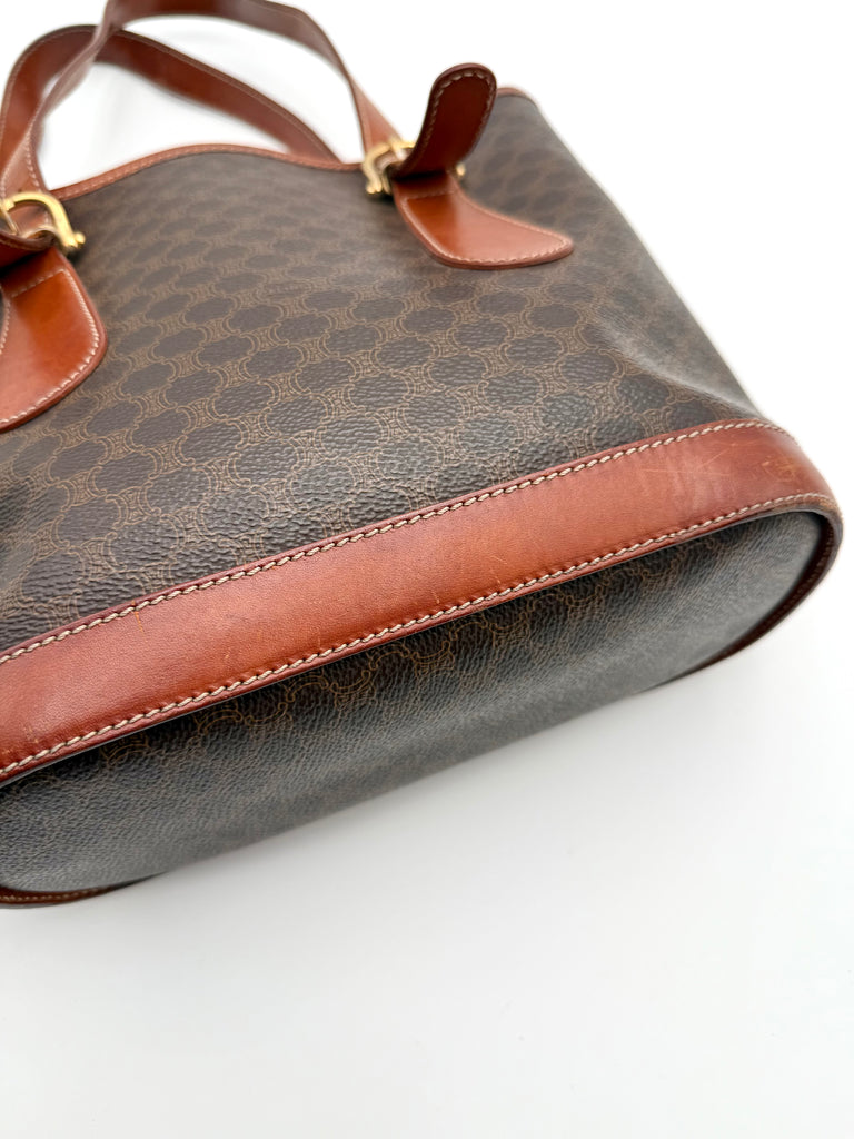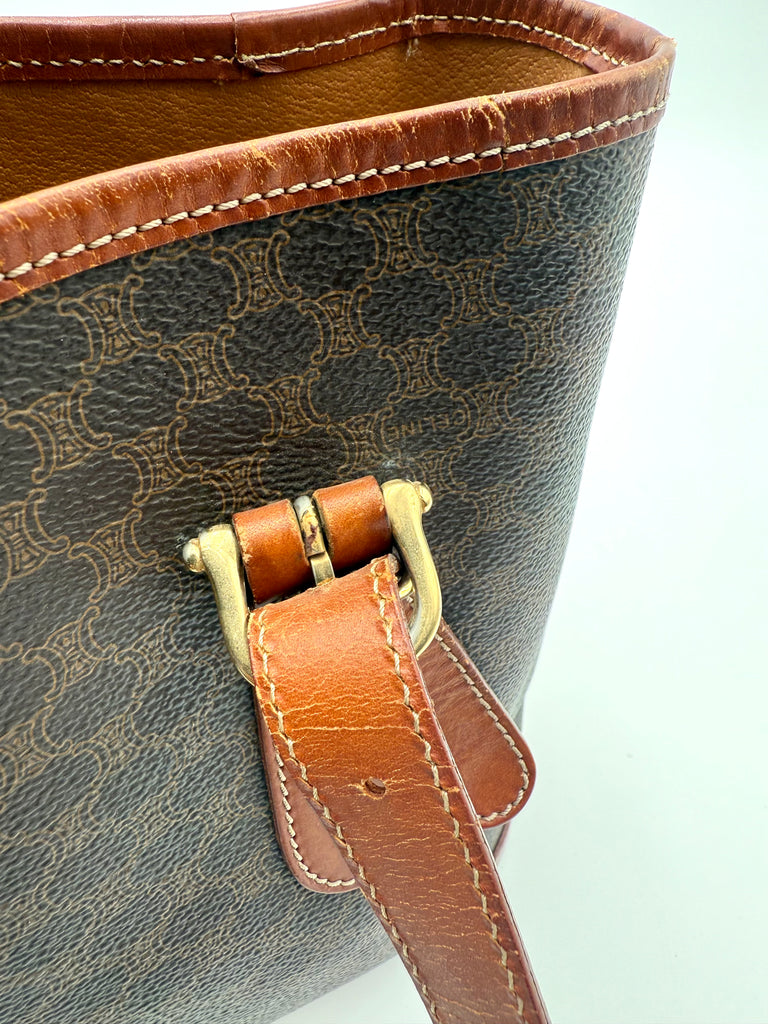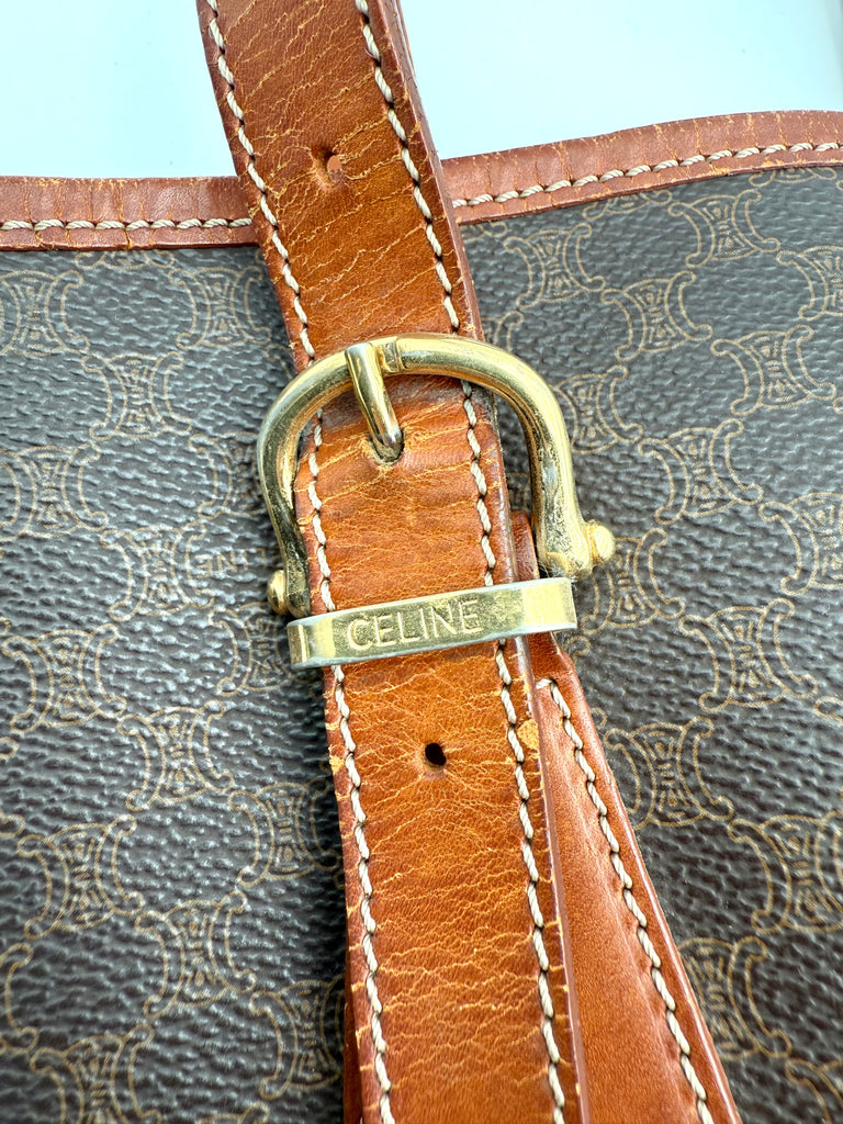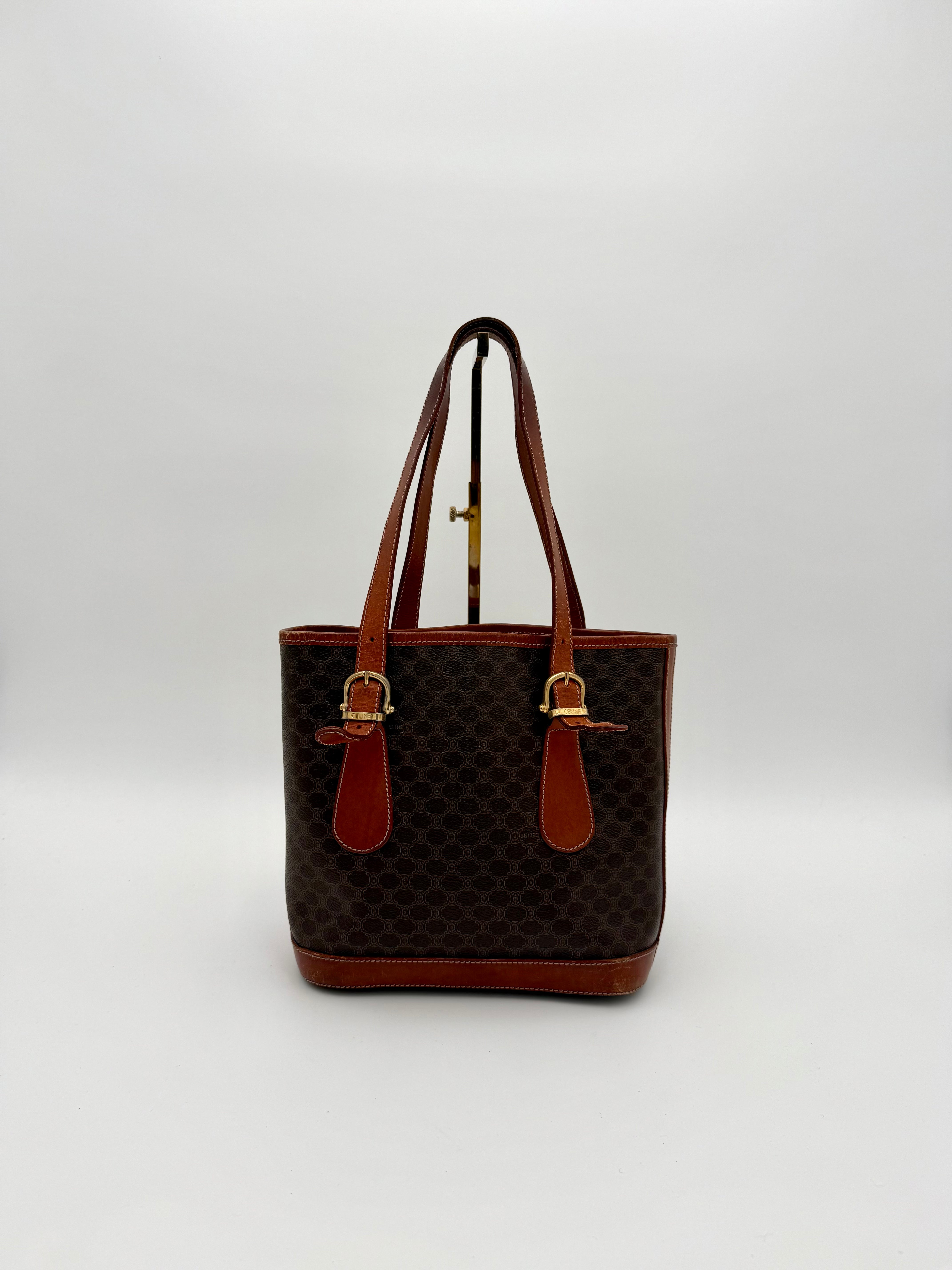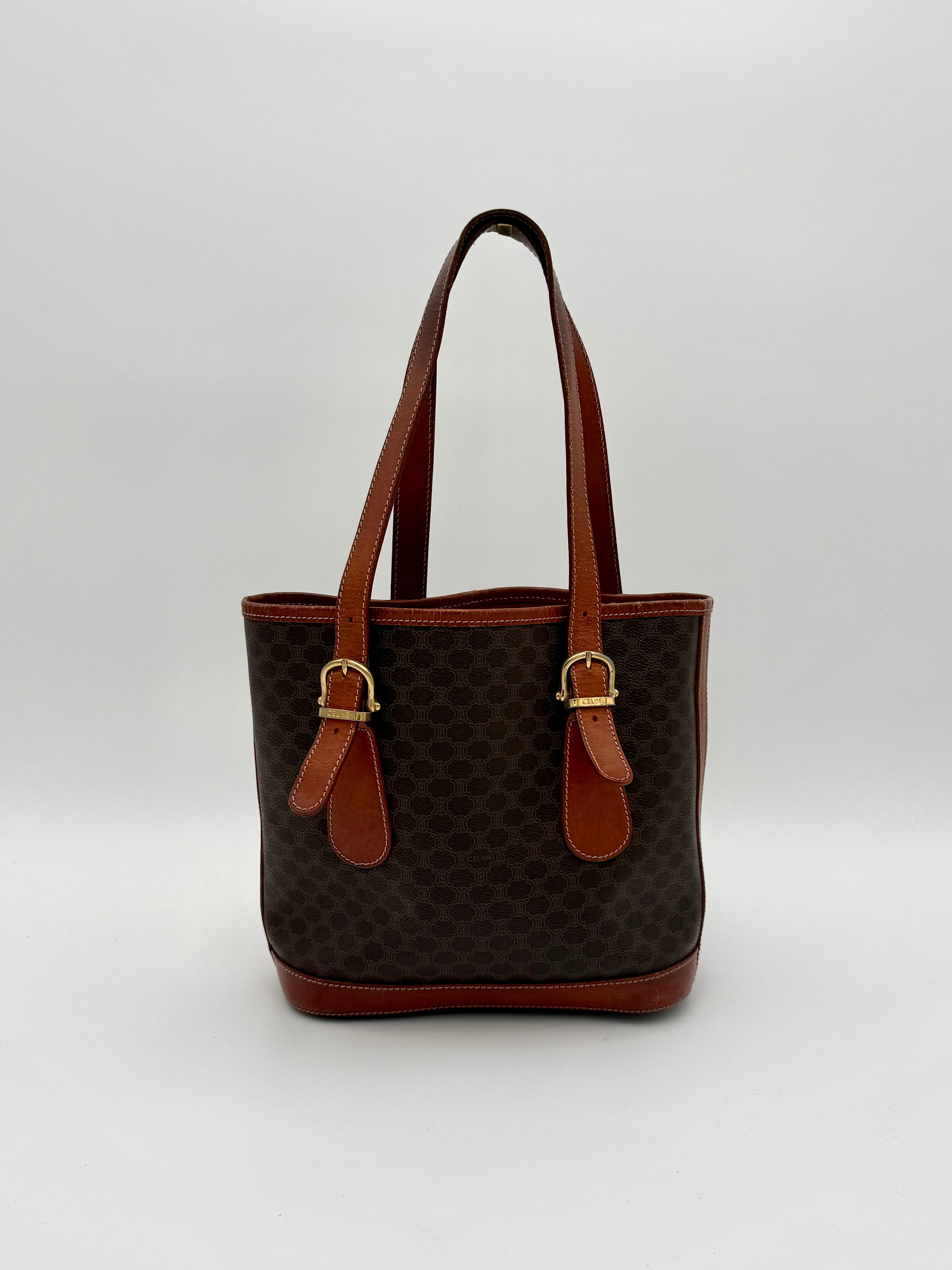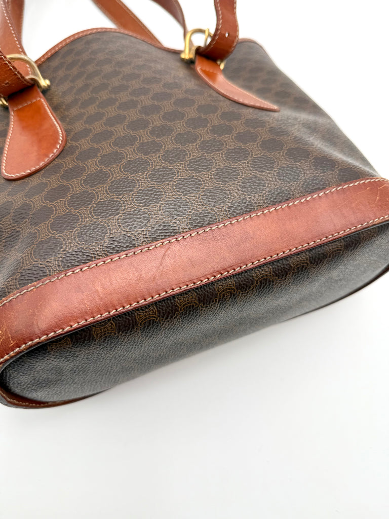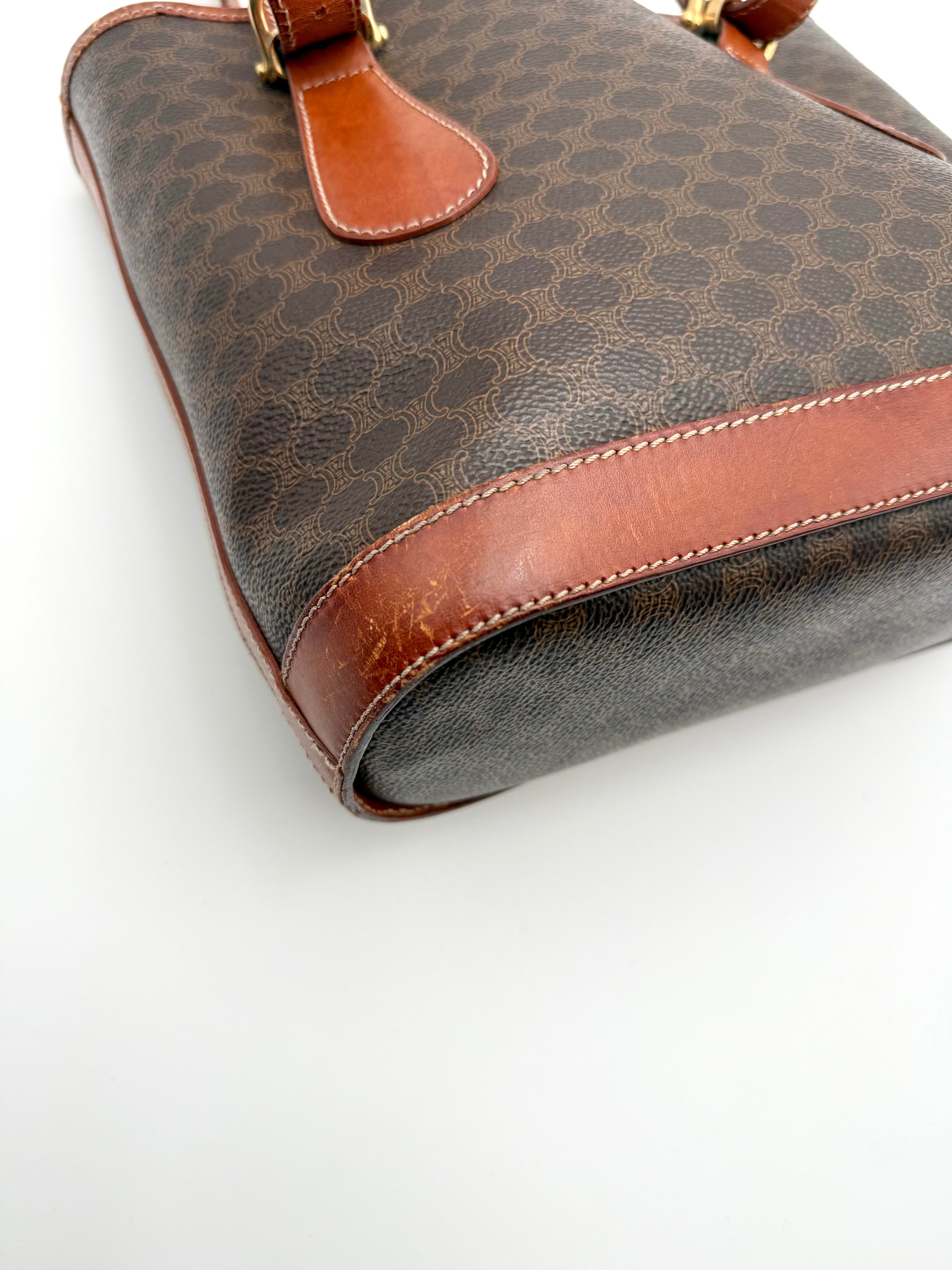 Tweedehands CELINE macadam canvas tote bag met leren handvaten. De tas beschikt over drie binnenvakken waarvan één met rits. Het item verkeert in een zeer goede vintage staat, met algemene gebruikssporen. De tas wordt geleverd in onze mooie Moon flower dustbag.