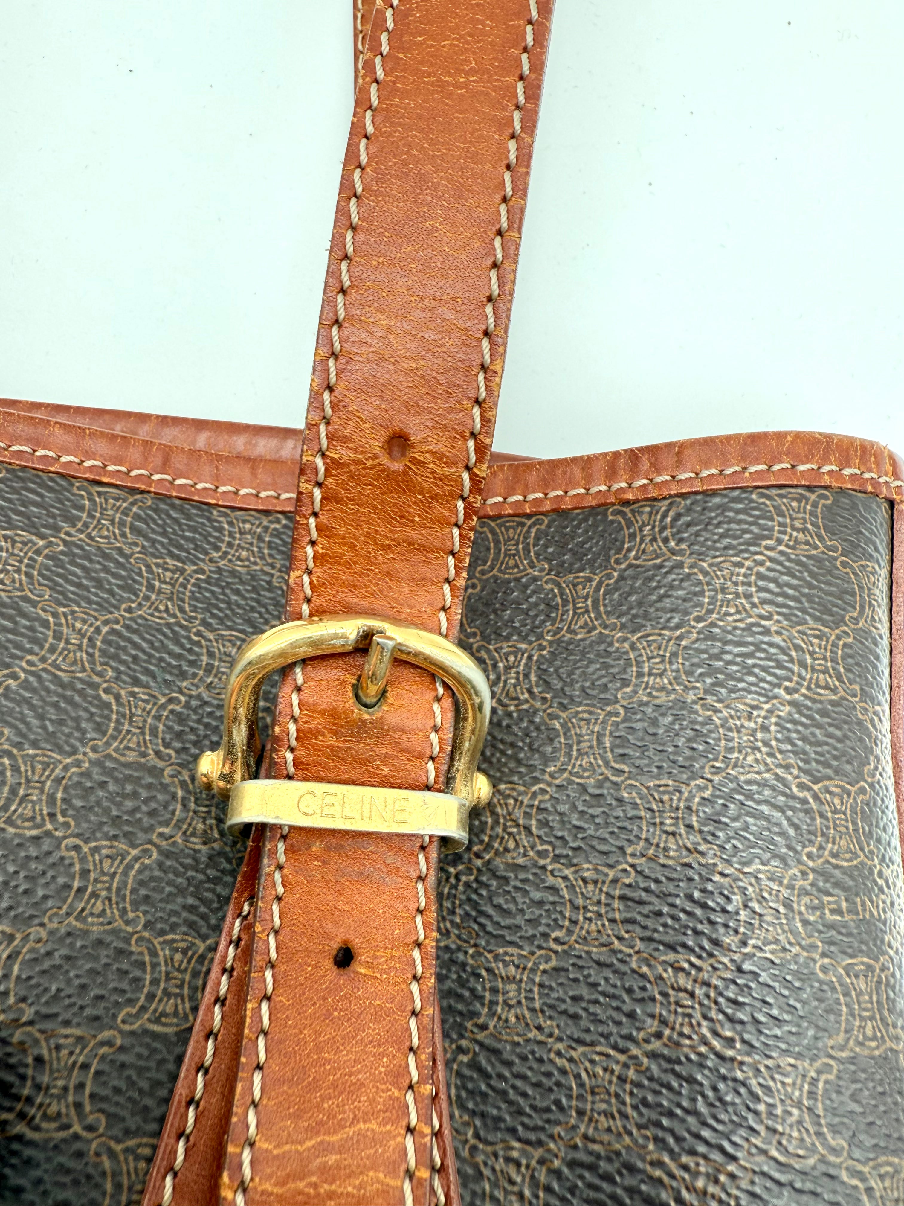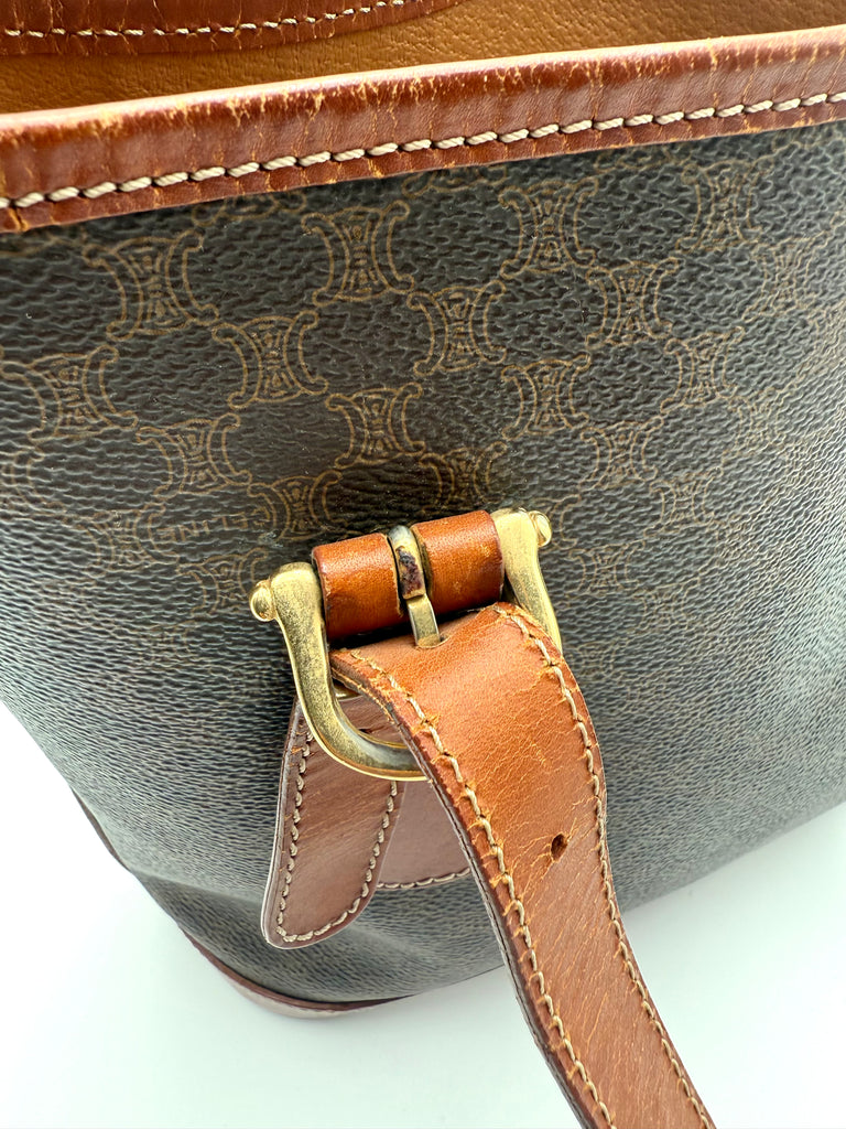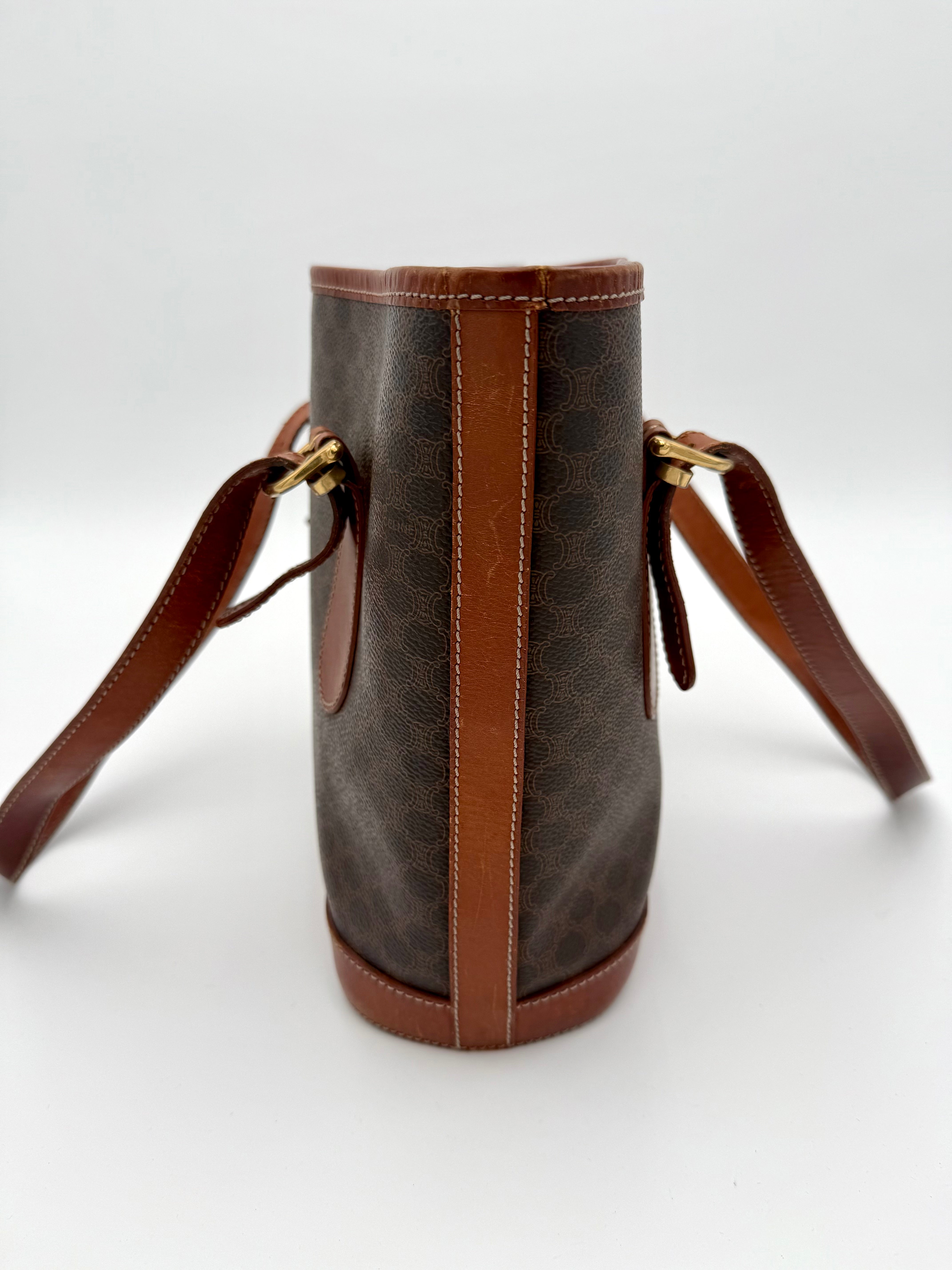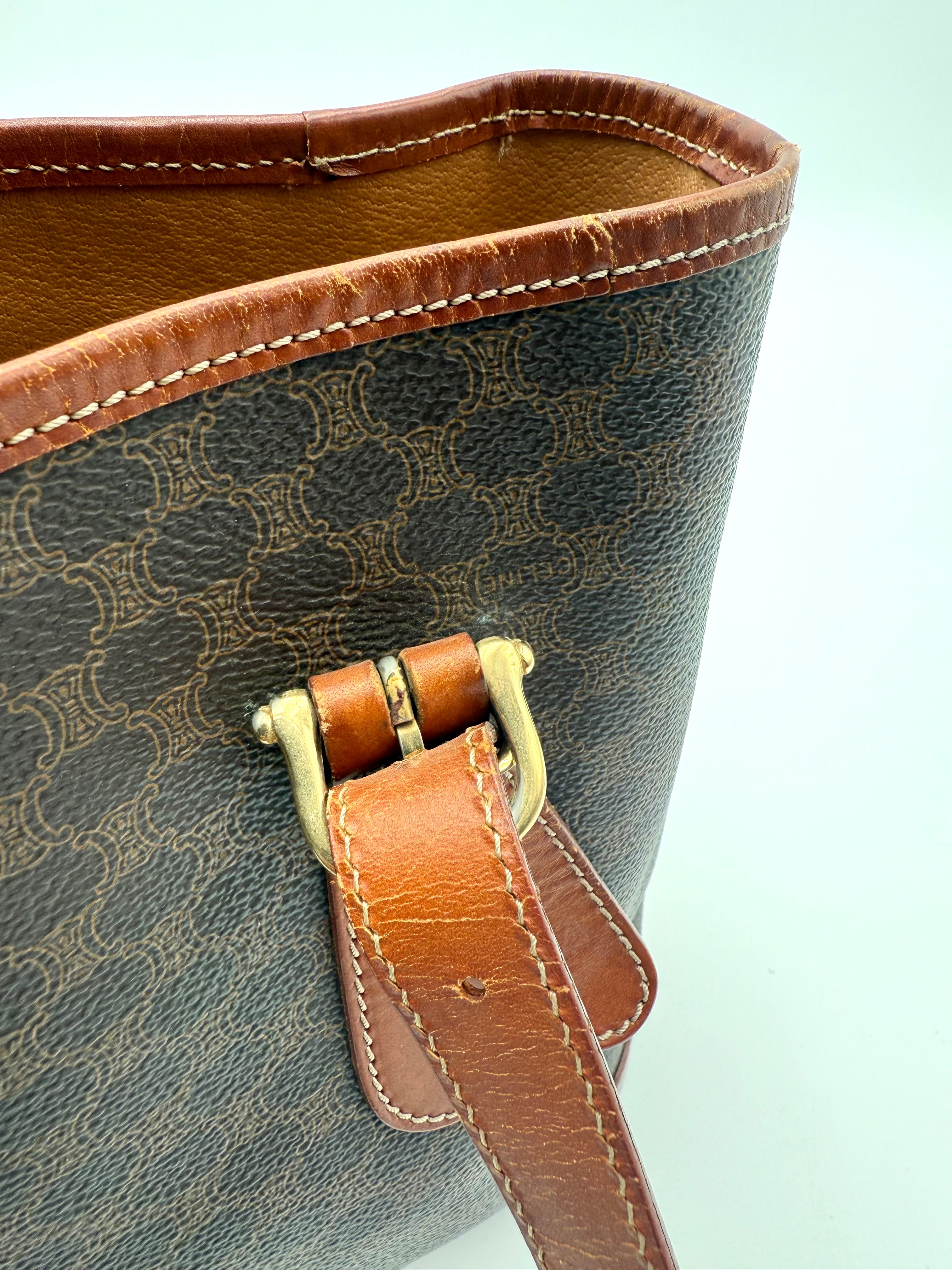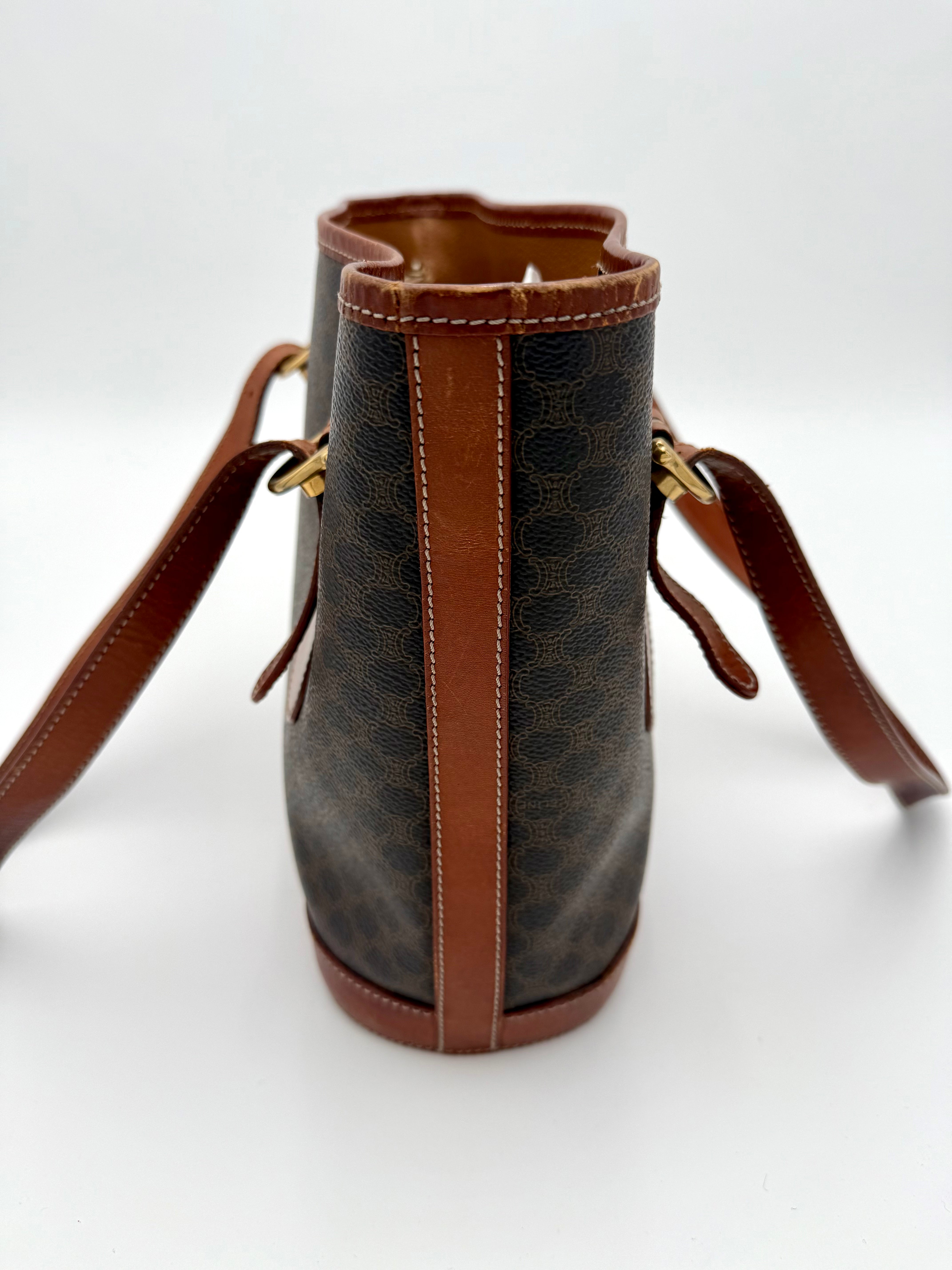 Tweedehands CELINE macadam canvas tote bag met leren handvaten. De tas beschikt over drie binnenvakken waarvan één met rits. Het item verkeert in een zeer goede vintage staat, met algemene gebruikssporen. De tas wordt geleverd in onze mooie Moon flower dustbag.