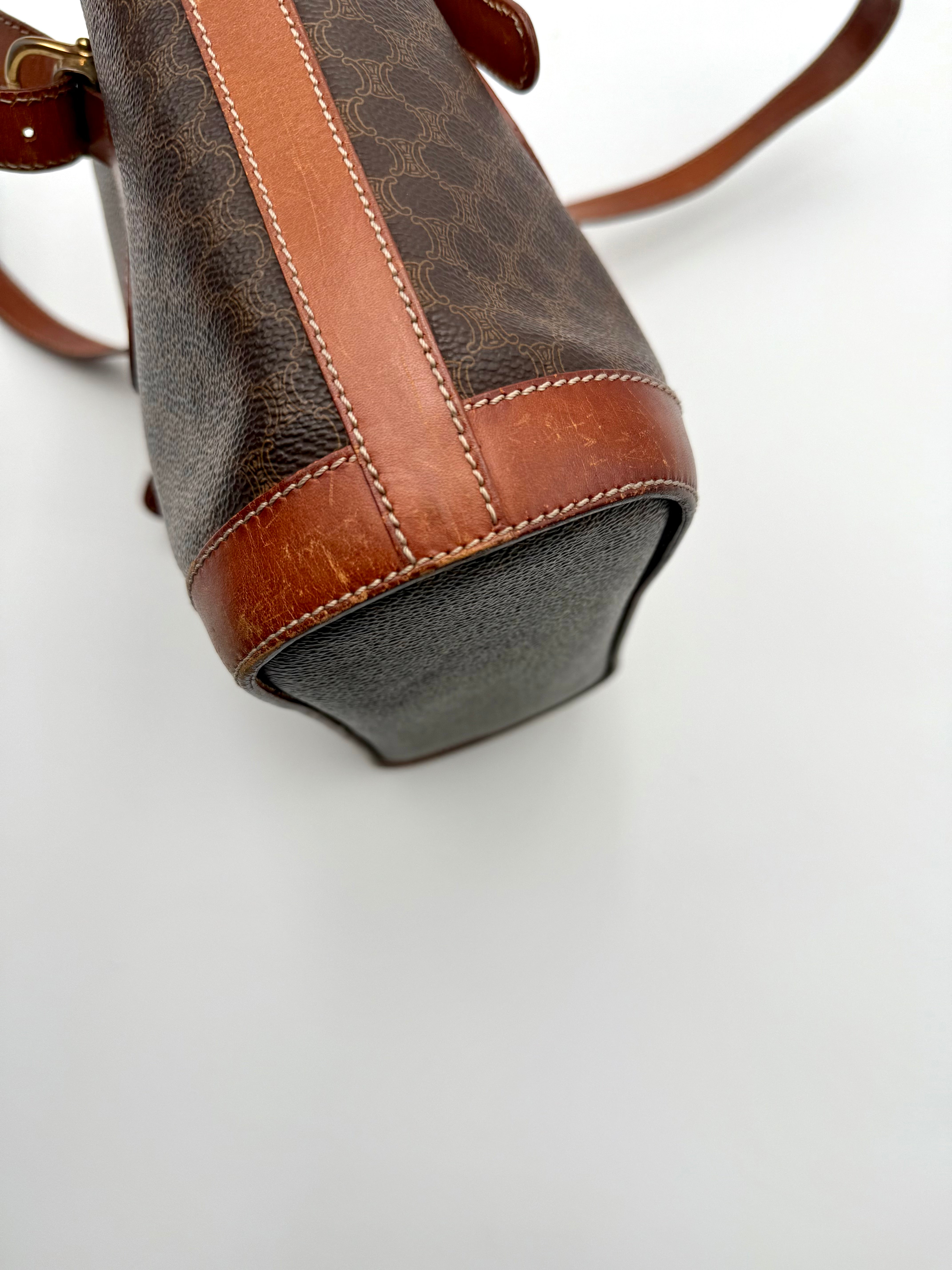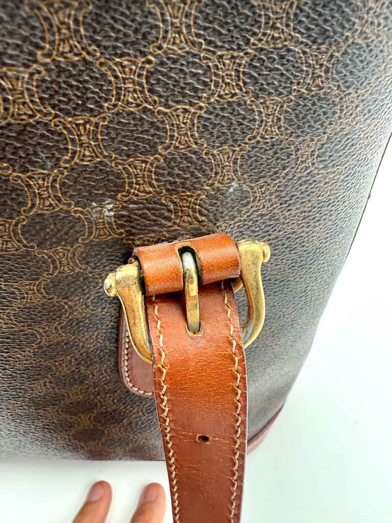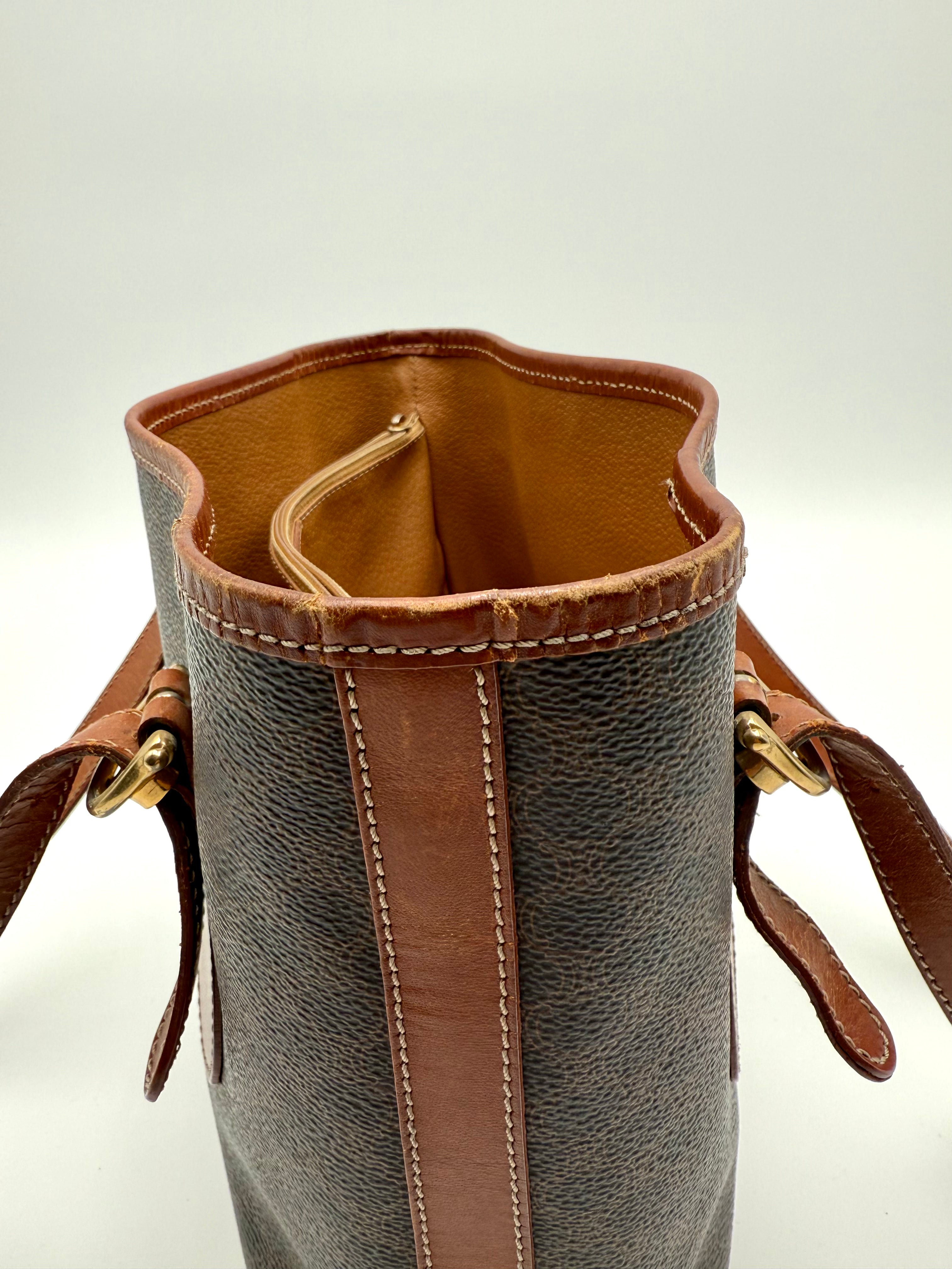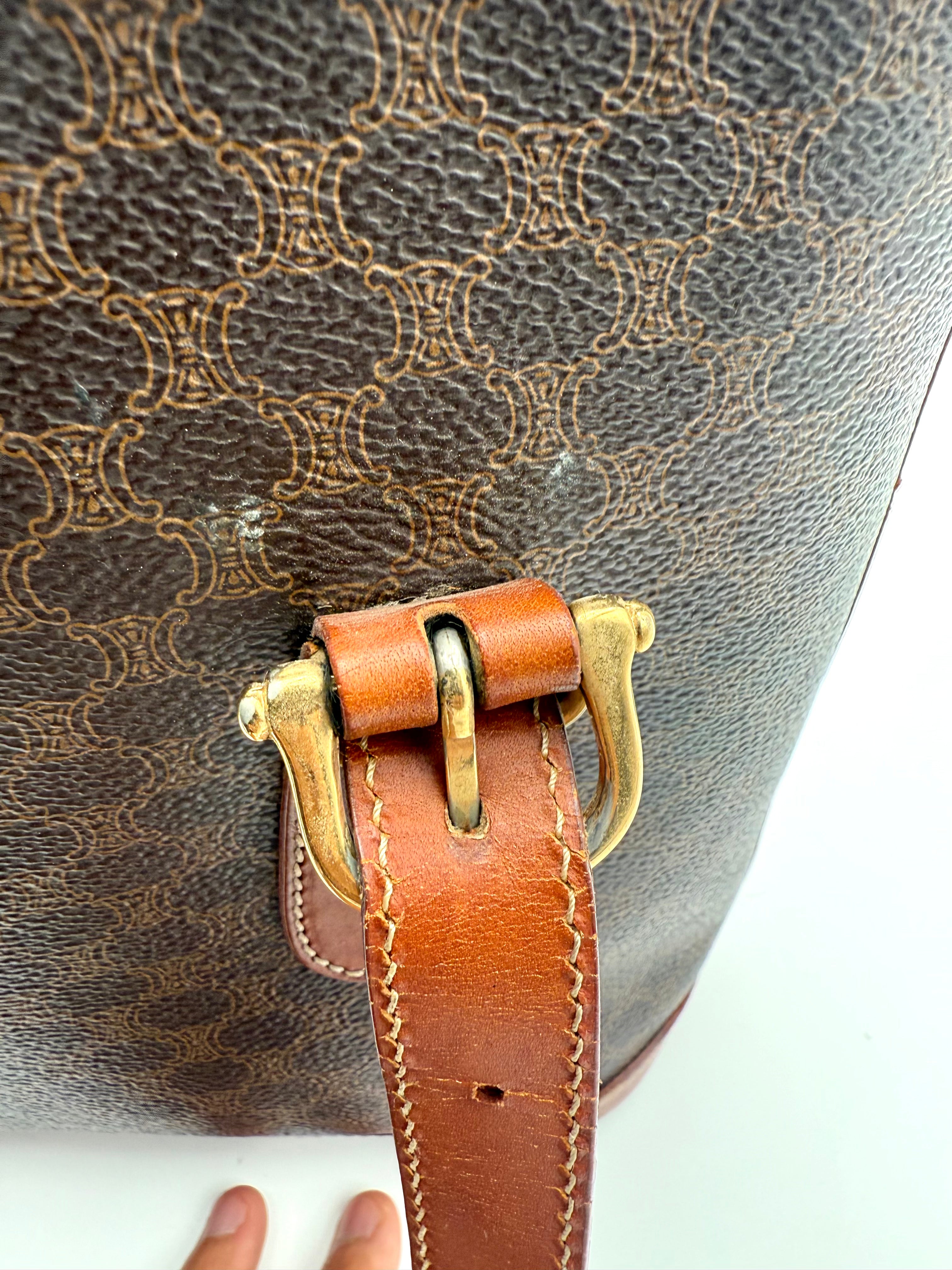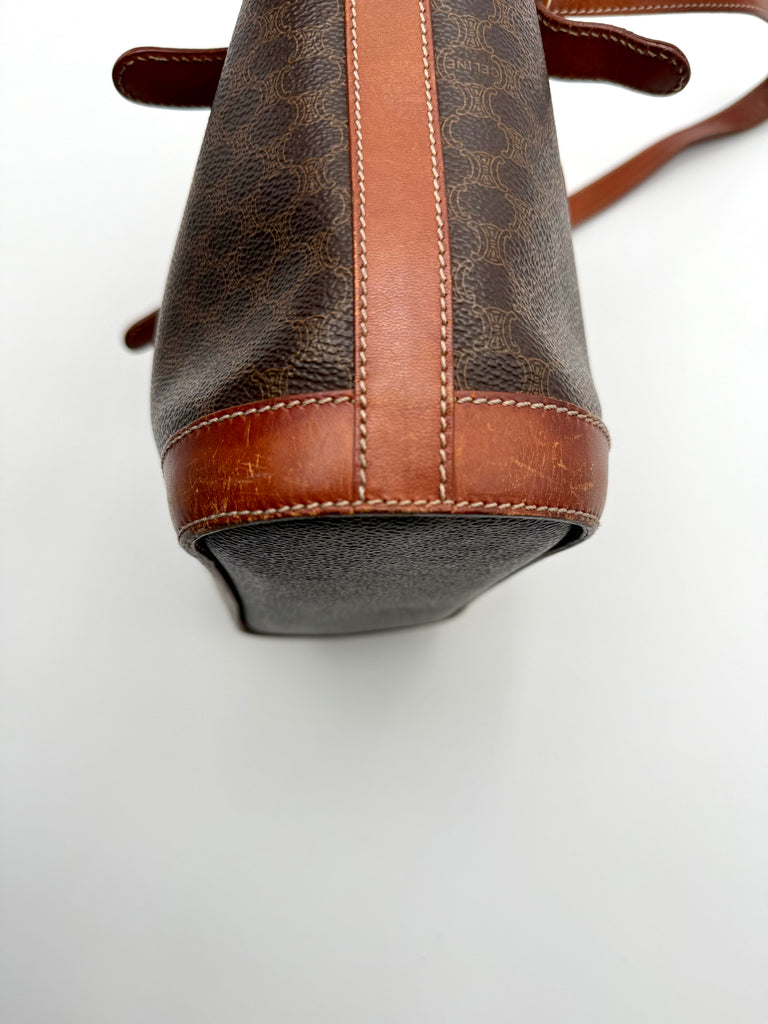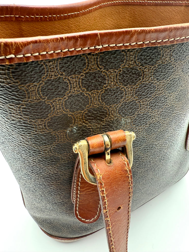 Tweedehands CELINE macadam canvas tote bag met leren handvaten. De tas beschikt over drie binnenvakken waarvan één met rits. Het item verkeert in een zeer goede vintage staat, met algemene gebruikssporen. De tas wordt geleverd in onze mooie Moon flower dustbag.