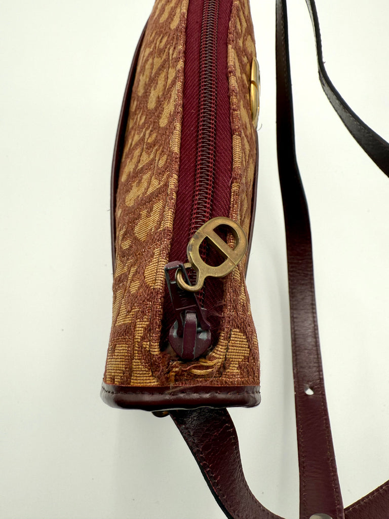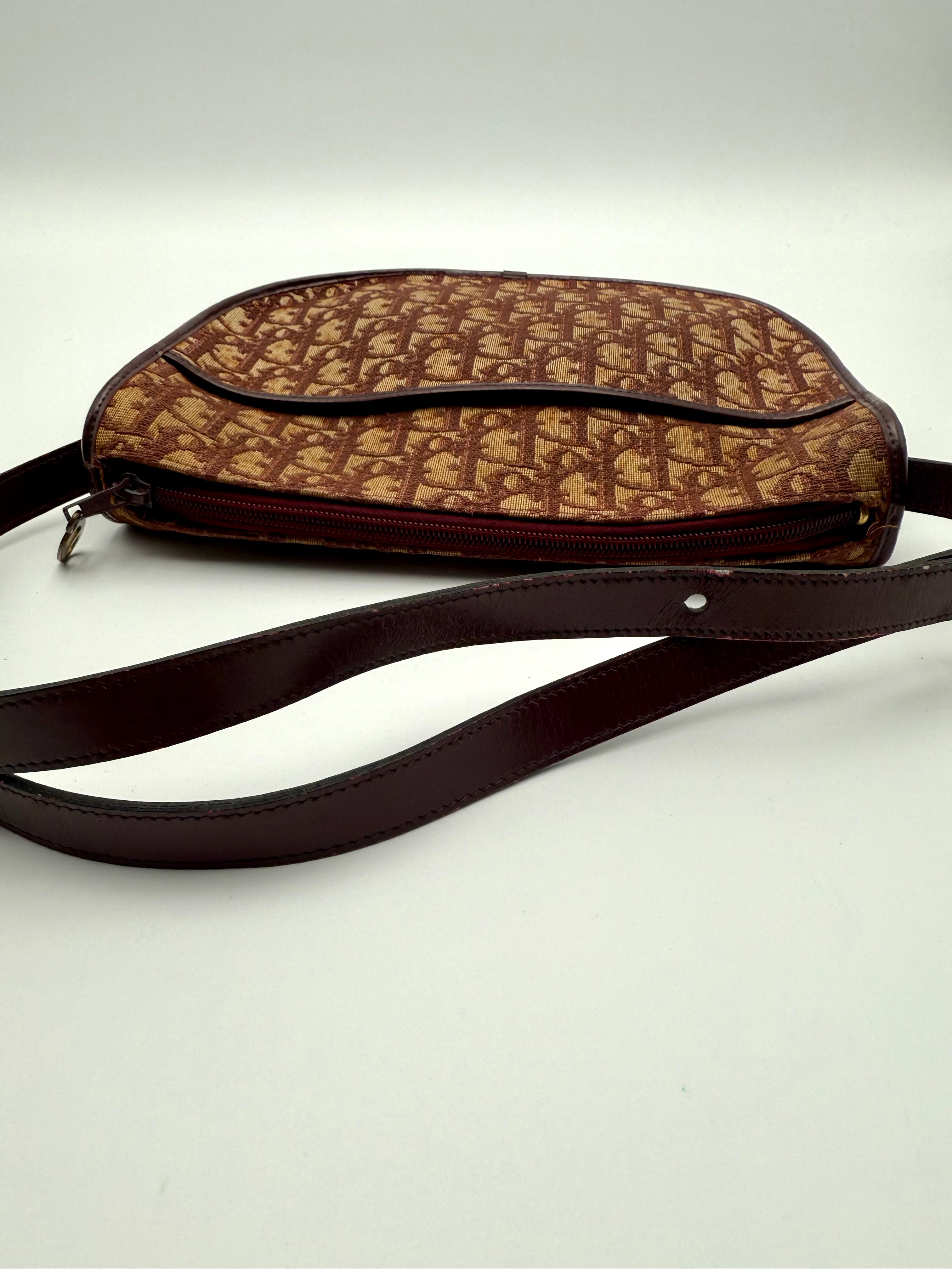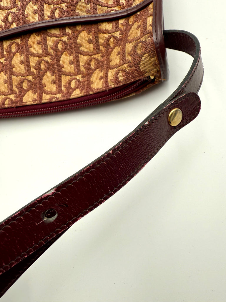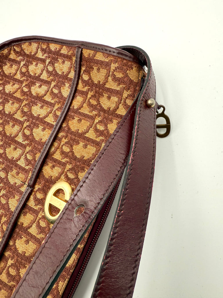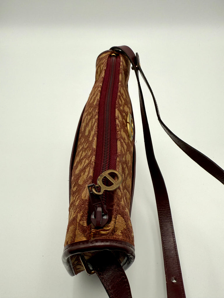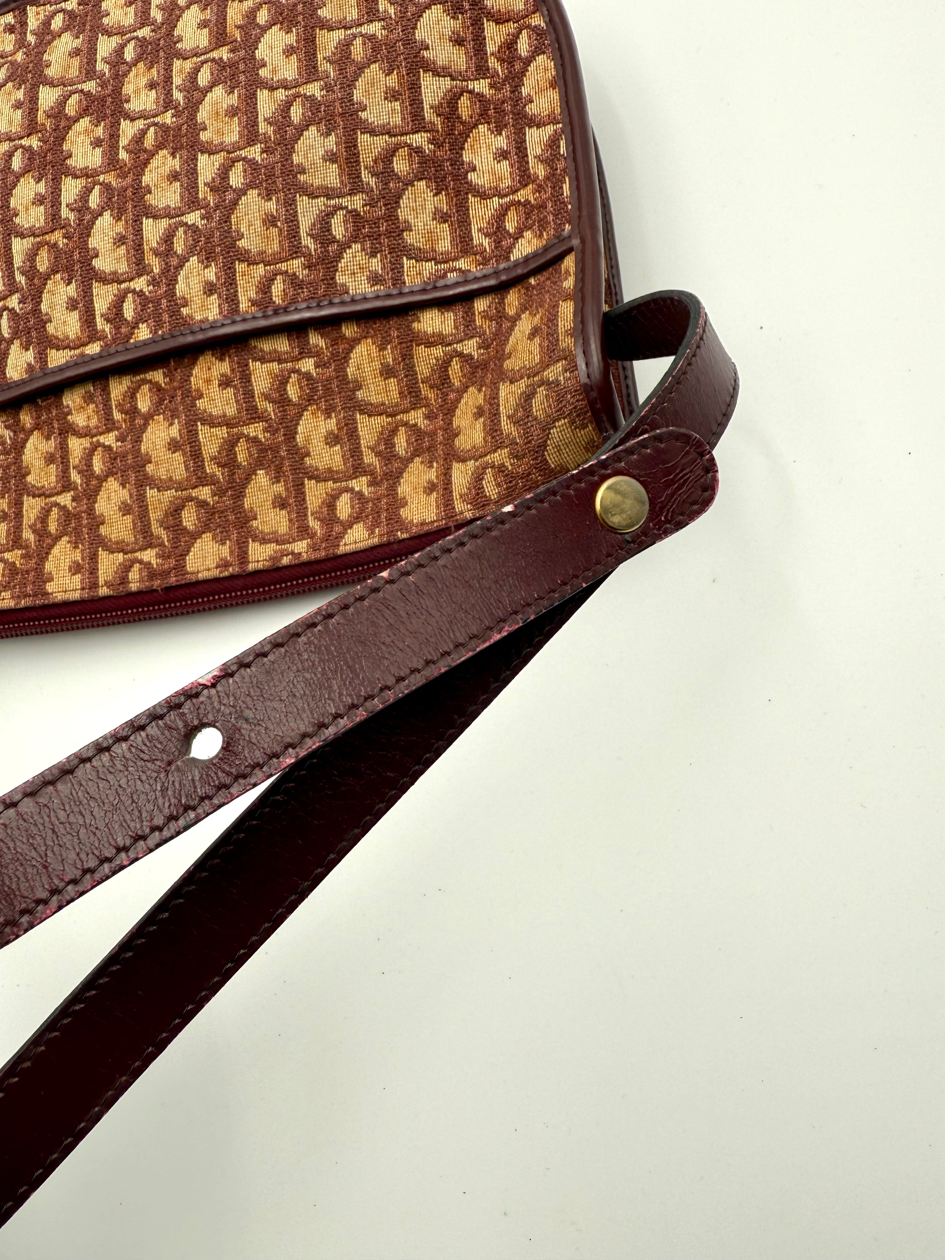 Tweedehands Christian Dior Trotter Canvas bag in de kleur rood/beige met gouden hardware. De tas beschikt over twee voorvakjes en een achtervakje. De tas kan kort en als crossbody gedragen worden. Het item verkeert in een zeer goede vintage staat, met algemene gebruikssporen. De tas wordt geleverd in onze mooie Moon flower dustbag.