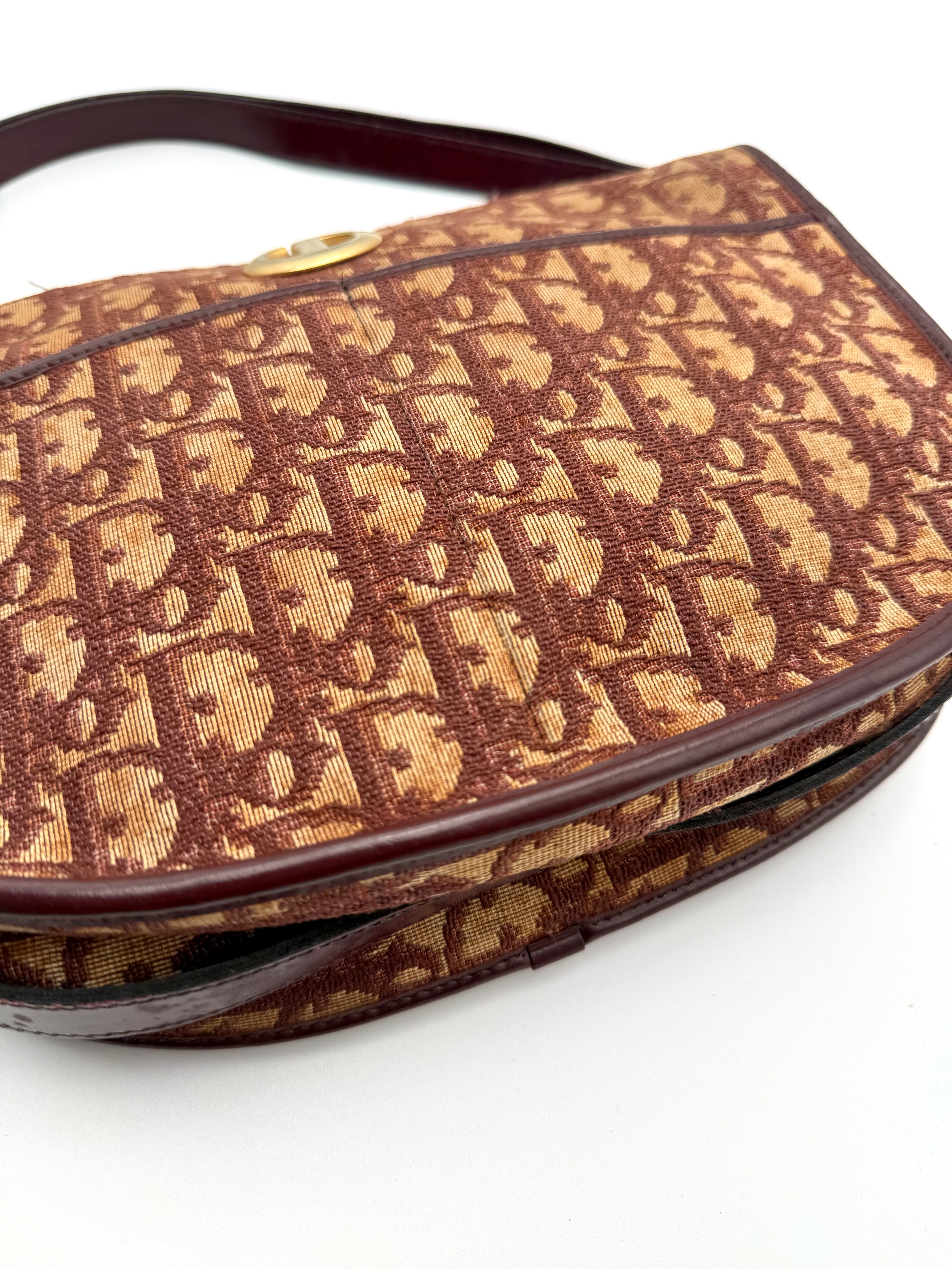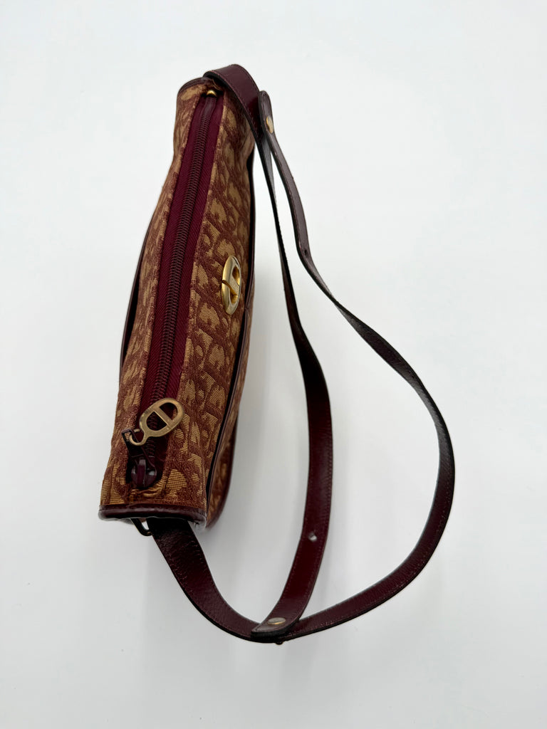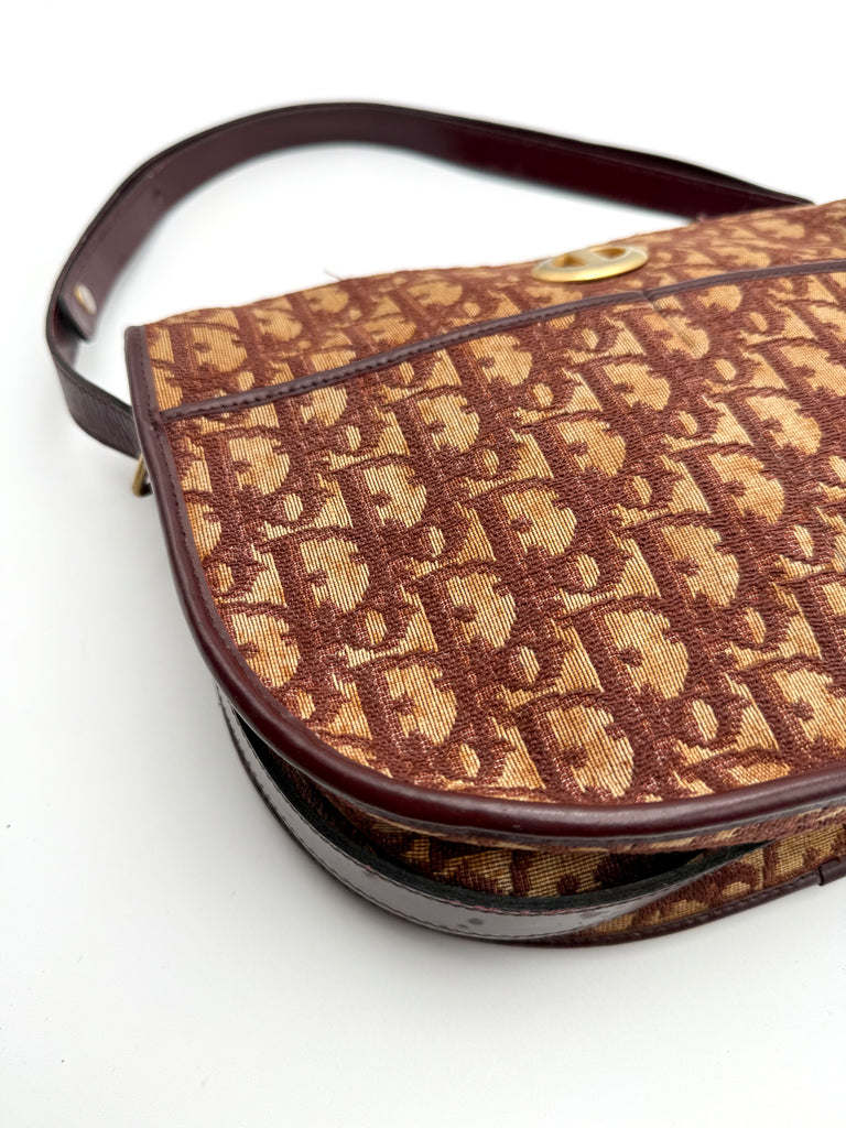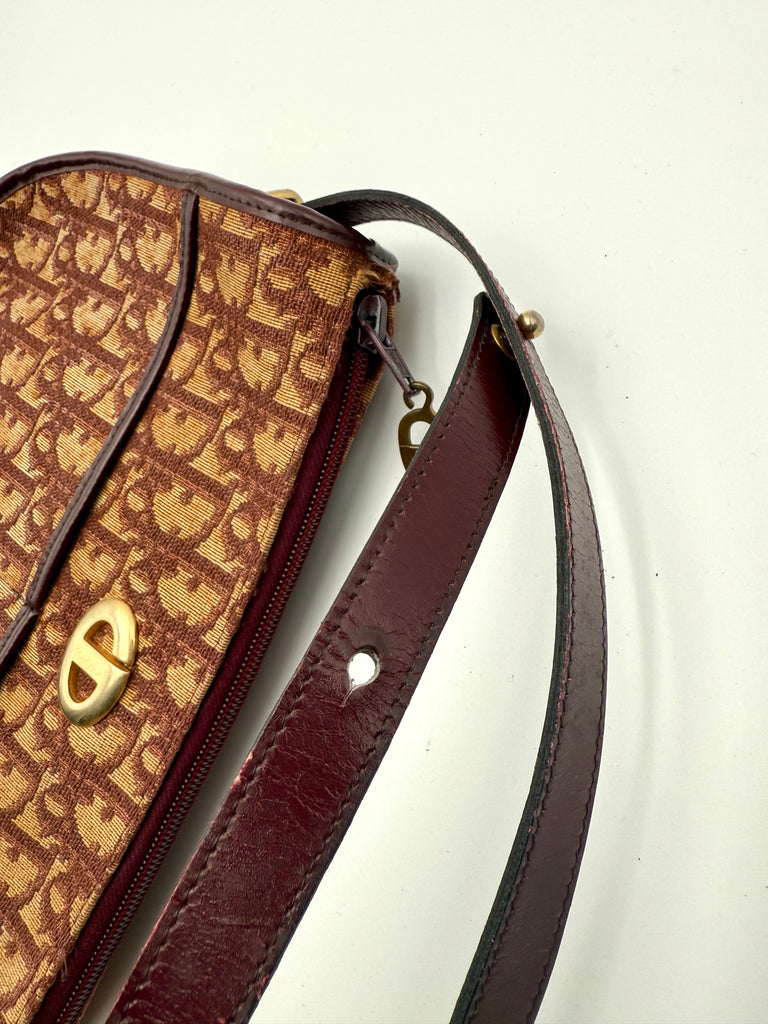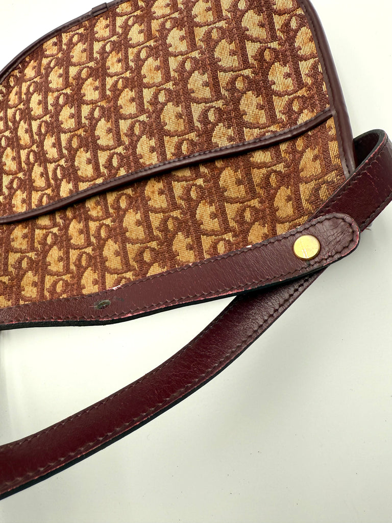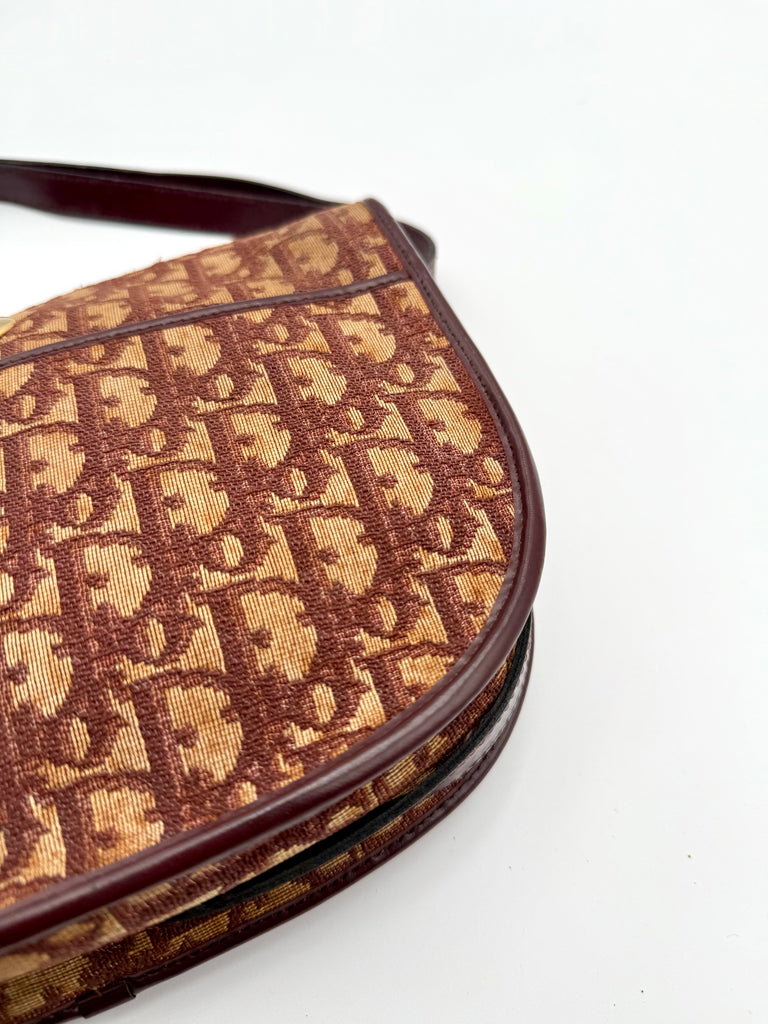 Tweedehands Christian Dior Trotter Canvas bag in de kleur rood/beige met gouden hardware. De tas beschikt over twee voorvakjes en een achtervakje. De tas kan kort en als crossbody gedragen worden. Het item verkeert in een zeer goede vintage staat, met algemene gebruikssporen. De tas wordt geleverd in onze mooie Moon flower dustbag.