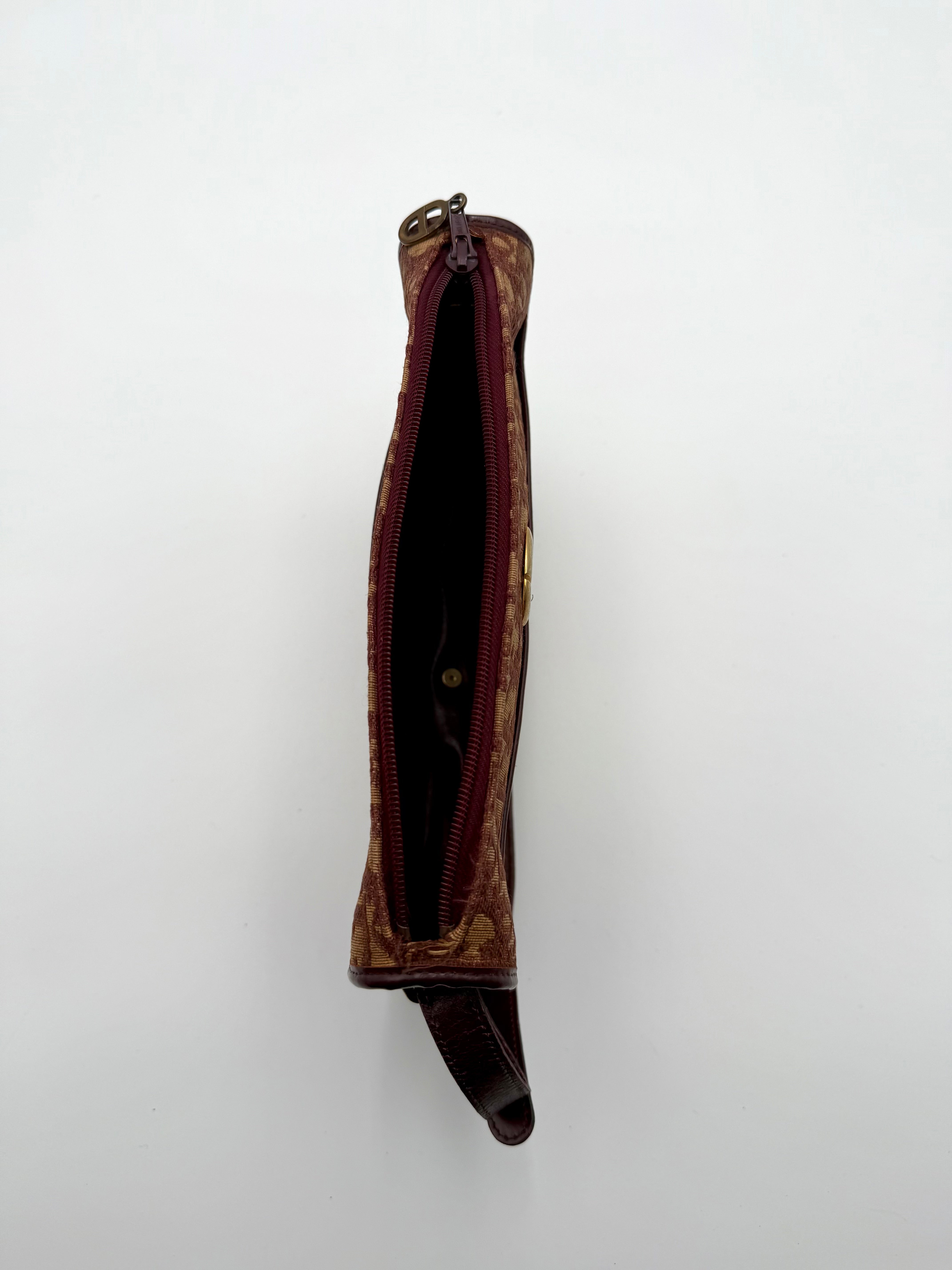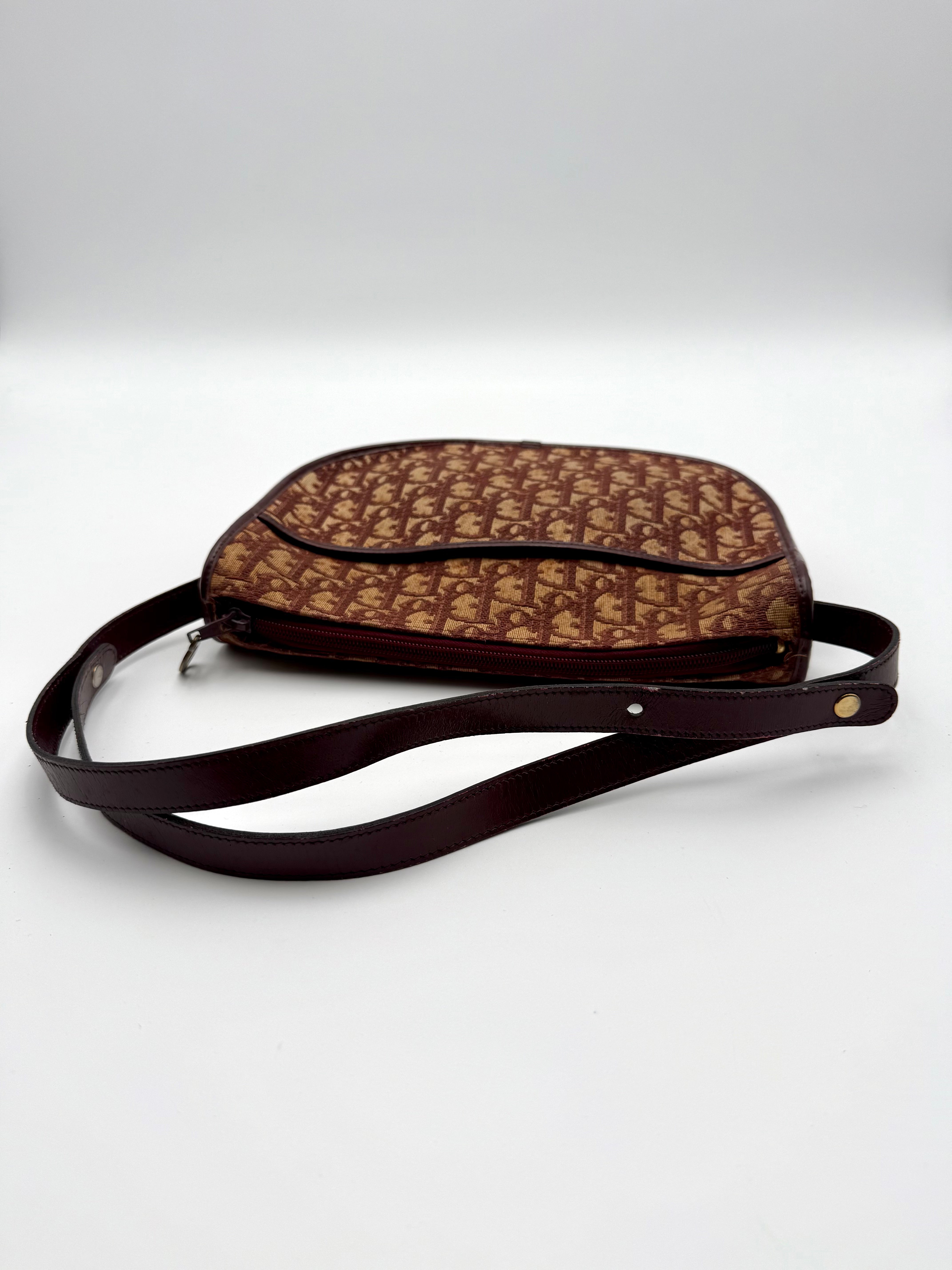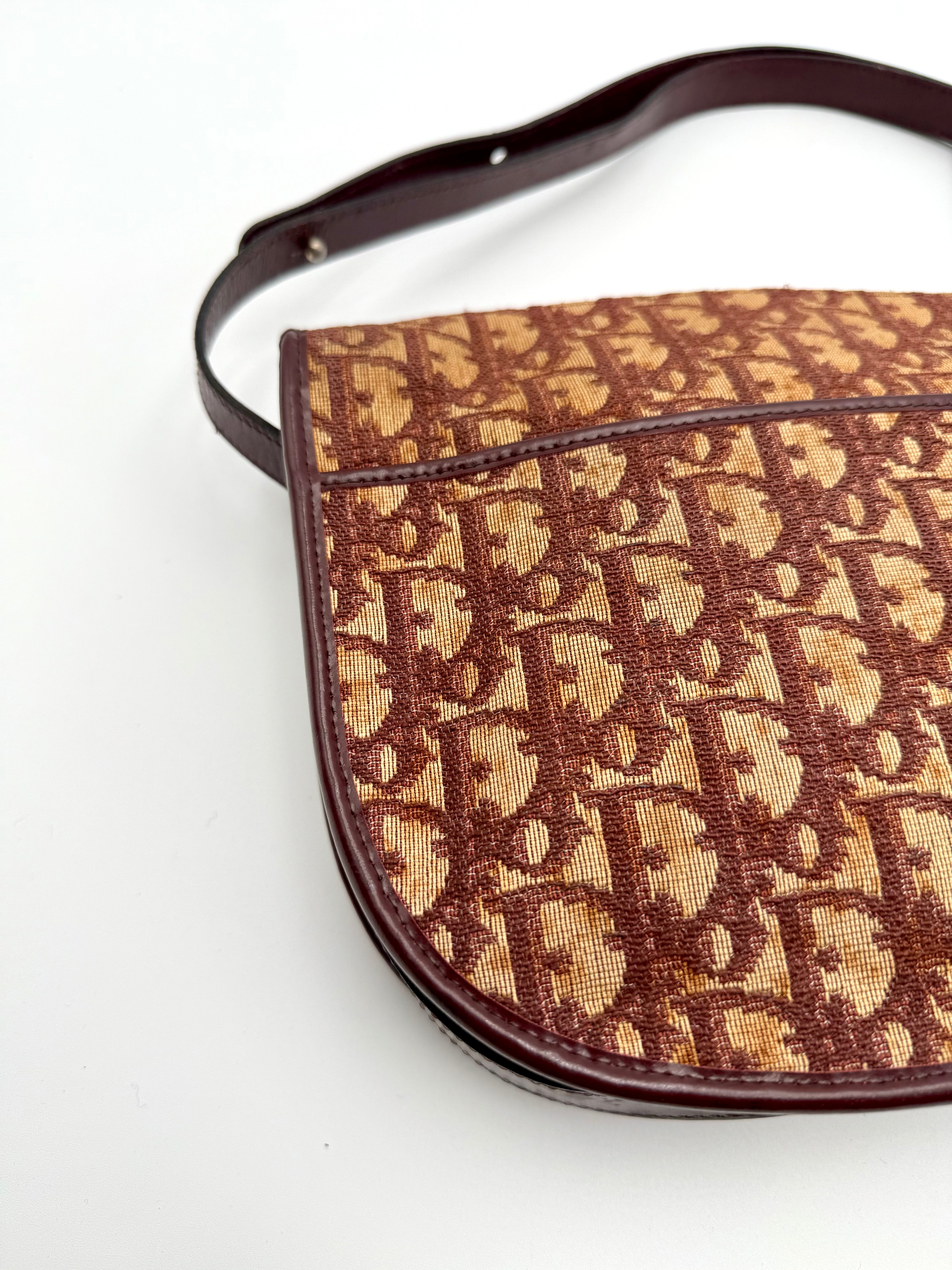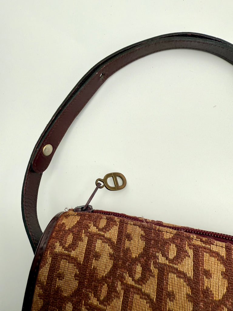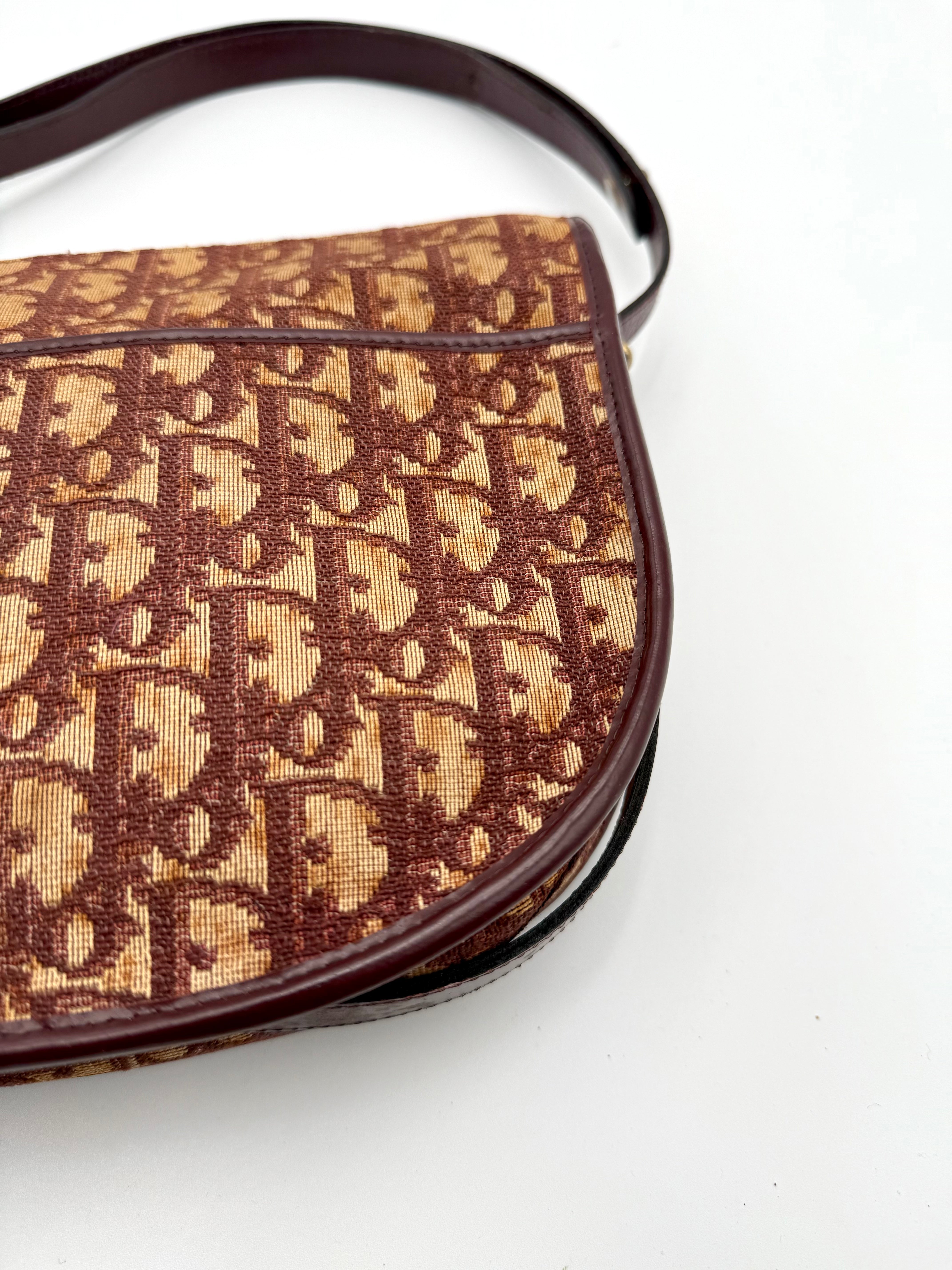 Tweedehands Christian Dior Trotter Canvas bag in de kleur rood/beige met gouden hardware. De tas beschikt over twee voorvakjes en een achtervakje. De tas kan kort en als crossbody gedragen worden. Het item verkeert in een zeer goede vintage staat, met algemene gebruikssporen. De tas wordt geleverd in onze mooie Moon flower dustbag.