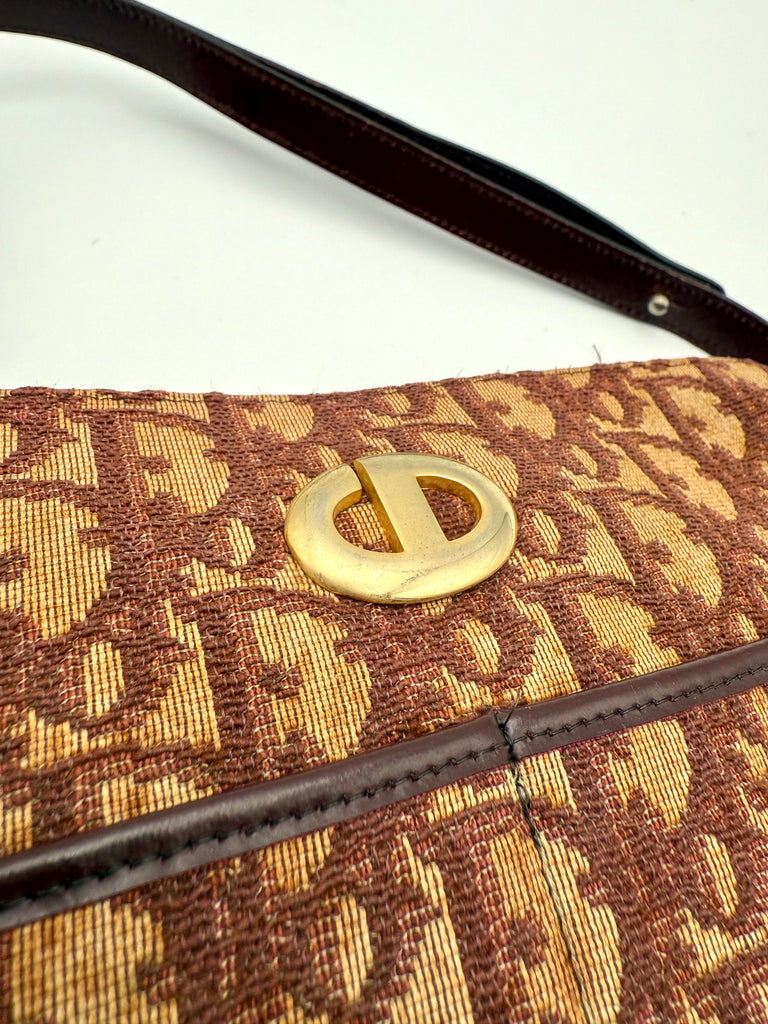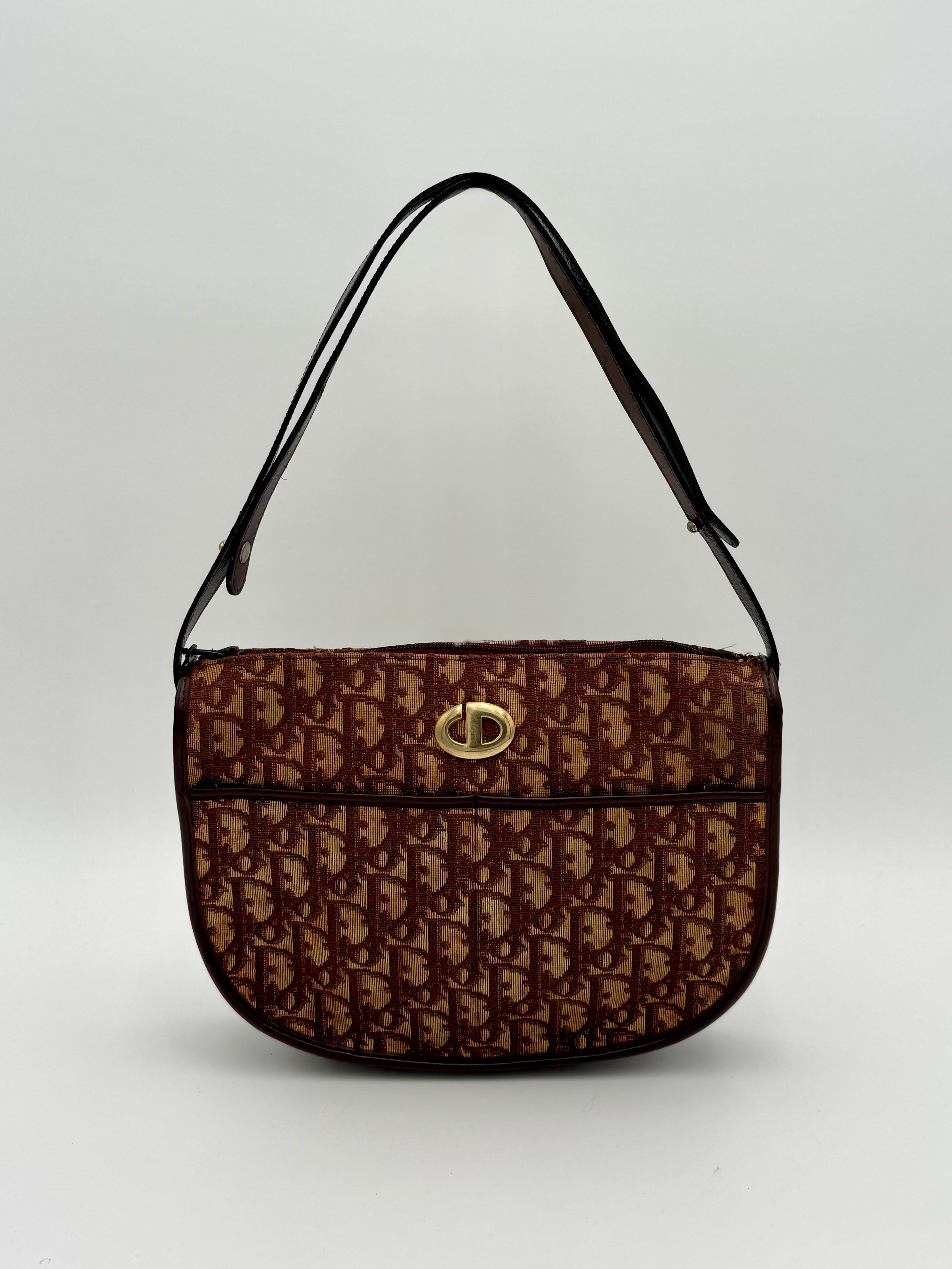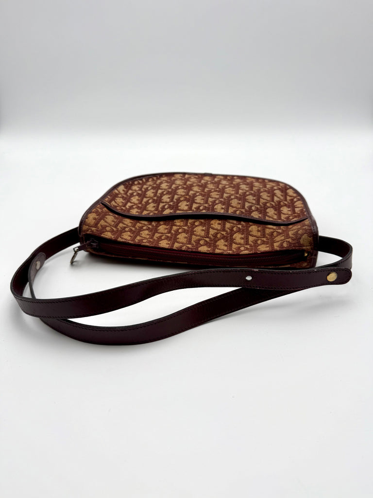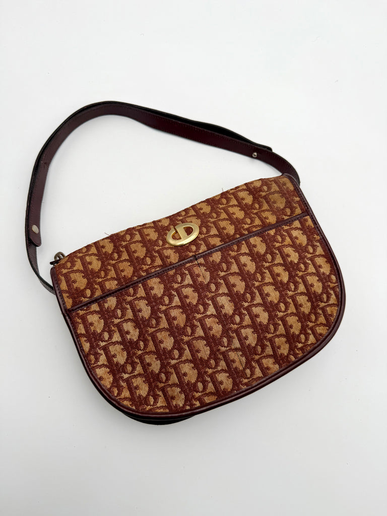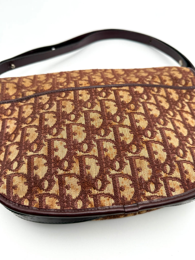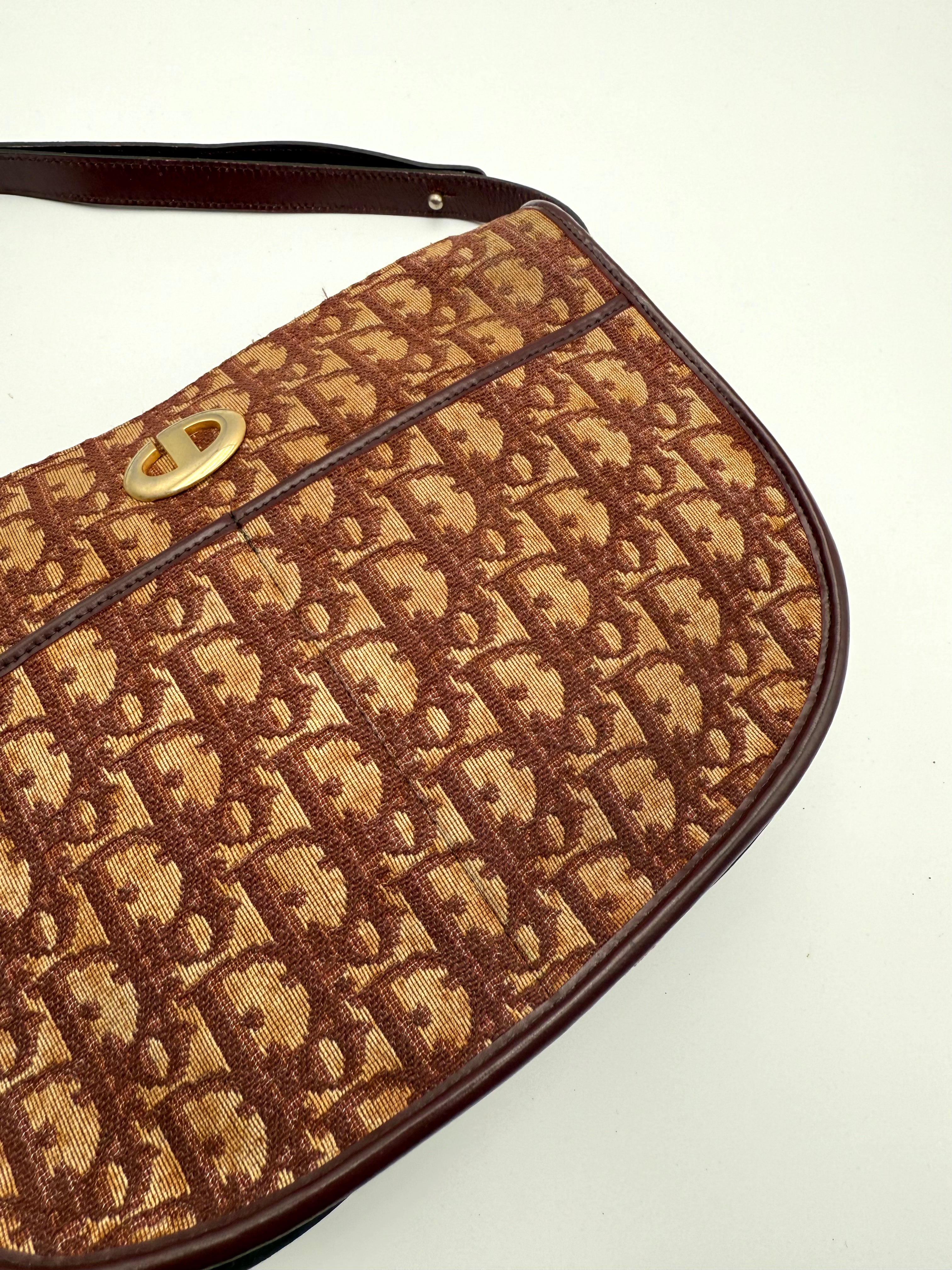 Tweedehands Christian Dior Trotter Canvas bag in de kleur rood/beige met gouden hardware. De tas beschikt over twee voorvakjes en een achtervakje. De tas kan kort en als crossbody gedragen worden. Het item verkeert in een zeer goede vintage staat, met algemene gebruikssporen. De tas wordt geleverd in onze mooie Moon flower dustbag.
