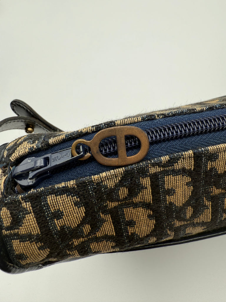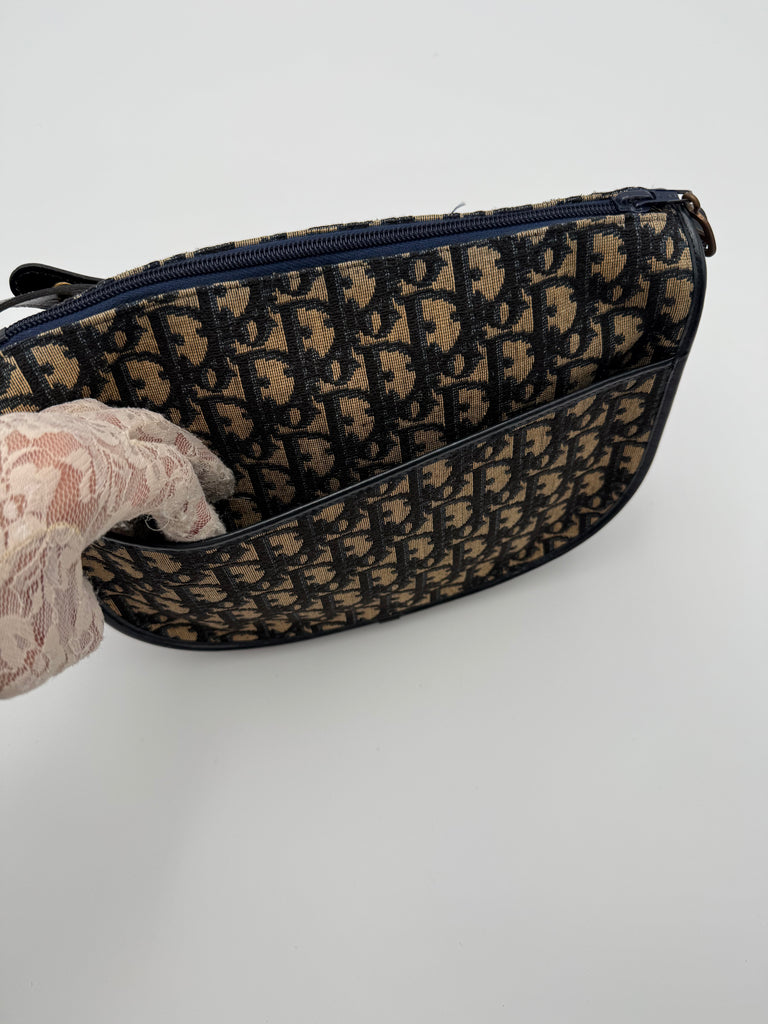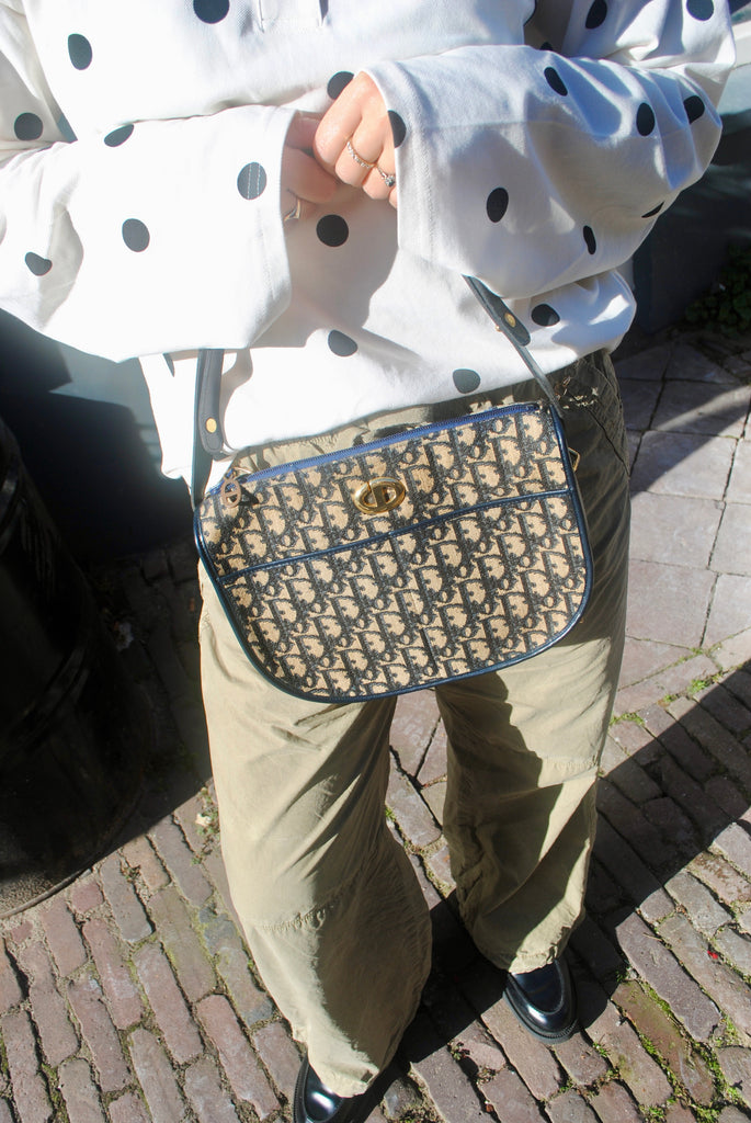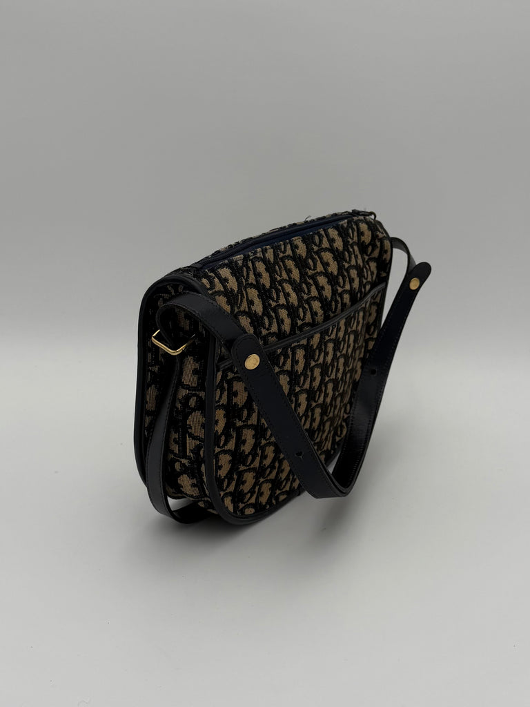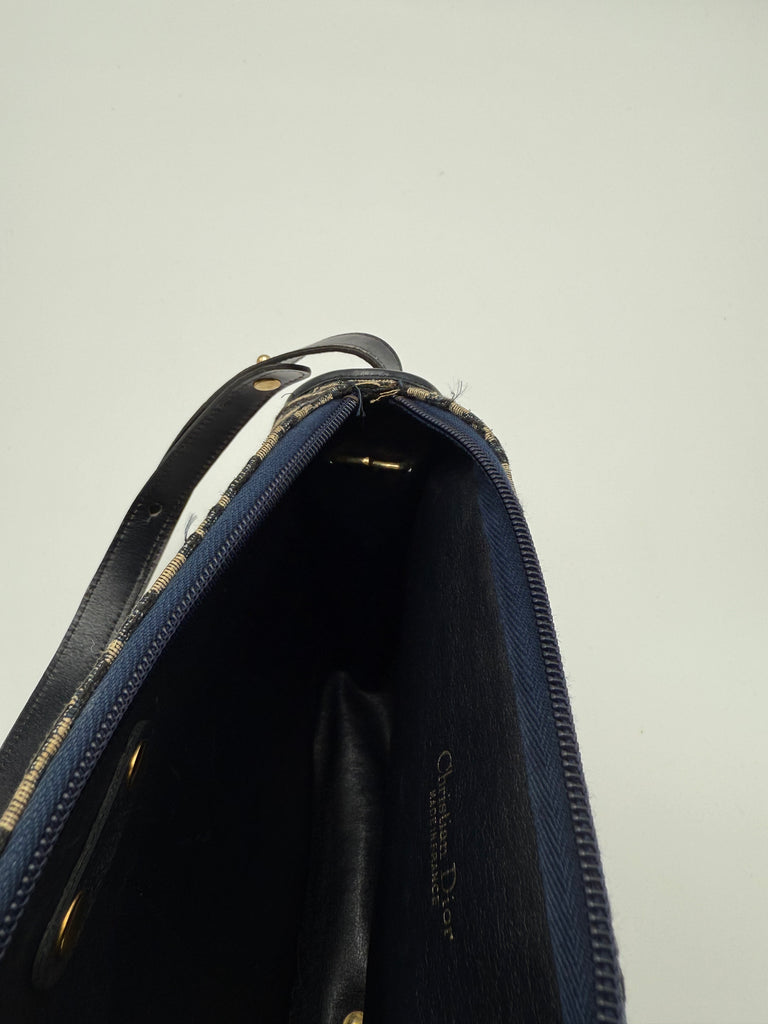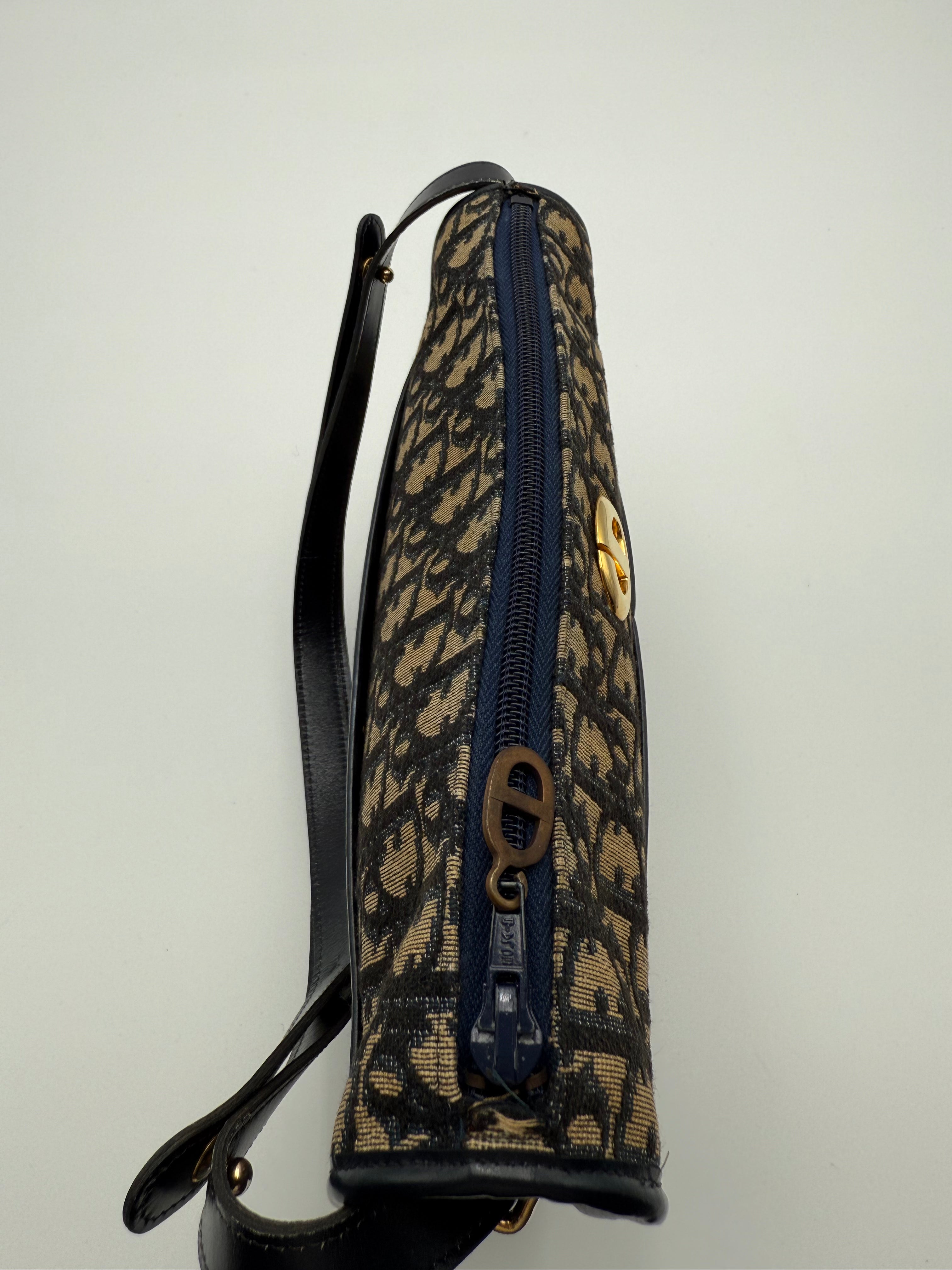 Tweedehands Christian Dior Trotter Canvas bag in de kleur blauw/beige met gouden hardware. De tas beschikt over twee voorvakjes en een achtervakje. De tas kan kort en als crossbody gedragen worden. Het item verkeert in een zeer goede vintage staat, met algemene gebruikssporen. De tas wordt geleverd in onze mooie Moon flower dustbag.
