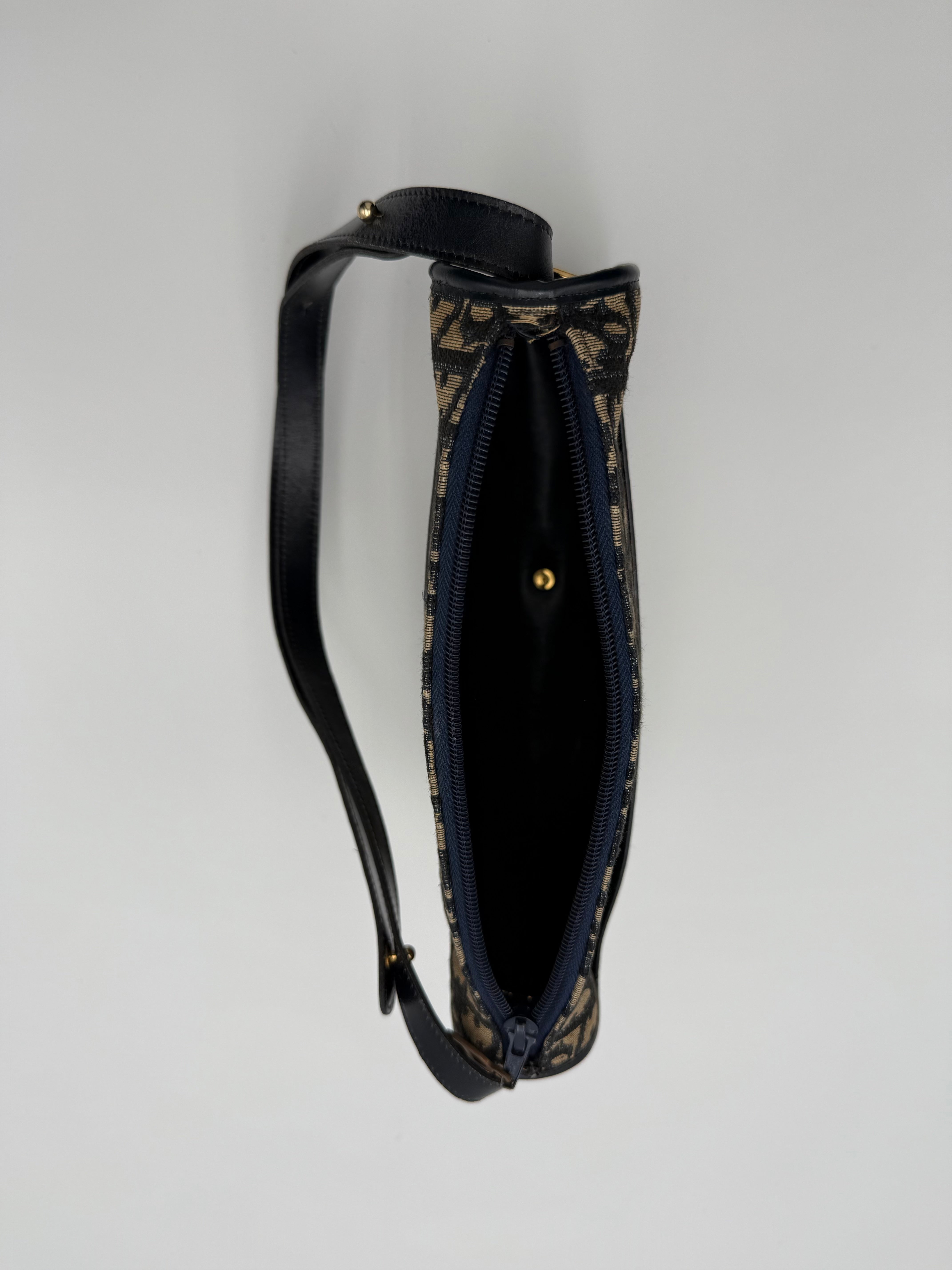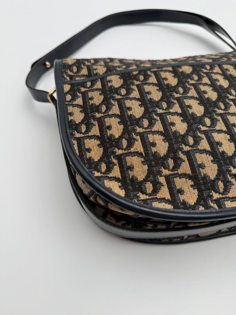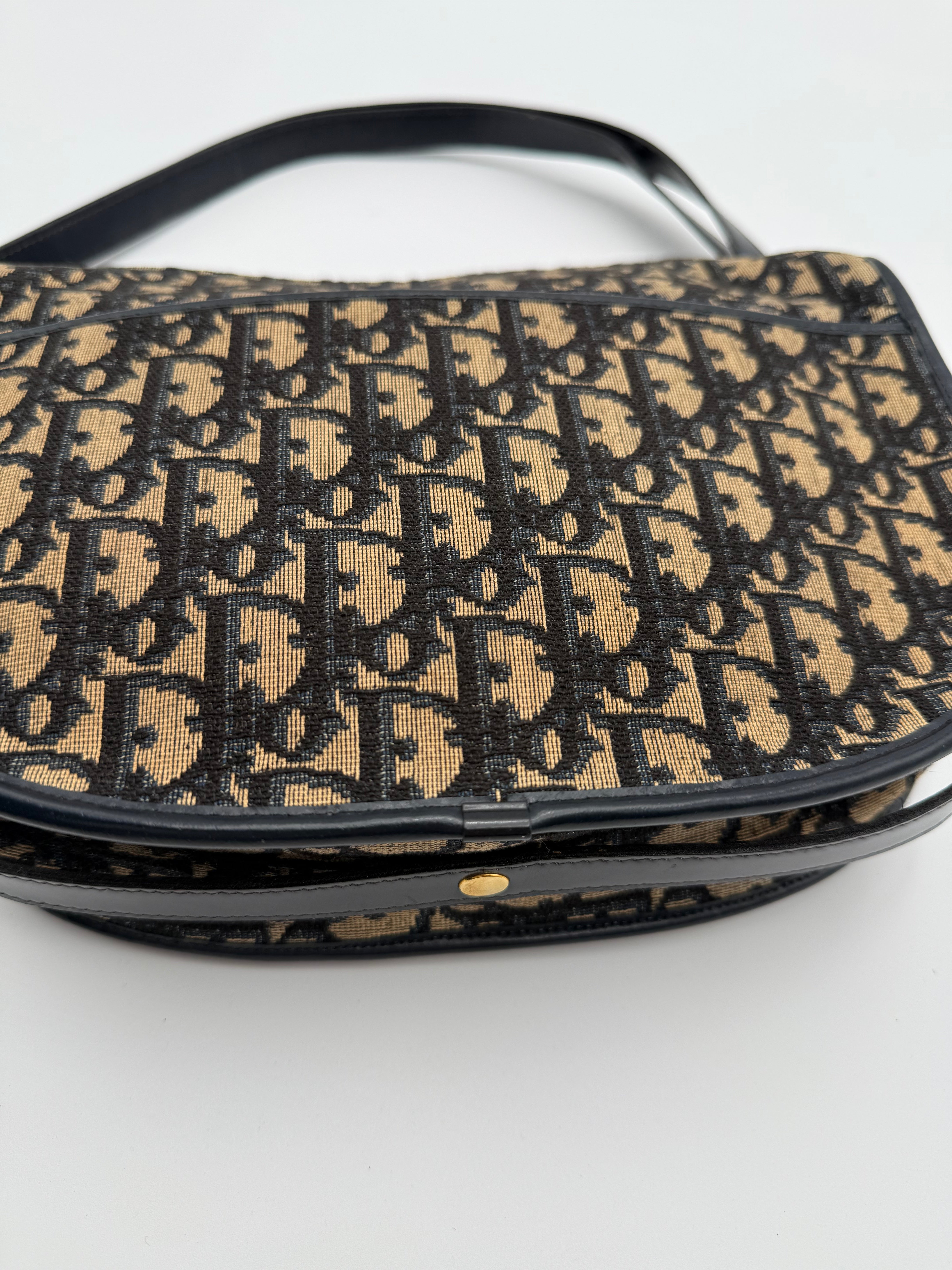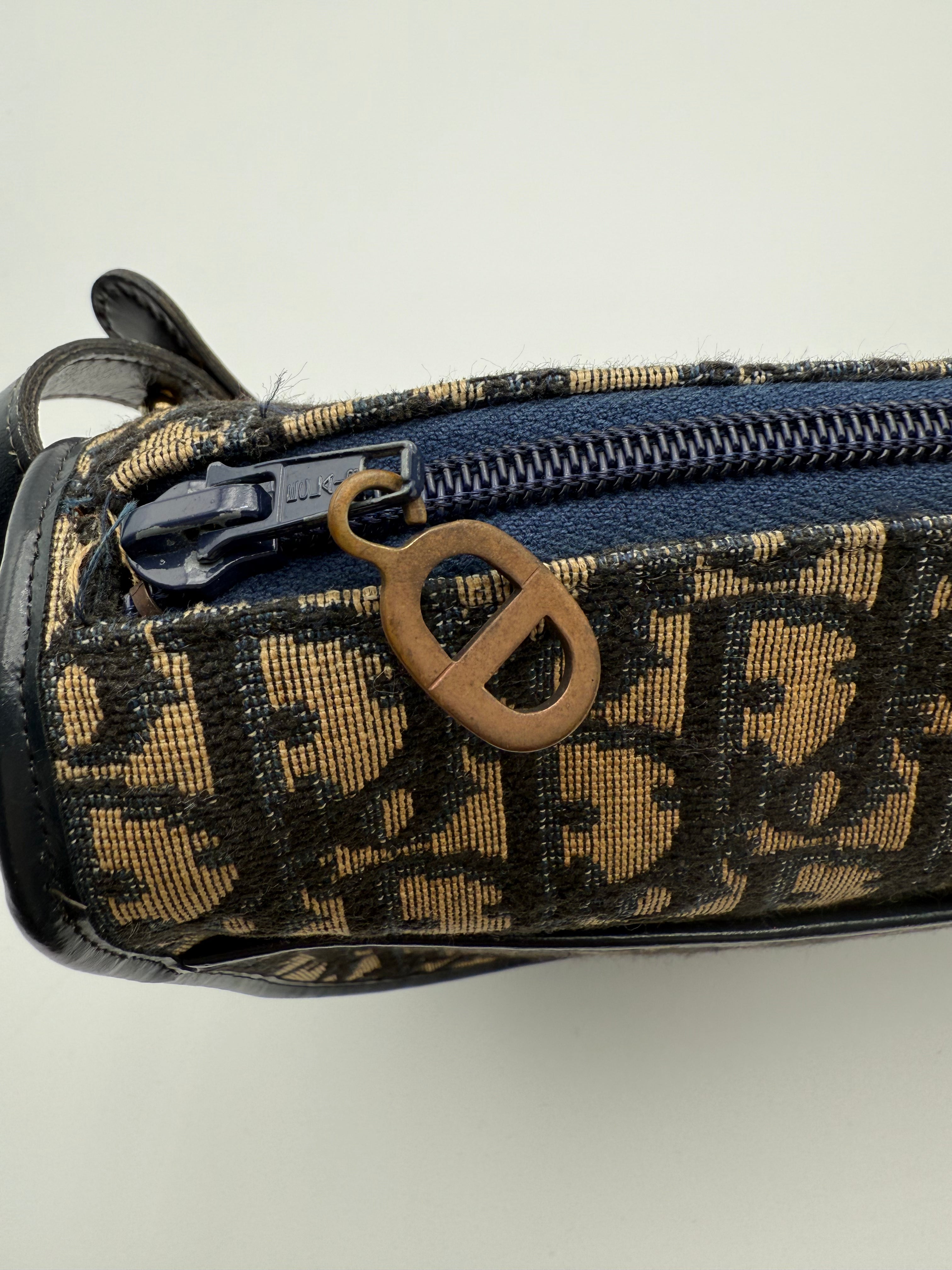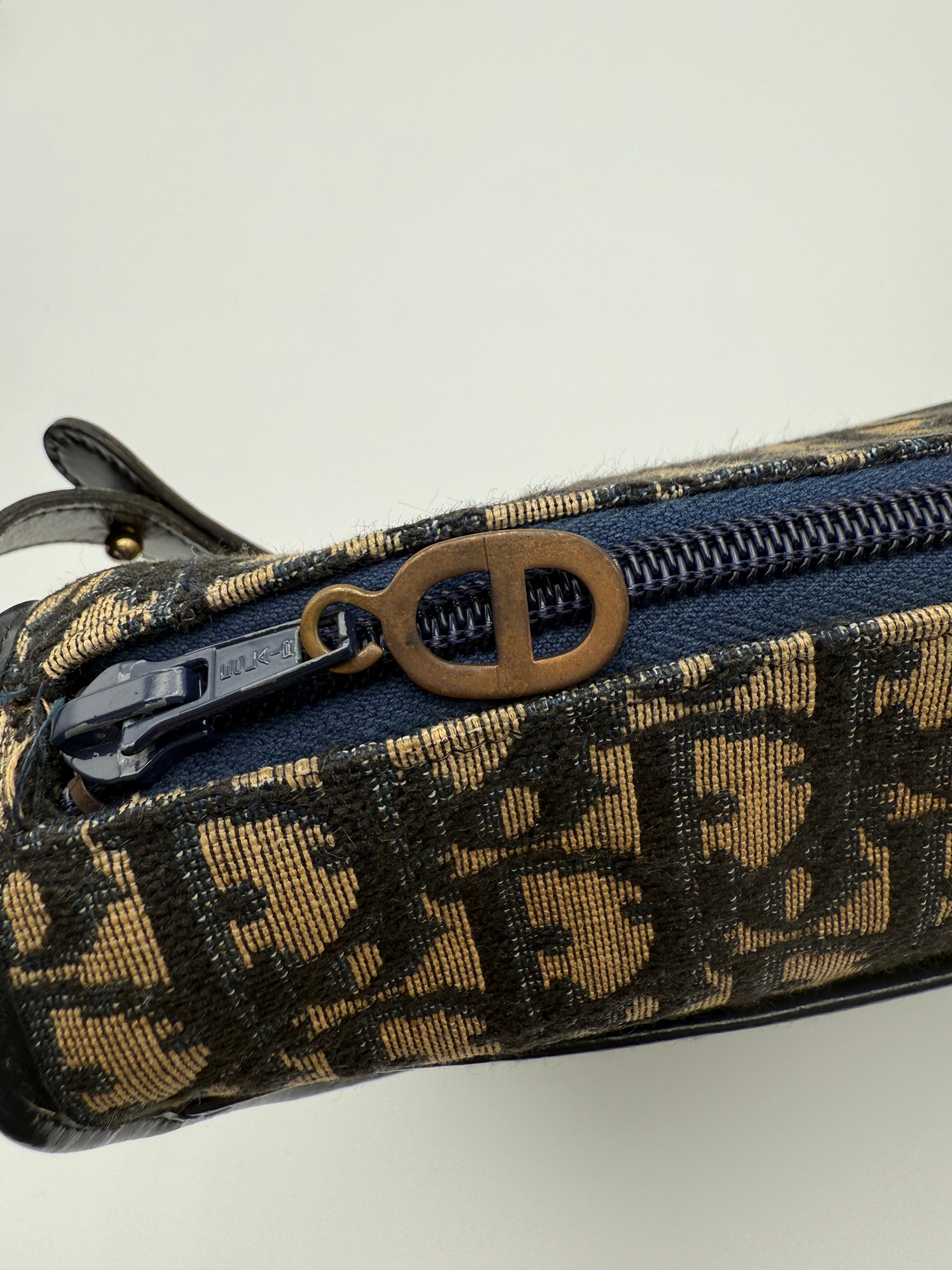 Tweedehands Christian Dior Trotter Canvas bag in de kleur blauw/beige met gouden hardware. De tas beschikt over twee voorvakjes en een achtervakje. De tas kan kort en als crossbody gedragen worden. Het item verkeert in een zeer goede vintage staat, met algemene gebruikssporen. De tas wordt geleverd in onze mooie Moon flower dustbag.