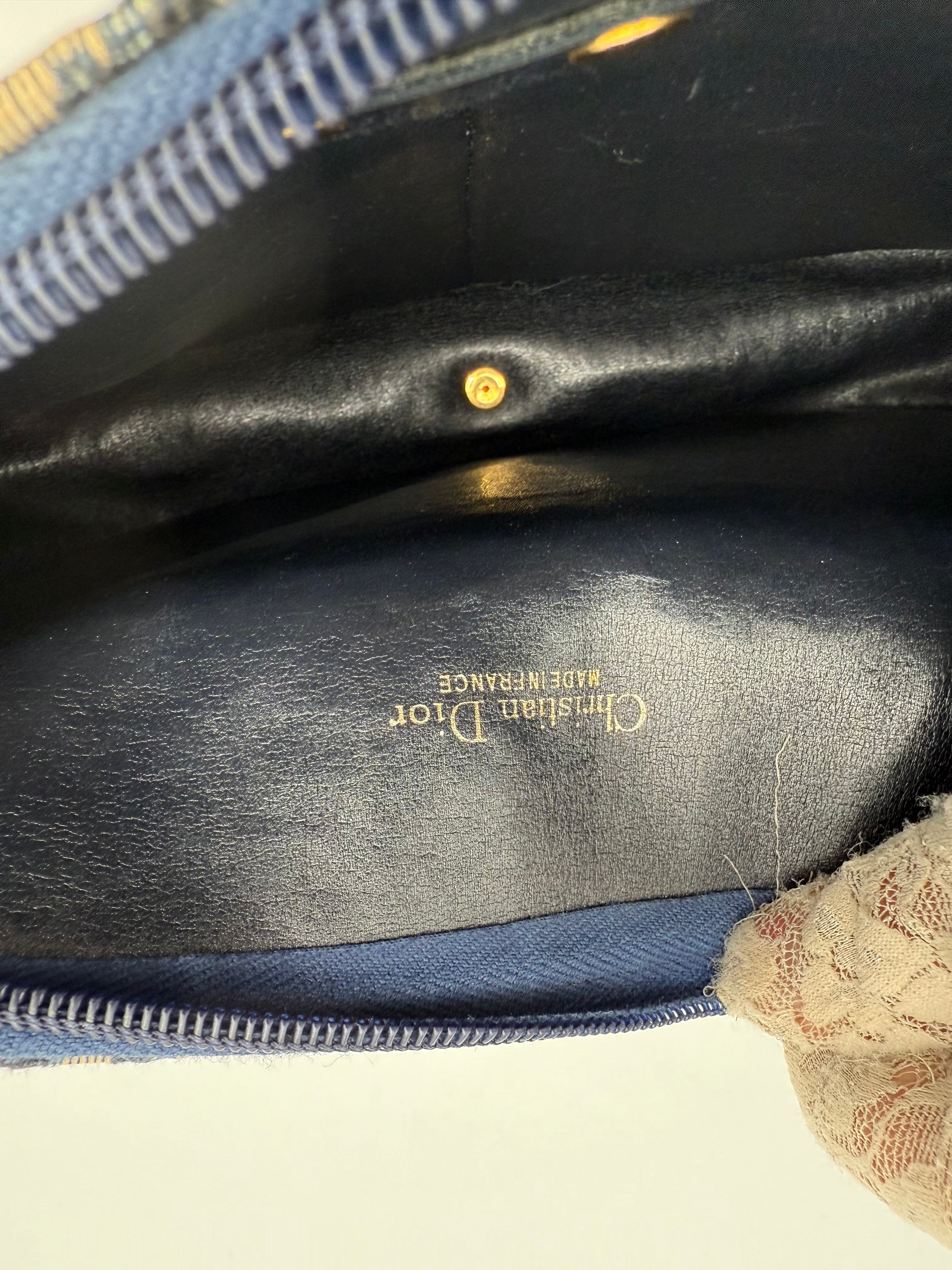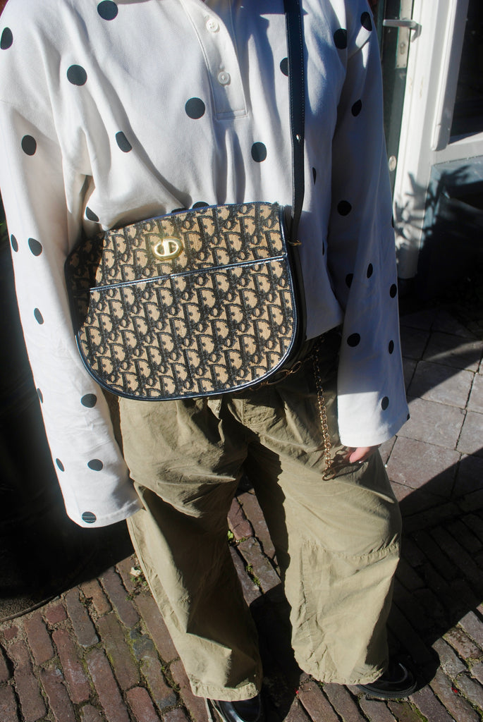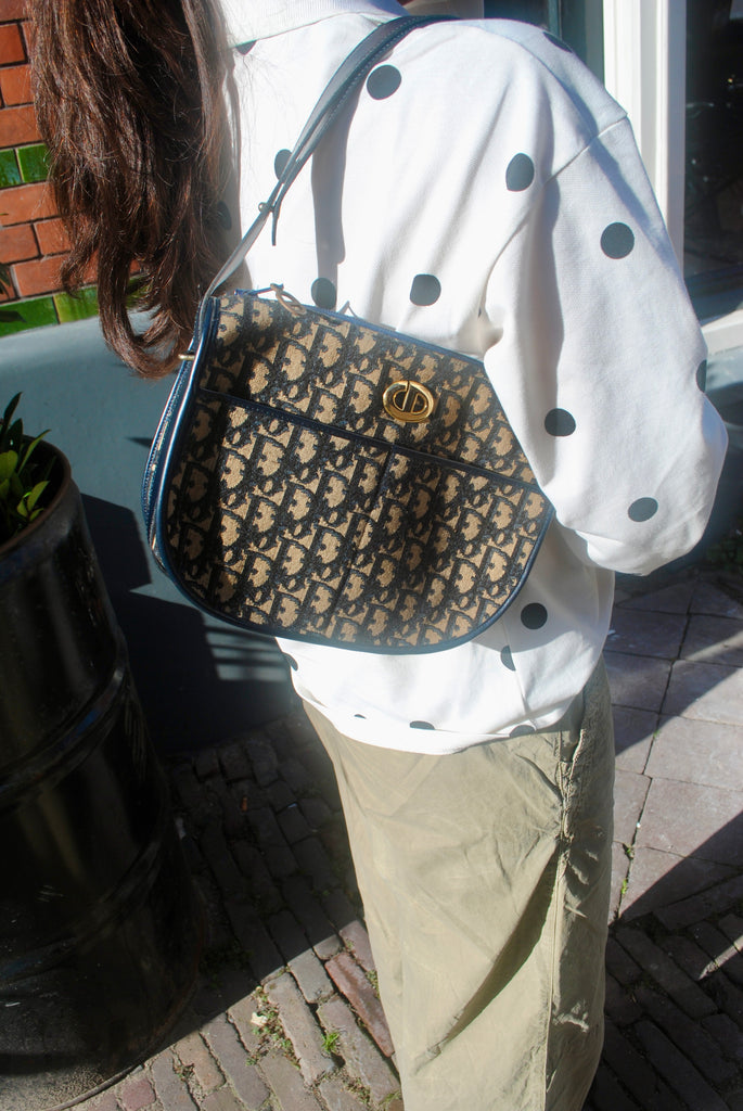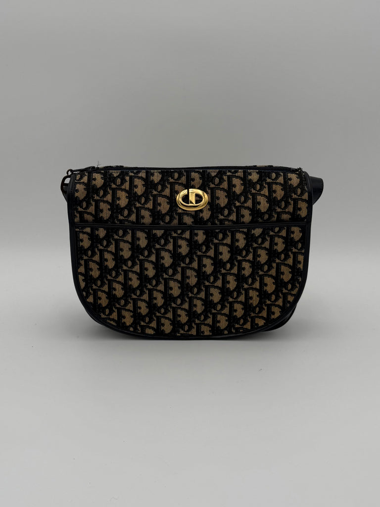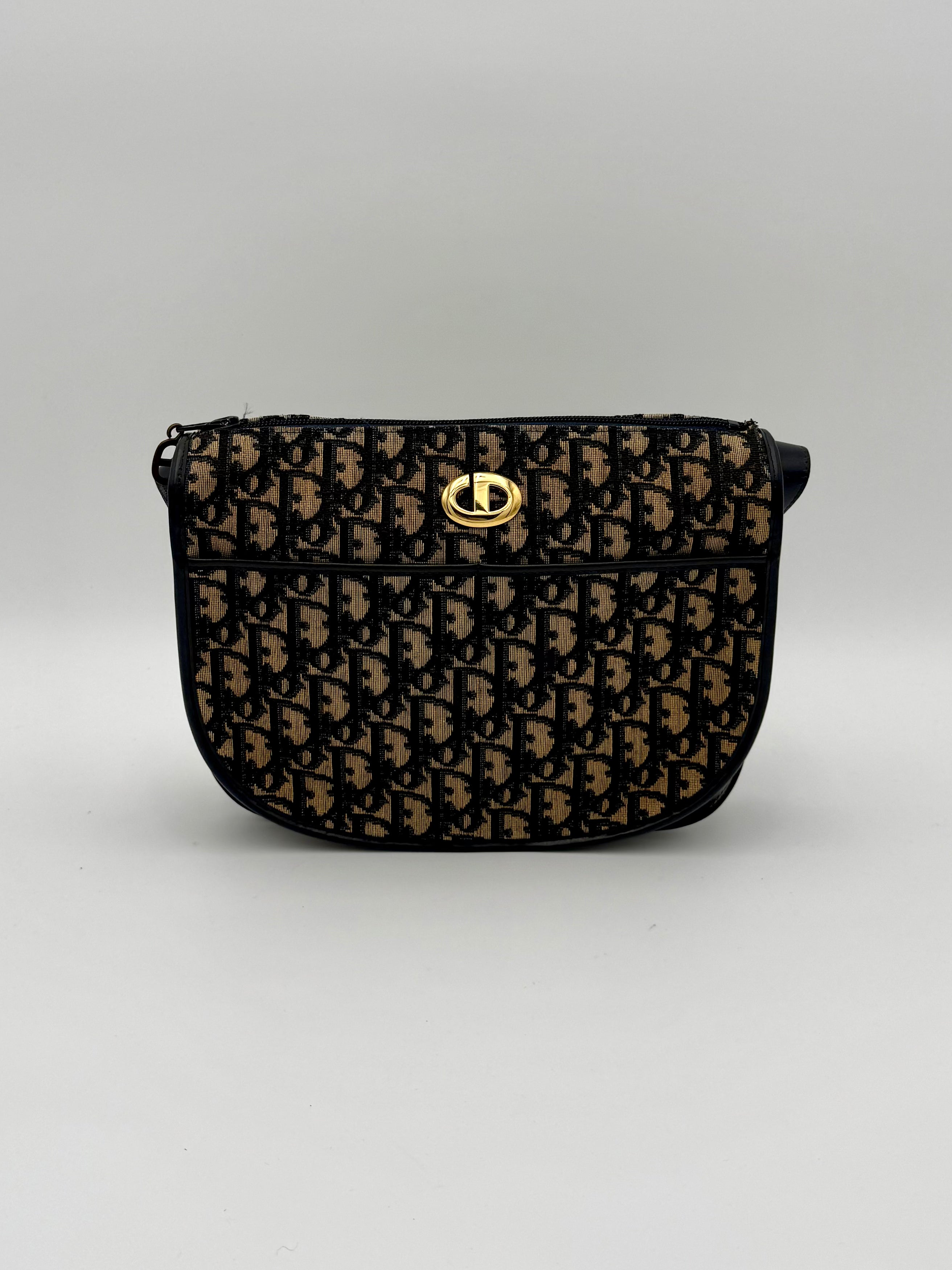 Tweedehands Christian Dior Trotter Canvas bag in de kleur blauw/beige met gouden hardware. De tas beschikt over twee voorvakjes en een achtervakje. De tas kan kort en als crossbody gedragen worden. Het item verkeert in een zeer goede vintage staat, met algemene gebruikssporen. De tas wordt geleverd in onze mooie Moon flower dustbag.