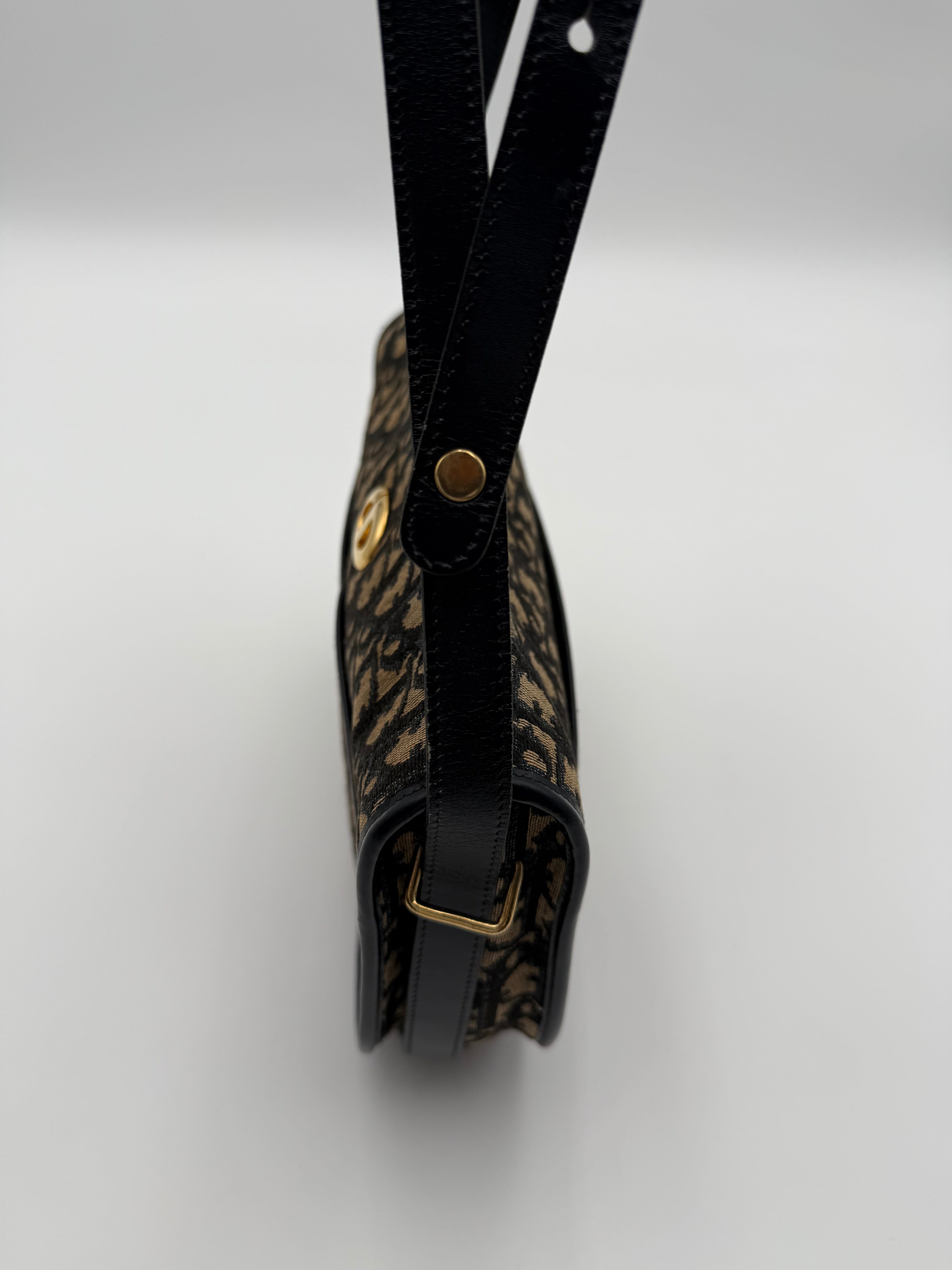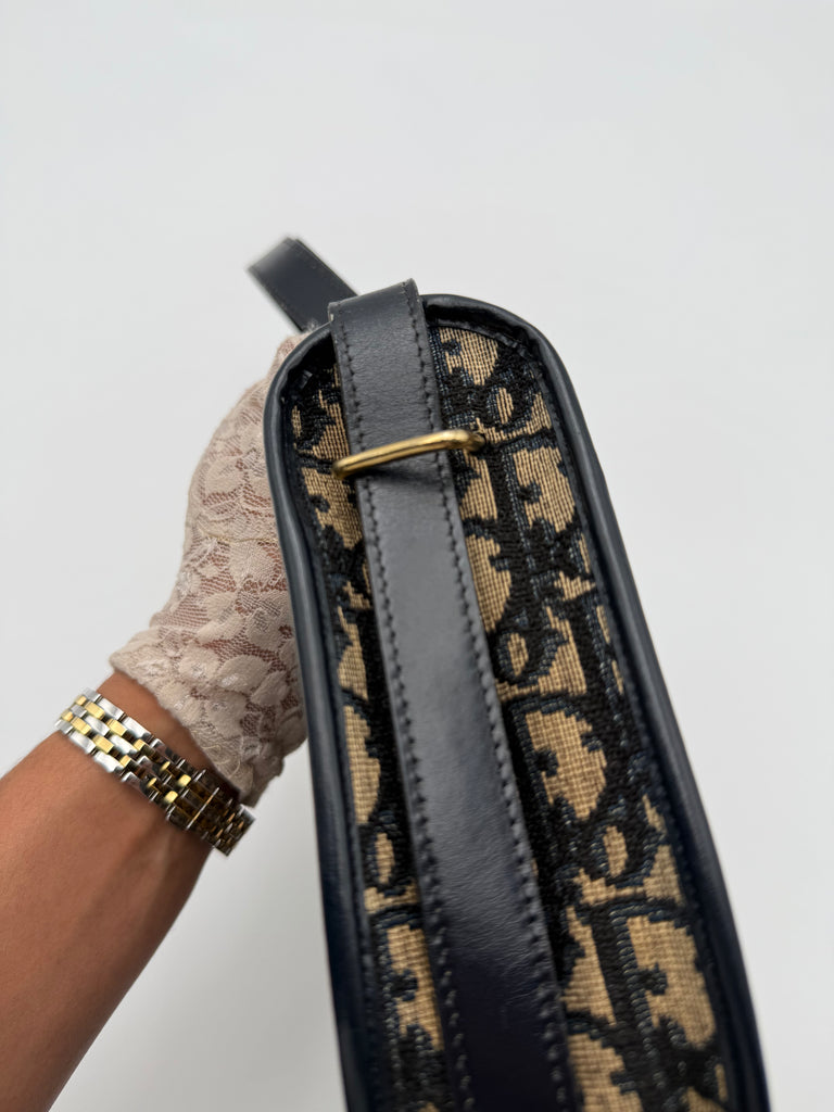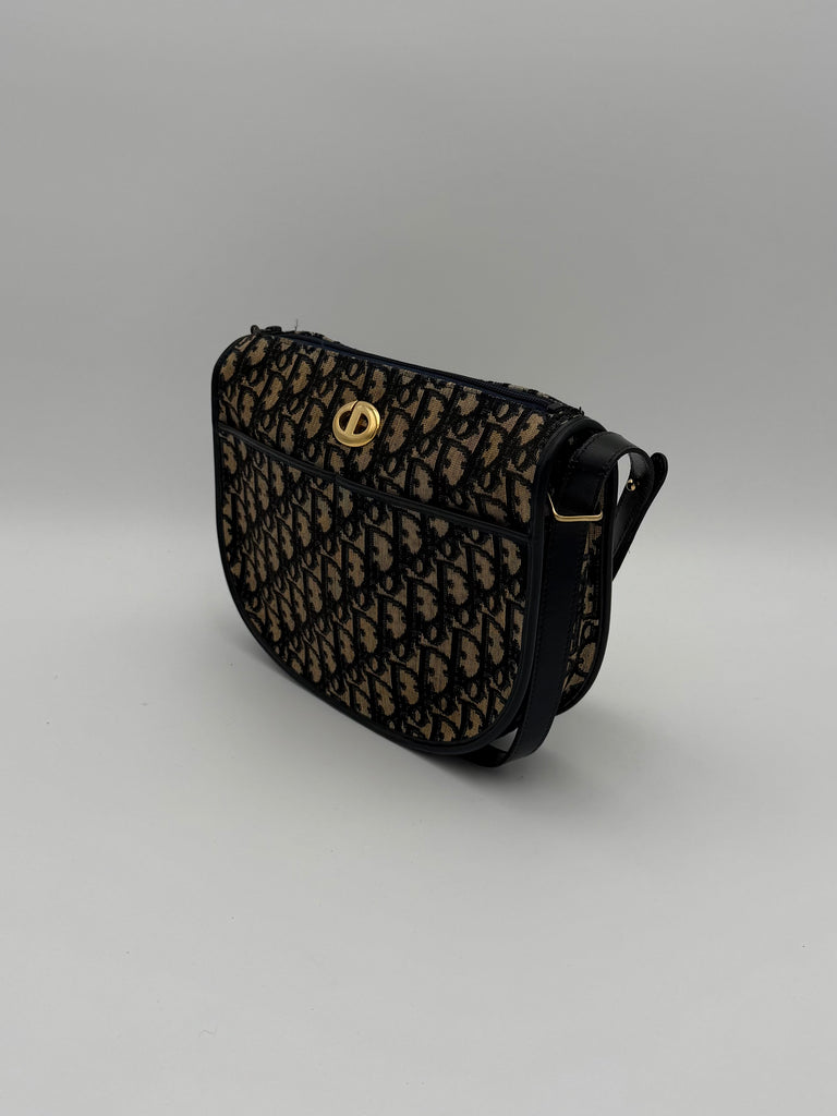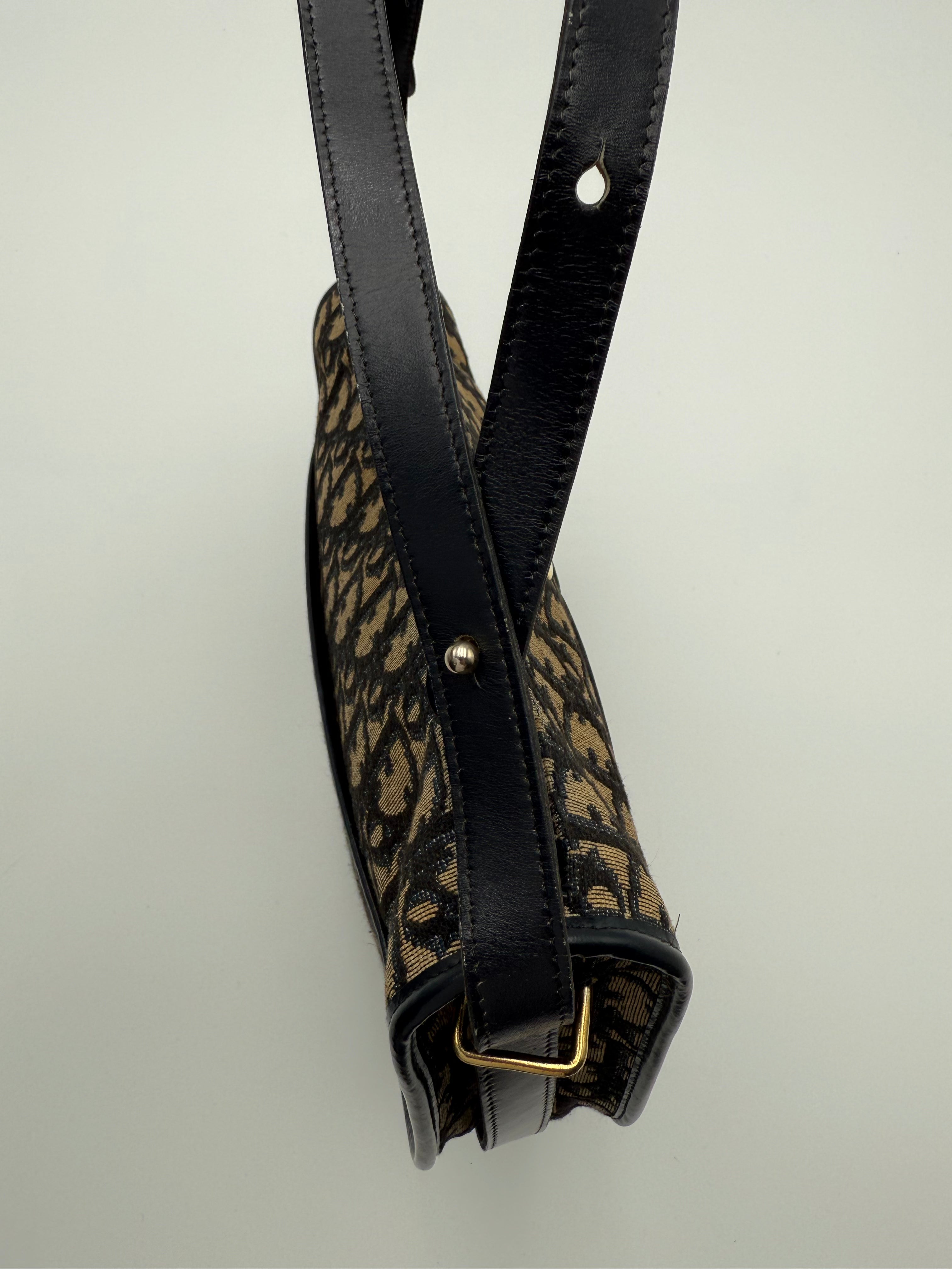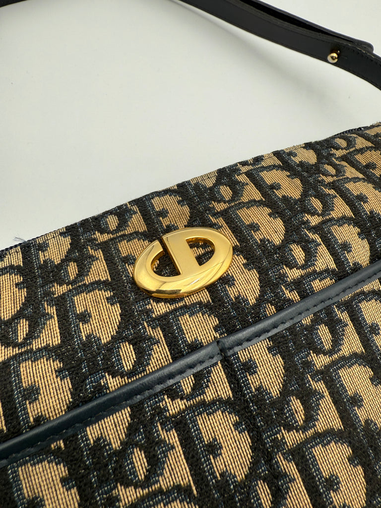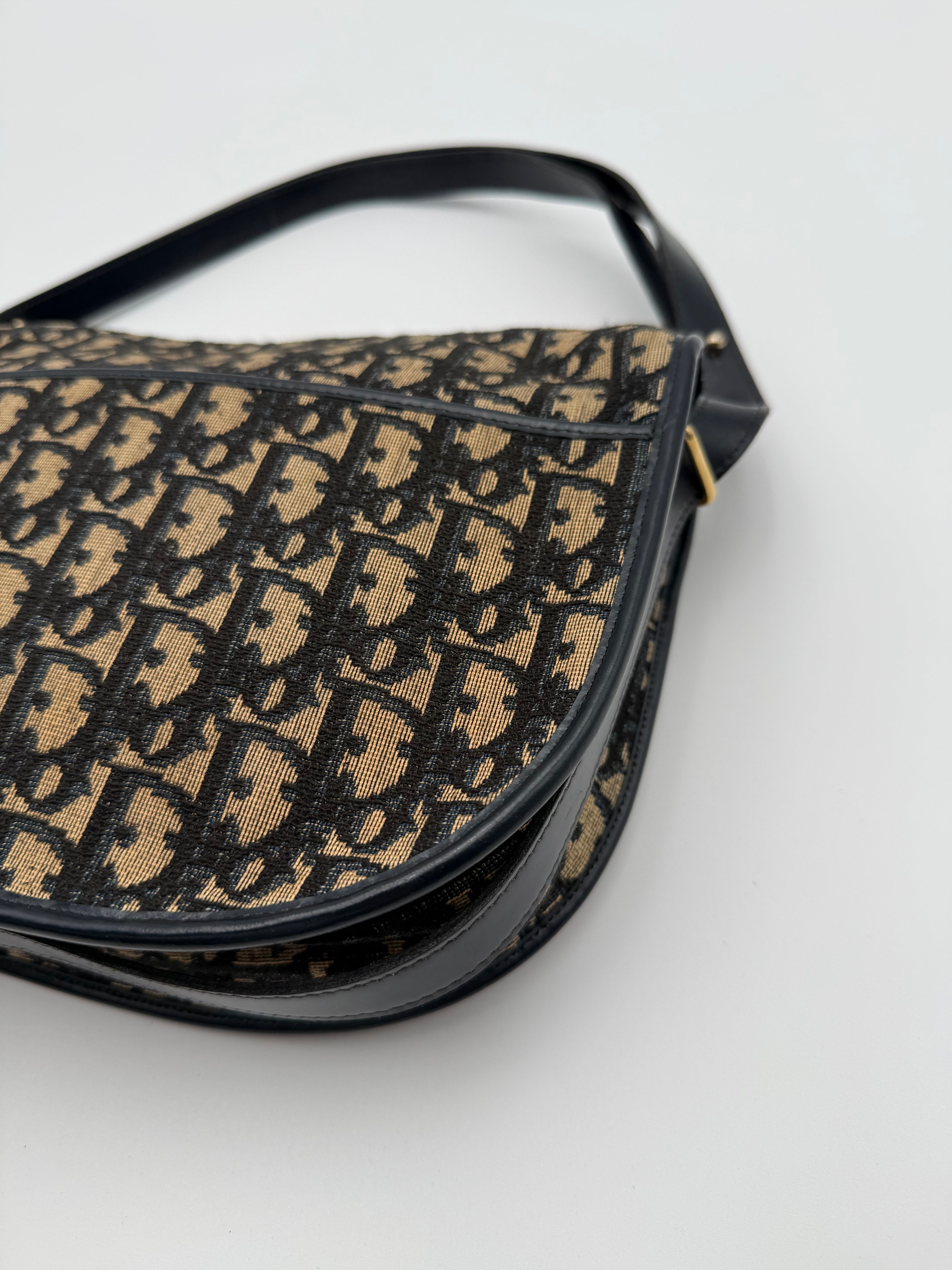 Tweedehands Christian Dior Trotter Canvas bag in de kleur blauw/beige met gouden hardware. De tas beschikt over twee voorvakjes en een achtervakje. De tas kan kort en als crossbody gedragen worden. Het item verkeert in een zeer goede vintage staat, met algemene gebruikssporen. De tas wordt geleverd in onze mooie Moon flower dustbag.