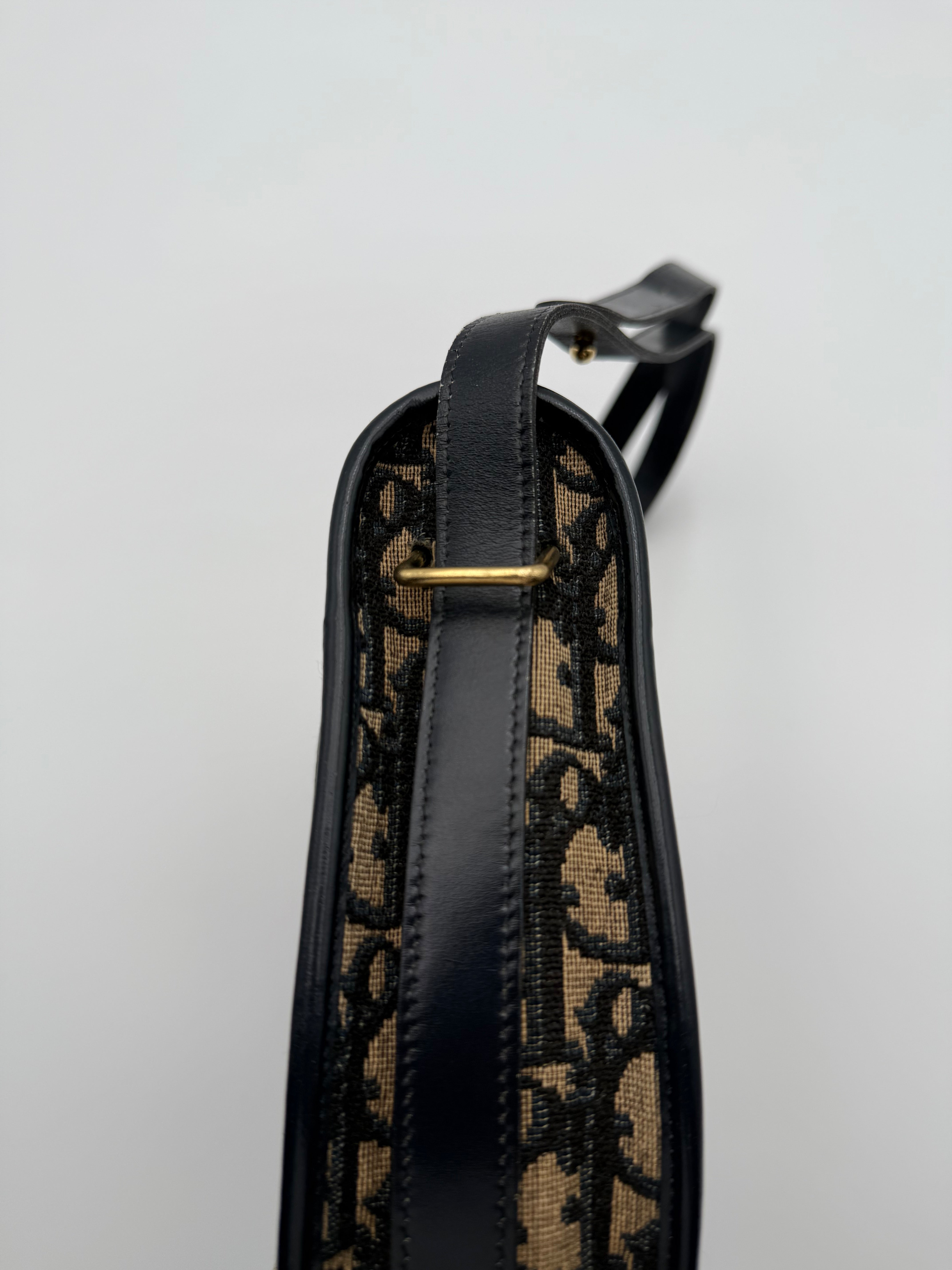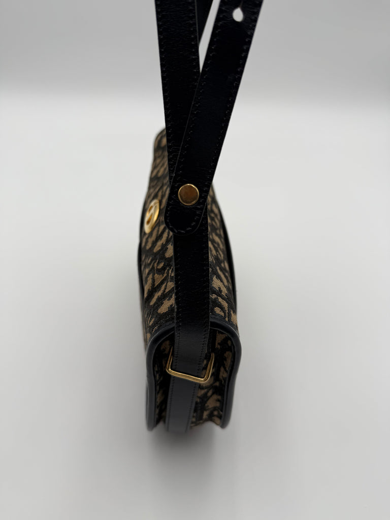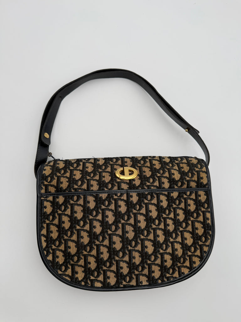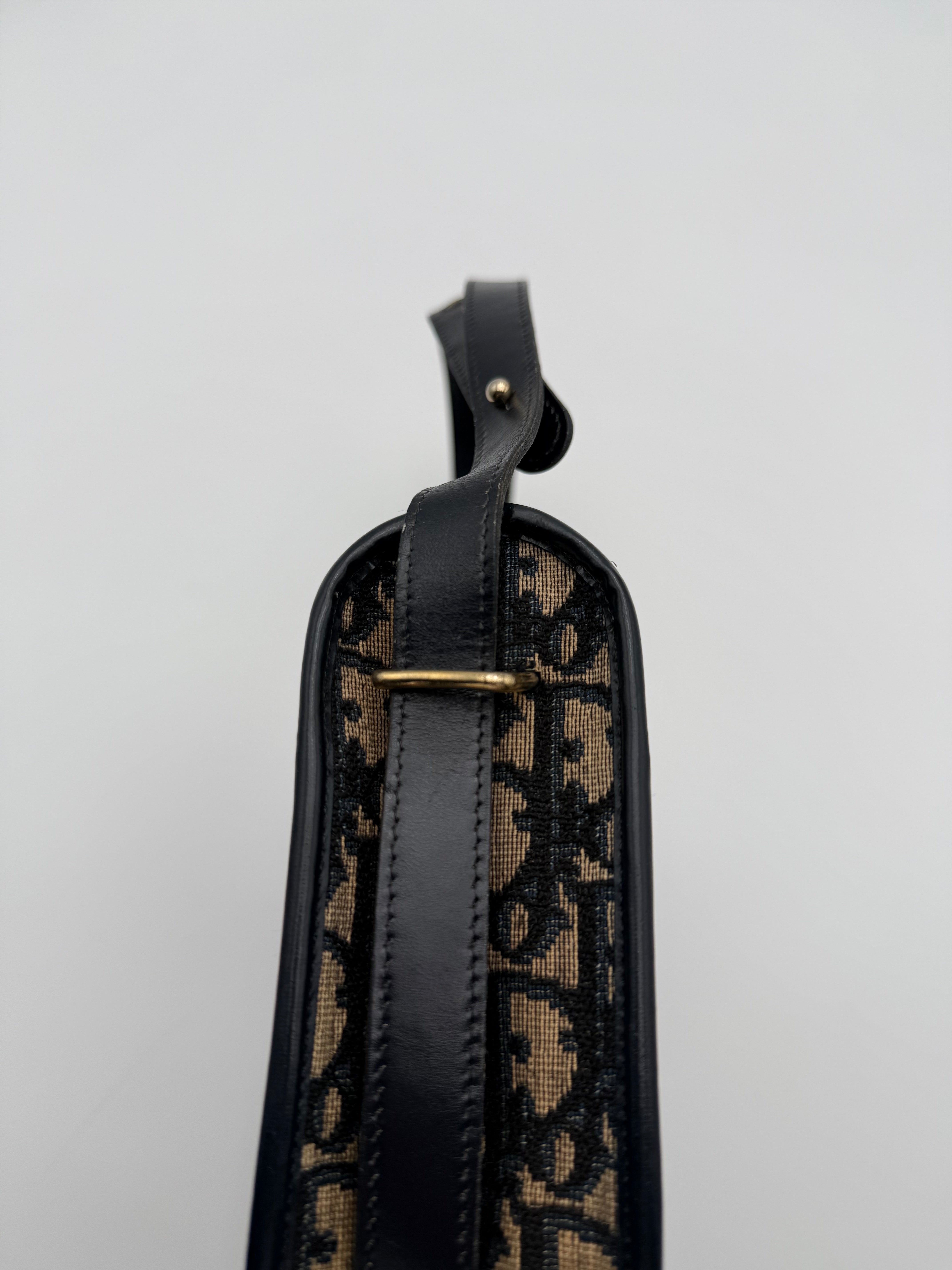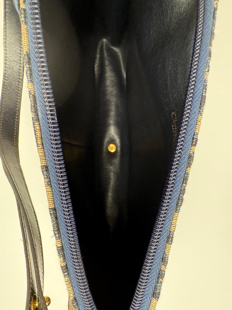 Tweedehands Christian Dior Trotter Canvas bag in de kleur blauw/beige met gouden hardware. De tas beschikt over twee voorvakjes en een achtervakje. De tas kan kort en als crossbody gedragen worden. Het item verkeert in een zeer goede vintage staat, met algemene gebruikssporen. De tas wordt geleverd in onze mooie Moon flower dustbag.