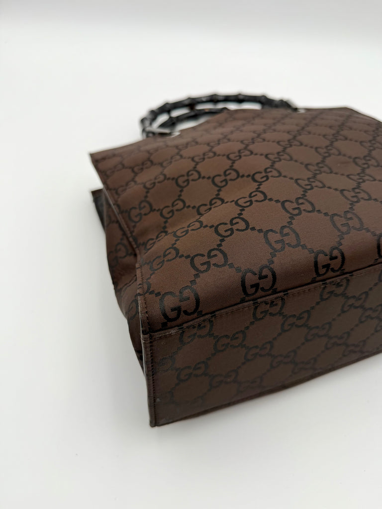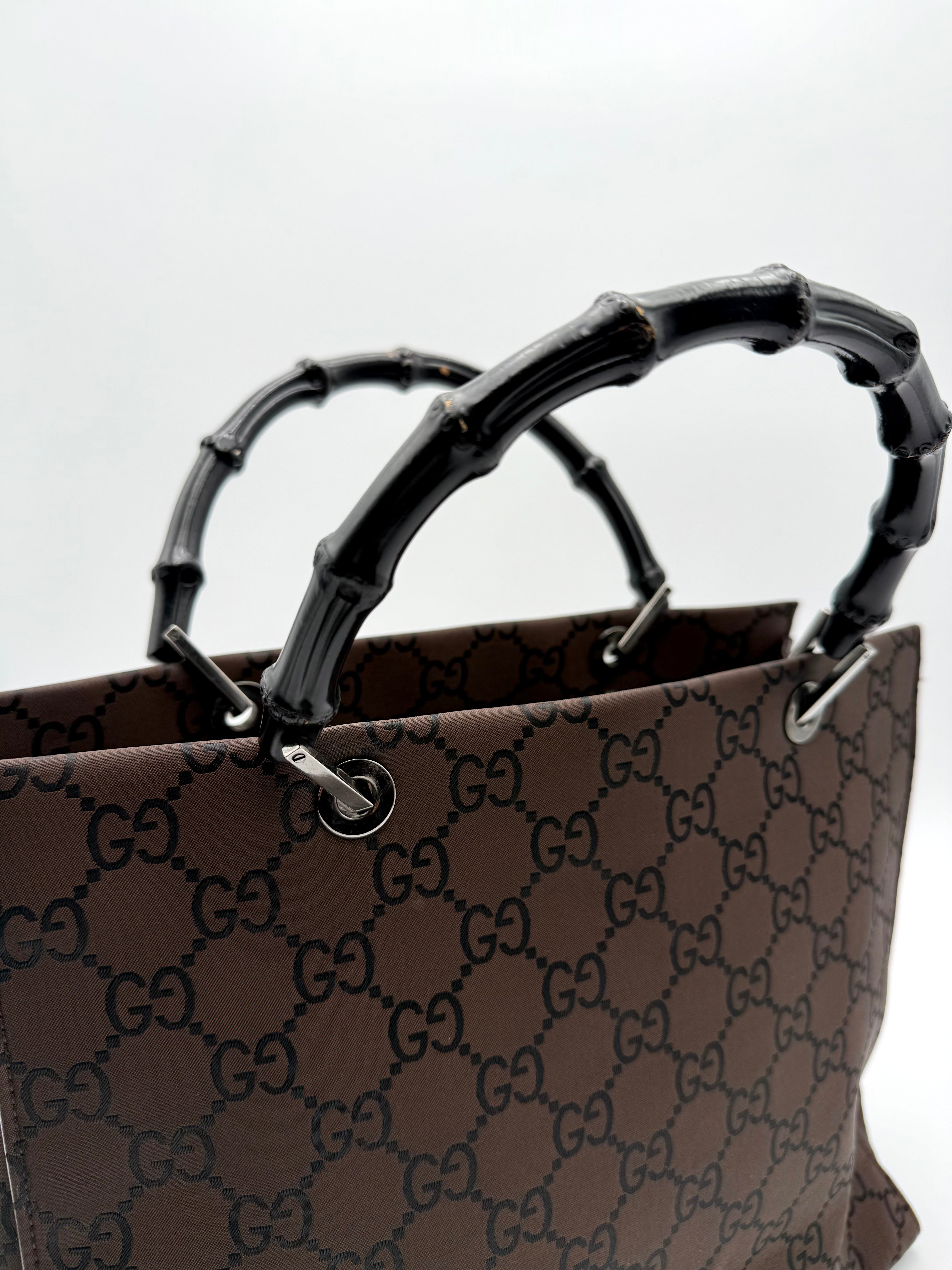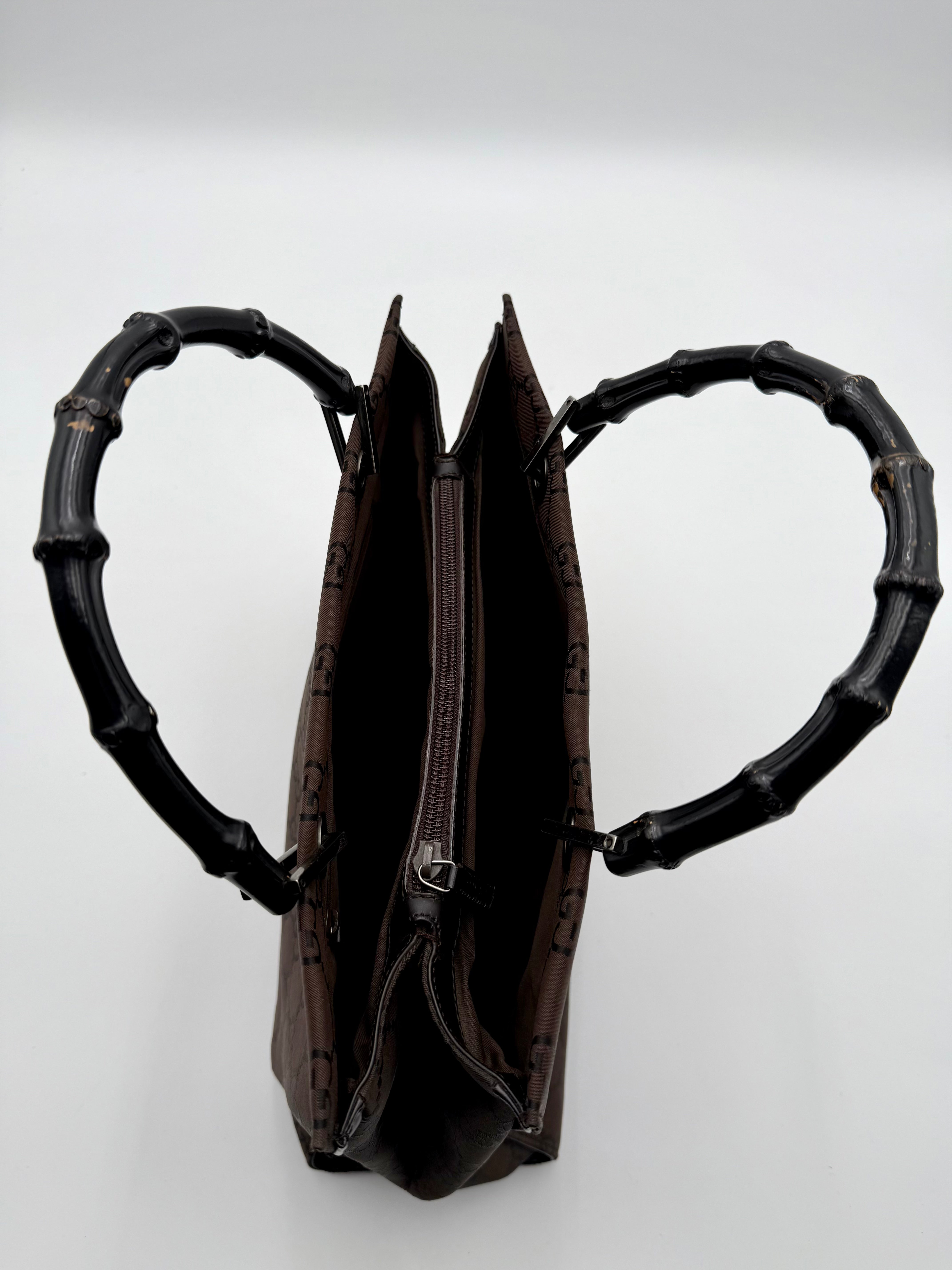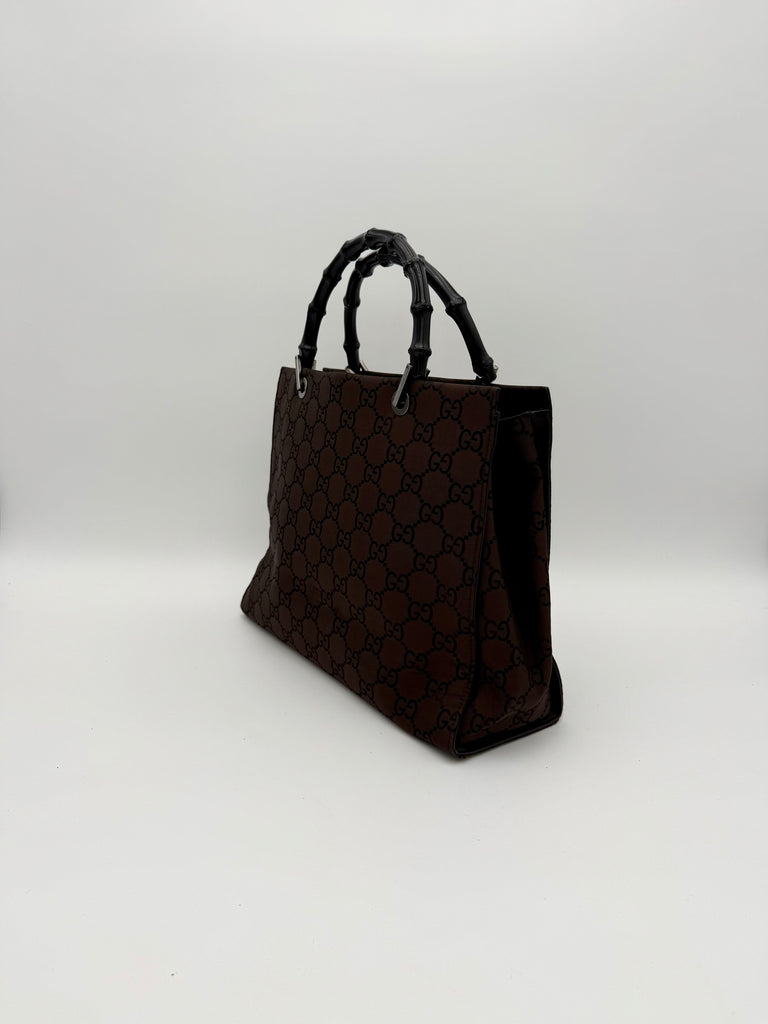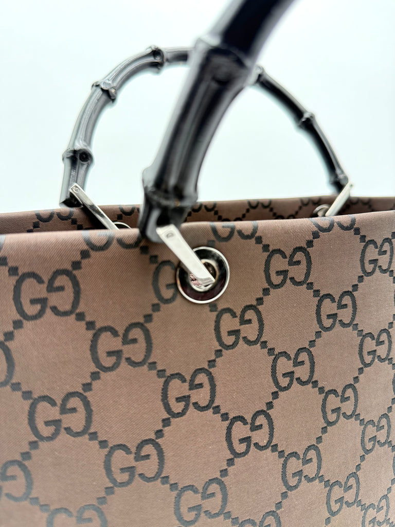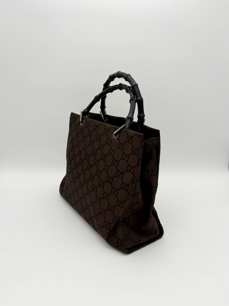 Tweedehands GUCCI bamboo bag met een mooie bruine kleur en bamboe hengsels. De tas beschikt over twee open vakken en een tussenvak met rits en nog een klein binnenvakje met rits. Het item verkeert in een zeer goede vintage staat, met algemene gebruikssporen. De tas wordt geleverd in onze mooie Moon flower dustbag.