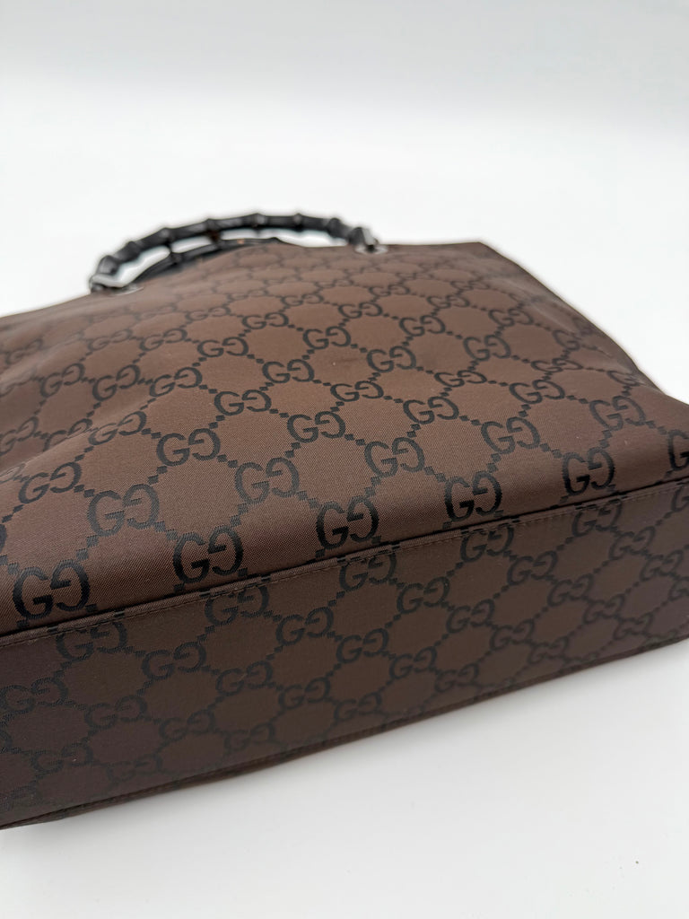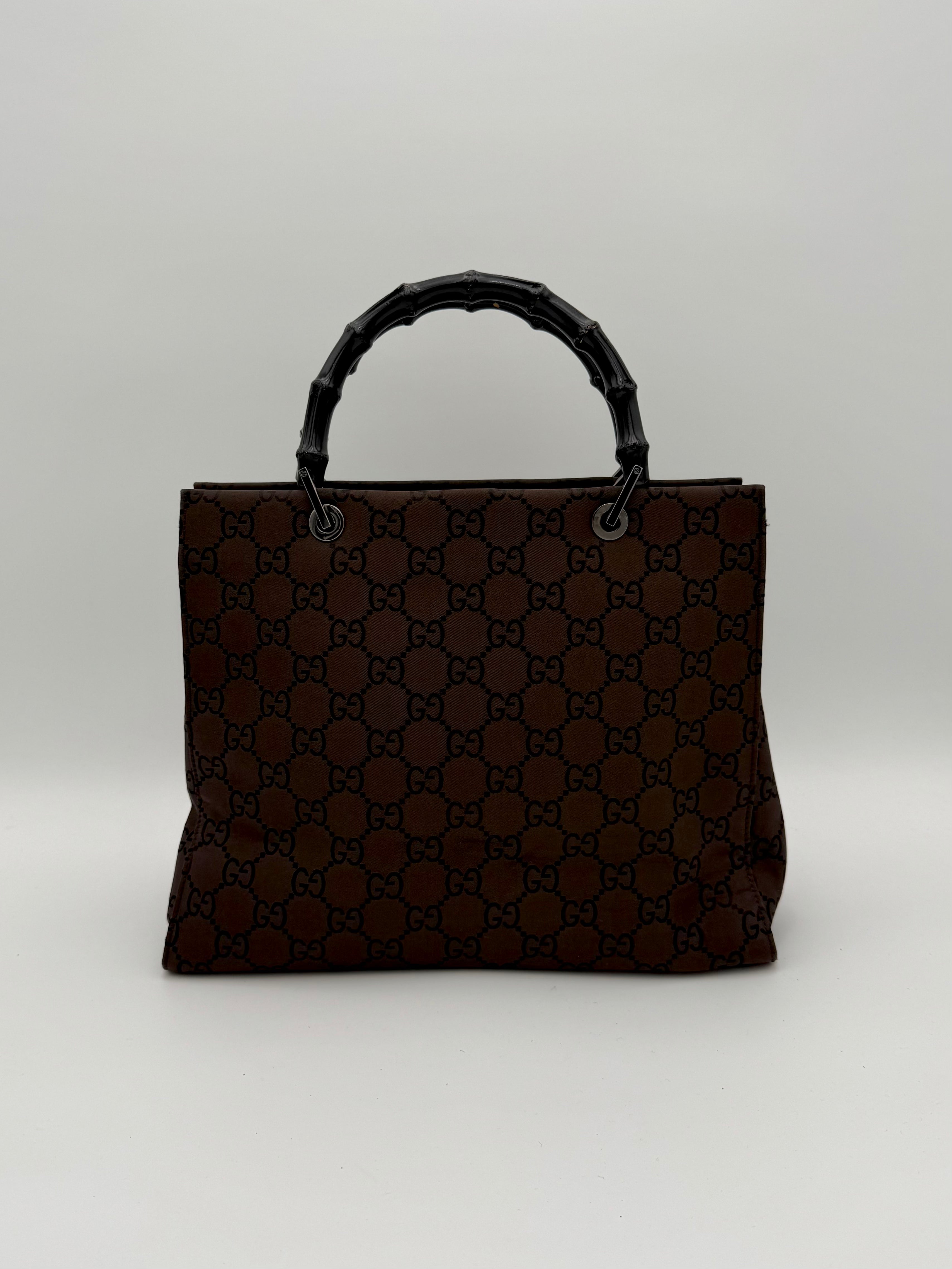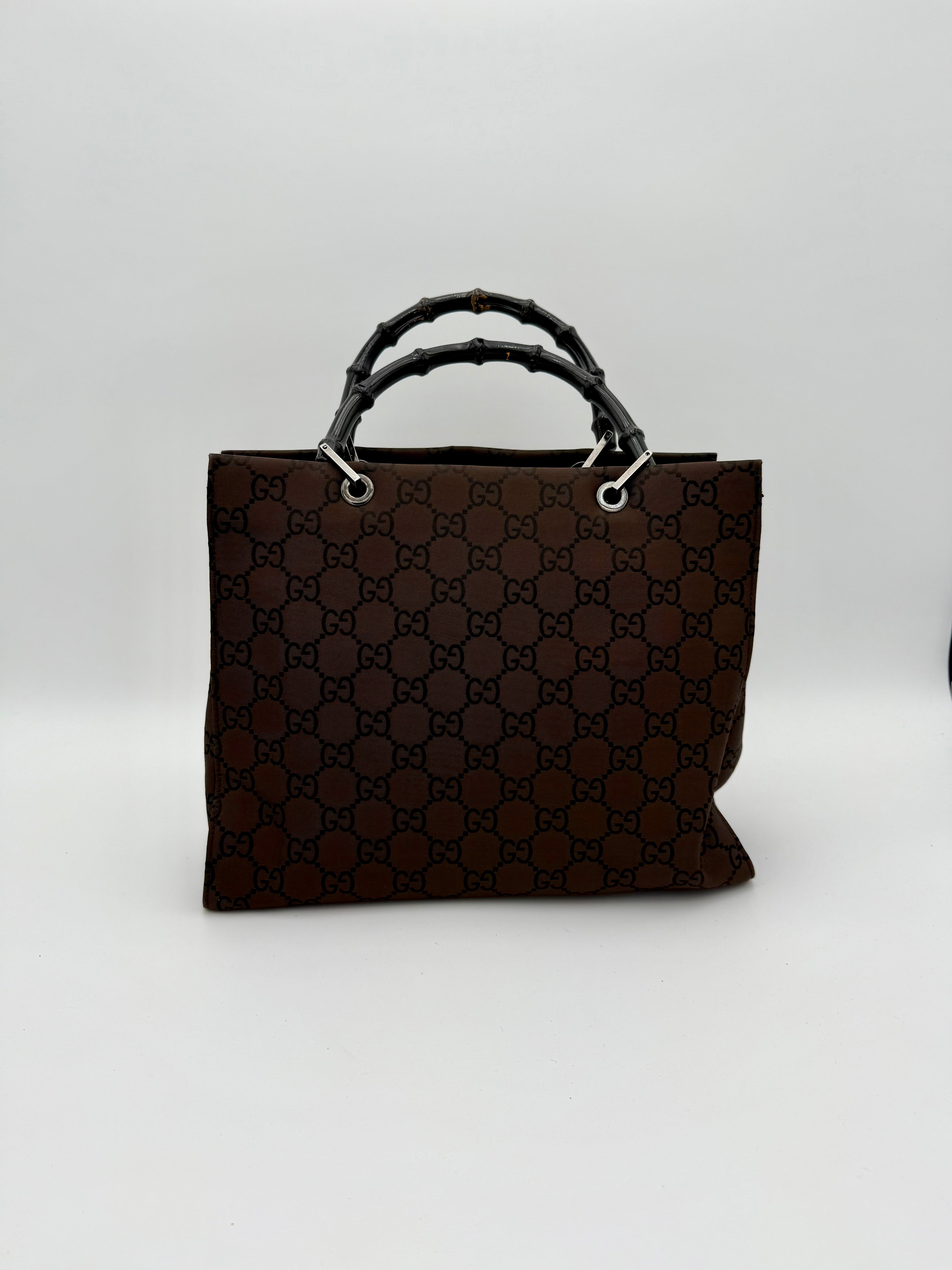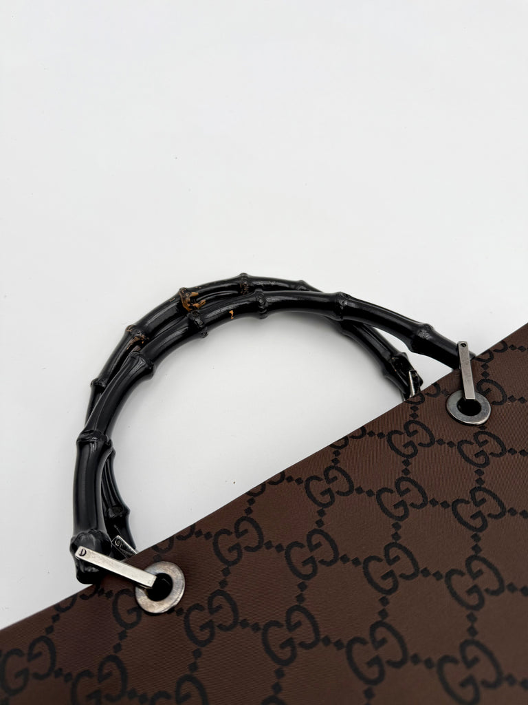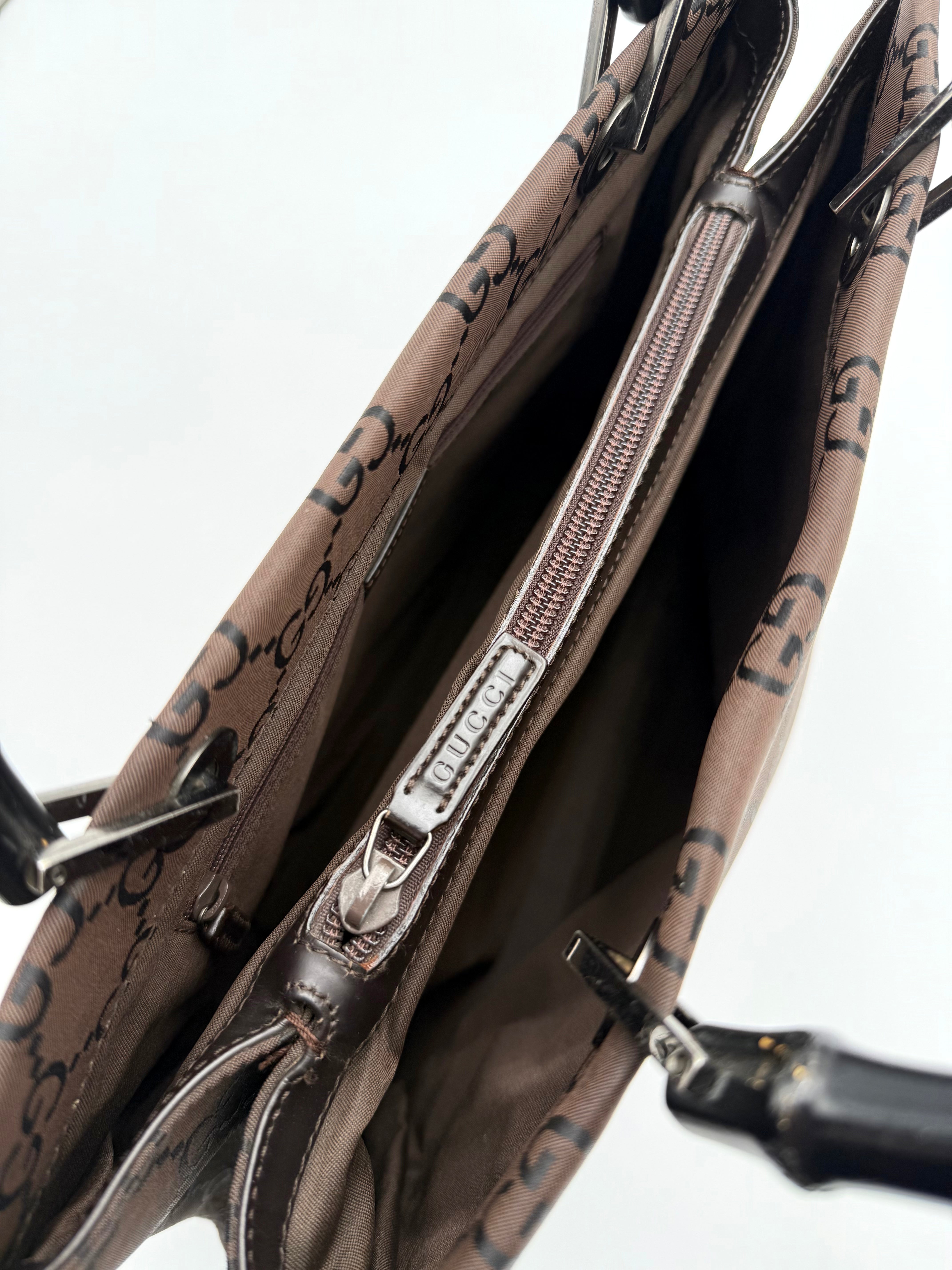 Tweedehands GUCCI bamboo bag met een mooie bruine kleur en bamboe hengsels. De tas beschikt over twee open vakken en een tussenvak met rits en nog een klein binnenvakje met rits. Het item verkeert in een zeer goede vintage staat, met algemene gebruikssporen. De tas wordt geleverd in onze mooie Moon flower dustbag.