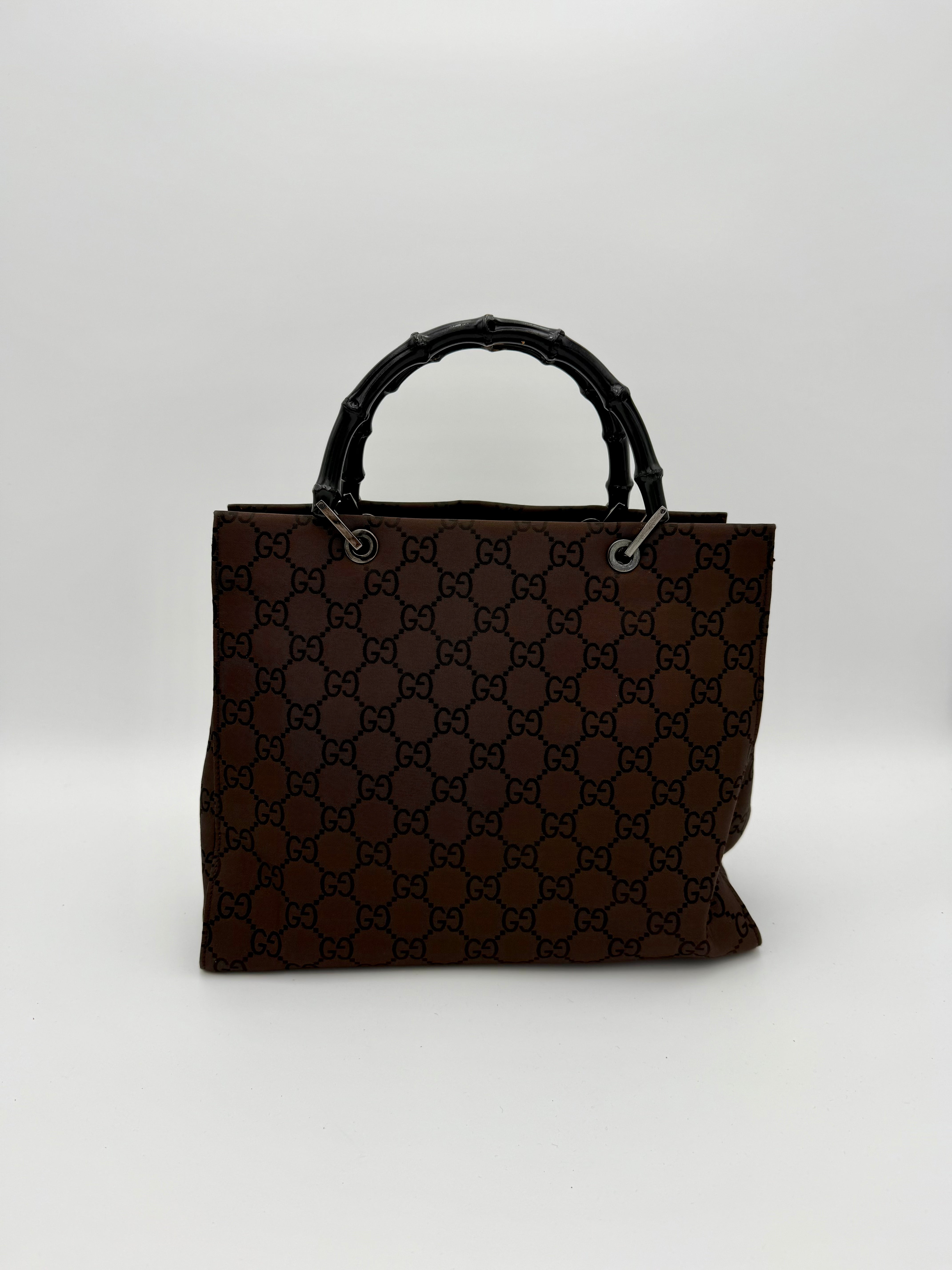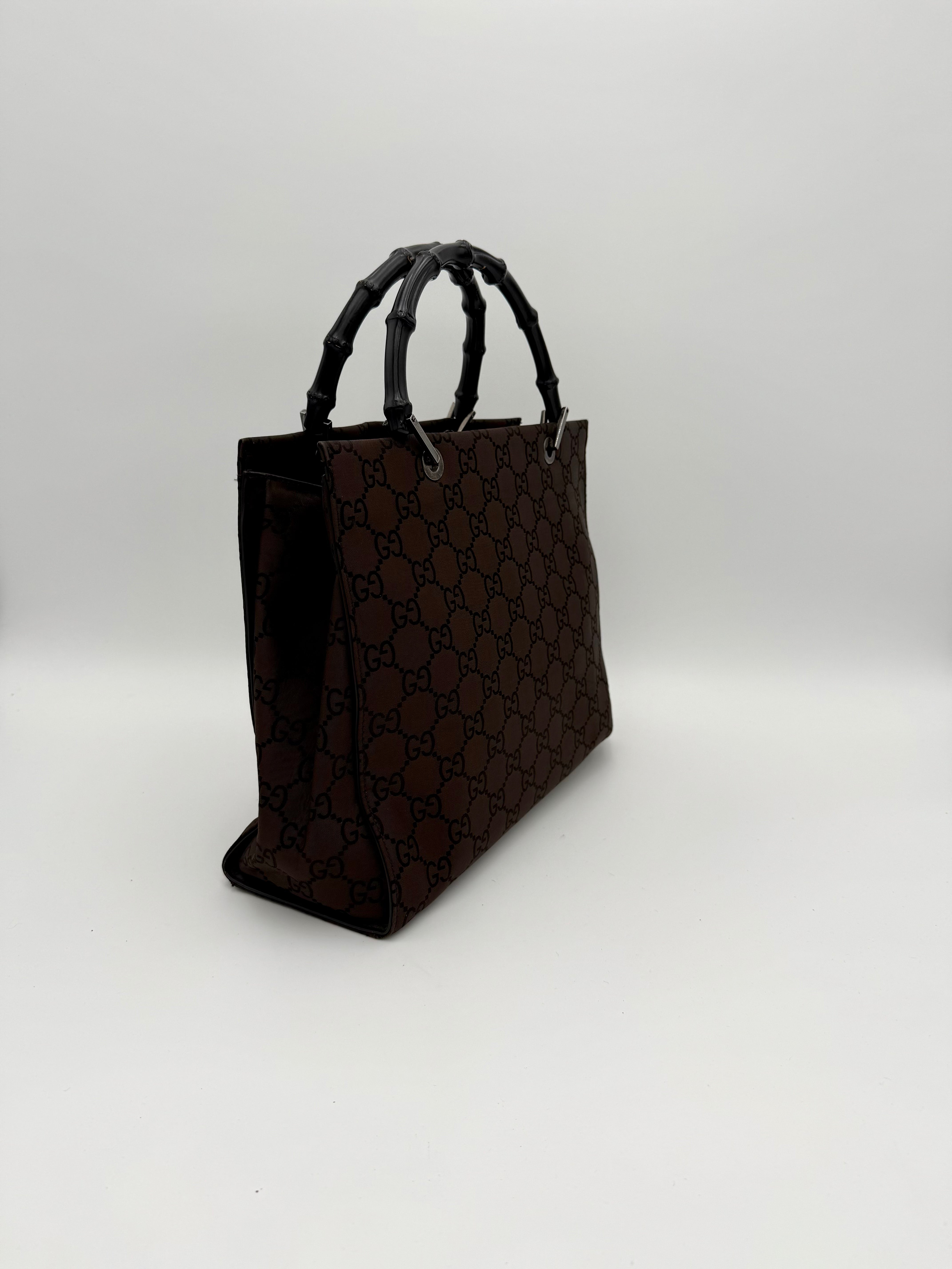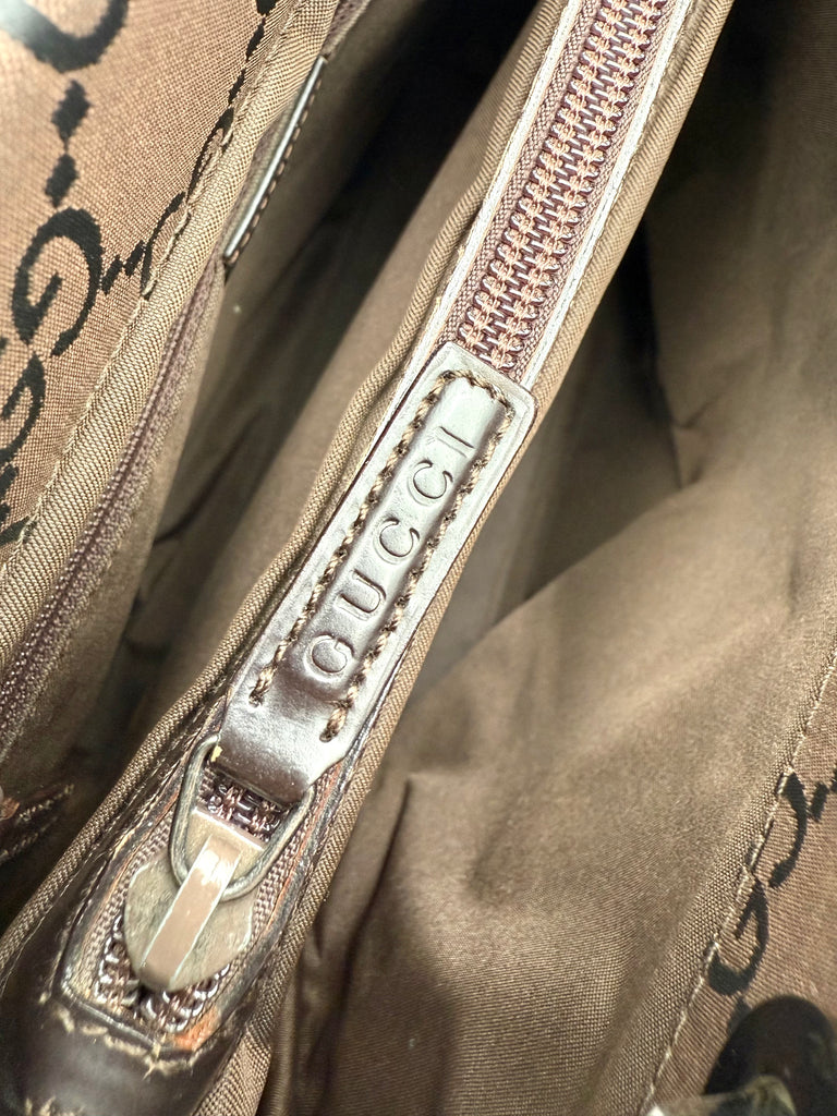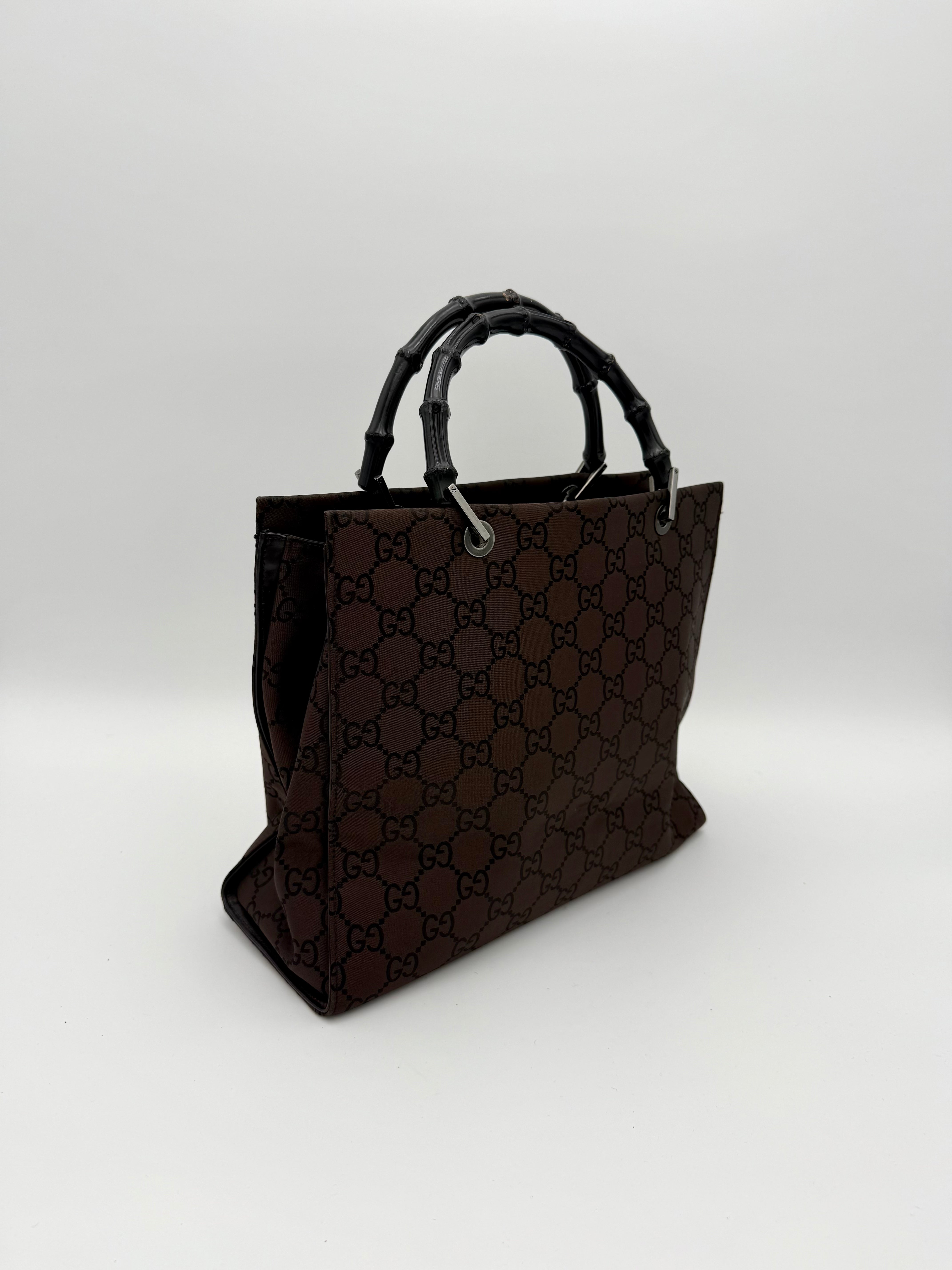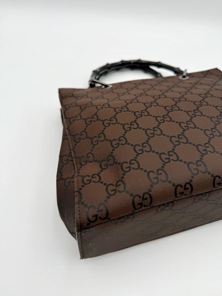 Tweedehands GUCCI bamboo bag met een mooie bruine kleur en bamboe hengsels. De tas beschikt over twee open vakken en een tussenvak met rits en nog een klein binnenvakje met rits. Het item verkeert in een zeer goede vintage staat, met algemene gebruikssporen. De tas wordt geleverd in onze mooie Moon flower dustbag.