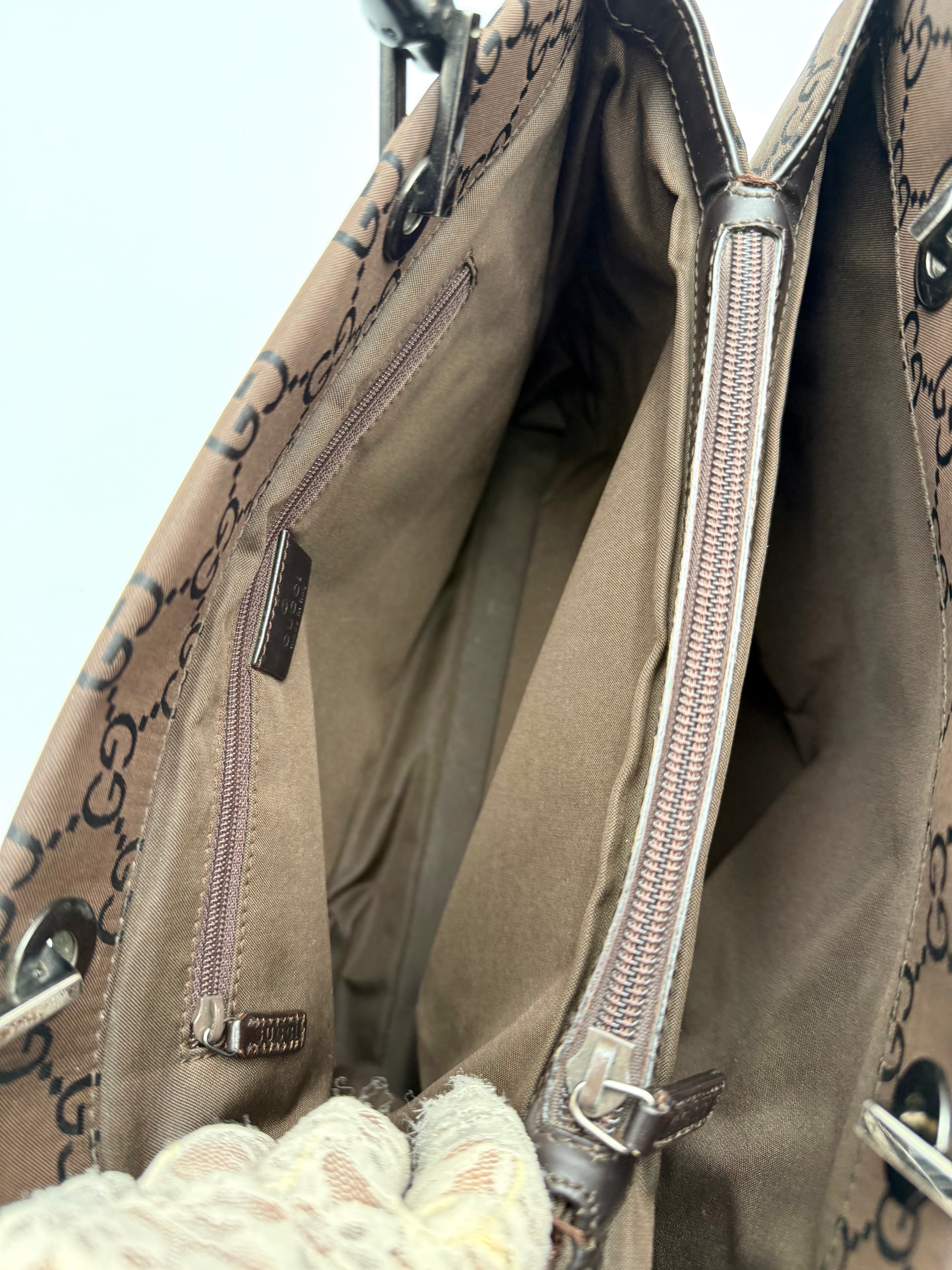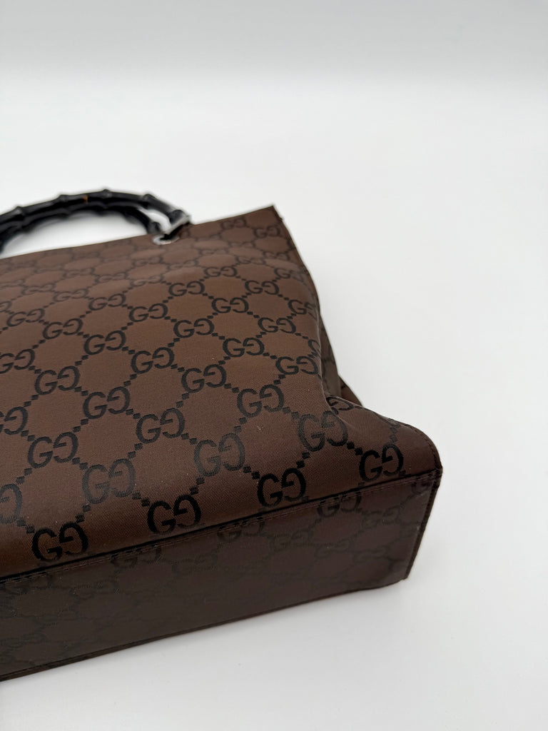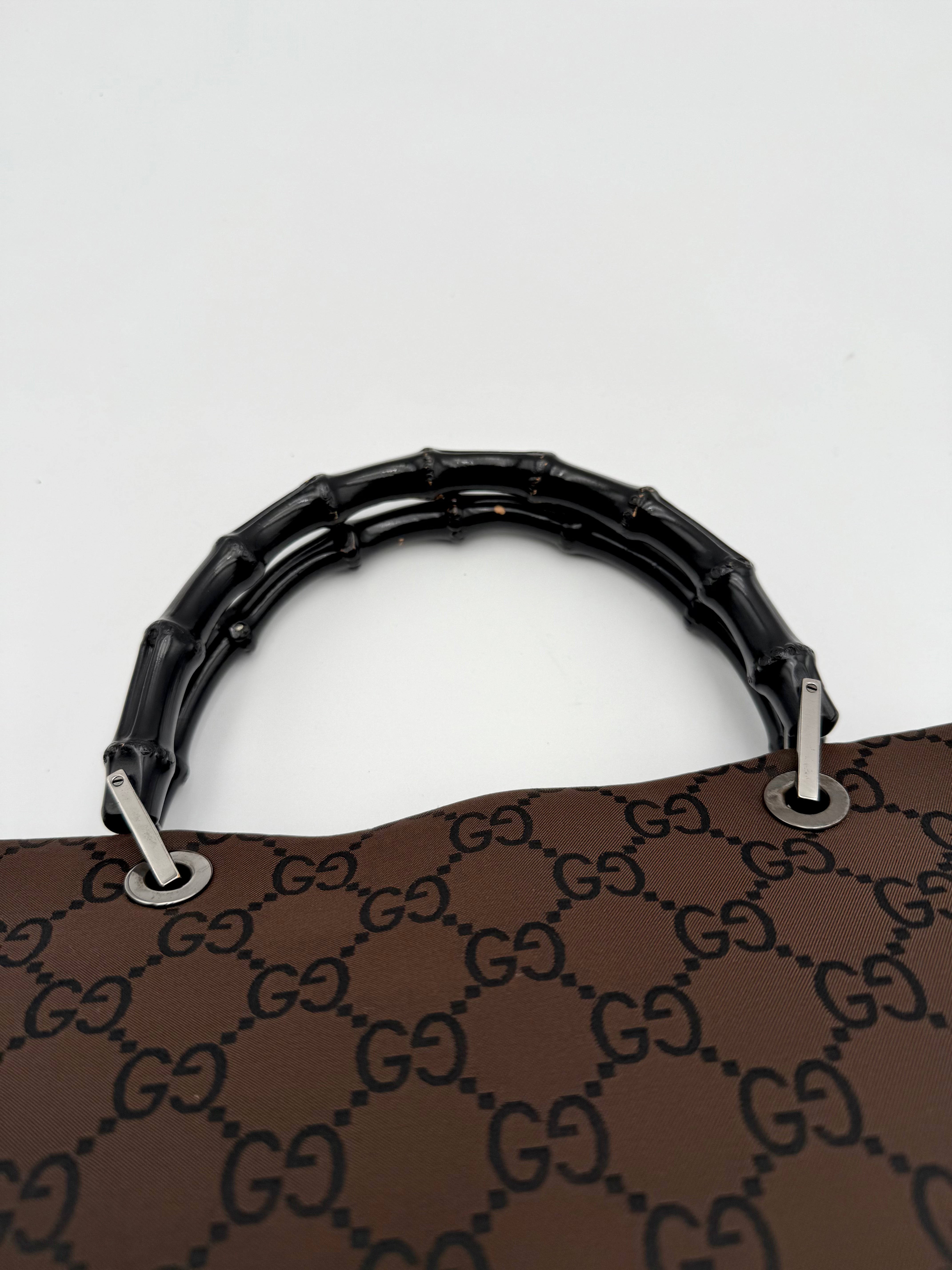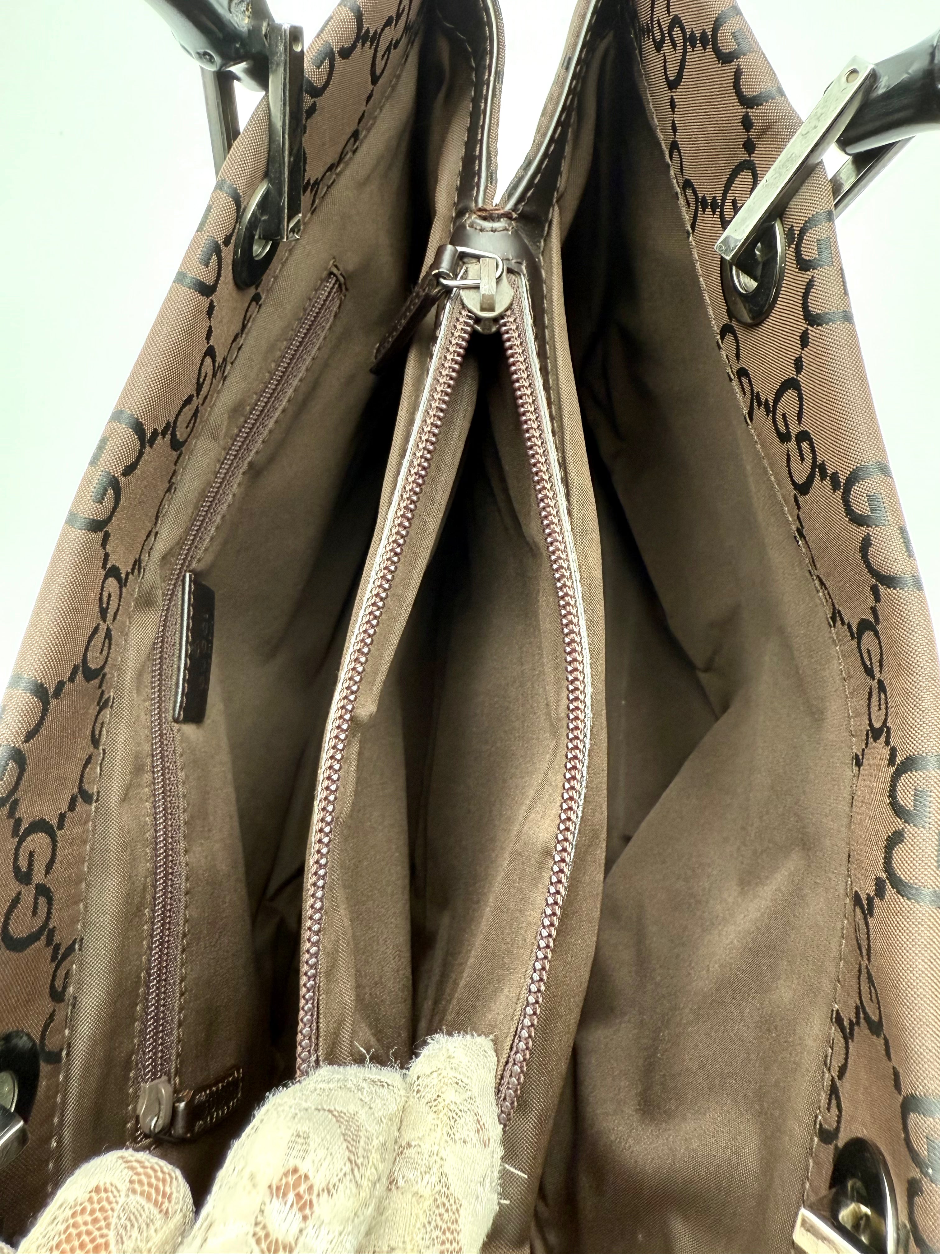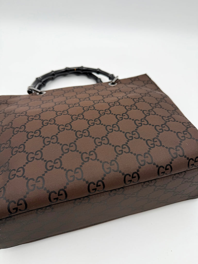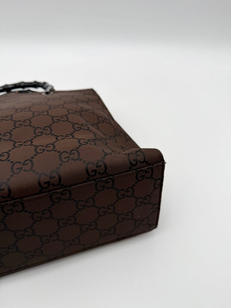 Tweedehands GUCCI bamboo bag met een mooie bruine kleur en bamboe hengsels. De tas beschikt over twee open vakken en een tussenvak met rits en nog een klein binnenvakje met rits. Het item verkeert in een zeer goede vintage staat, met algemene gebruikssporen. De tas wordt geleverd in onze mooie Moon flower dustbag.