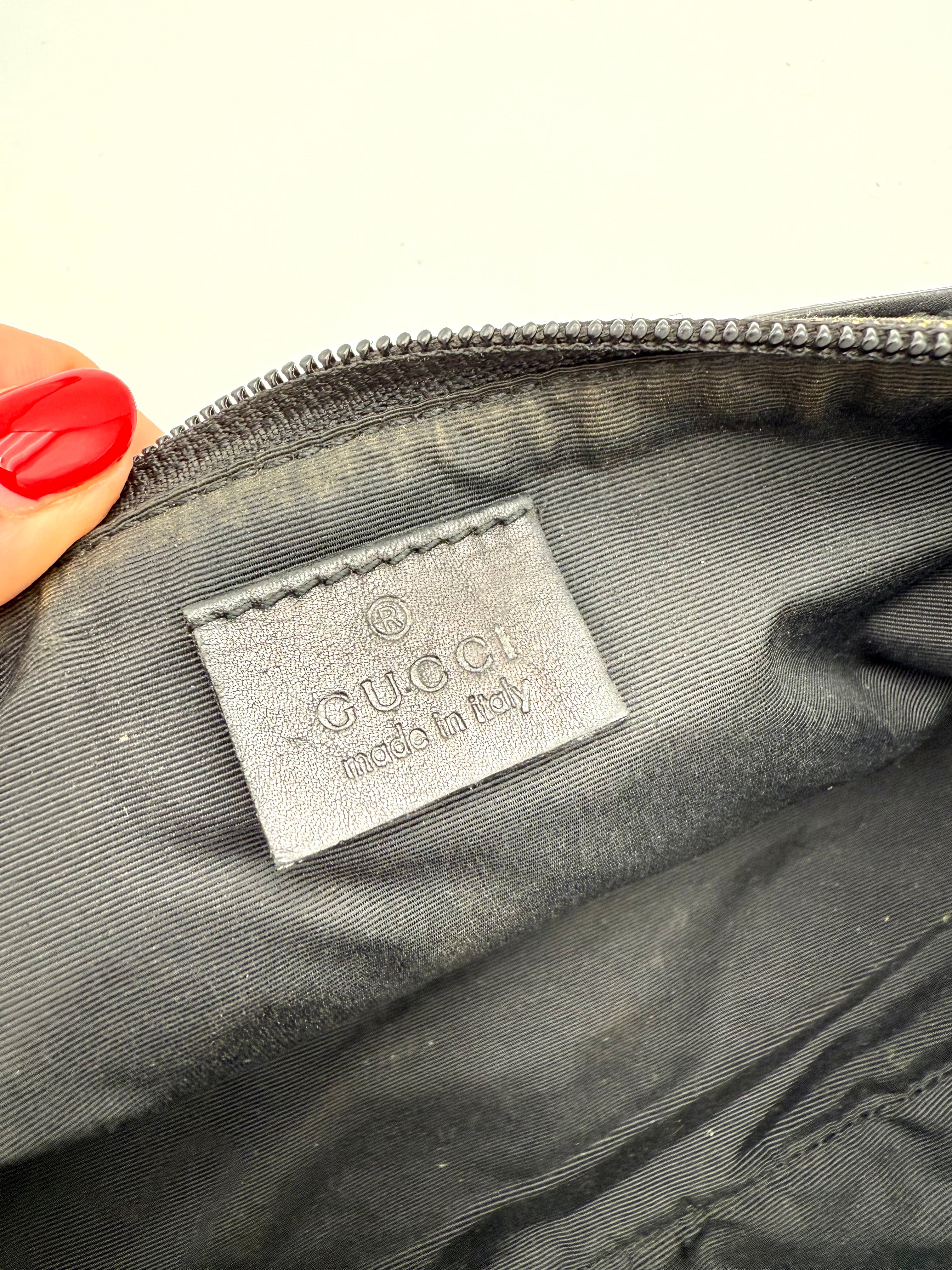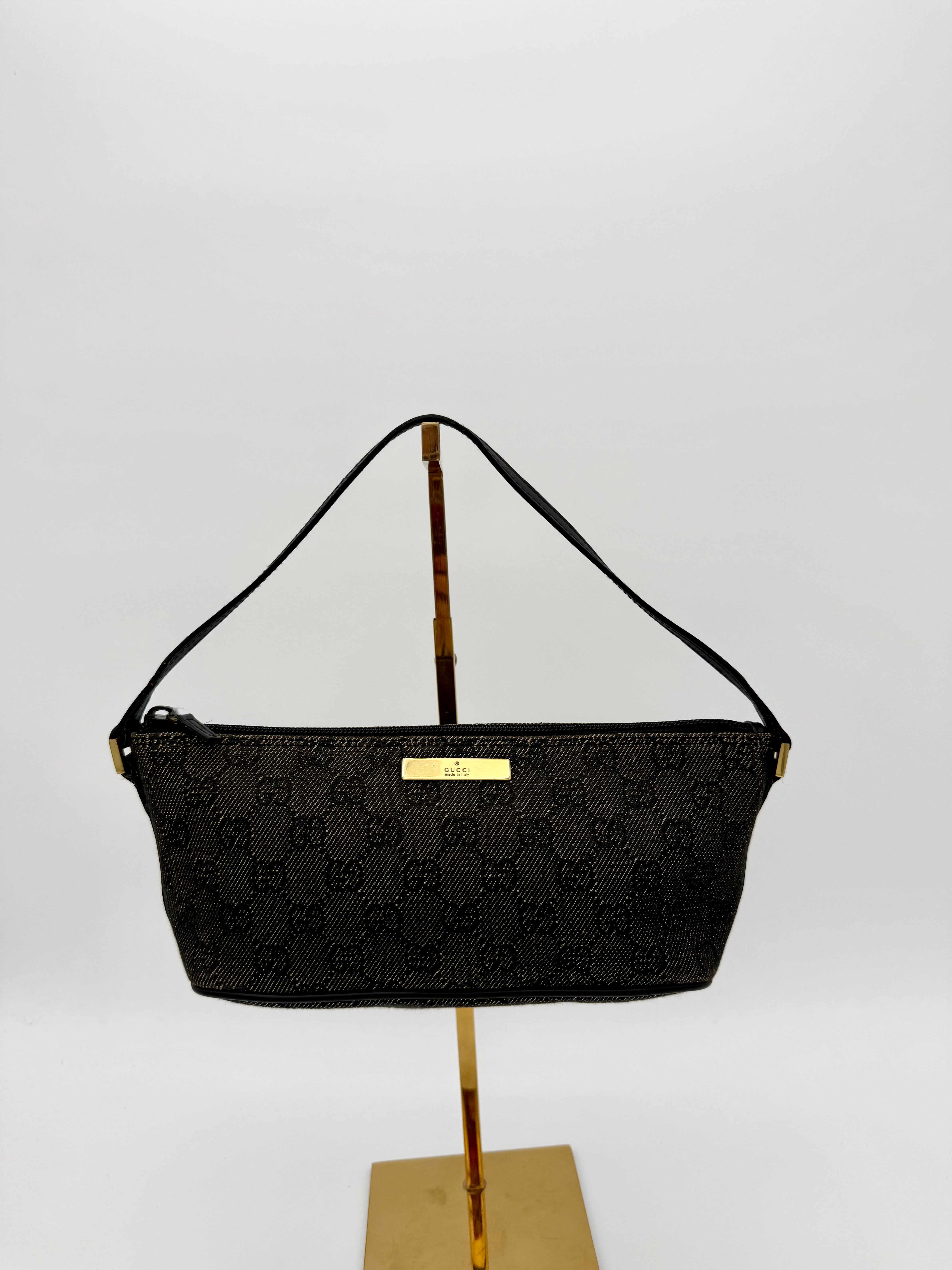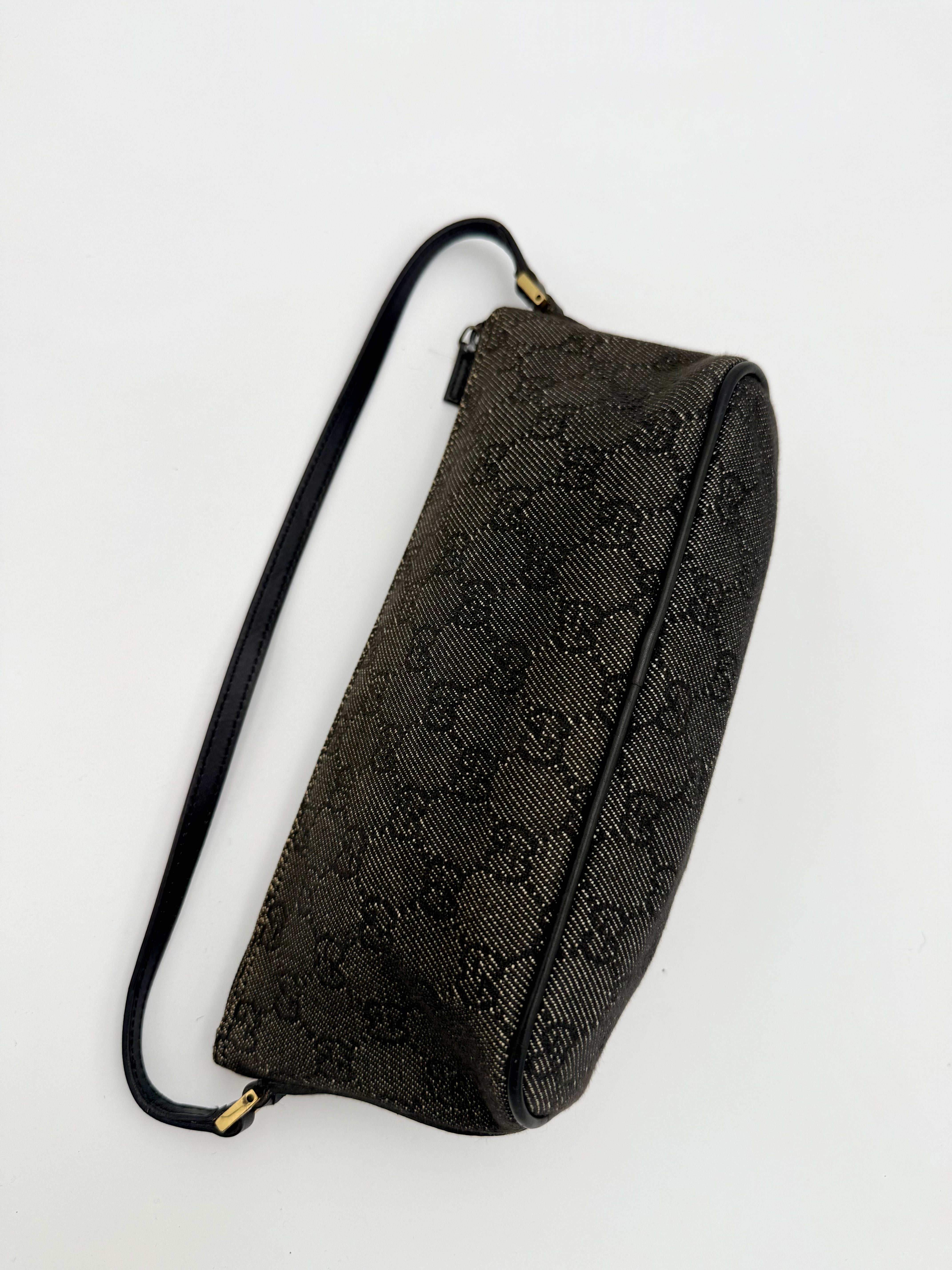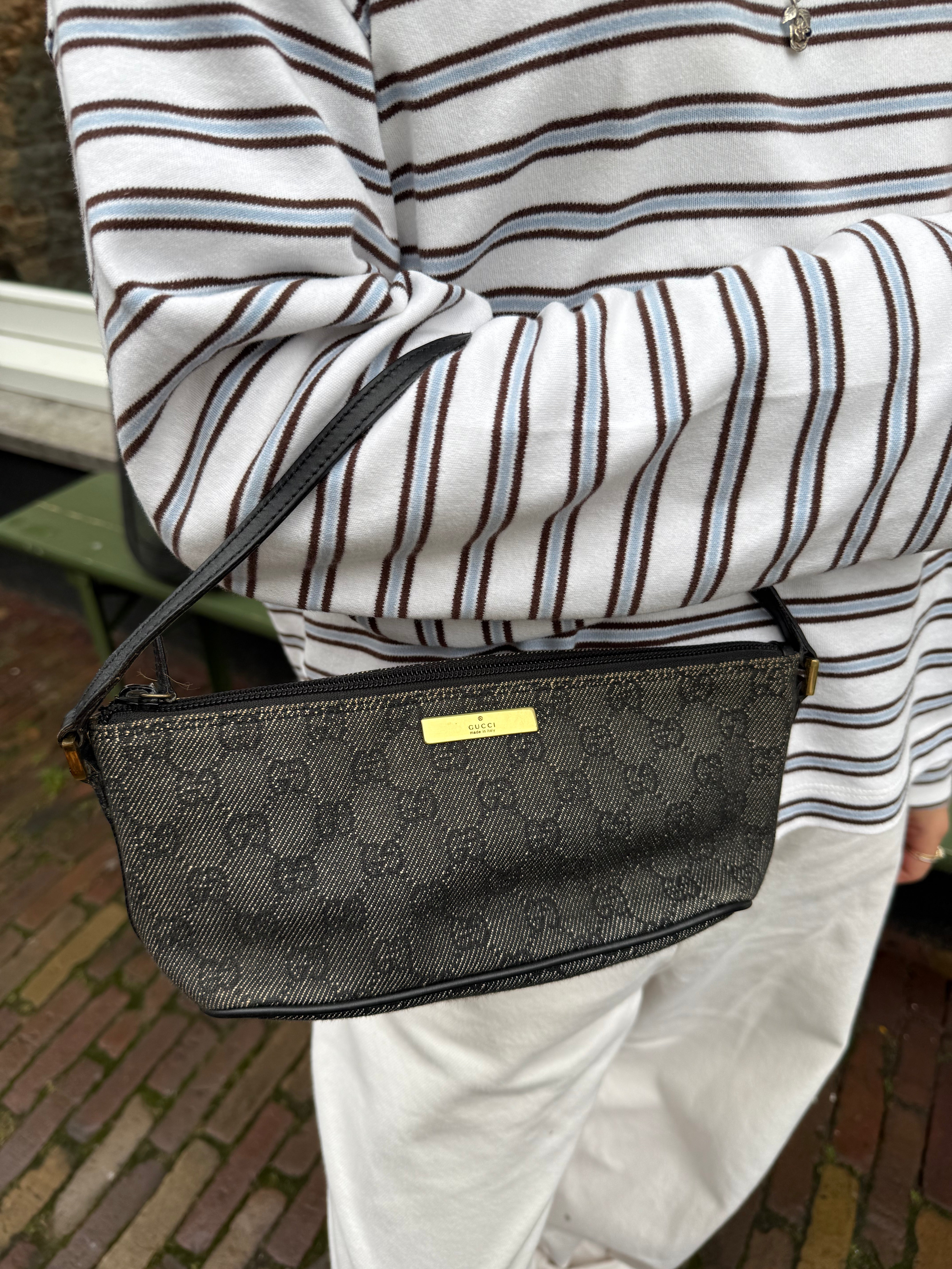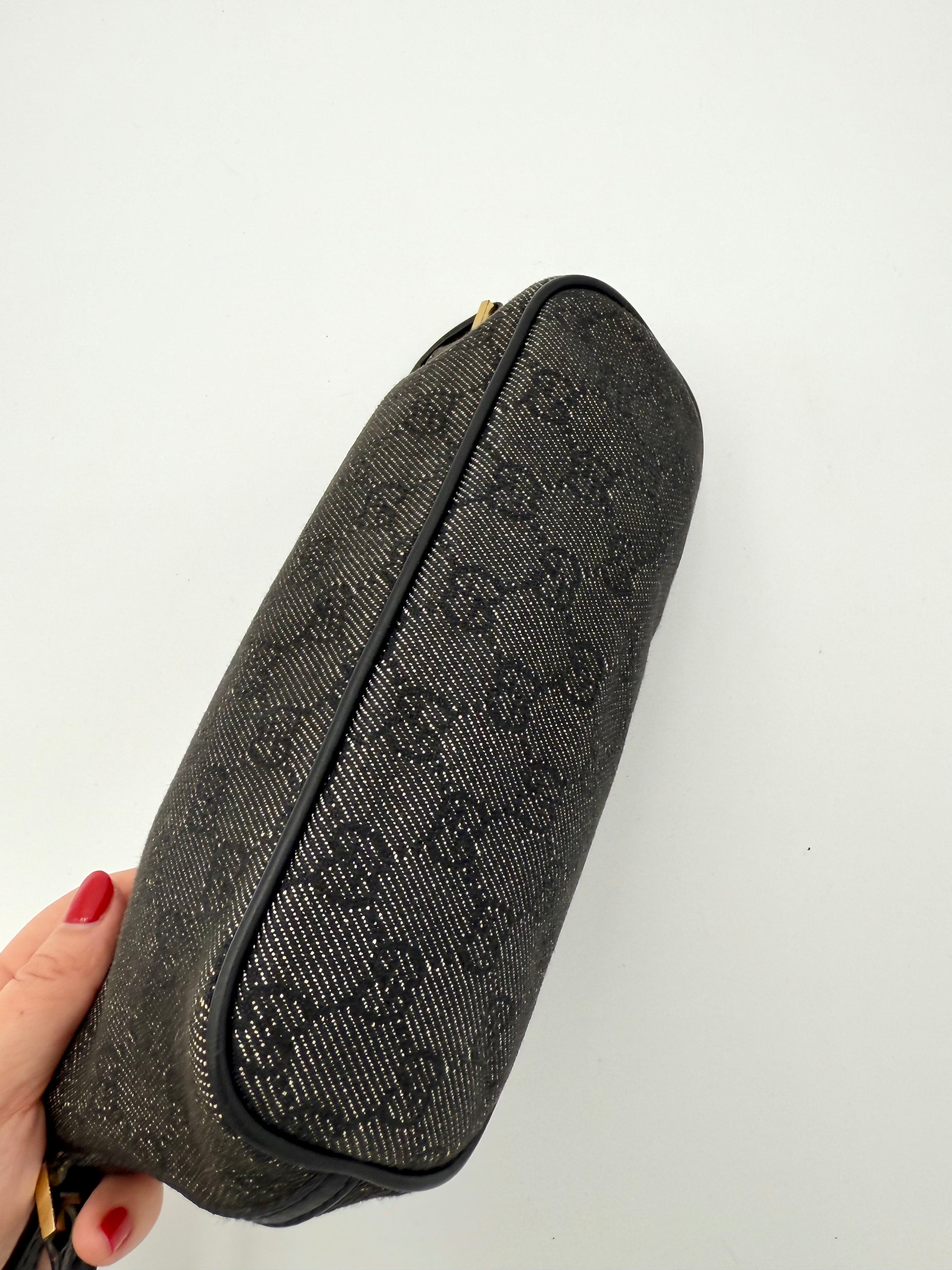 Tweedehands GUCCI canvas bag in een grijs met grijs/zwarte denim kleur. De tas is van canvas met een leren hengsel en met gouden hardware. De tas sluit met een rits. Het item verkeert in een zeer goede vintage staat, met algemene gebruikssporen. De tas wordt geleverd in onze mooie Moon flower dustbag.
