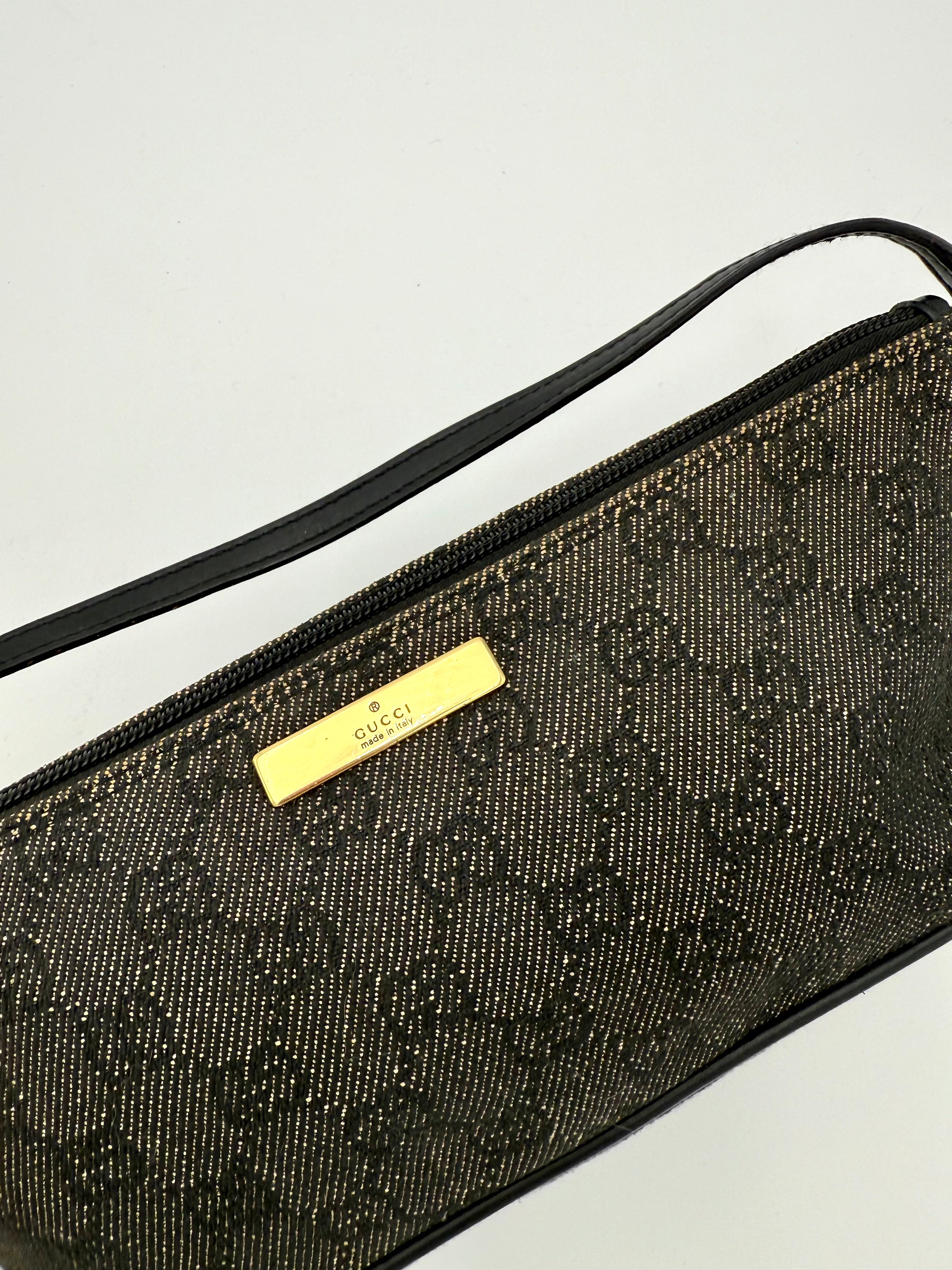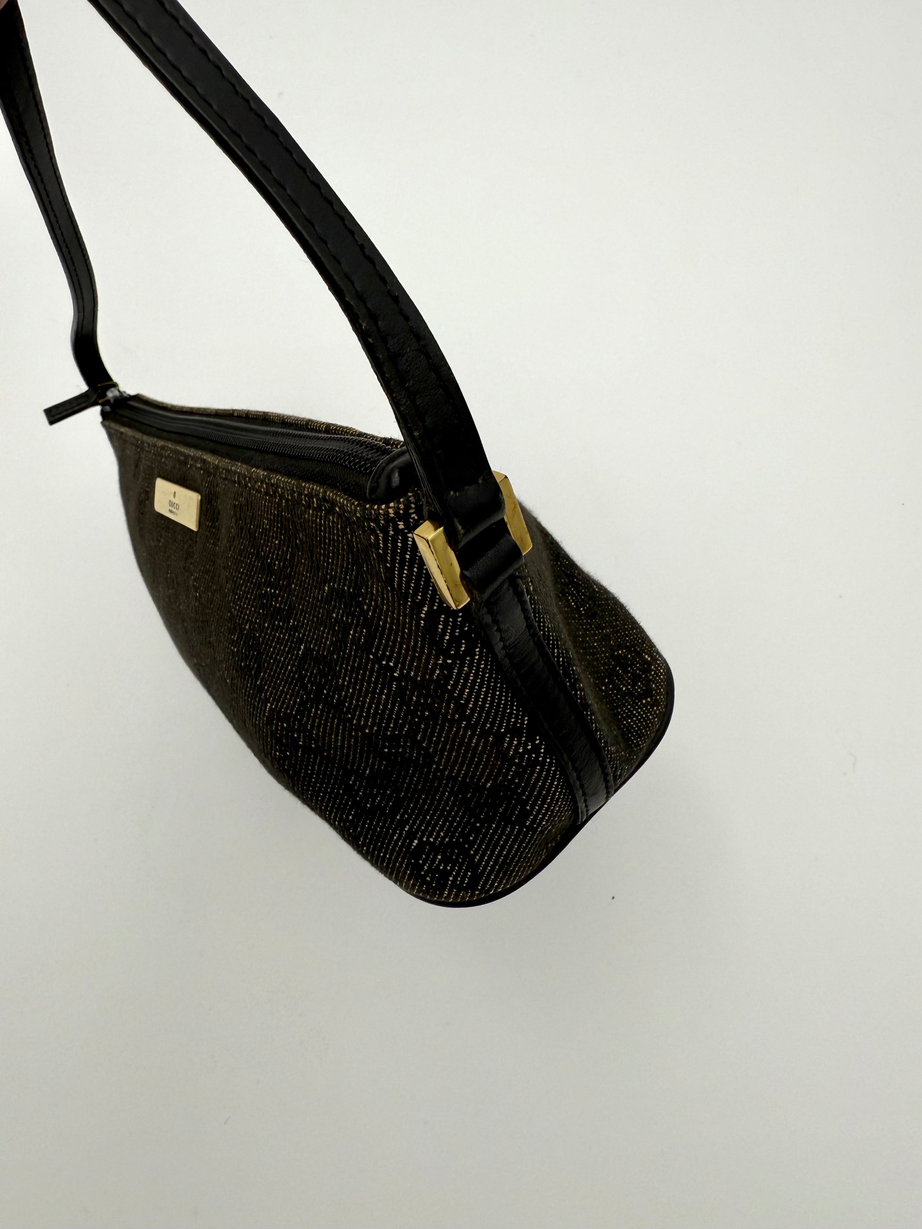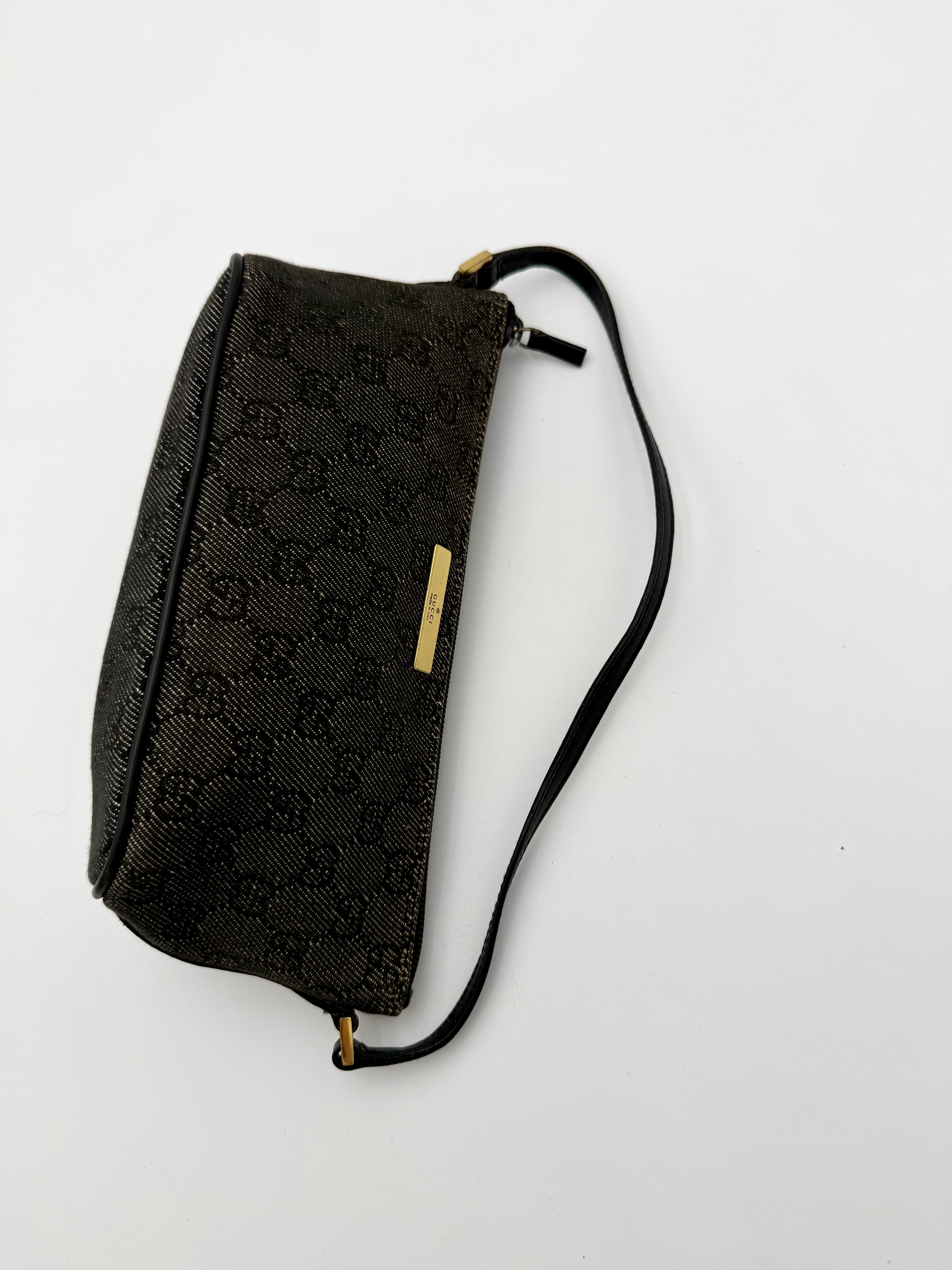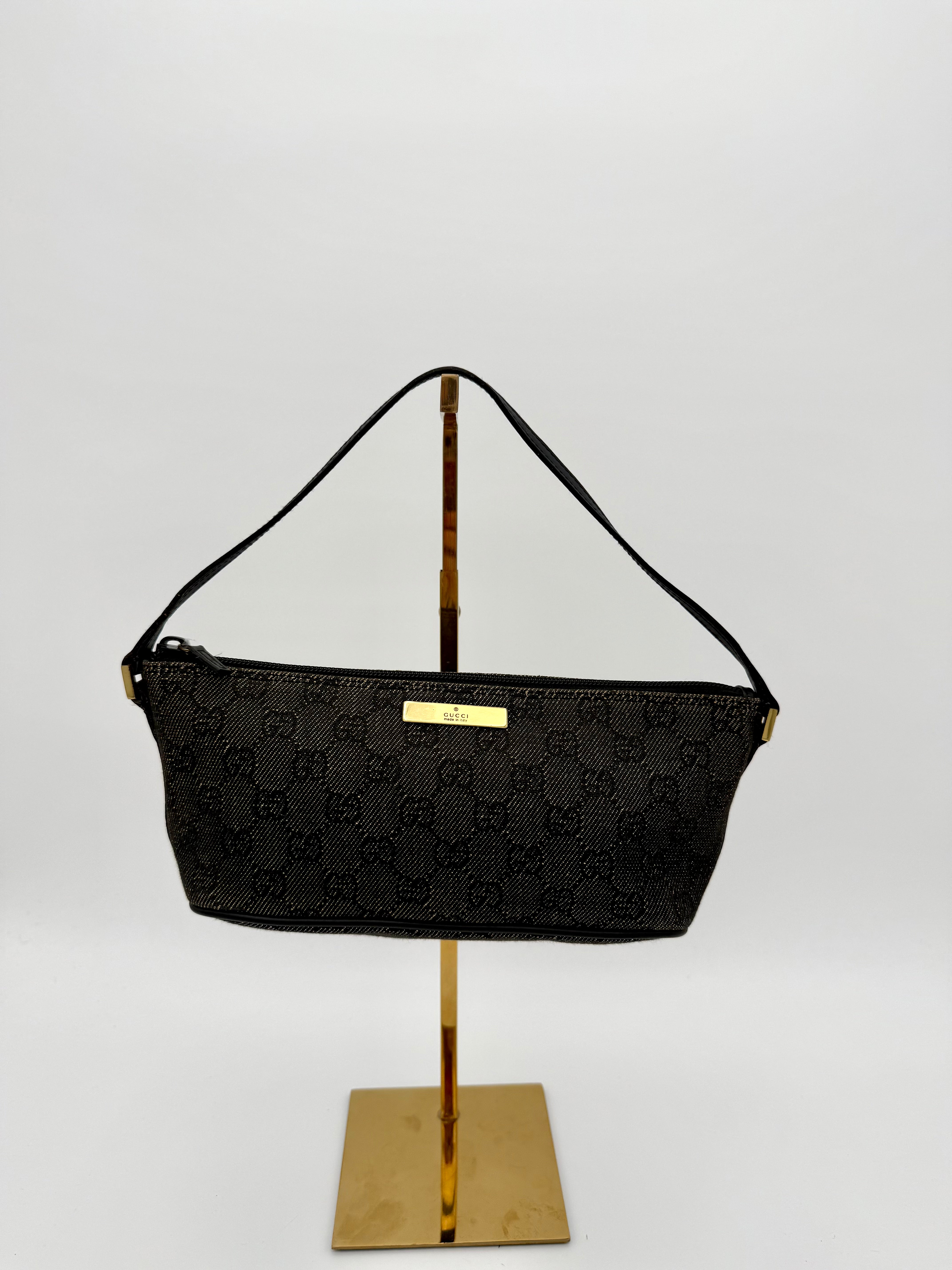 Tweedehands GUCCI canvas bag in een grijs met grijs/zwarte denim kleur. De tas is van canvas met een leren hengsel en met gouden hardware. De tas sluit met een rits. Het item verkeert in een zeer goede vintage staat, met algemene gebruikssporen. De tas wordt geleverd in onze mooie Moon flower dustbag.