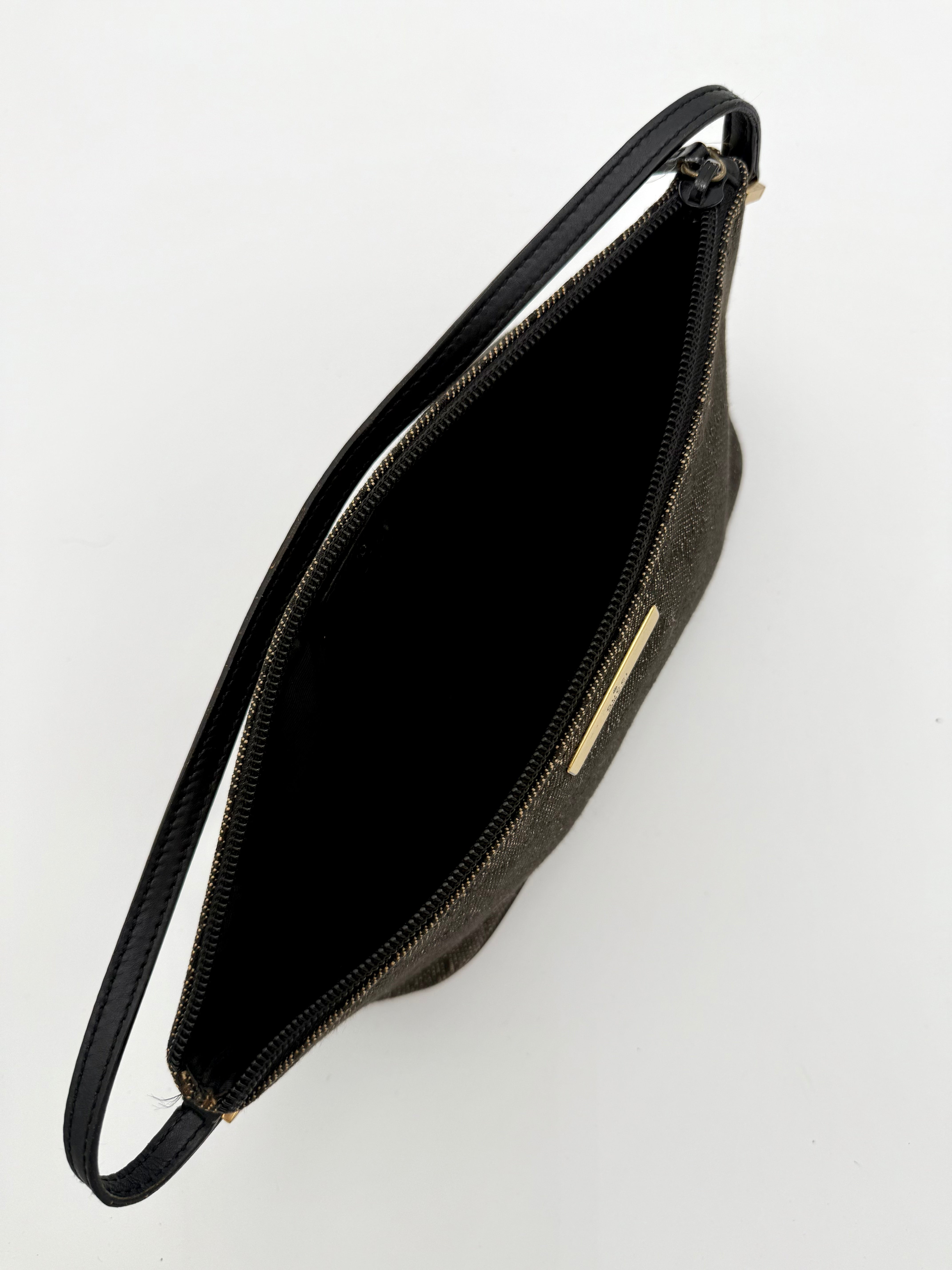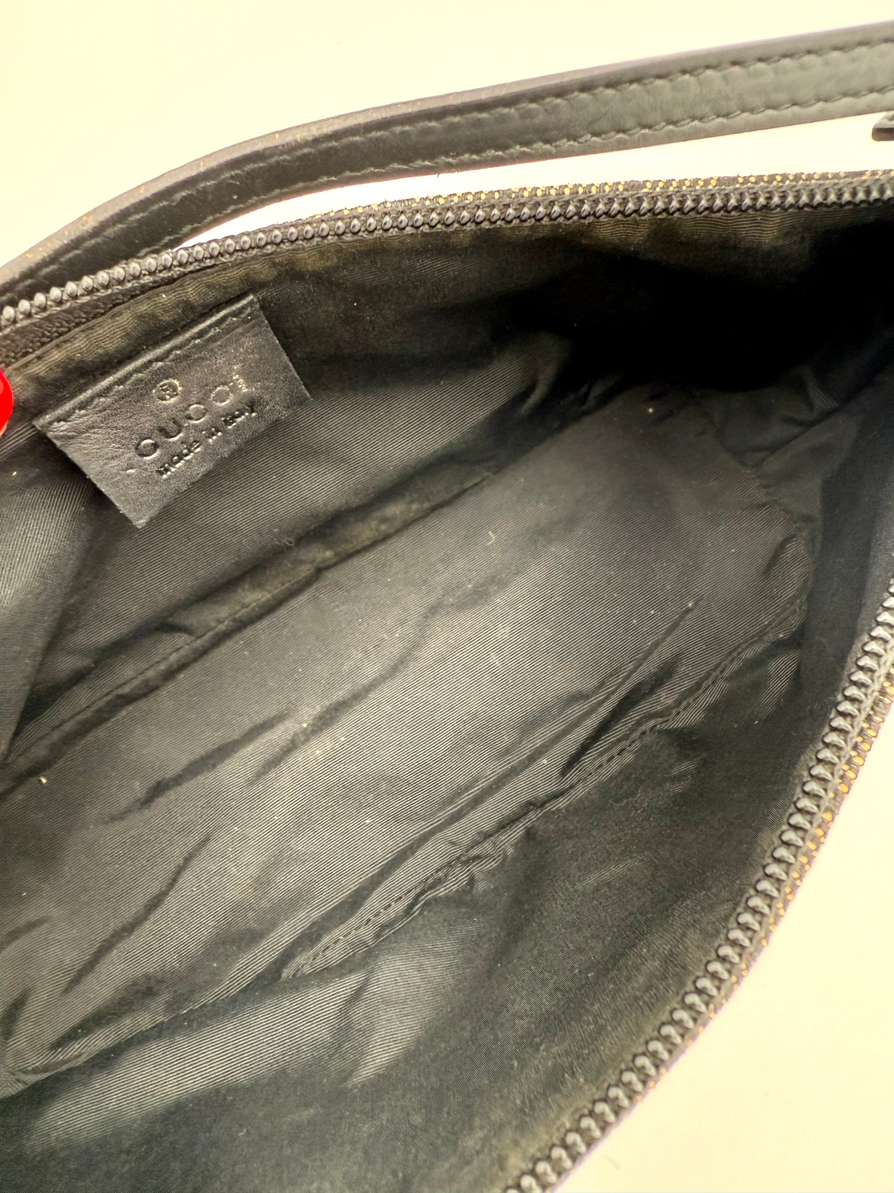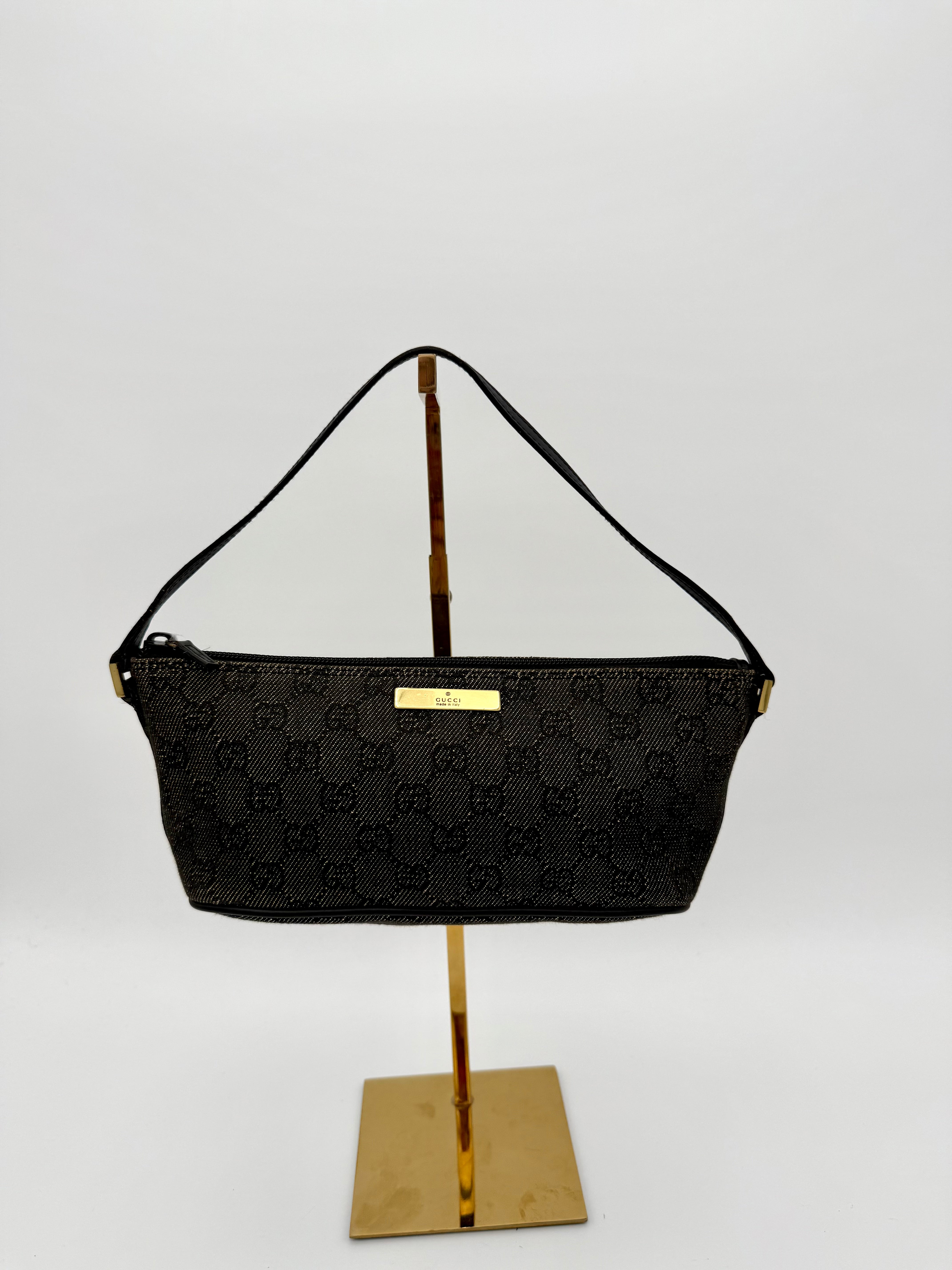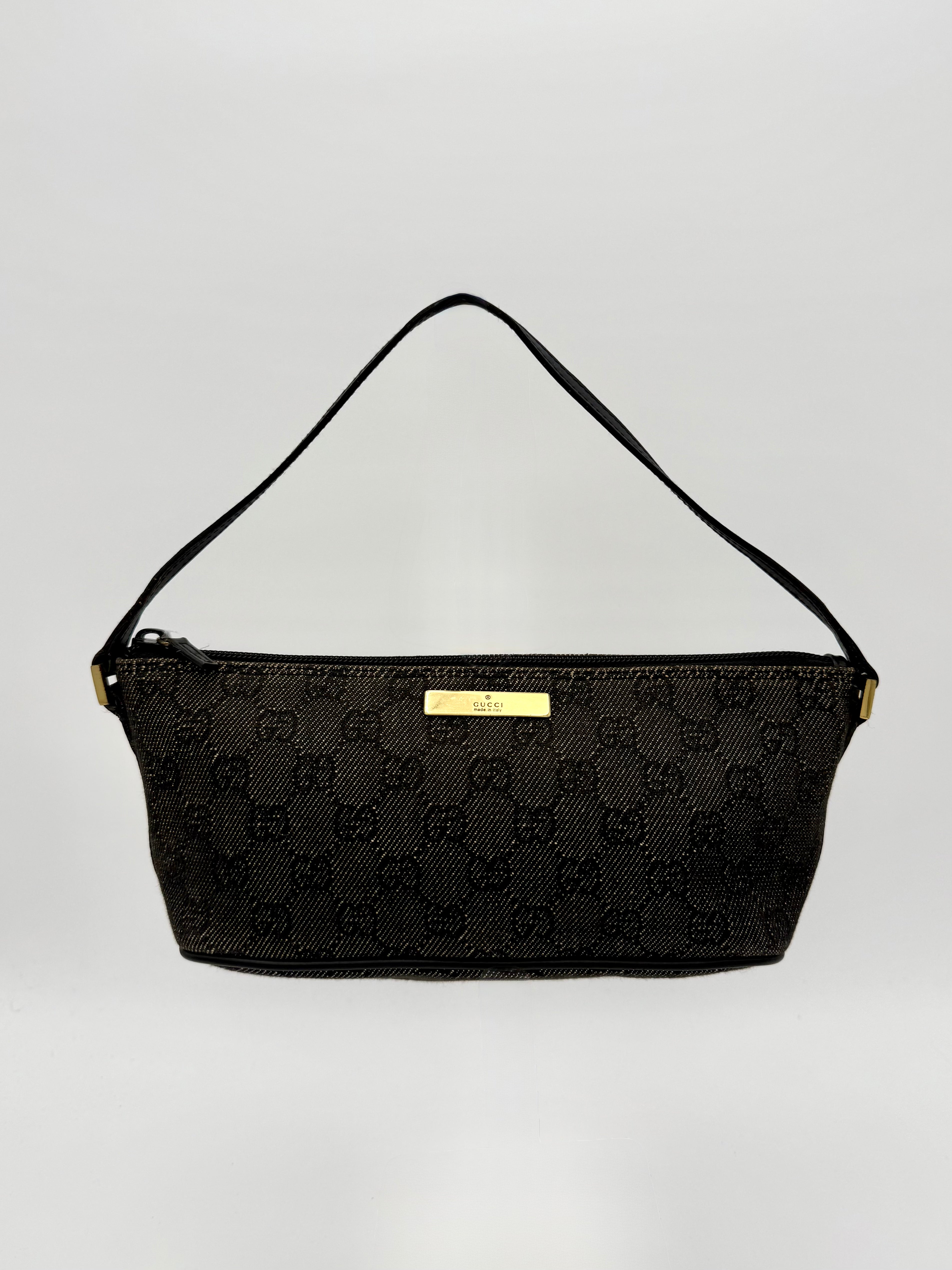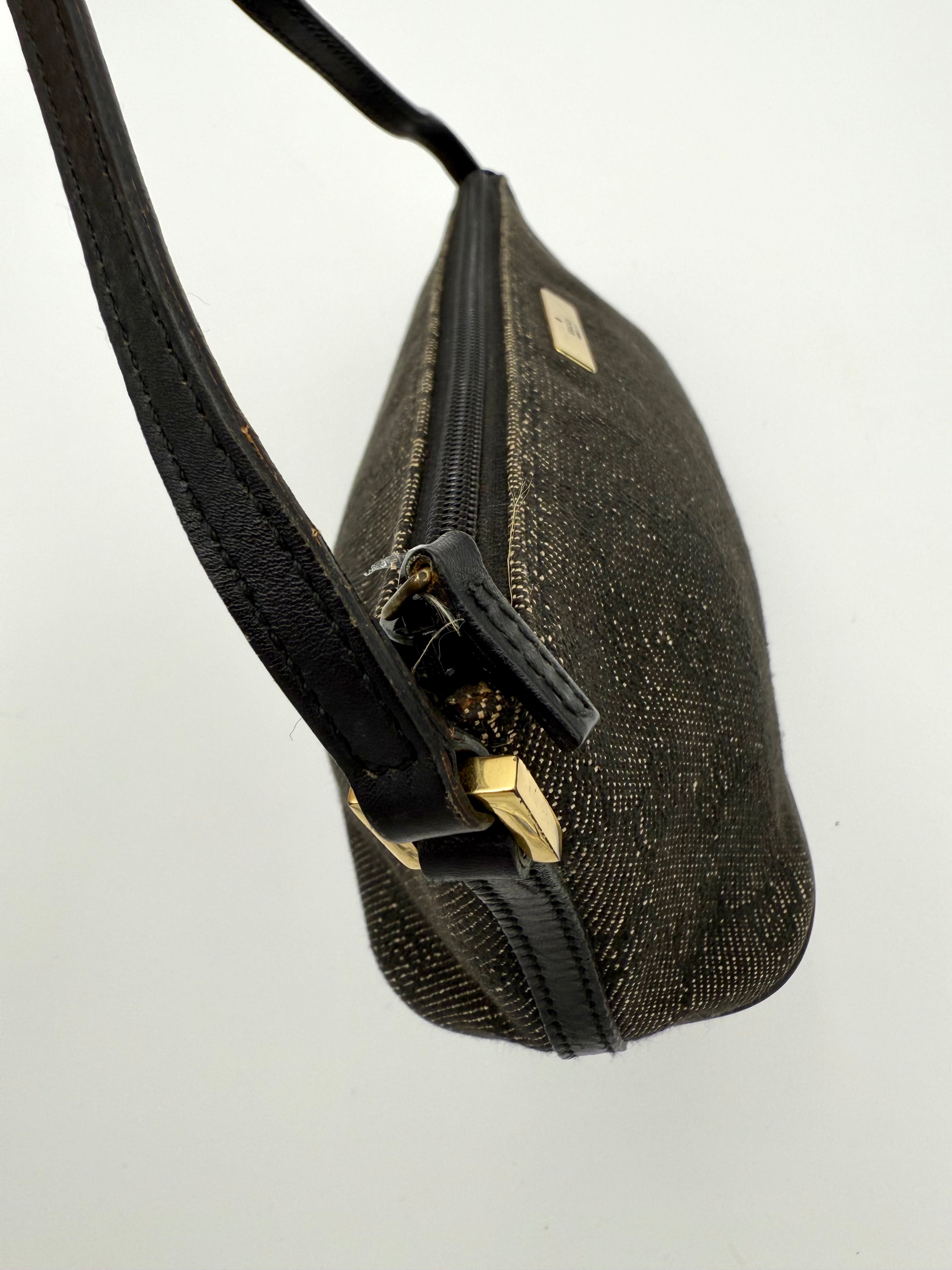Tweedehands GUCCI canvas bag in een grijs met grijs/zwarte denim kleur. De tas is van canvas met een leren hengsel en met gouden hardware. De tas sluit met een rits. Het item verkeert in een zeer goede vintage staat, met algemene gebruikssporen. De tas wordt geleverd in onze mooie Moon flower dustbag.