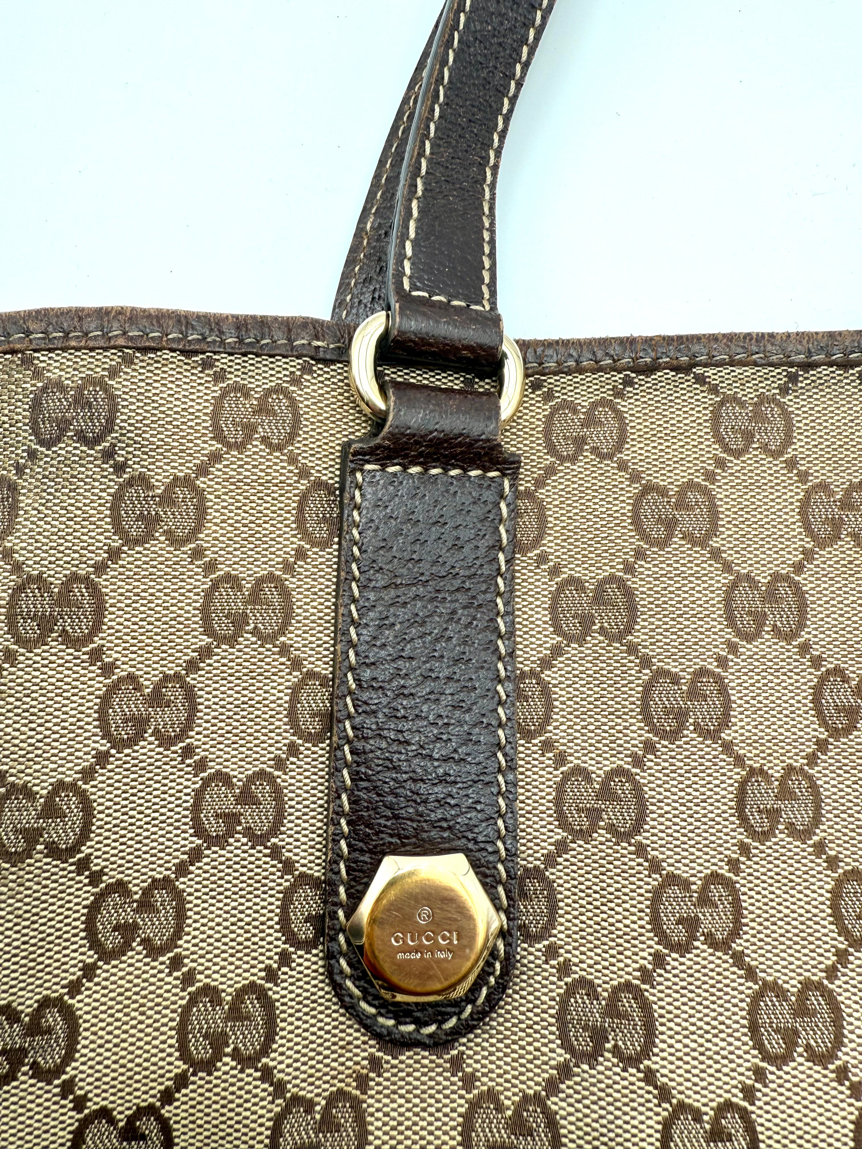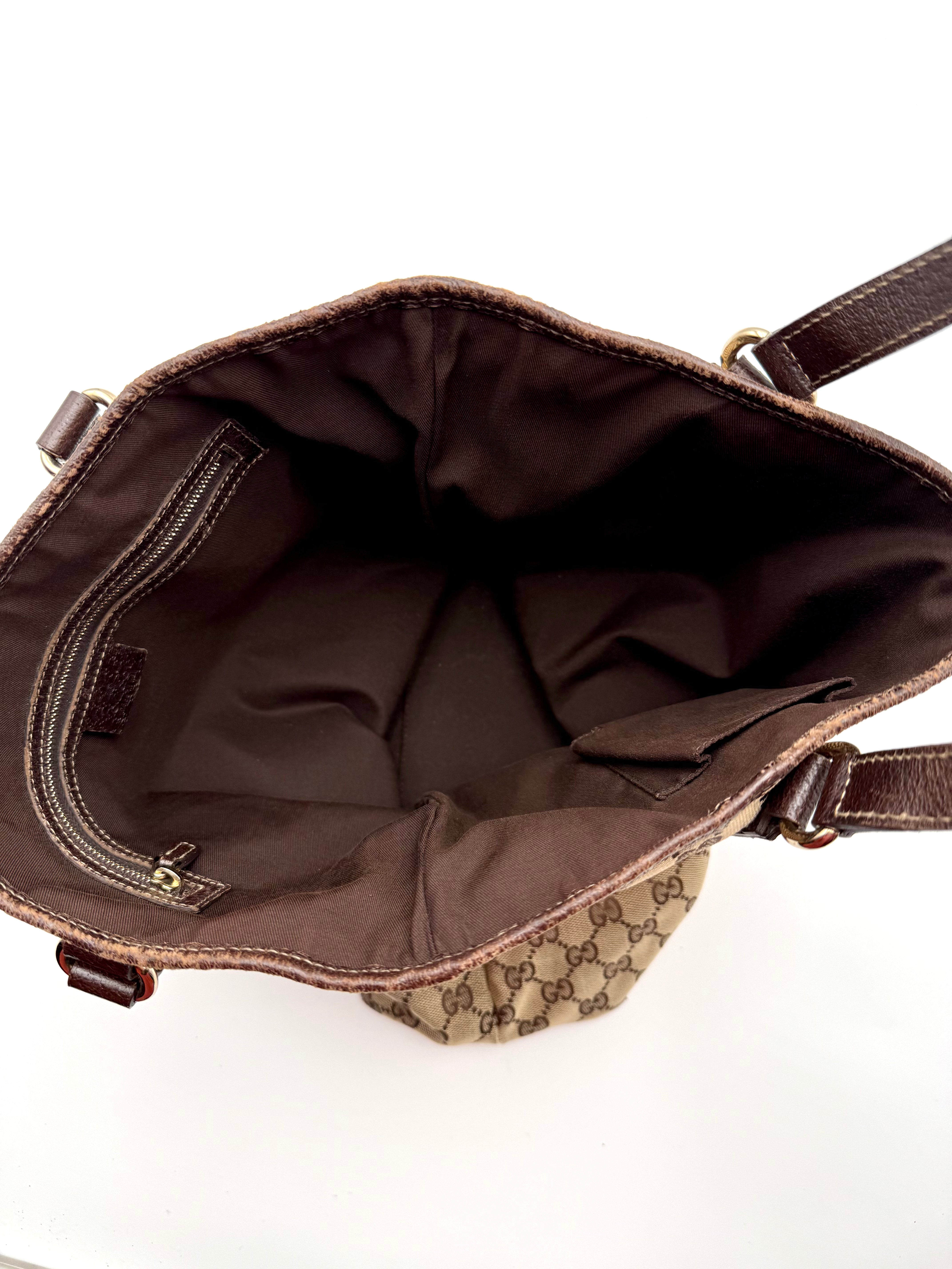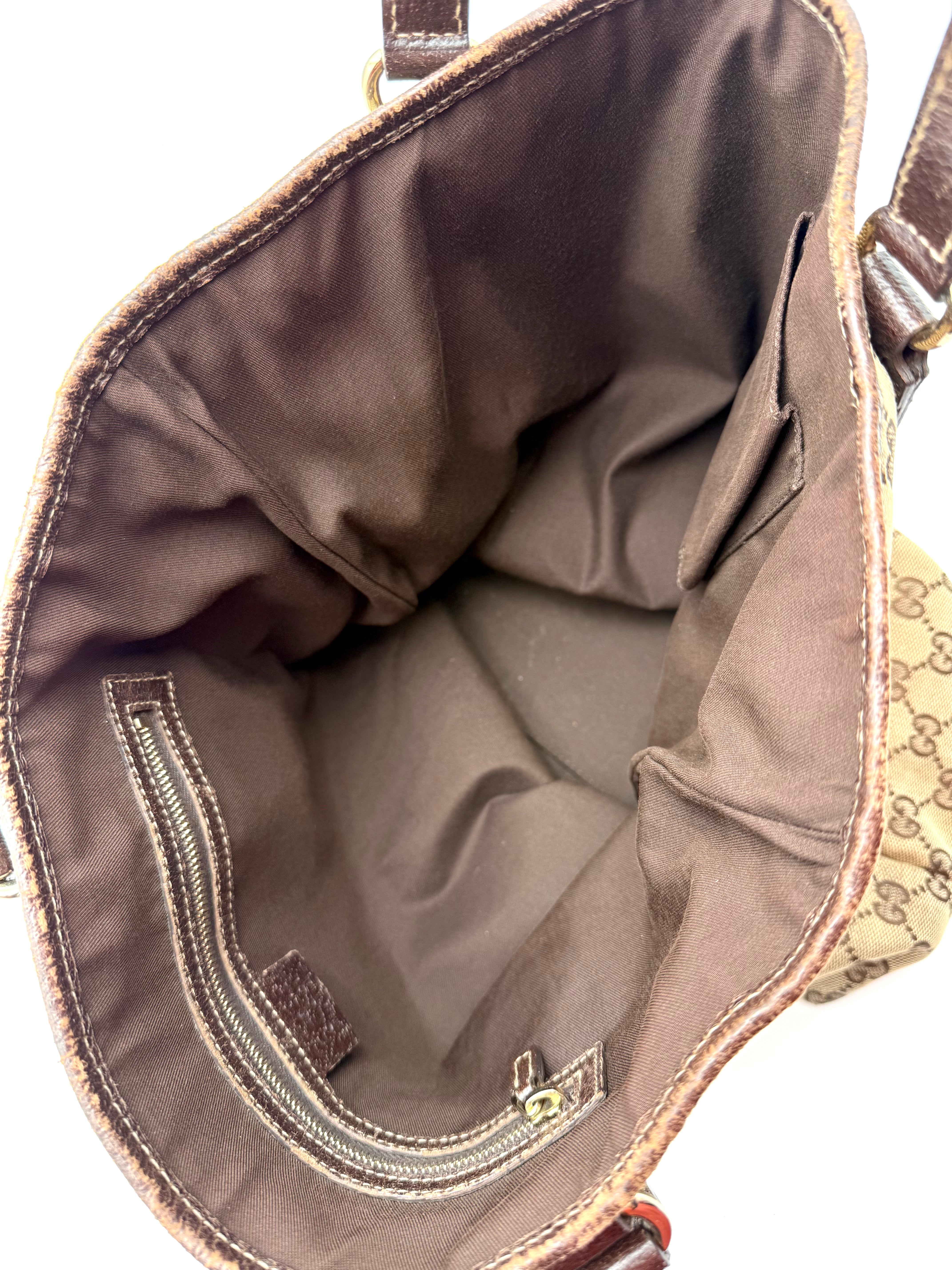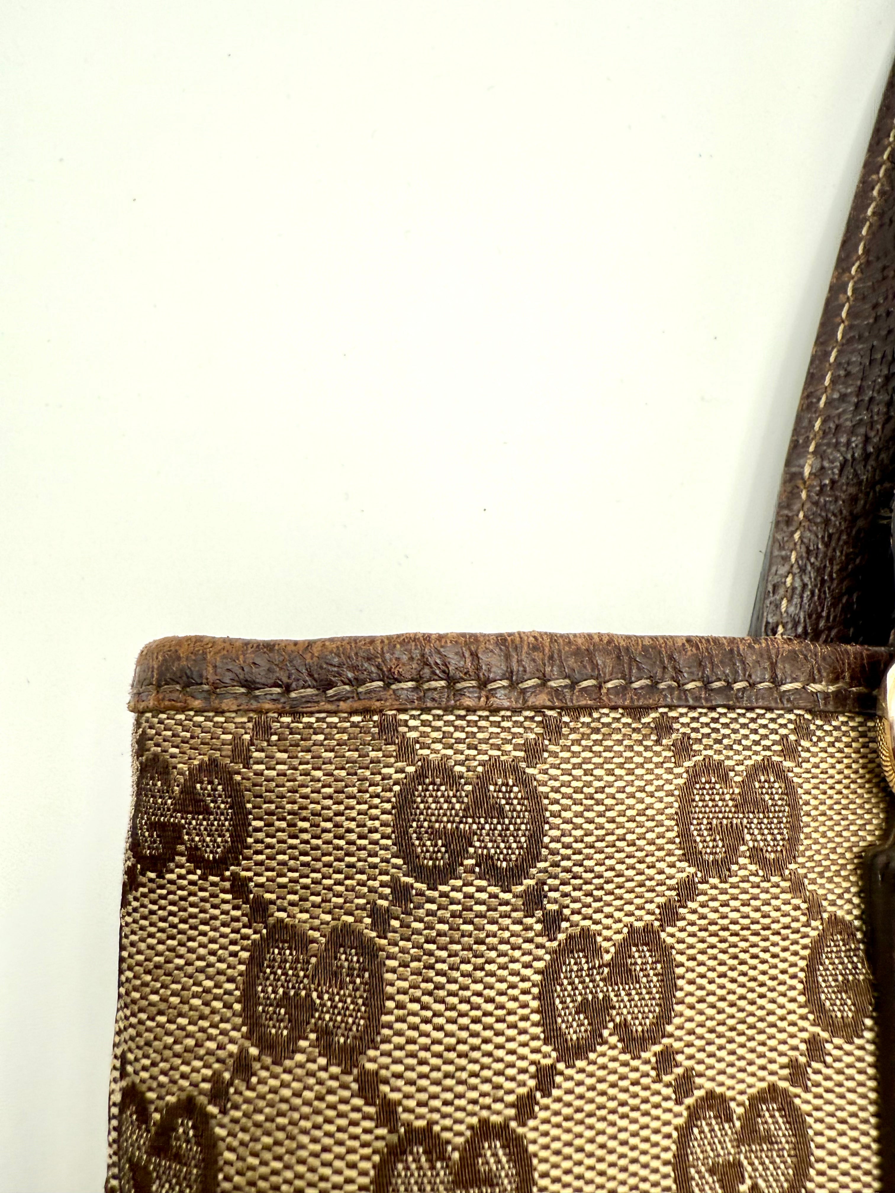 Tweedehands GUCCI canvas bag in een beige met bruine kleur. De tas is van canvas met een leren hengsels en met gouden hardware. De tas beschik over een binnenvak met rits en een klein steekvakje. Het item verkeert in een zeer goede vintage staat, met algemene gebruikssporen. De tas wordt geleverd in onze mooie Moon flower dustbag.