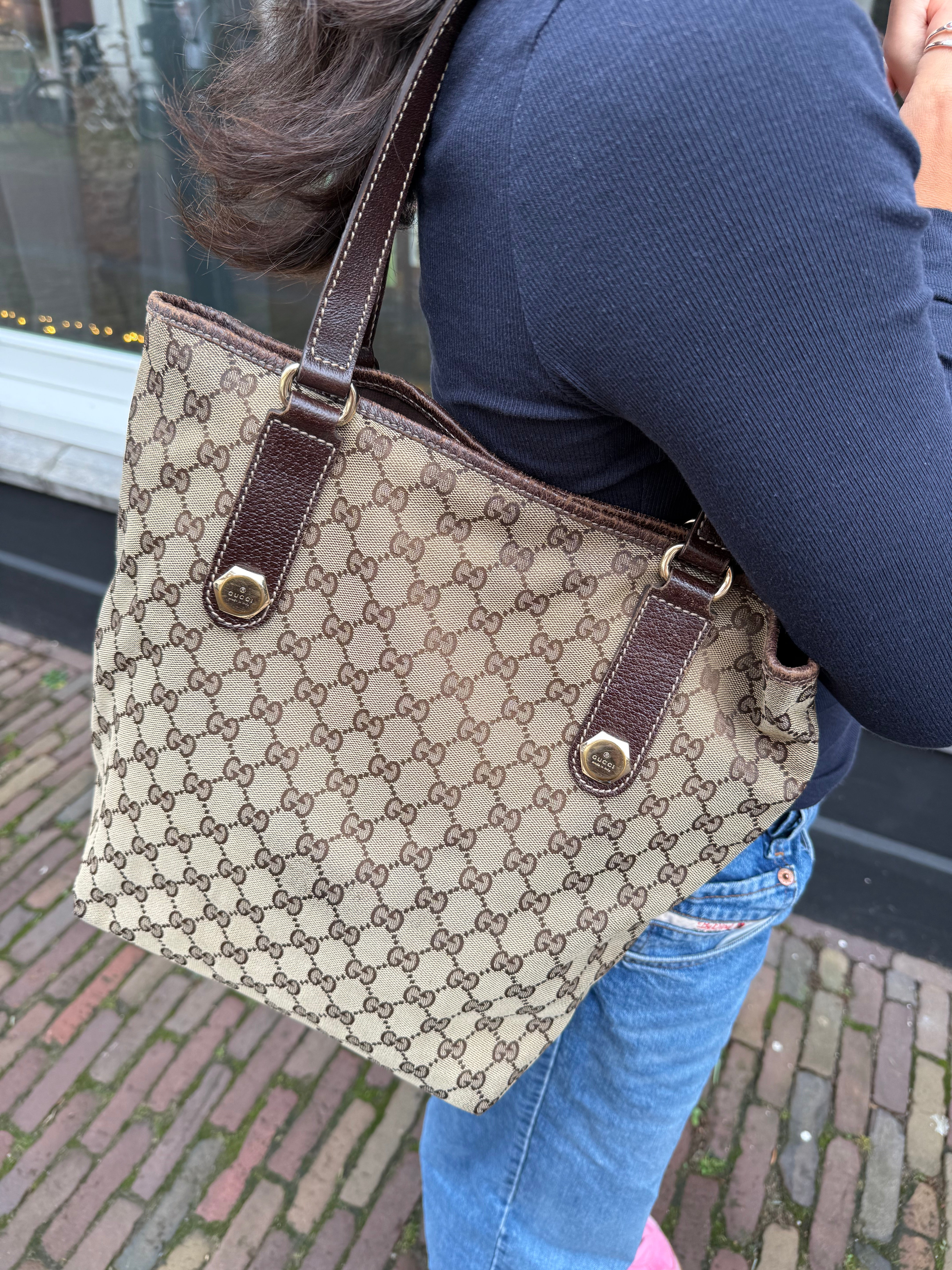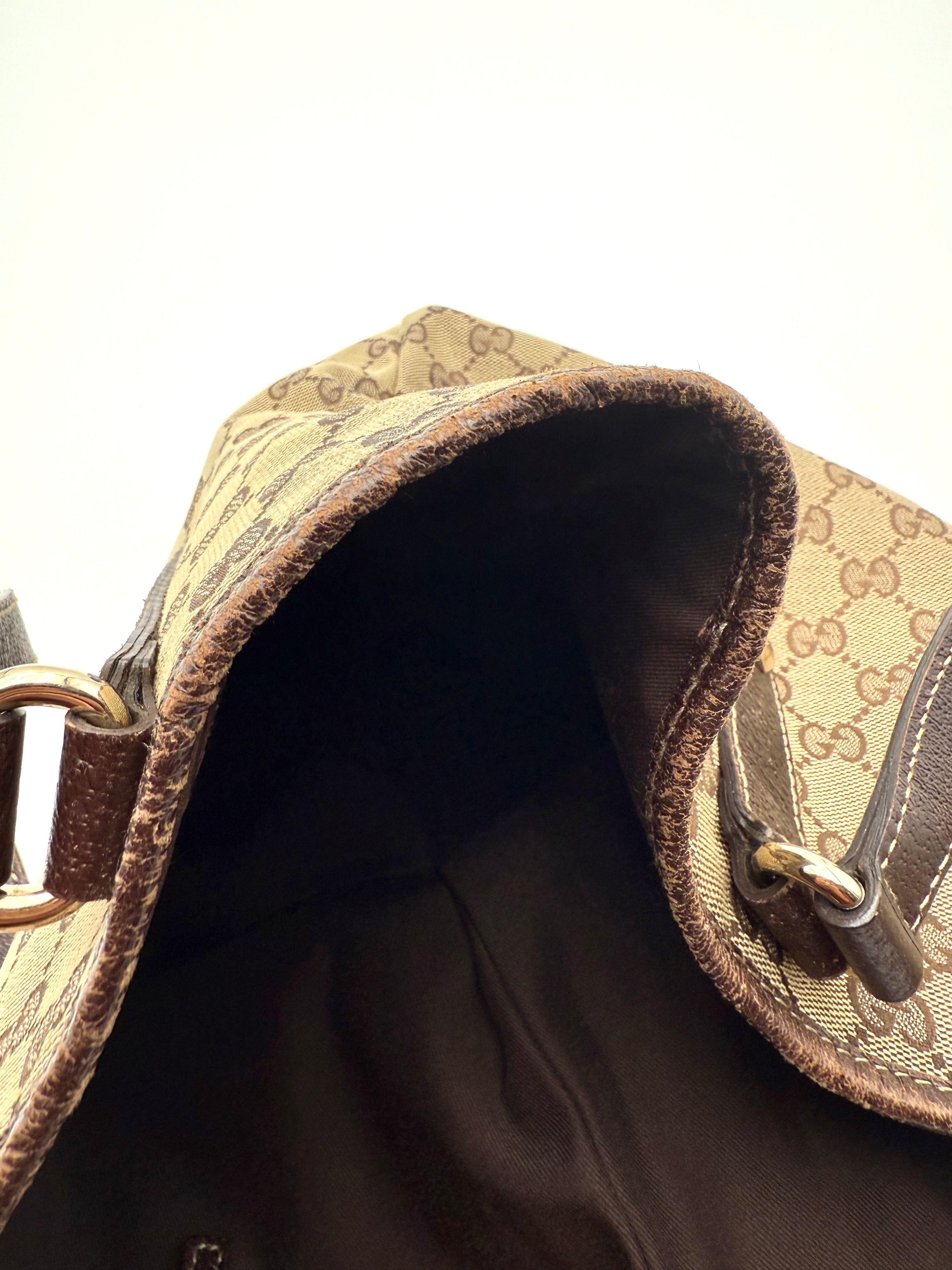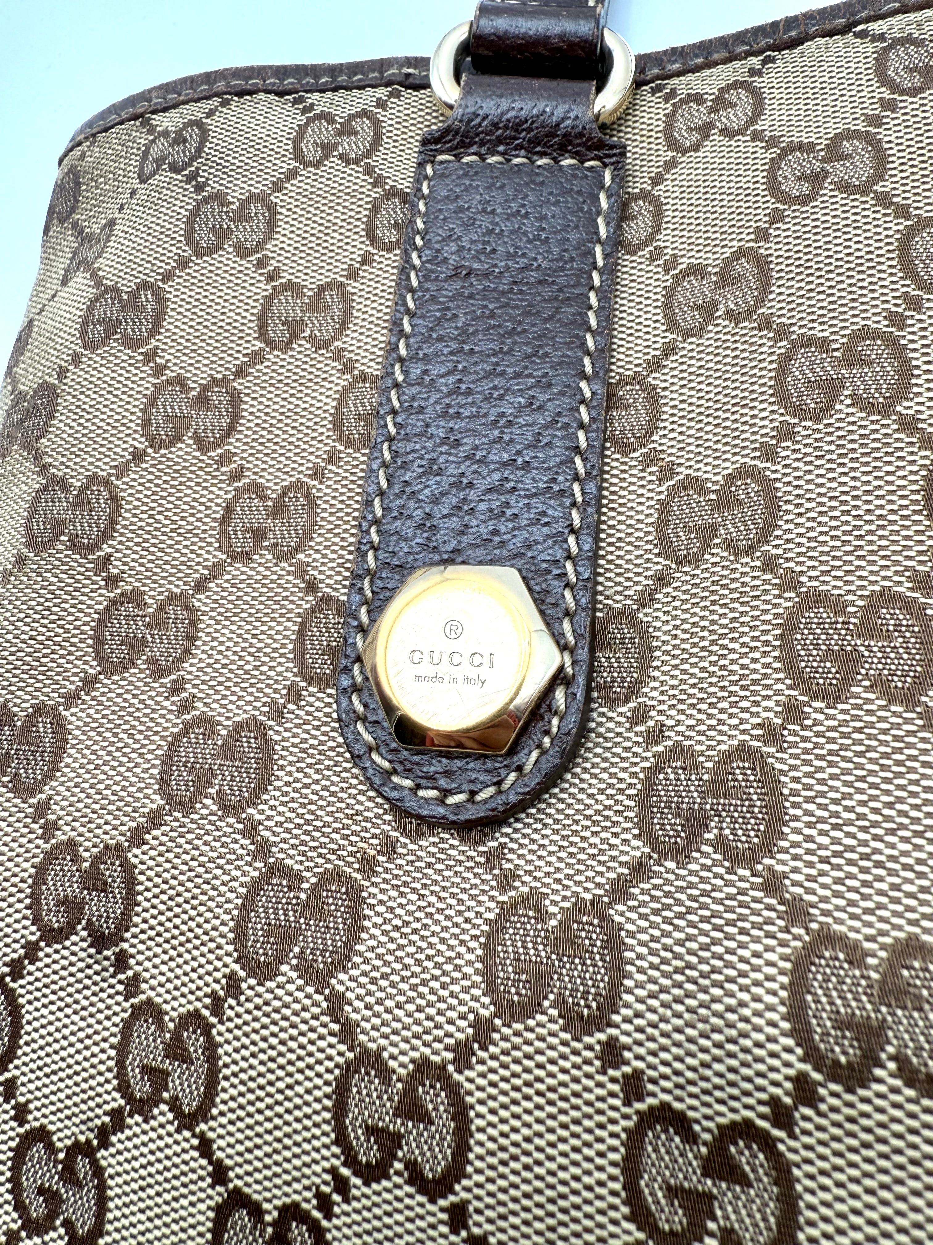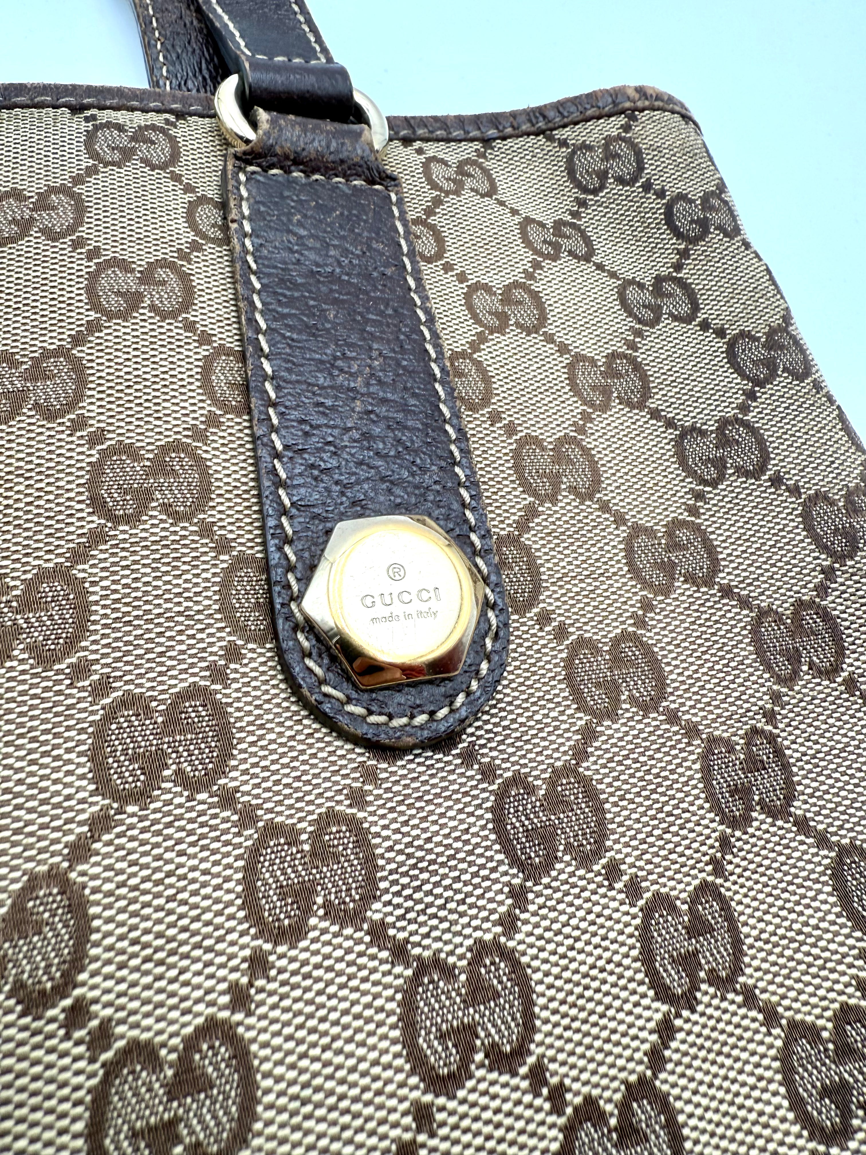 Tweedehands GUCCI canvas bag in een beige met bruine kleur. De tas is van canvas met een leren hengsels en met gouden hardware. De tas beschik over een binnenvak met rits en een klein steekvakje. Het item verkeert in een zeer goede vintage staat, met algemene gebruikssporen. De tas wordt geleverd in onze mooie Moon flower dustbag.