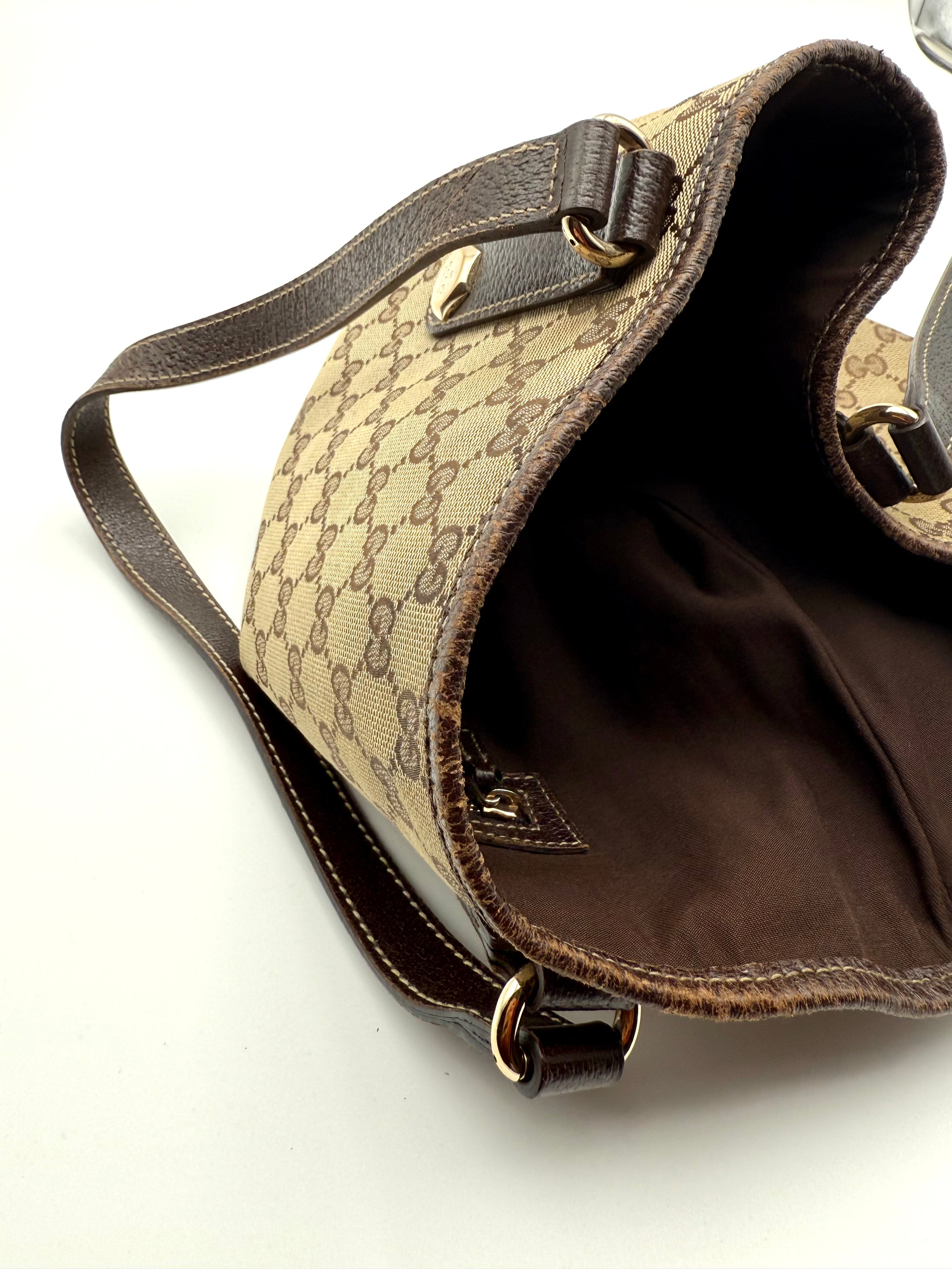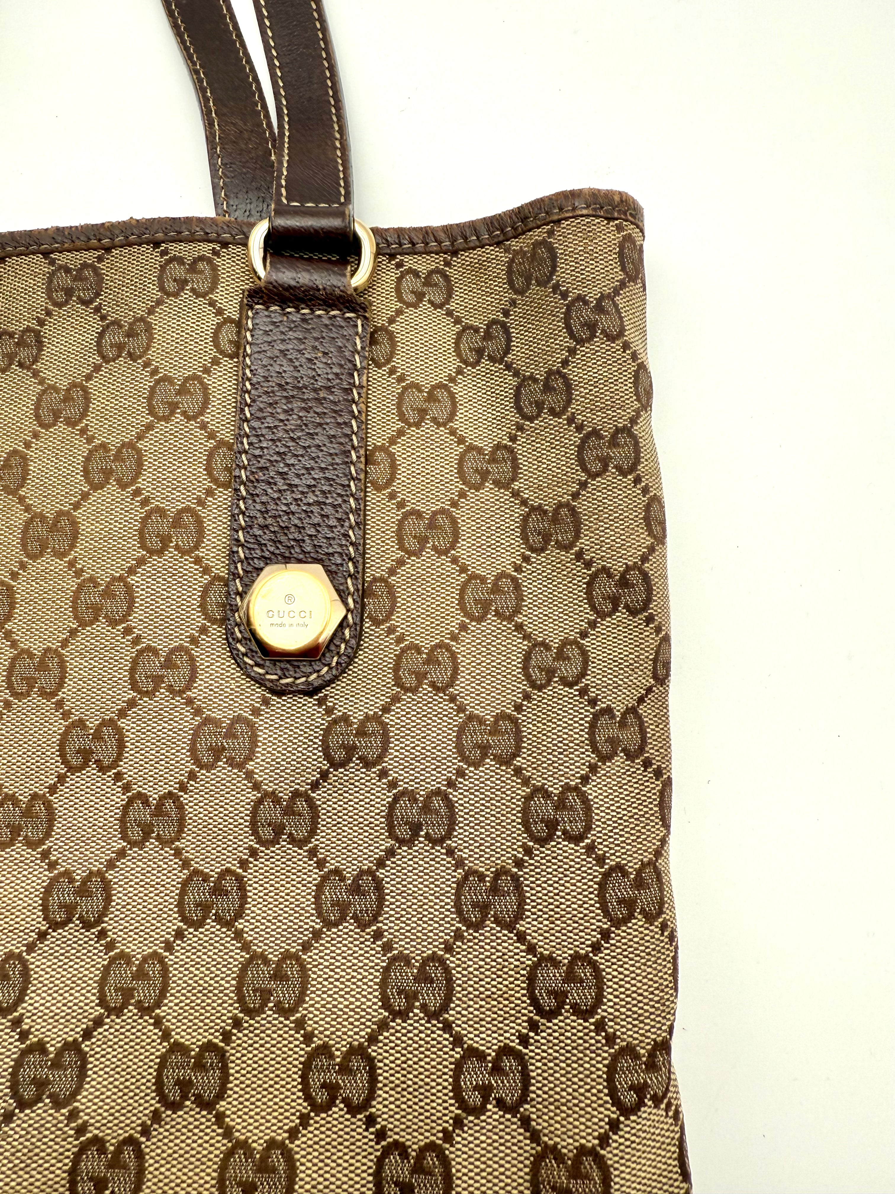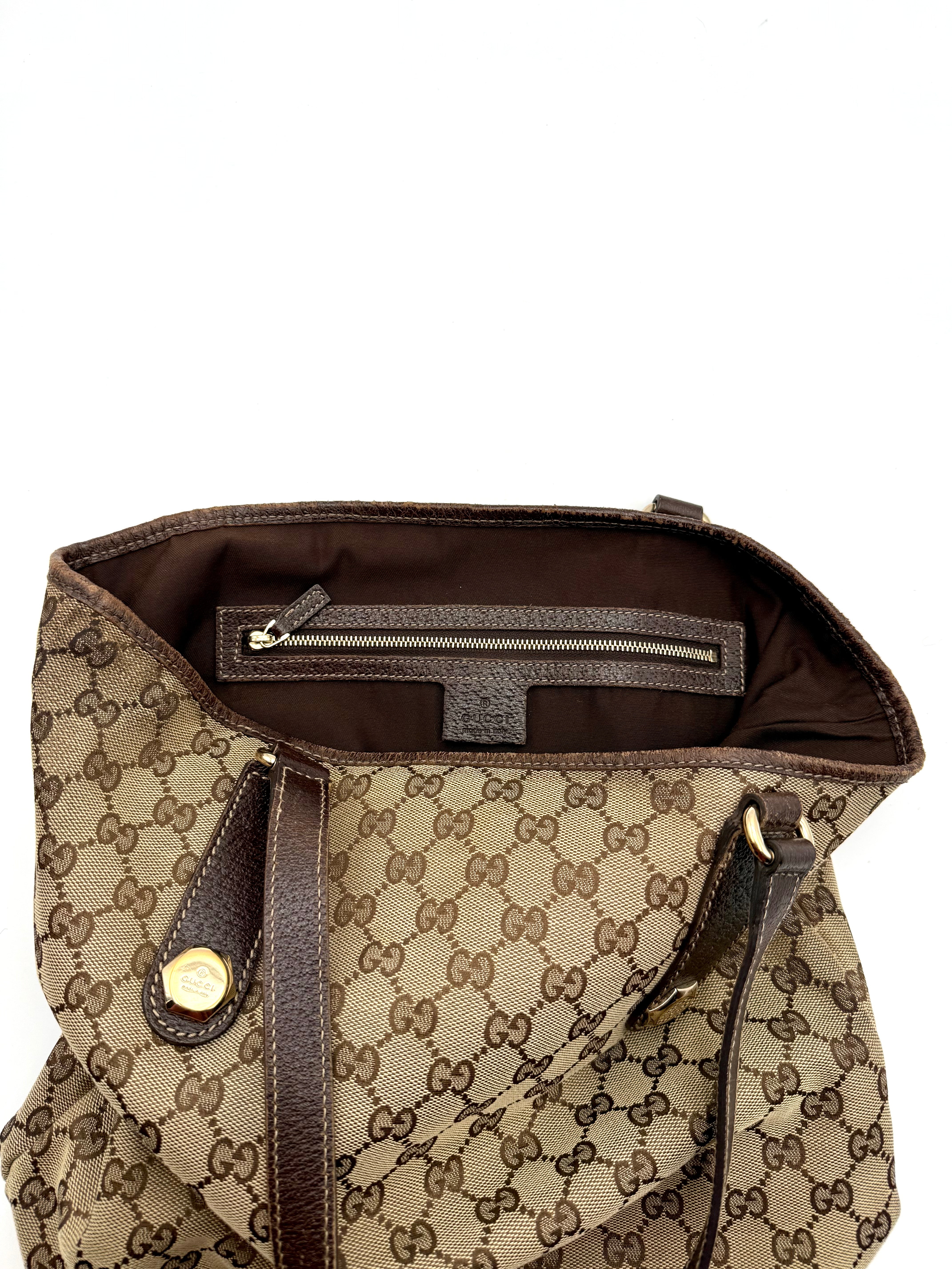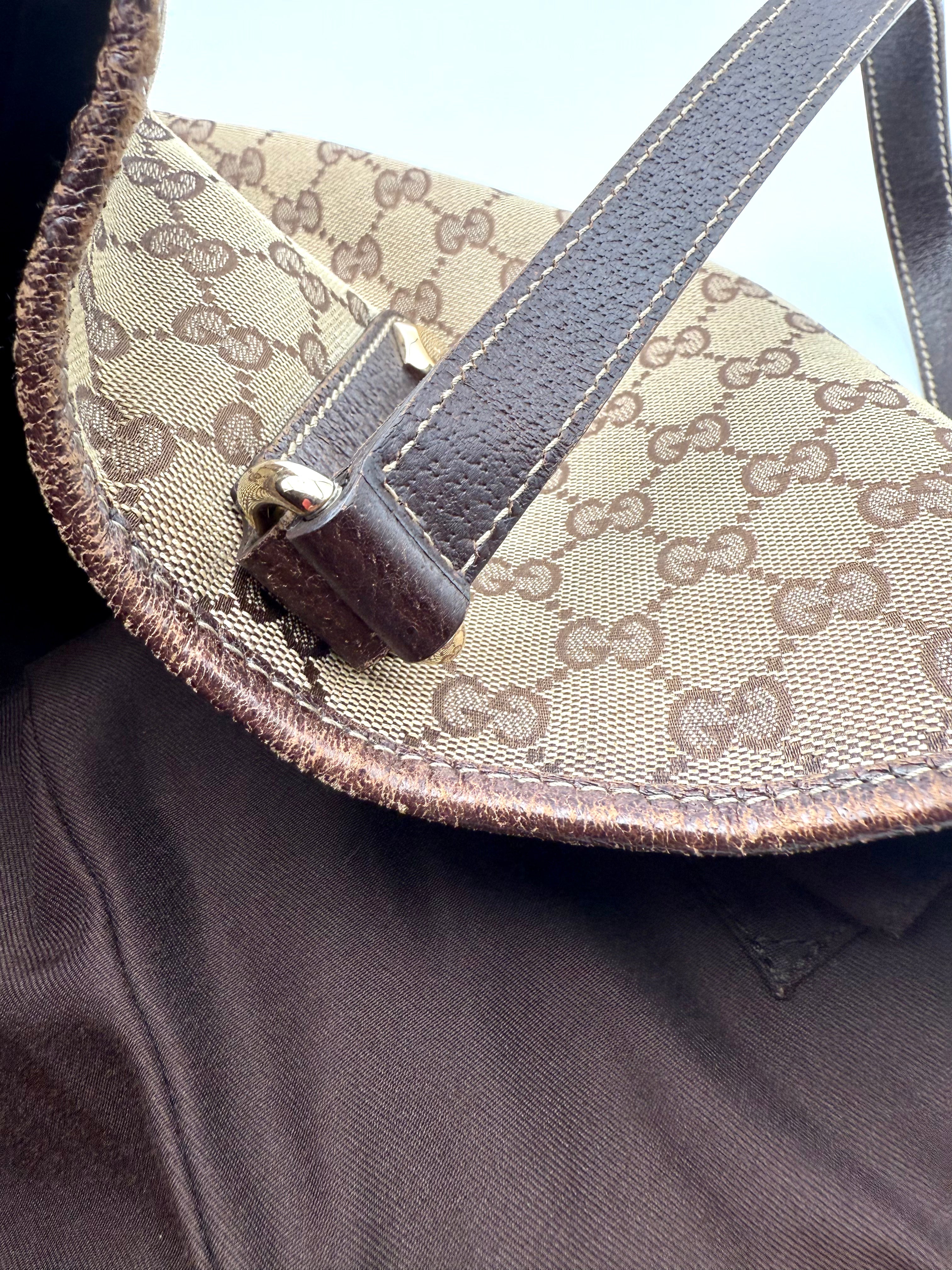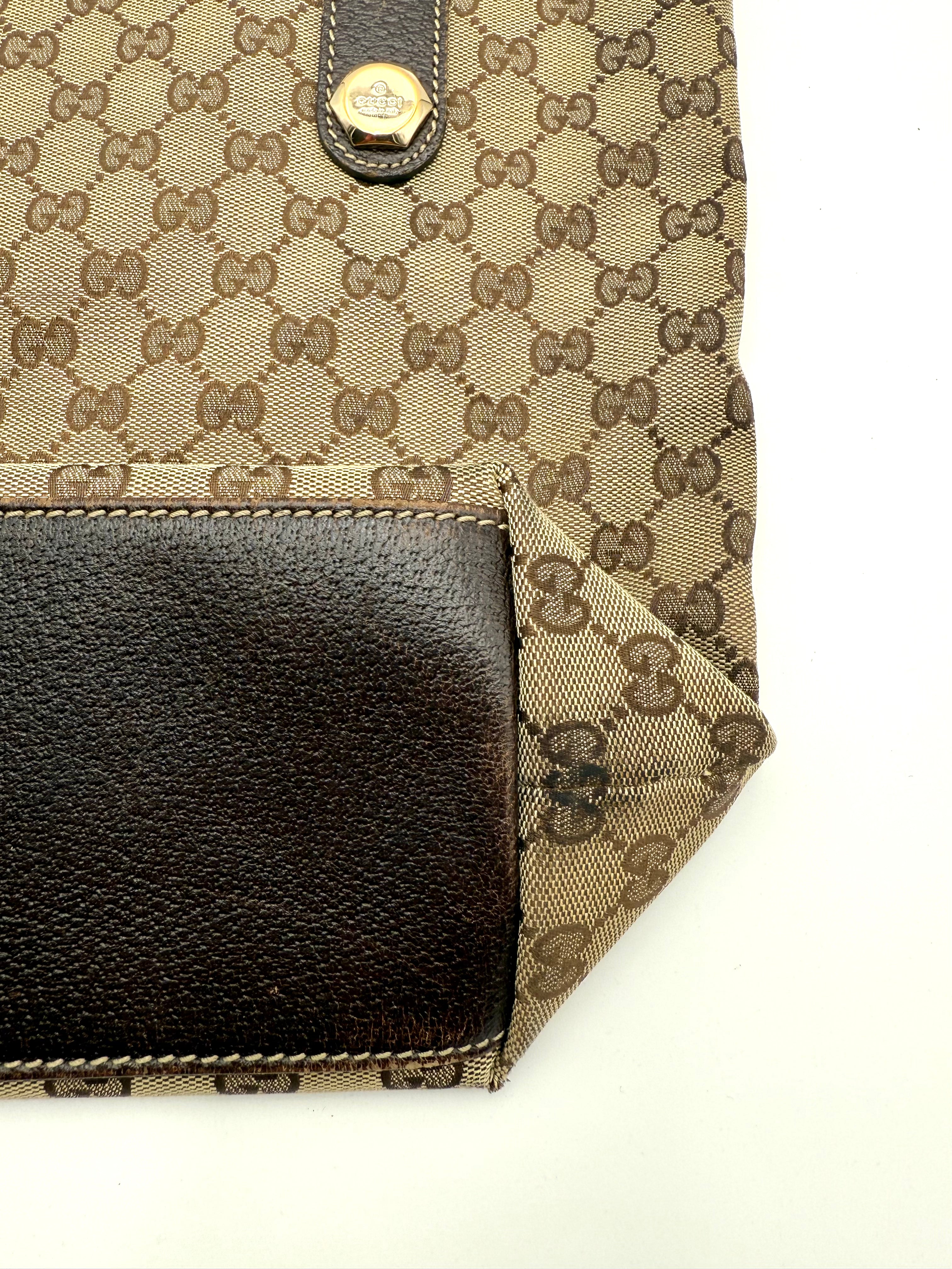 Tweedehands GUCCI canvas bag in een beige met bruine kleur. De tas is van canvas met een leren hengsels en met gouden hardware. De tas beschik over een binnenvak met rits en een klein steekvakje. Het item verkeert in een zeer goede vintage staat, met algemene gebruikssporen. De tas wordt geleverd in onze mooie Moon flower dustbag.