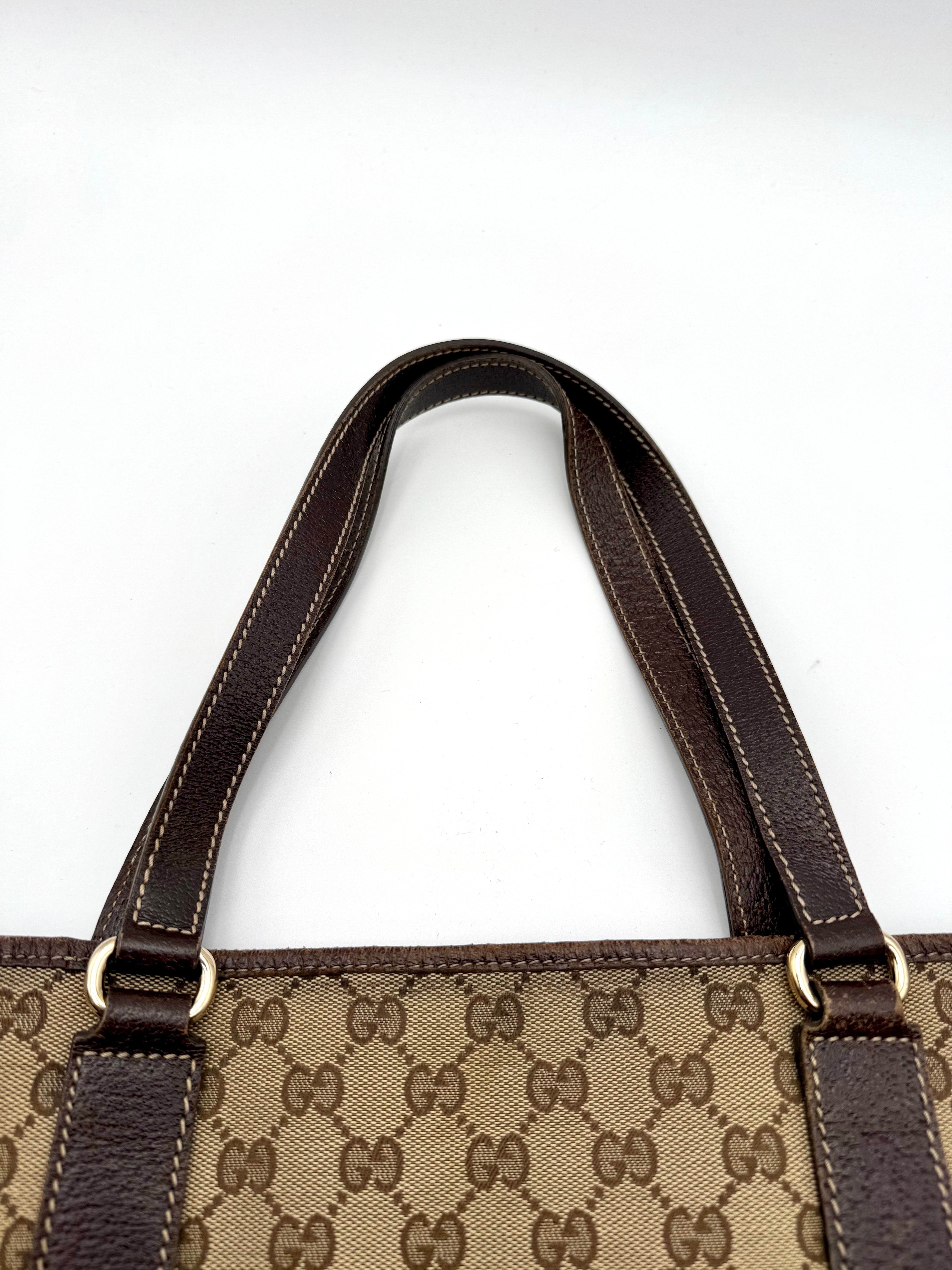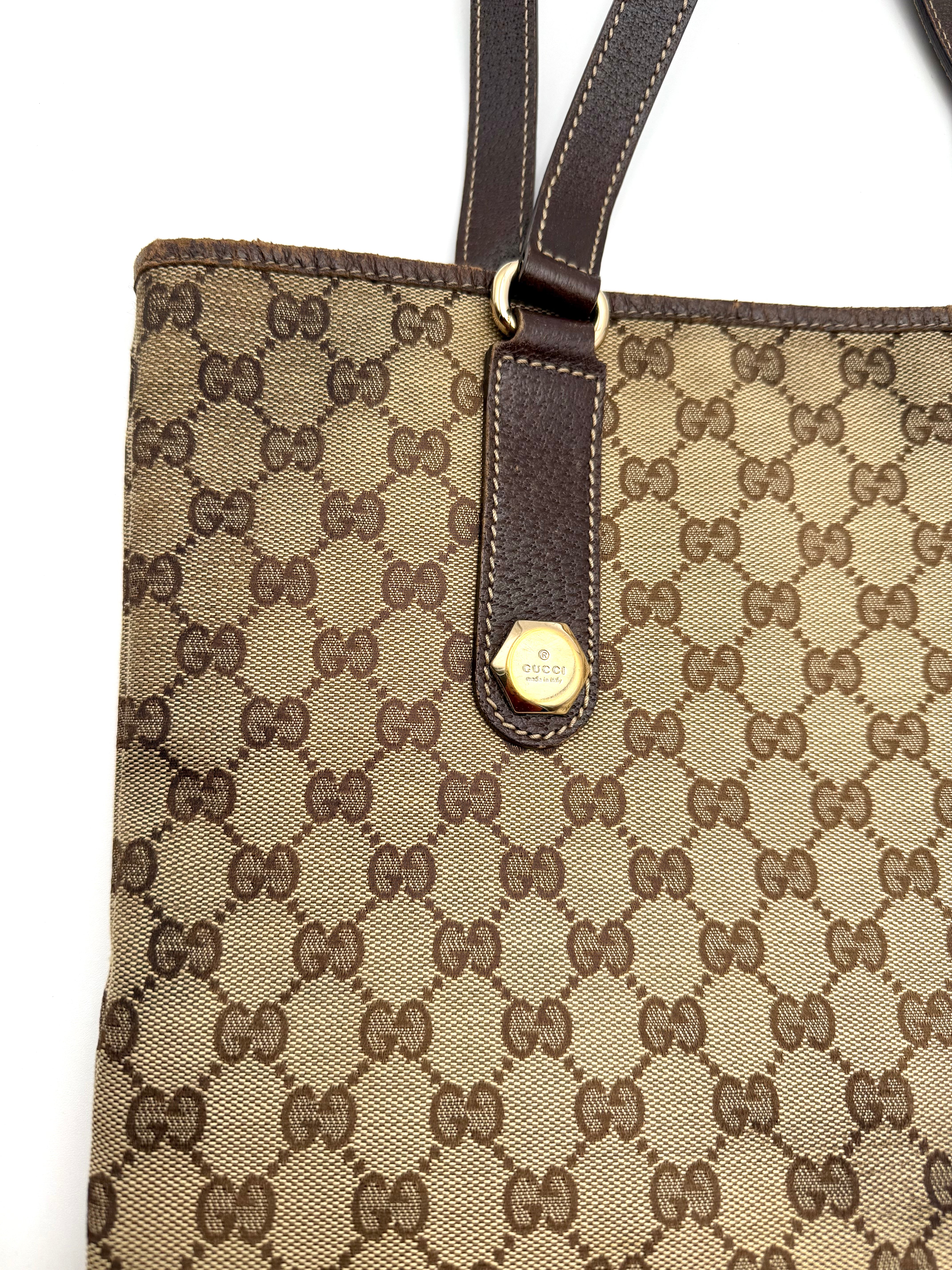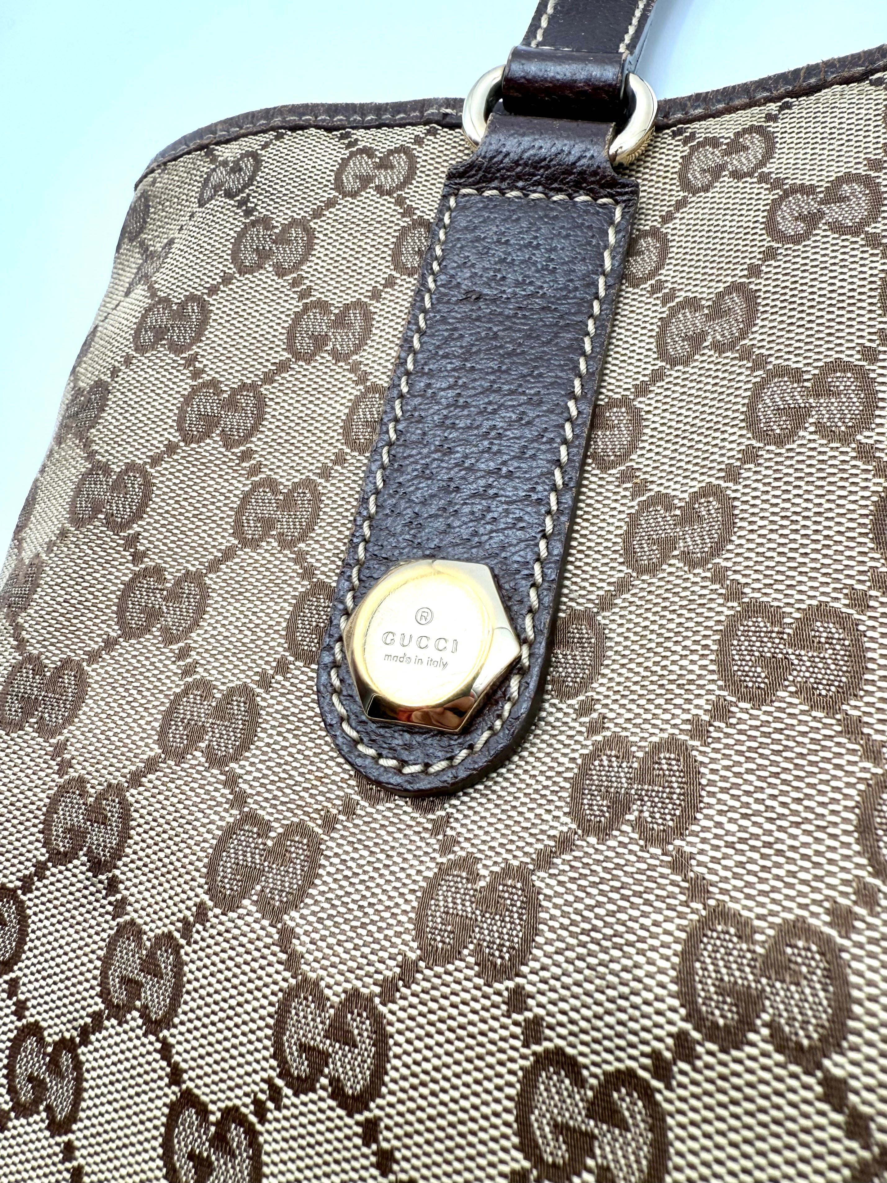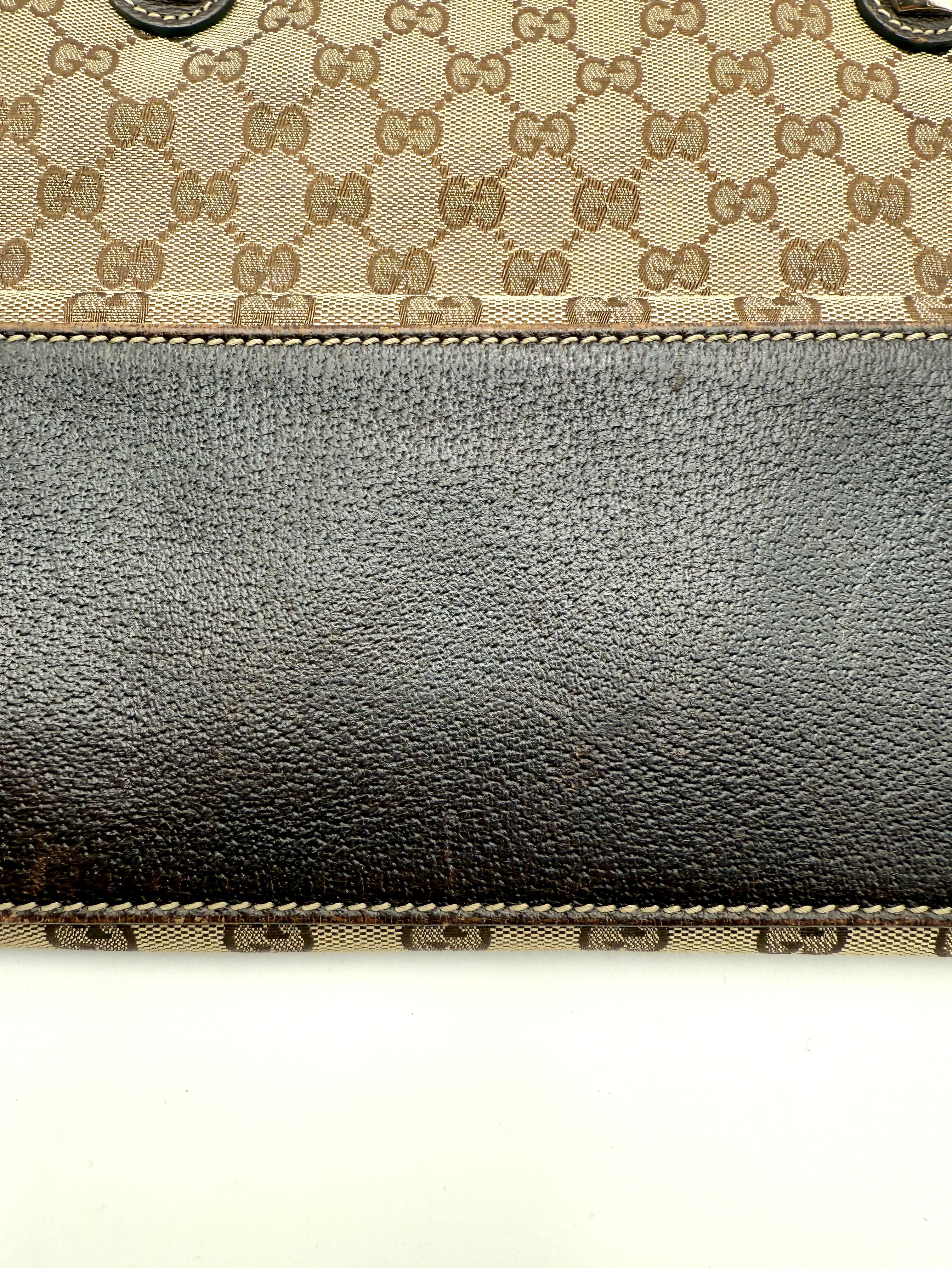 Tweedehands GUCCI canvas bag in een beige met bruine kleur. De tas is van canvas met een leren hengsels en met gouden hardware. De tas beschik over een binnenvak met rits en een klein steekvakje. Het item verkeert in een zeer goede vintage staat, met algemene gebruikssporen. De tas wordt geleverd in onze mooie Moon flower dustbag.