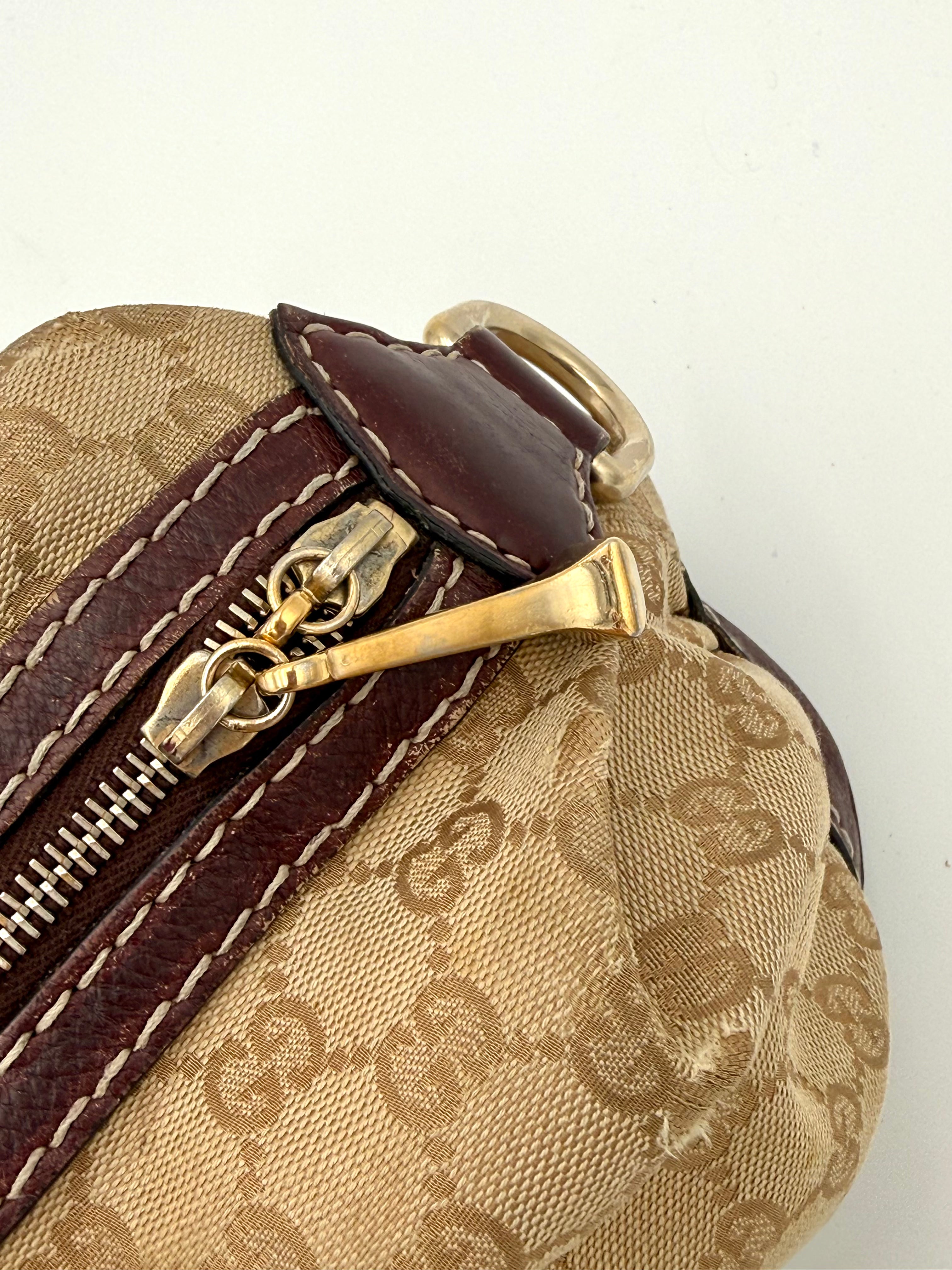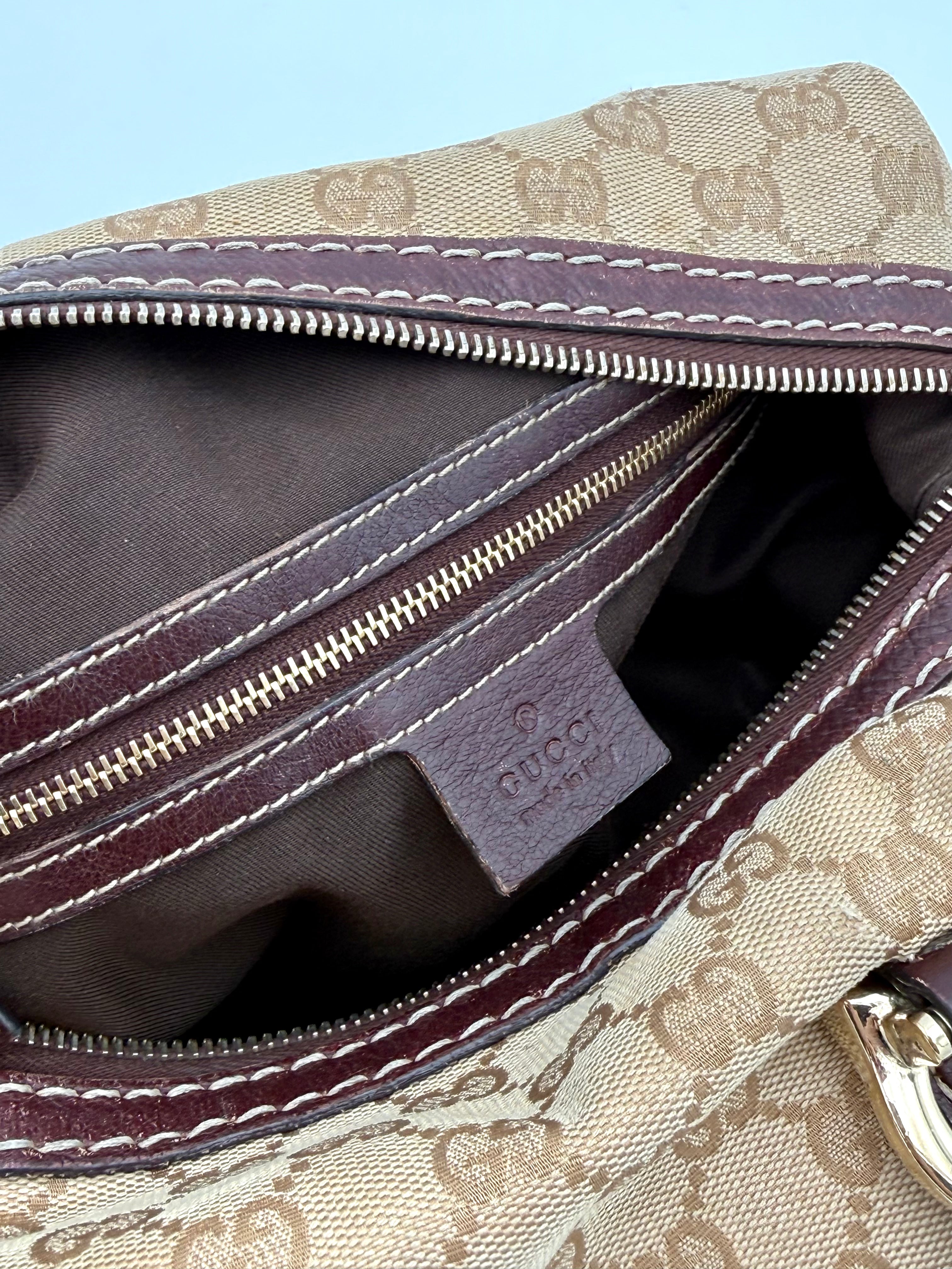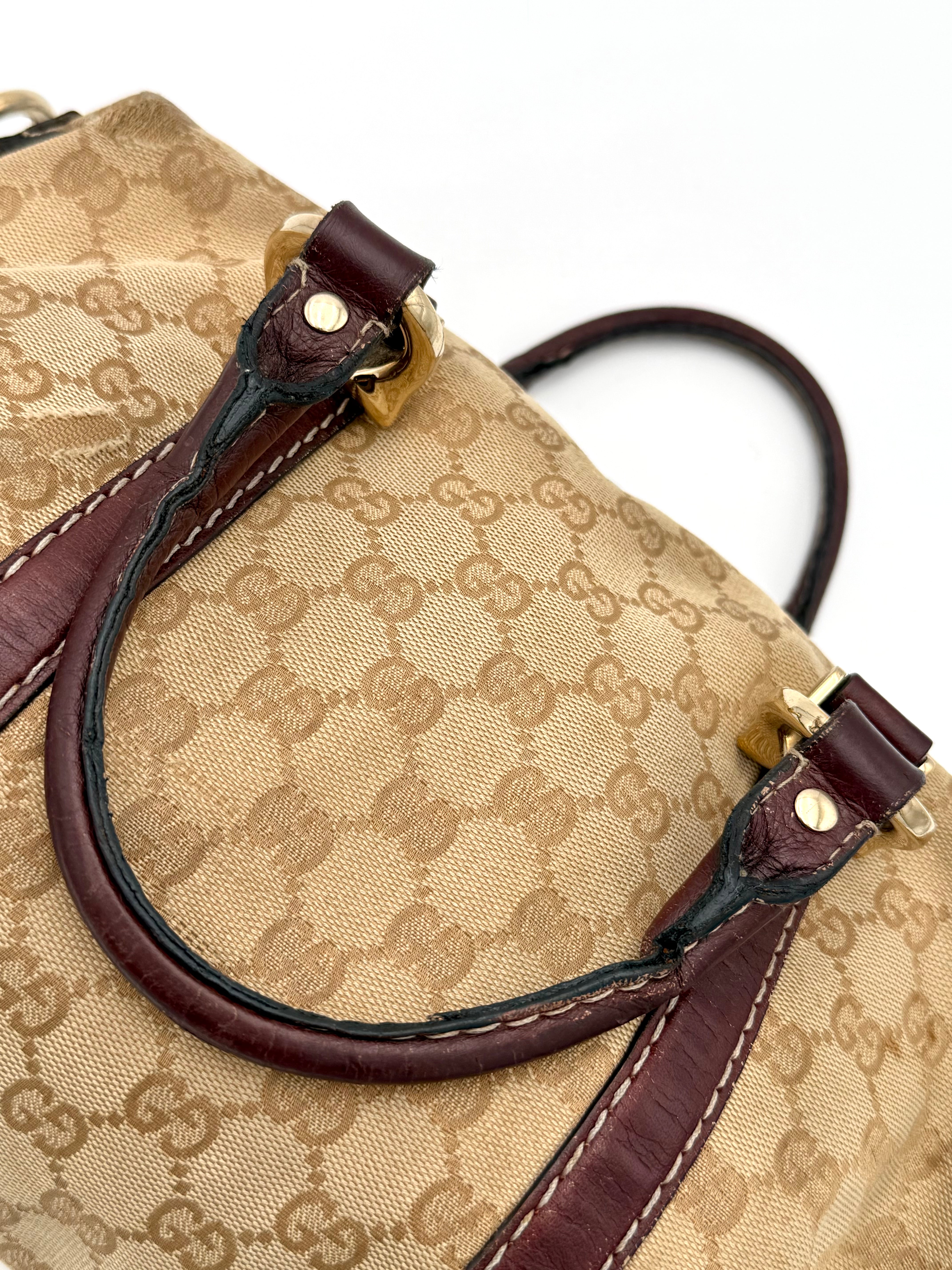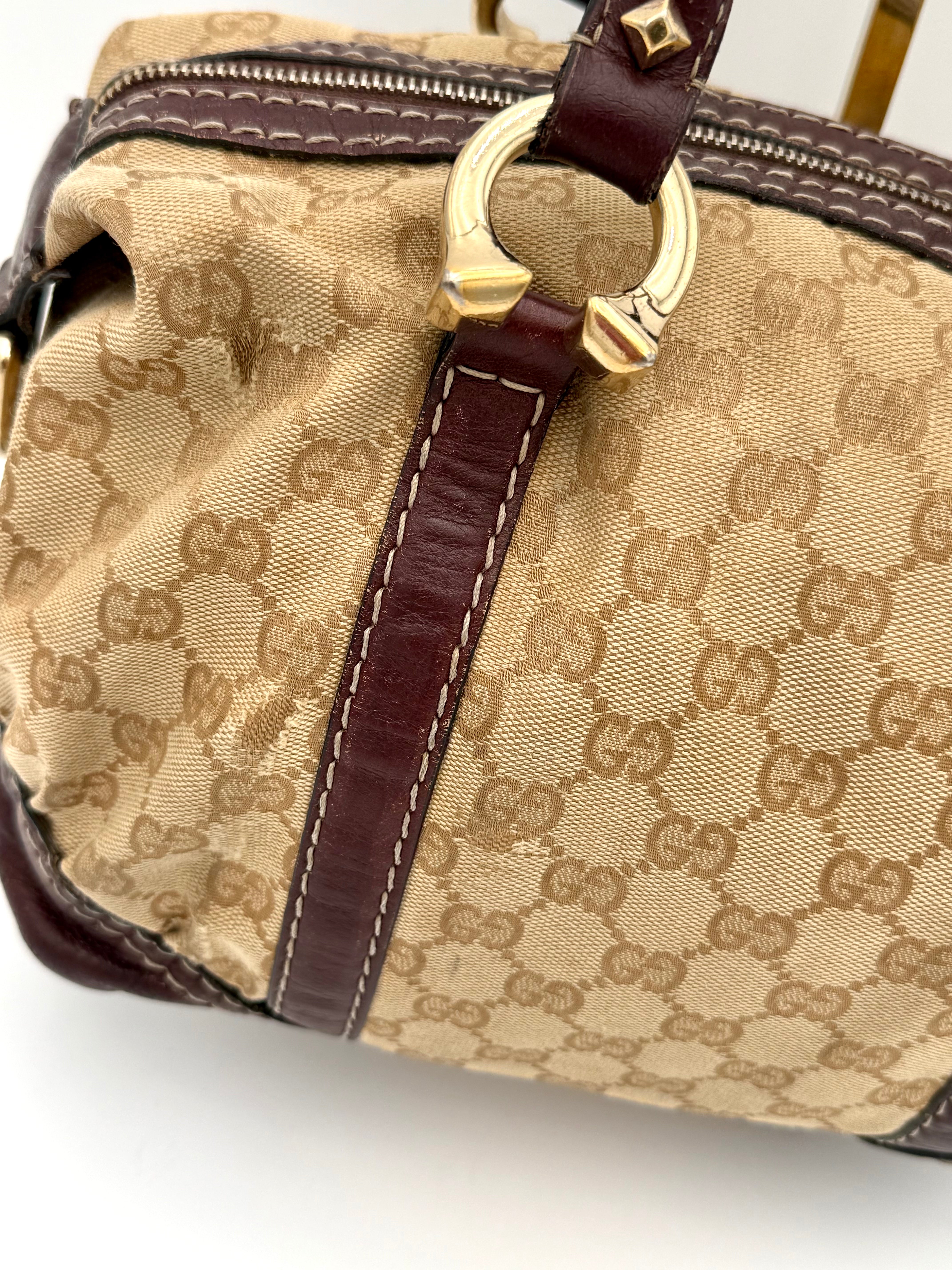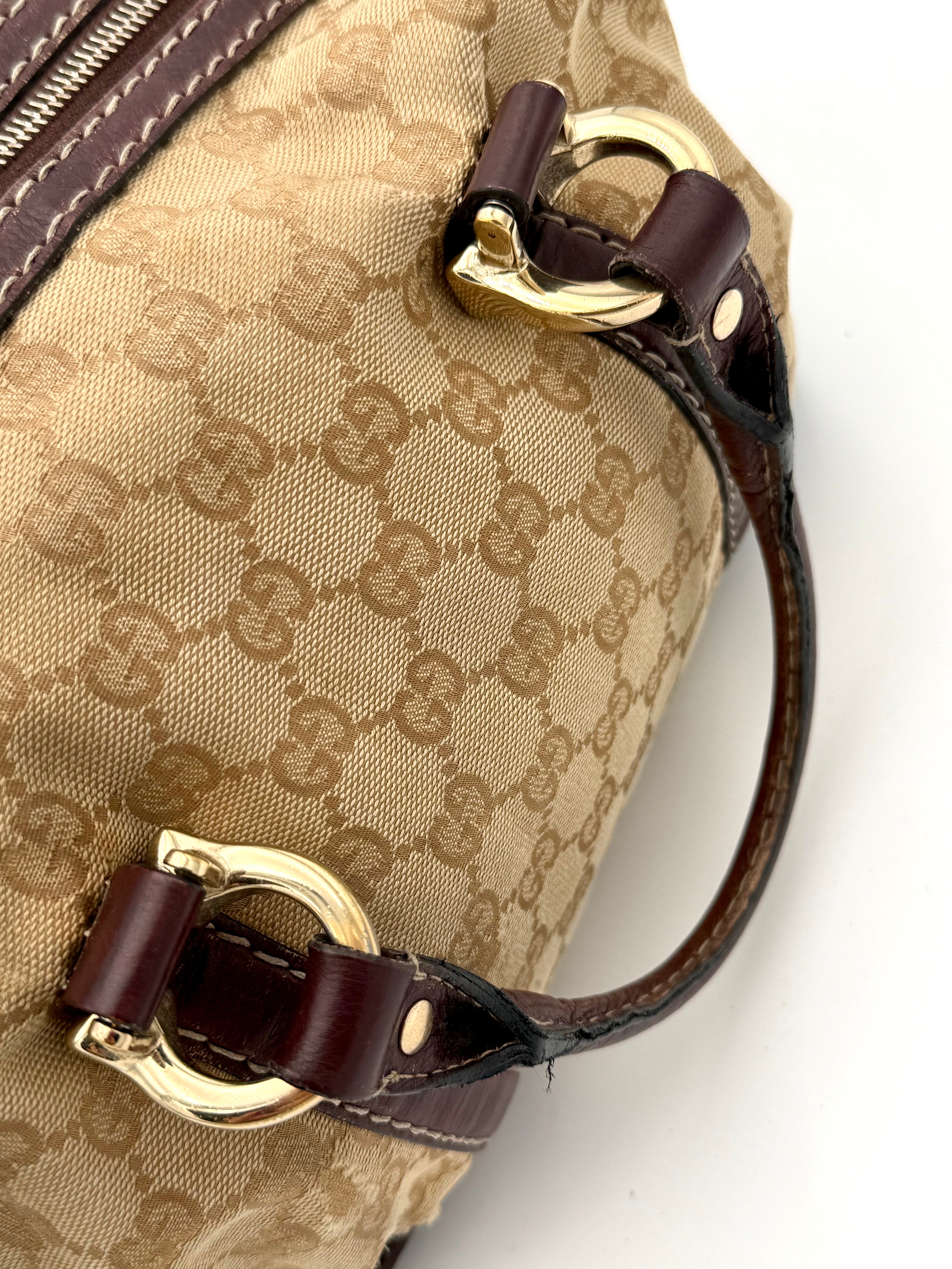 Tweedehands GUCCI bag in een beige kleur. De tas is van canvas met bordeaux leren hengsels en gouden hardware. De tas heeft één binnenvakje met rits en twee steekvakjes. Het item verkeert in een vintage staat, met algemene gebruikssporen. De tas wordt geleverd in onze mooie Moon flower dustbag.