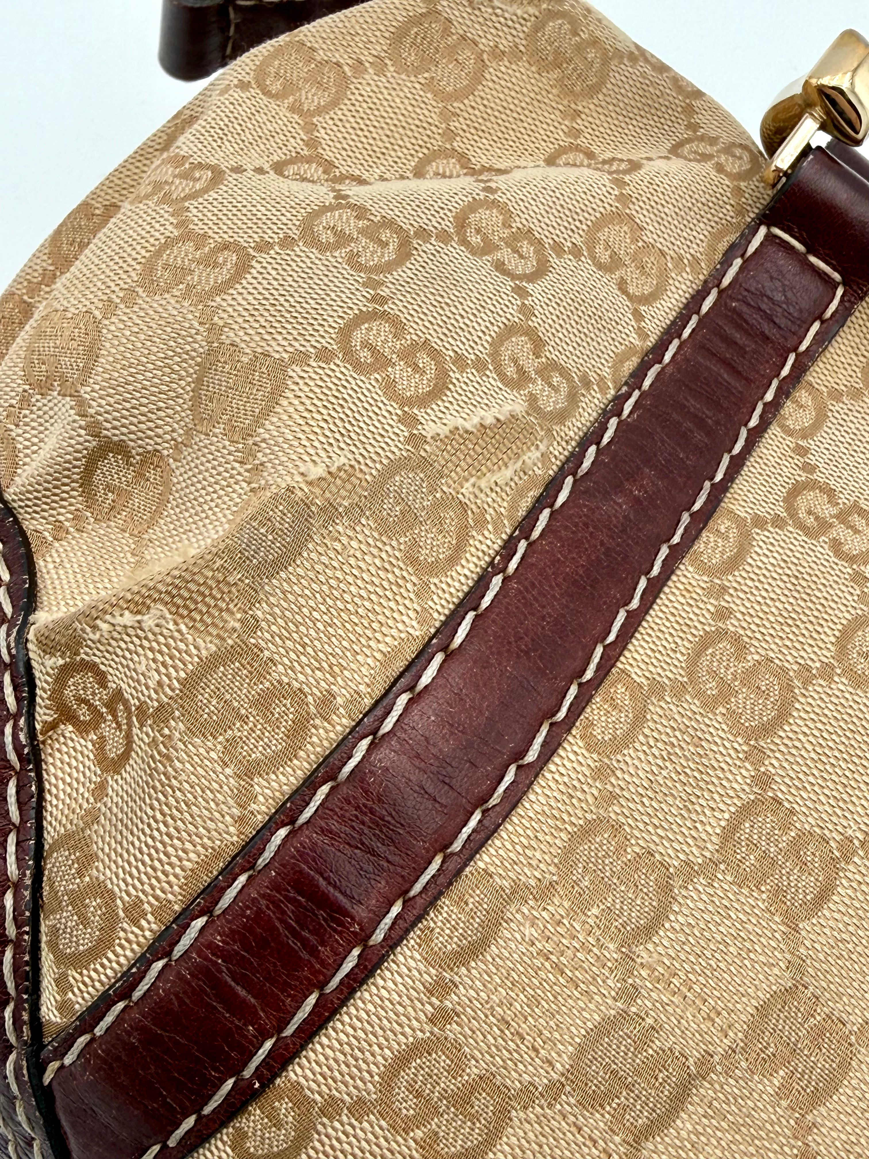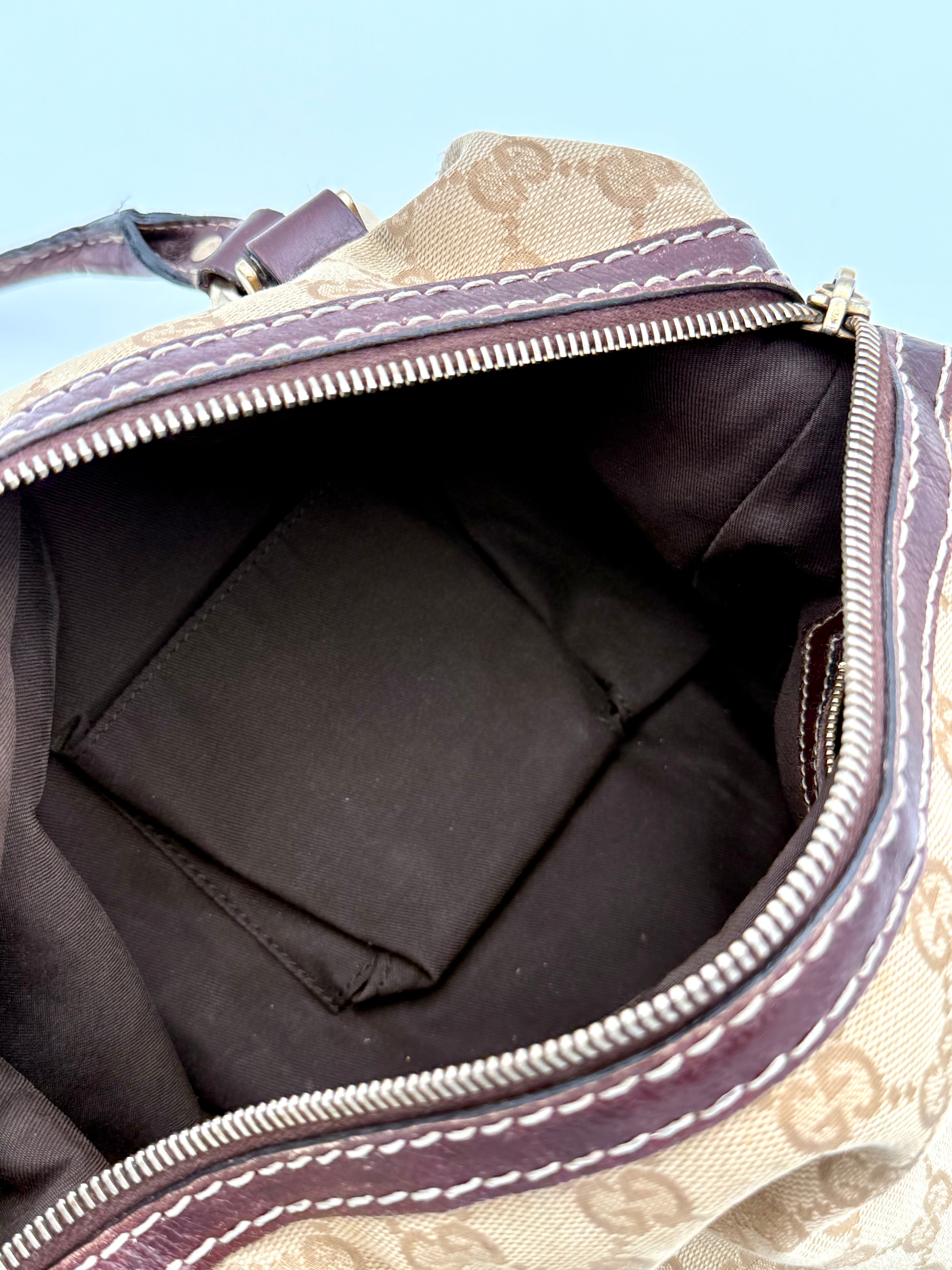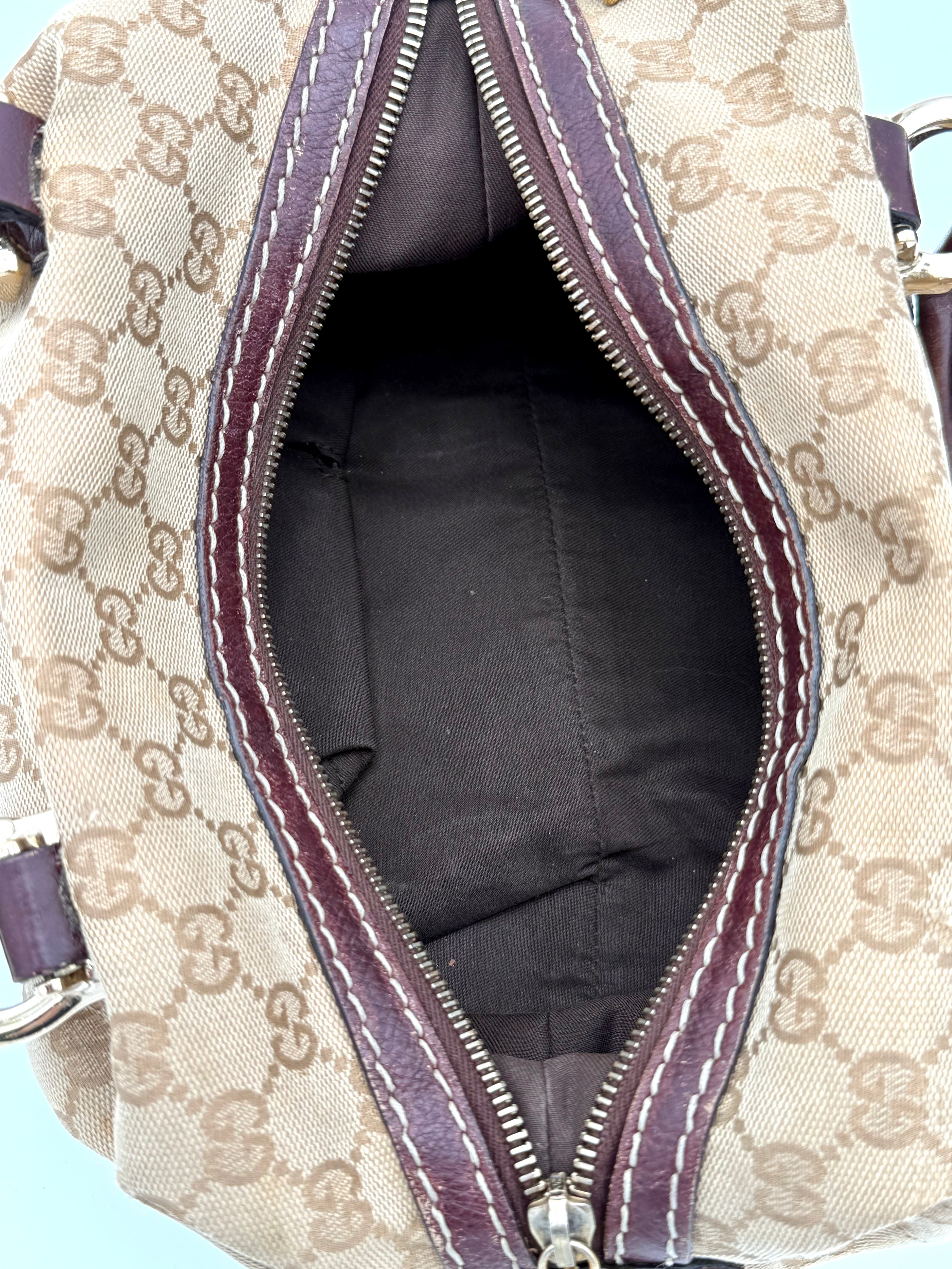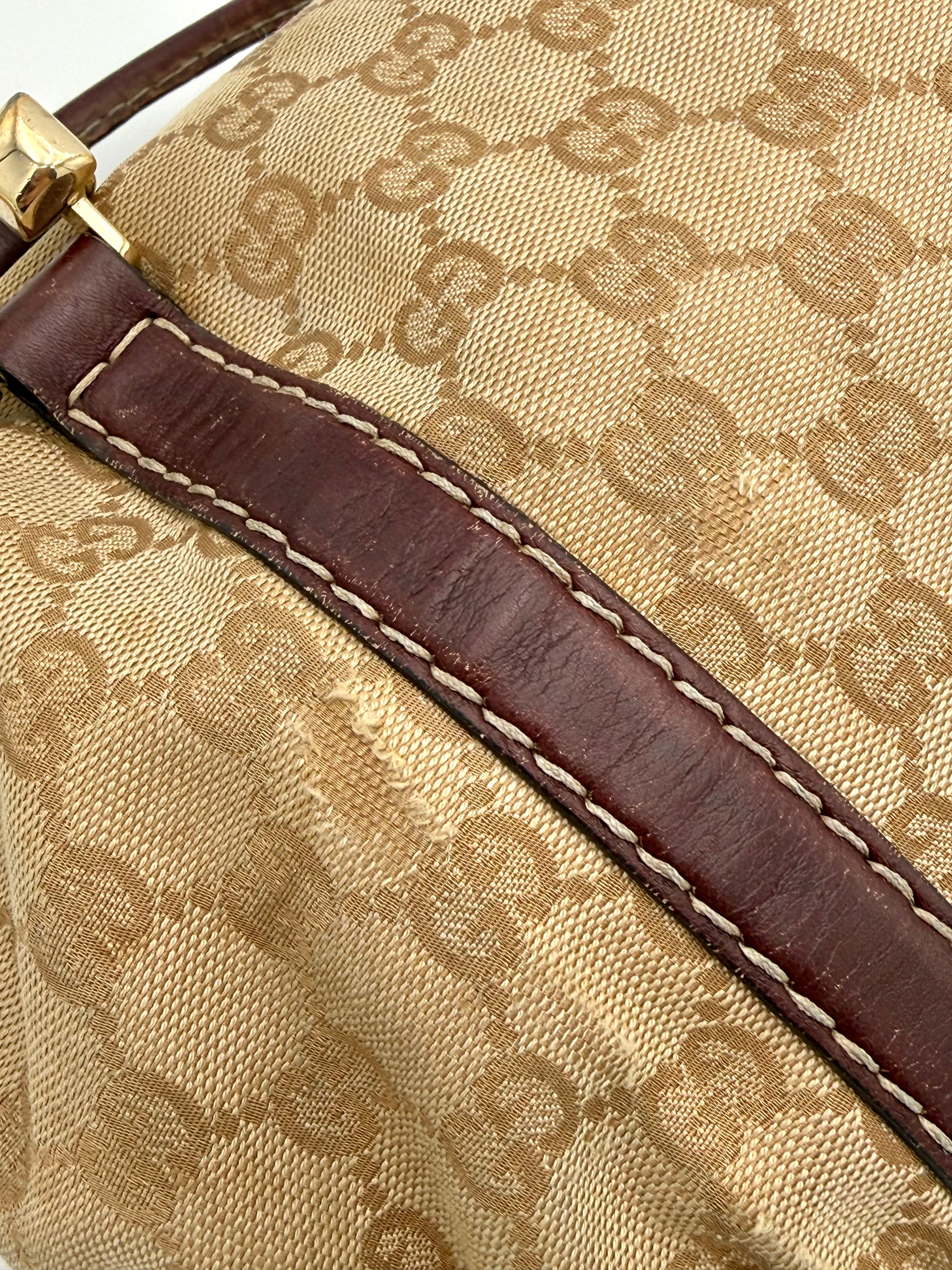 Tweedehands GUCCI bag in een beige kleur. De tas is van canvas met bordeaux leren hengsels en gouden hardware. De tas heeft één binnenvakje met rits en twee steekvakjes. Het item verkeert in een vintage staat, met algemene gebruikssporen. De tas wordt geleverd in onze mooie Moon flower dustbag.