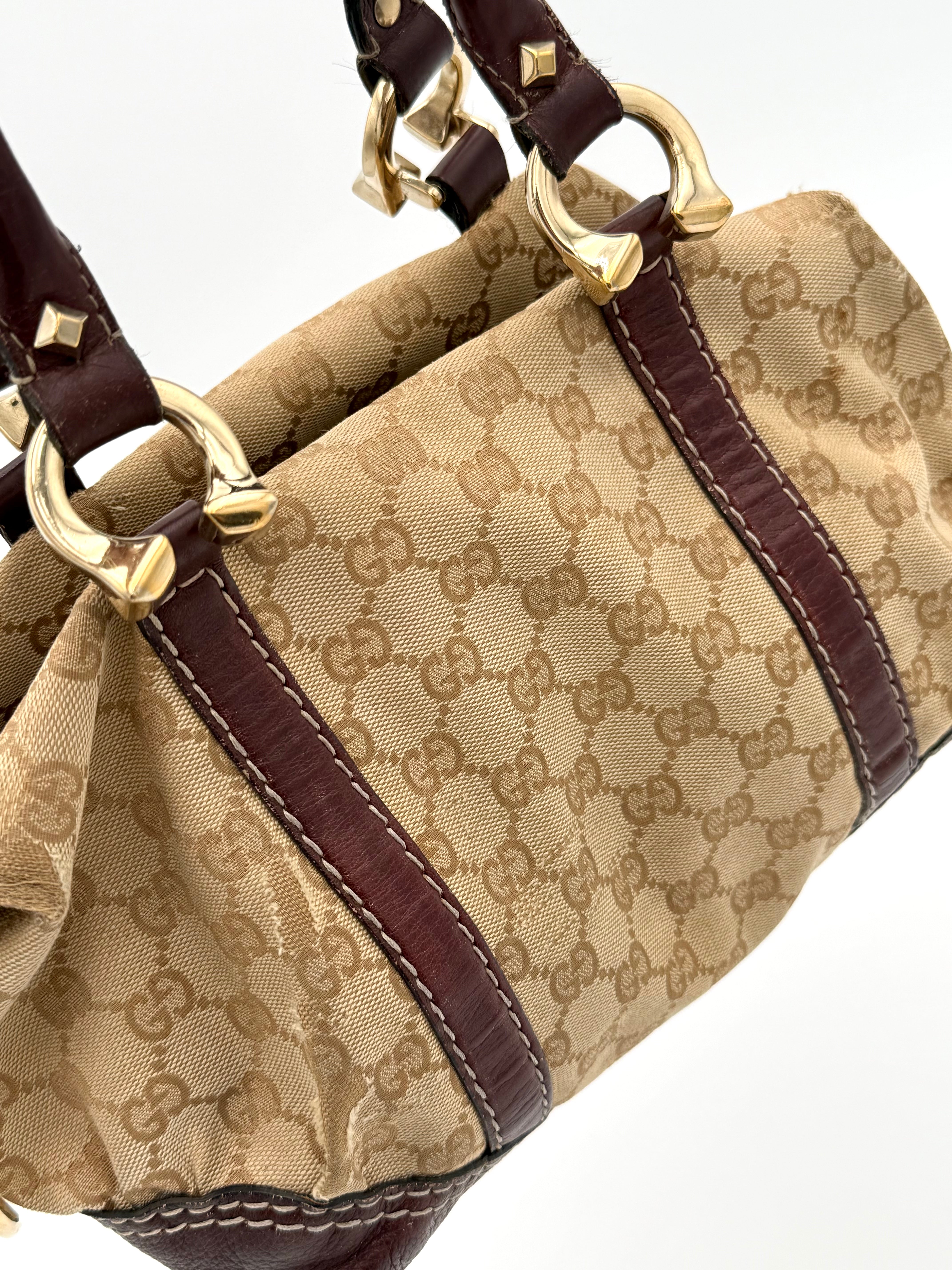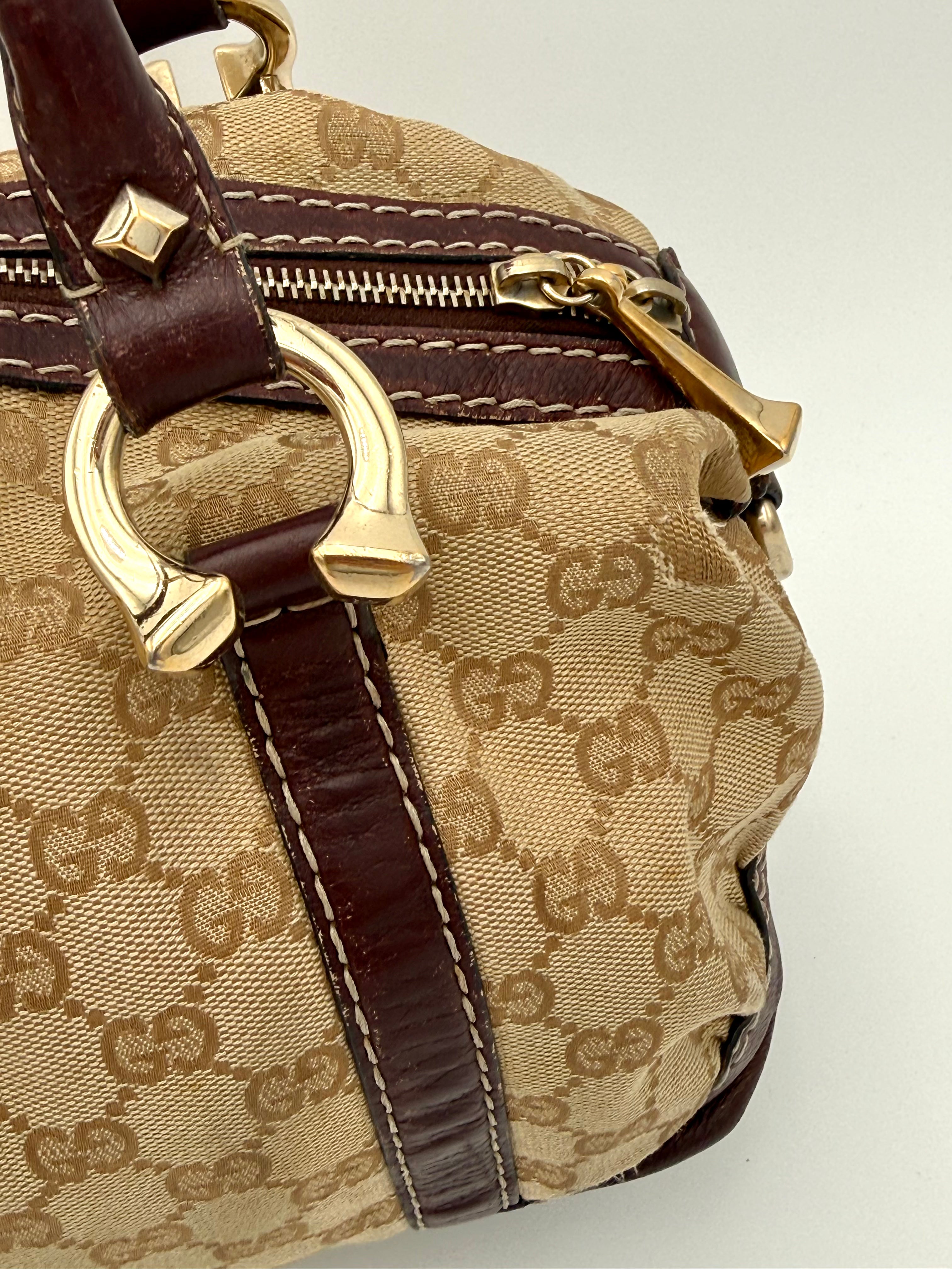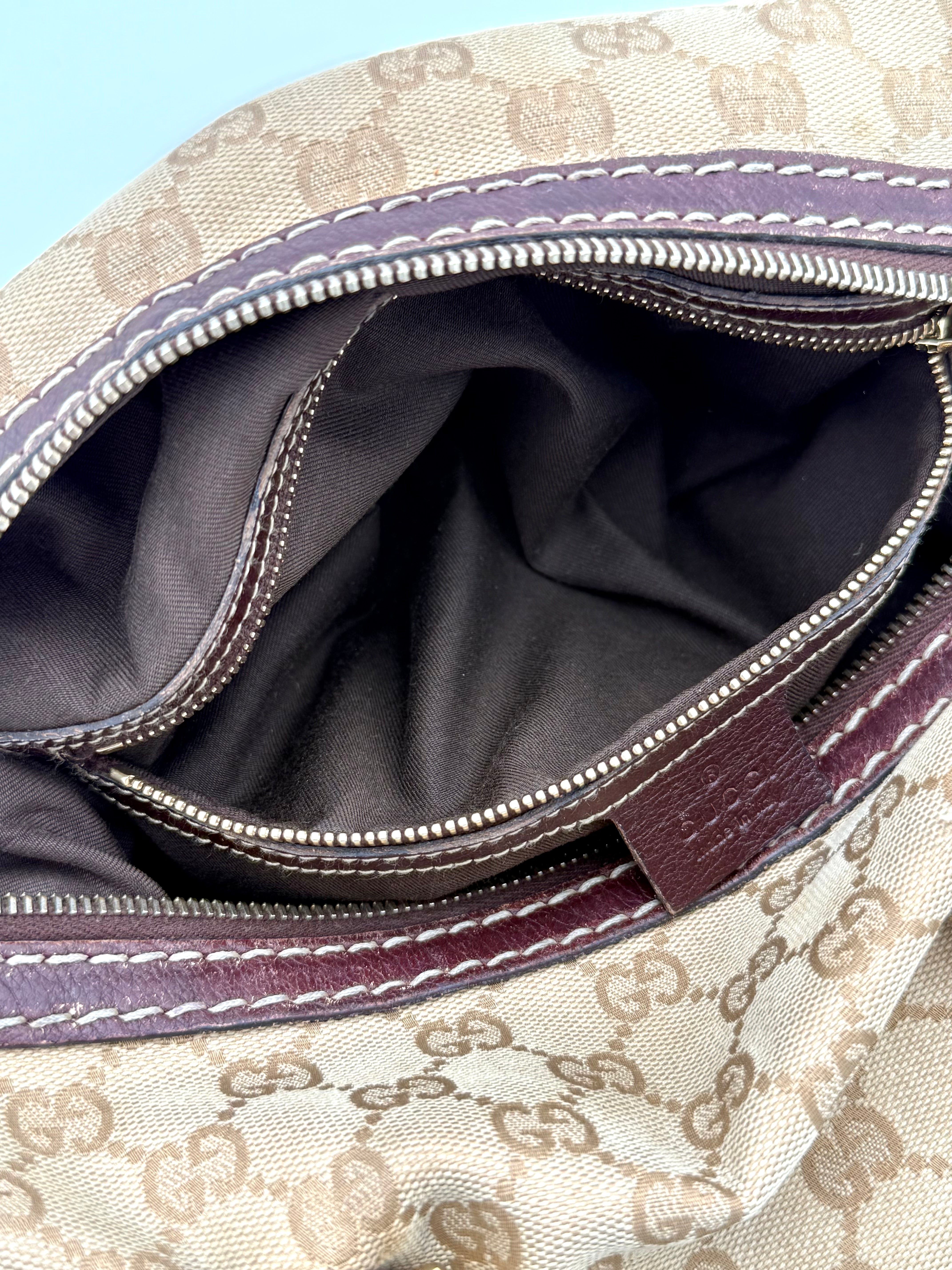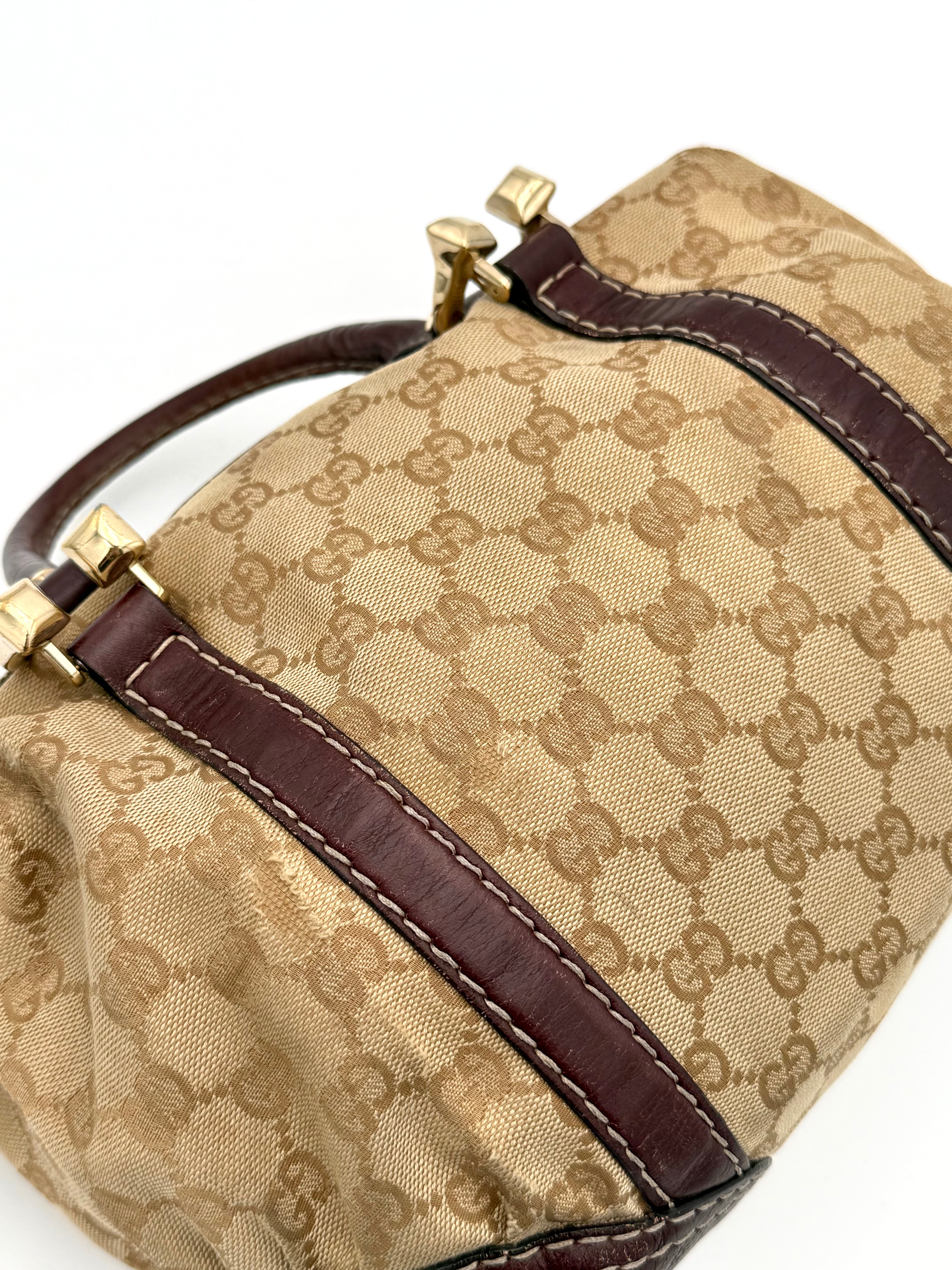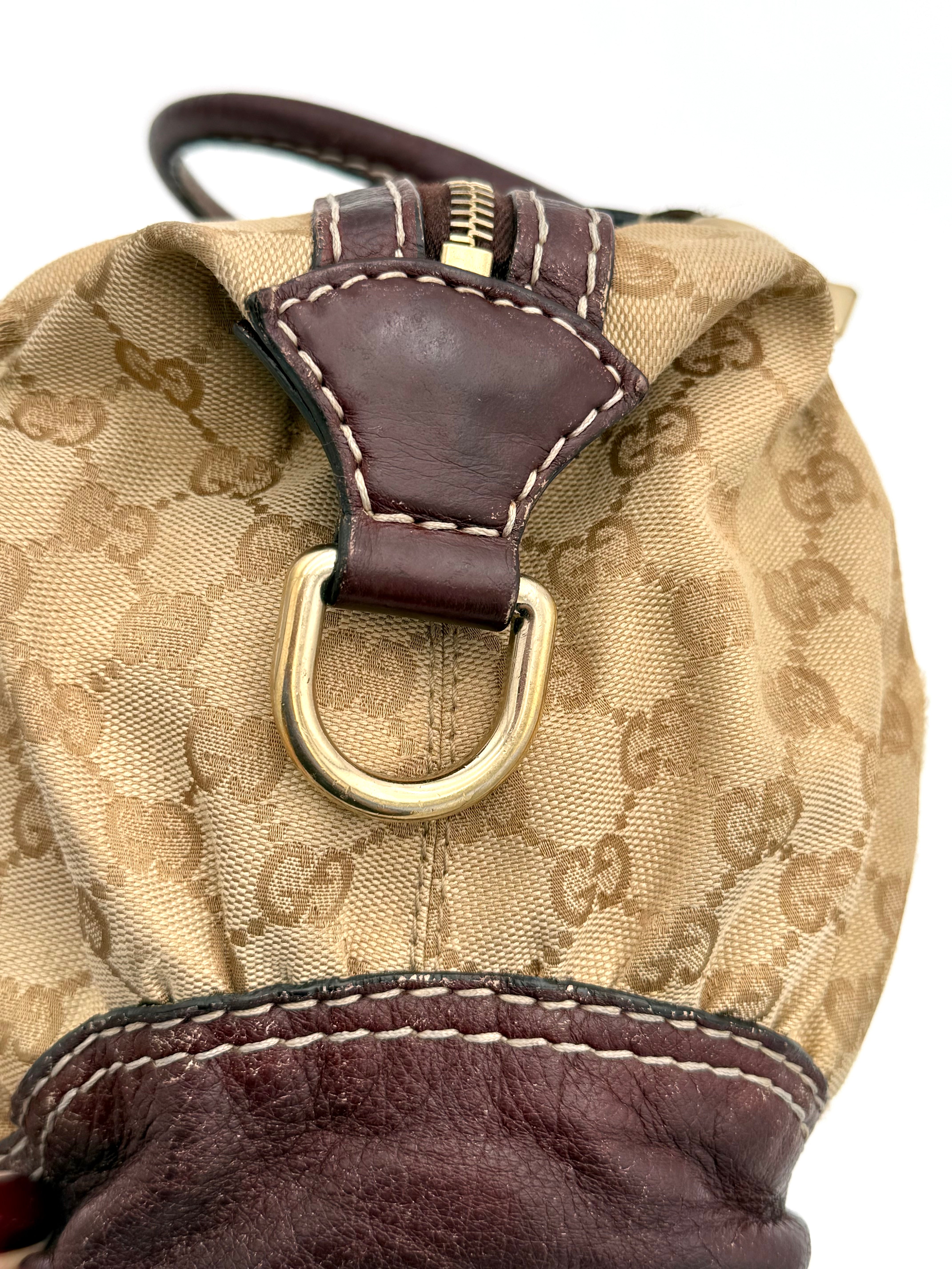 Tweedehands GUCCI bag in een beige kleur. De tas is van canvas met bordeaux leren hengsels en gouden hardware. De tas heeft één binnenvakje met rits en twee steekvakjes. Het item verkeert in een vintage staat, met algemene gebruikssporen. De tas wordt geleverd in onze mooie Moon flower dustbag.