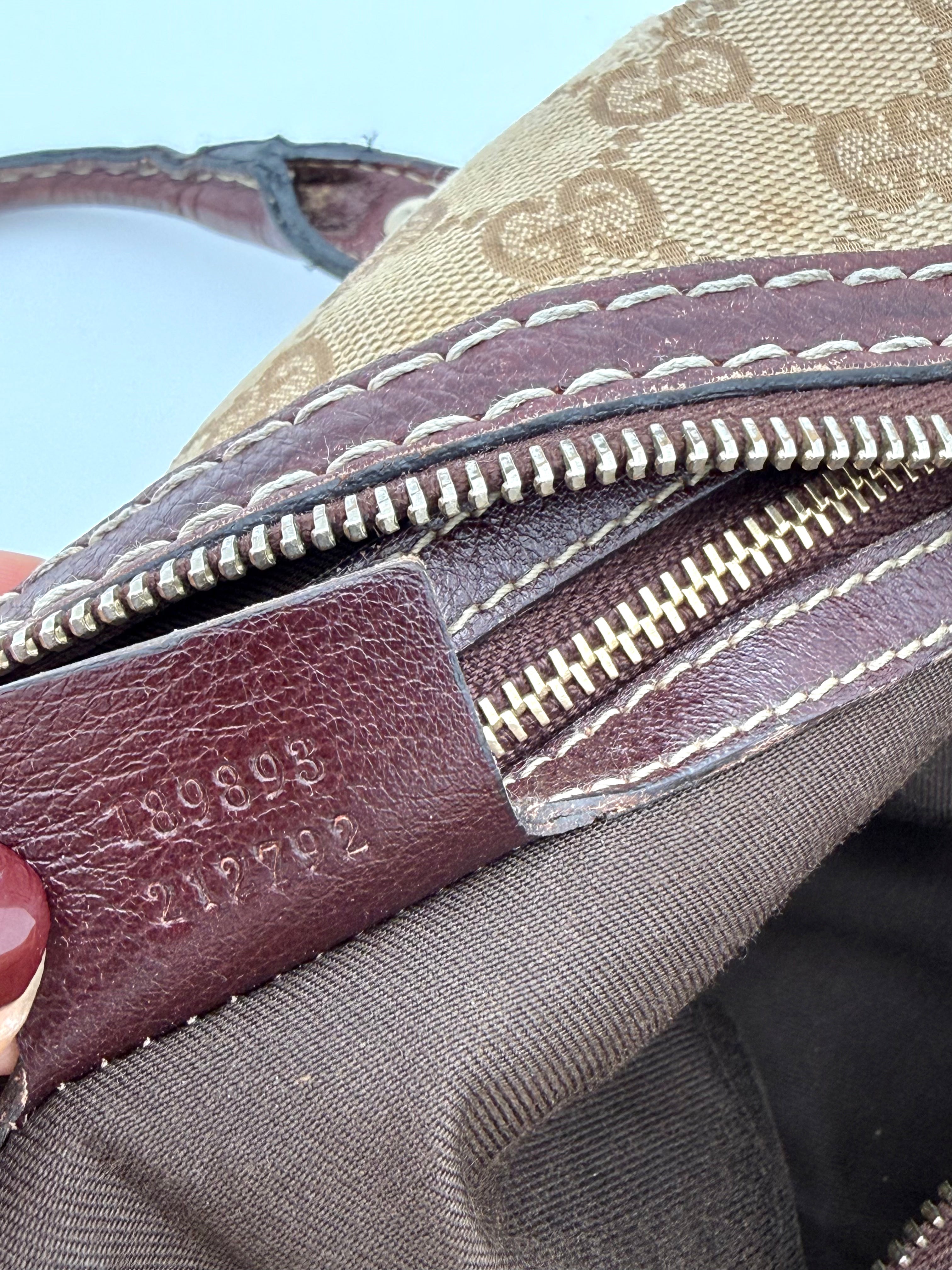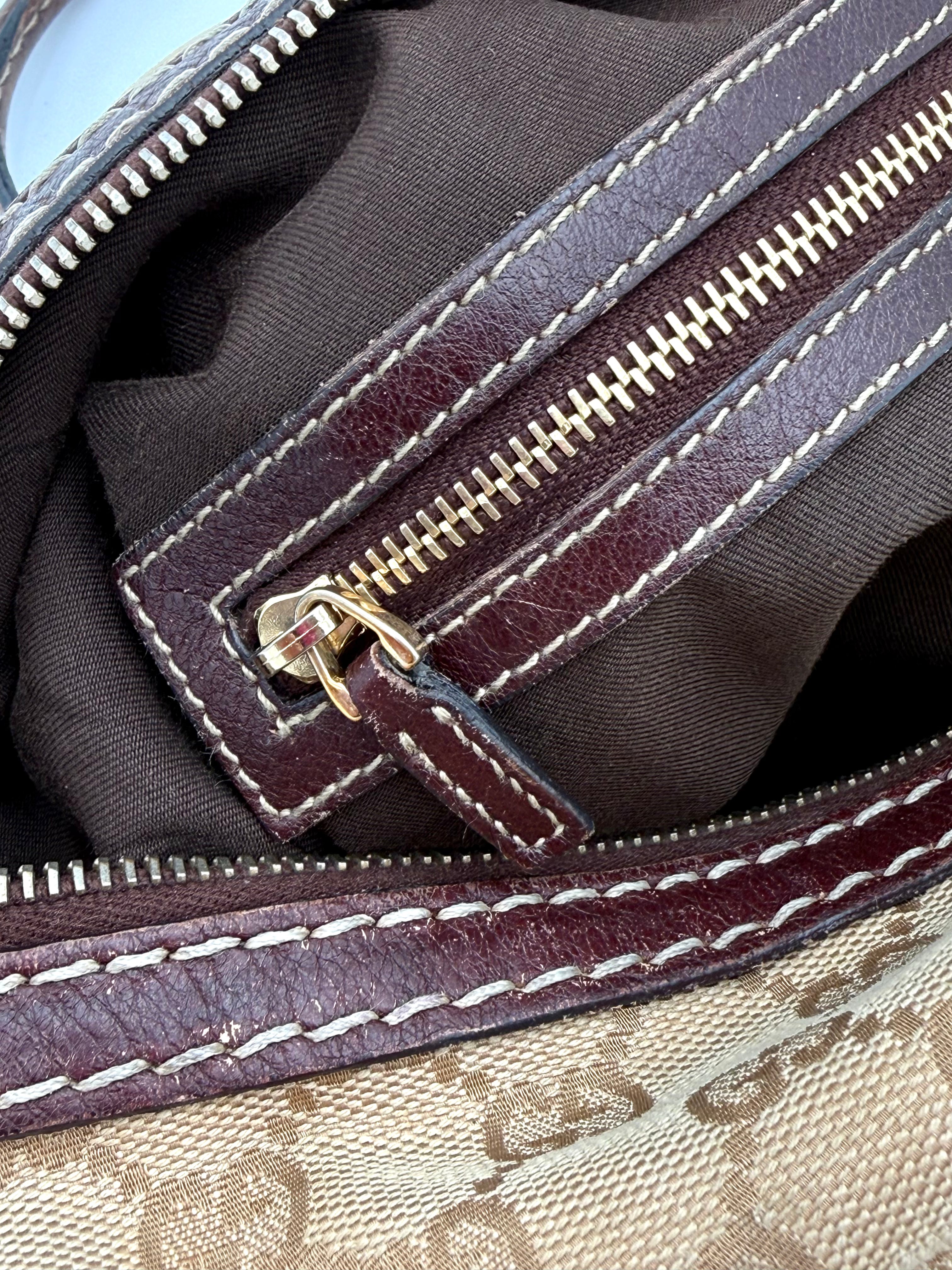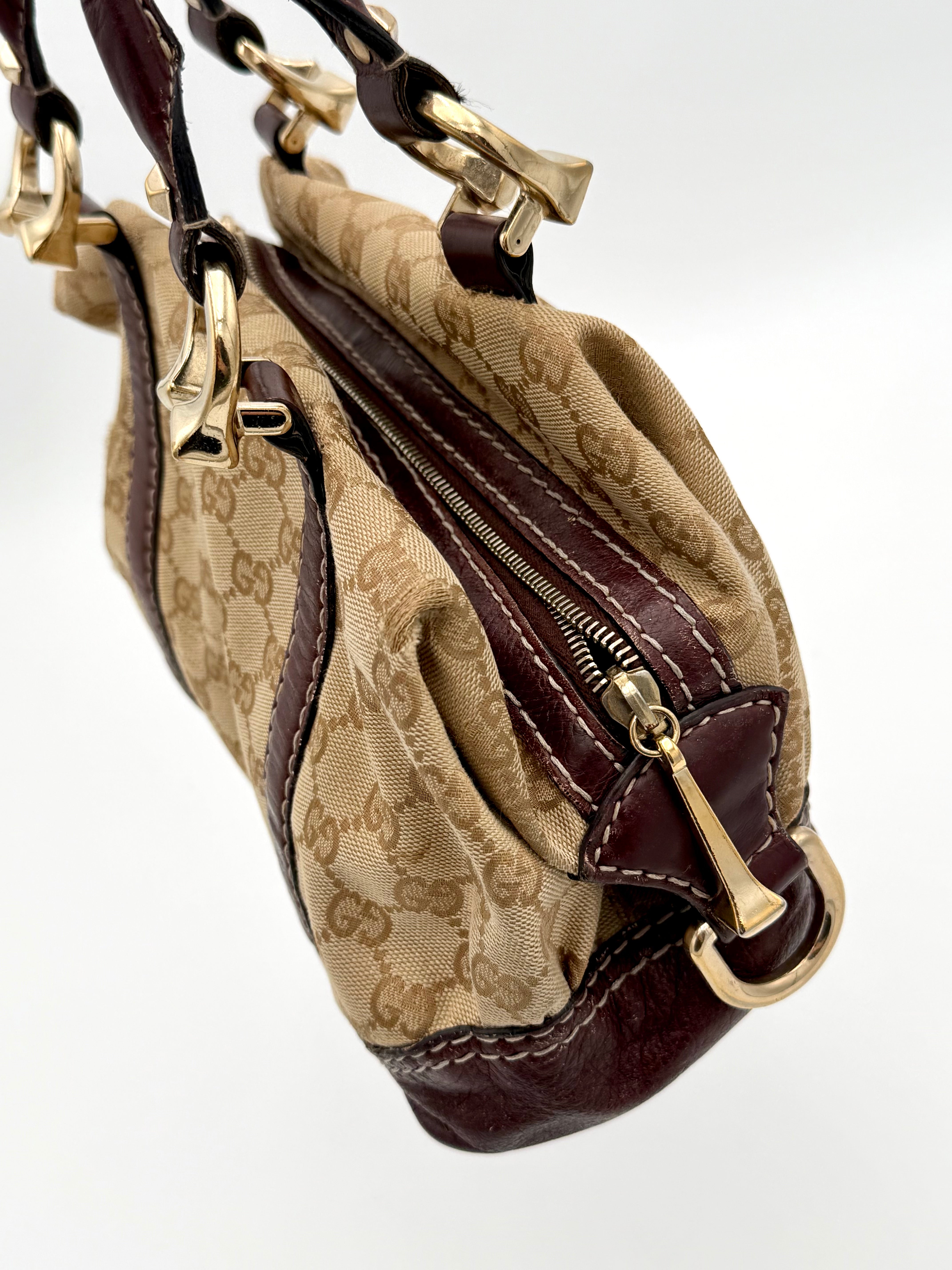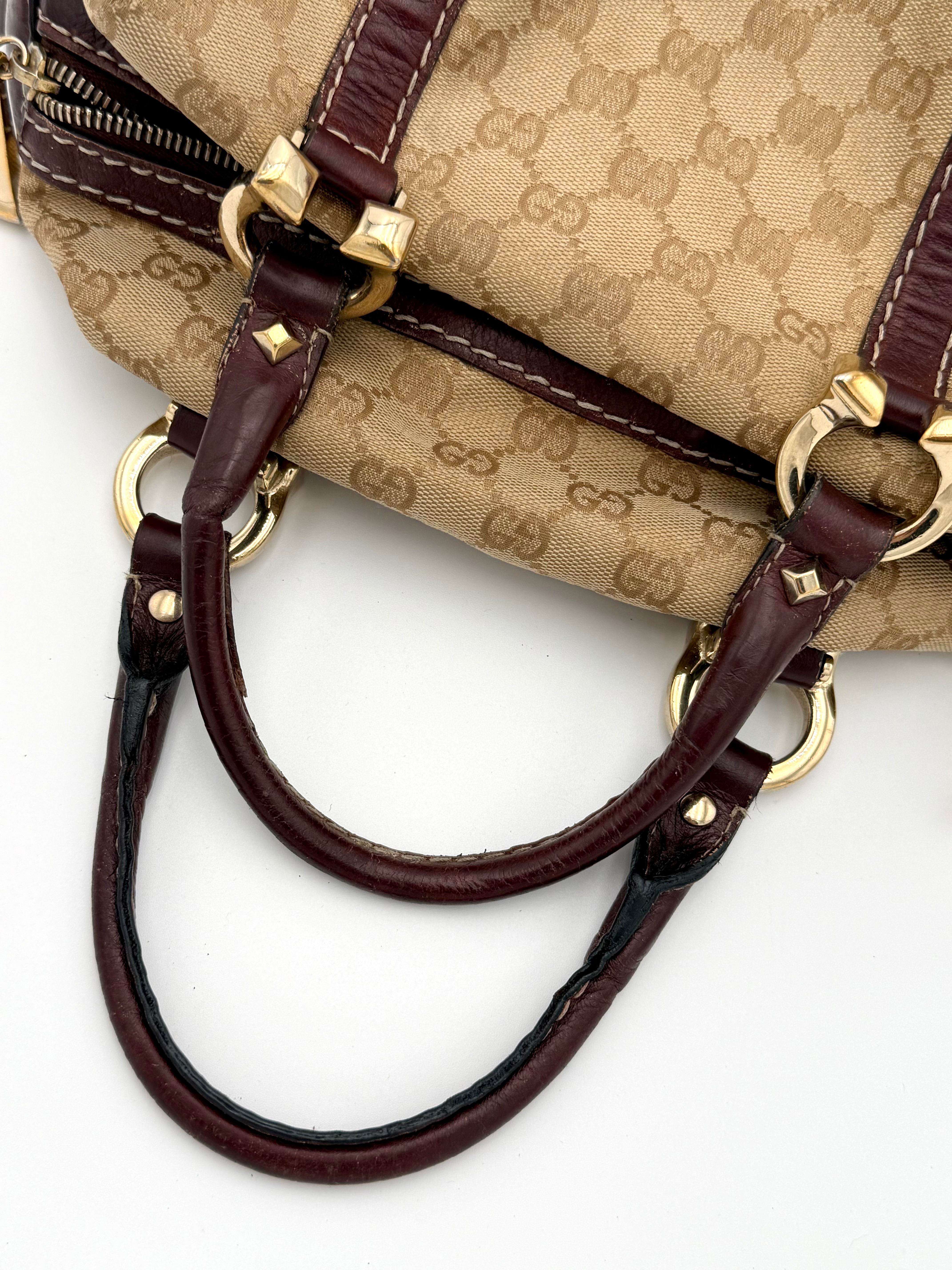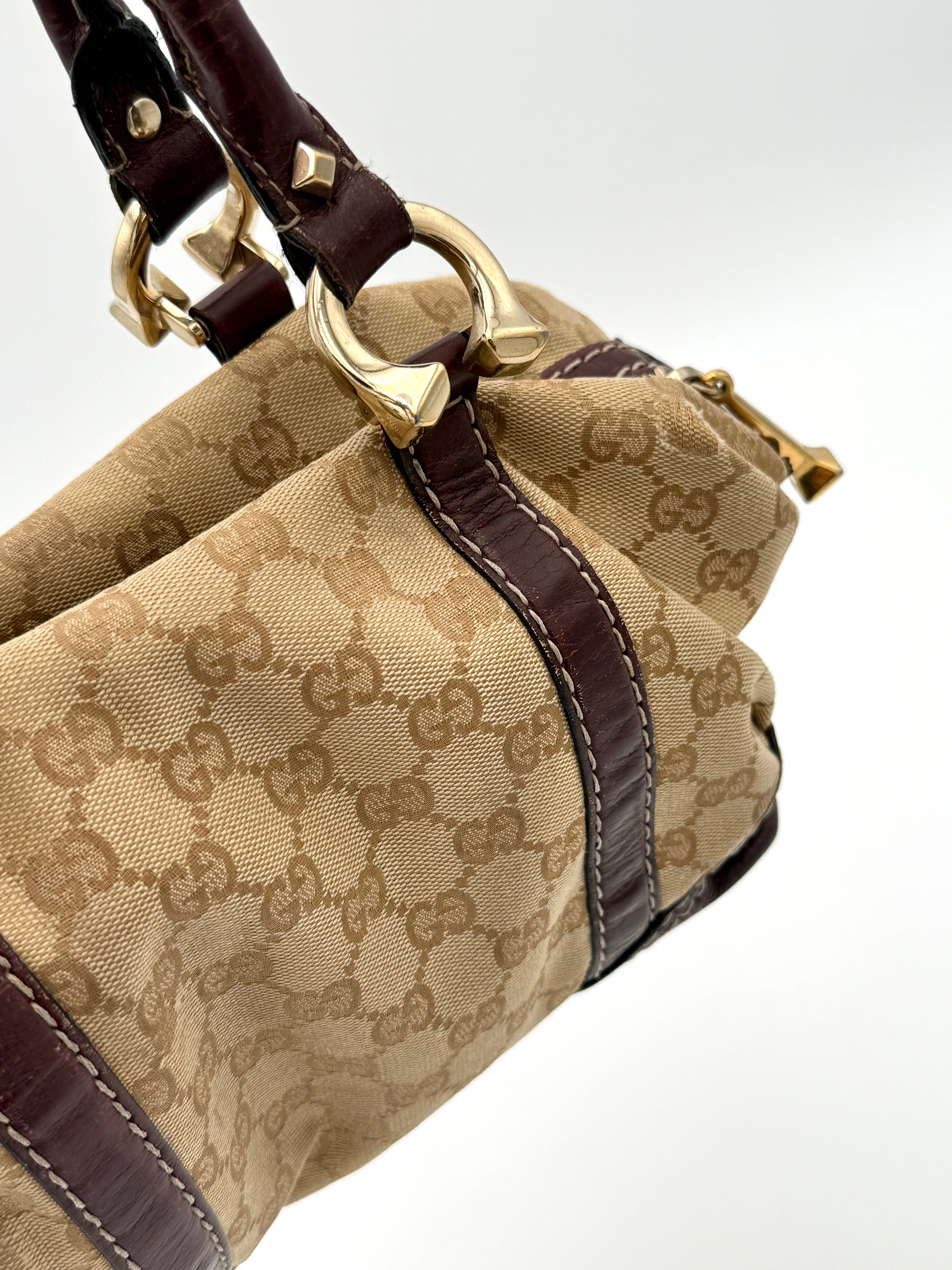 Tweedehands GUCCI bag in een beige kleur. De tas is van canvas met bordeaux leren hengsels en gouden hardware. De tas heeft één binnenvakje met rits en twee steekvakjes. Het item verkeert in een vintage staat, met algemene gebruikssporen. De tas wordt geleverd in onze mooie Moon flower dustbag.