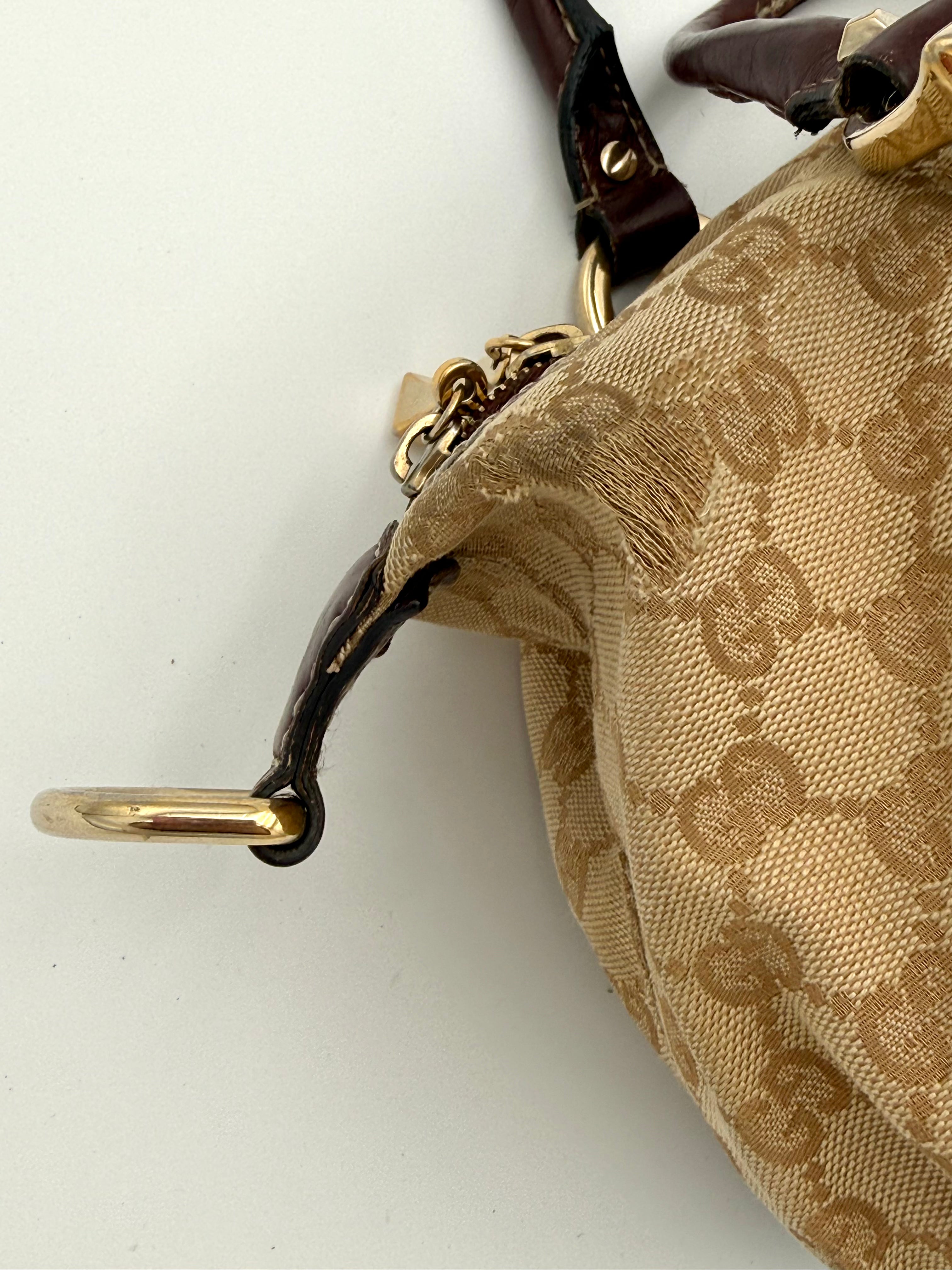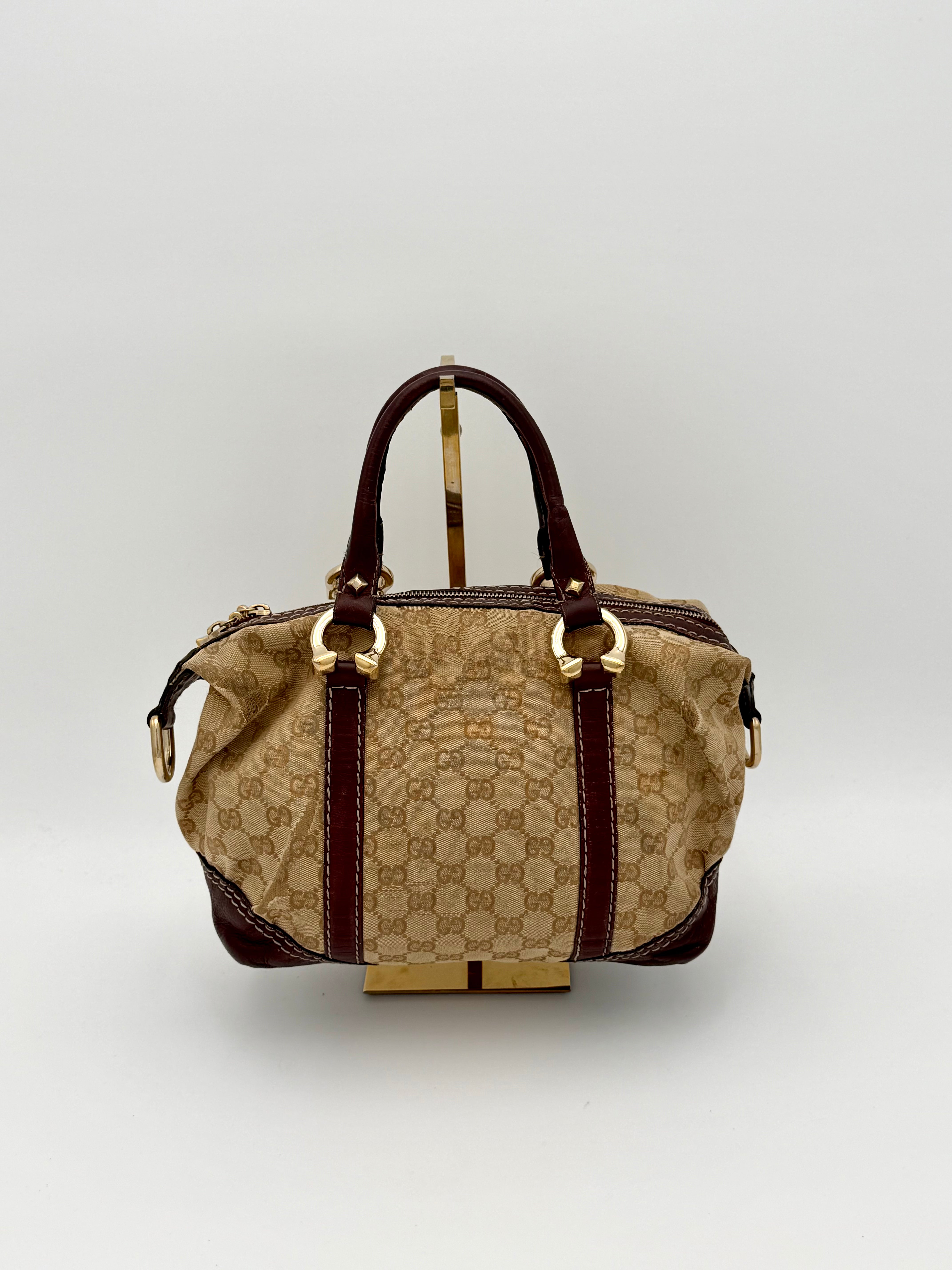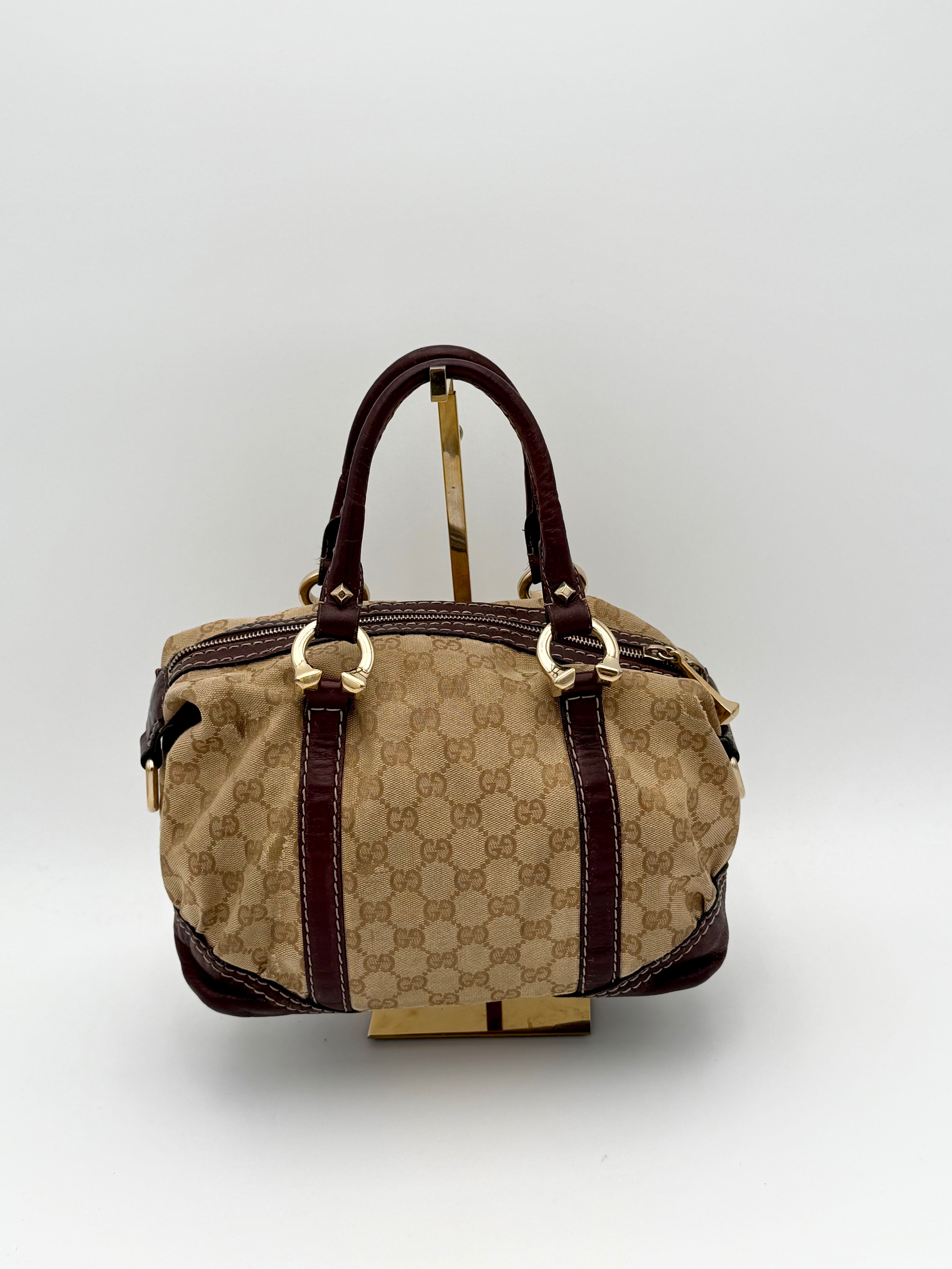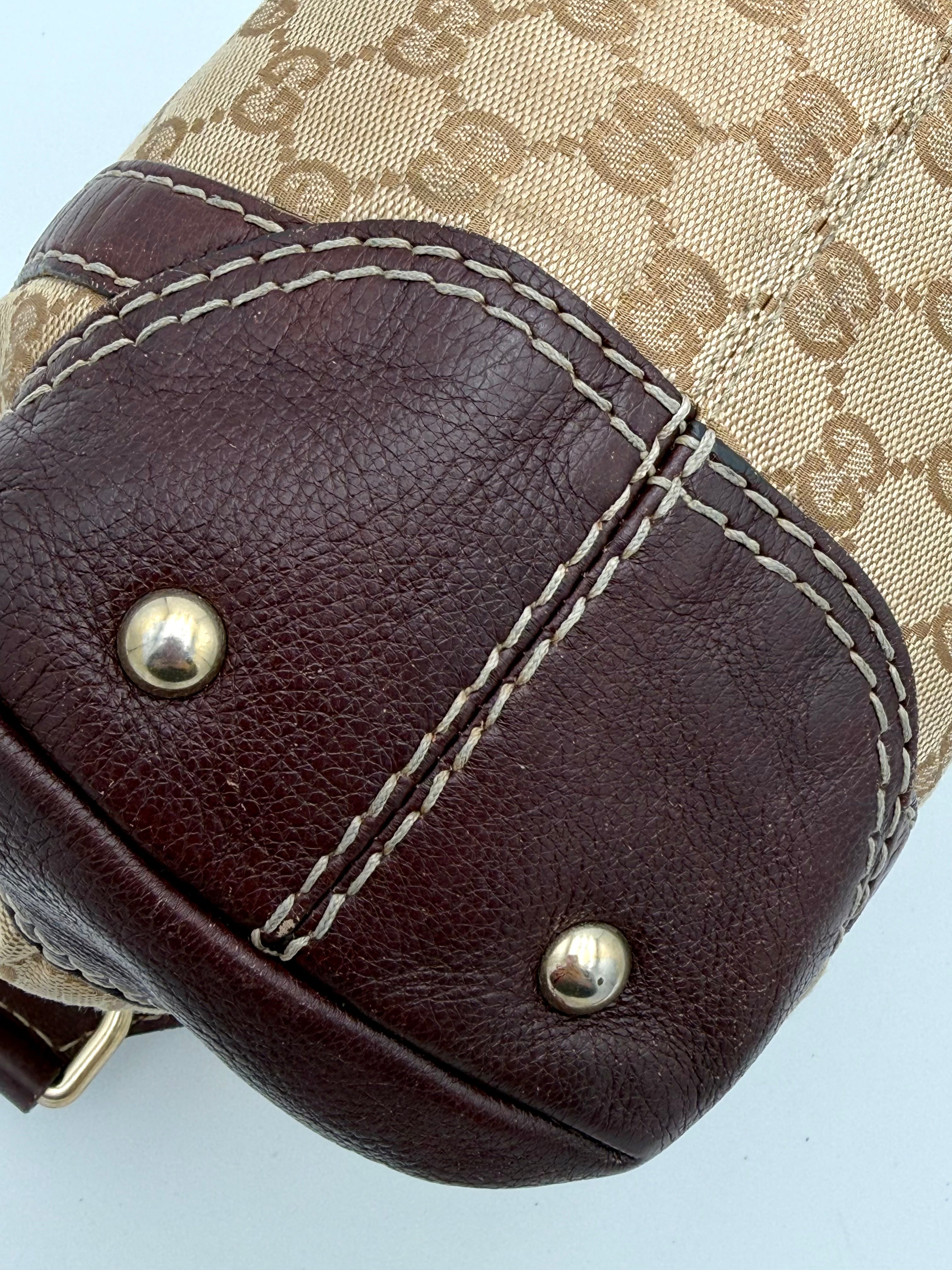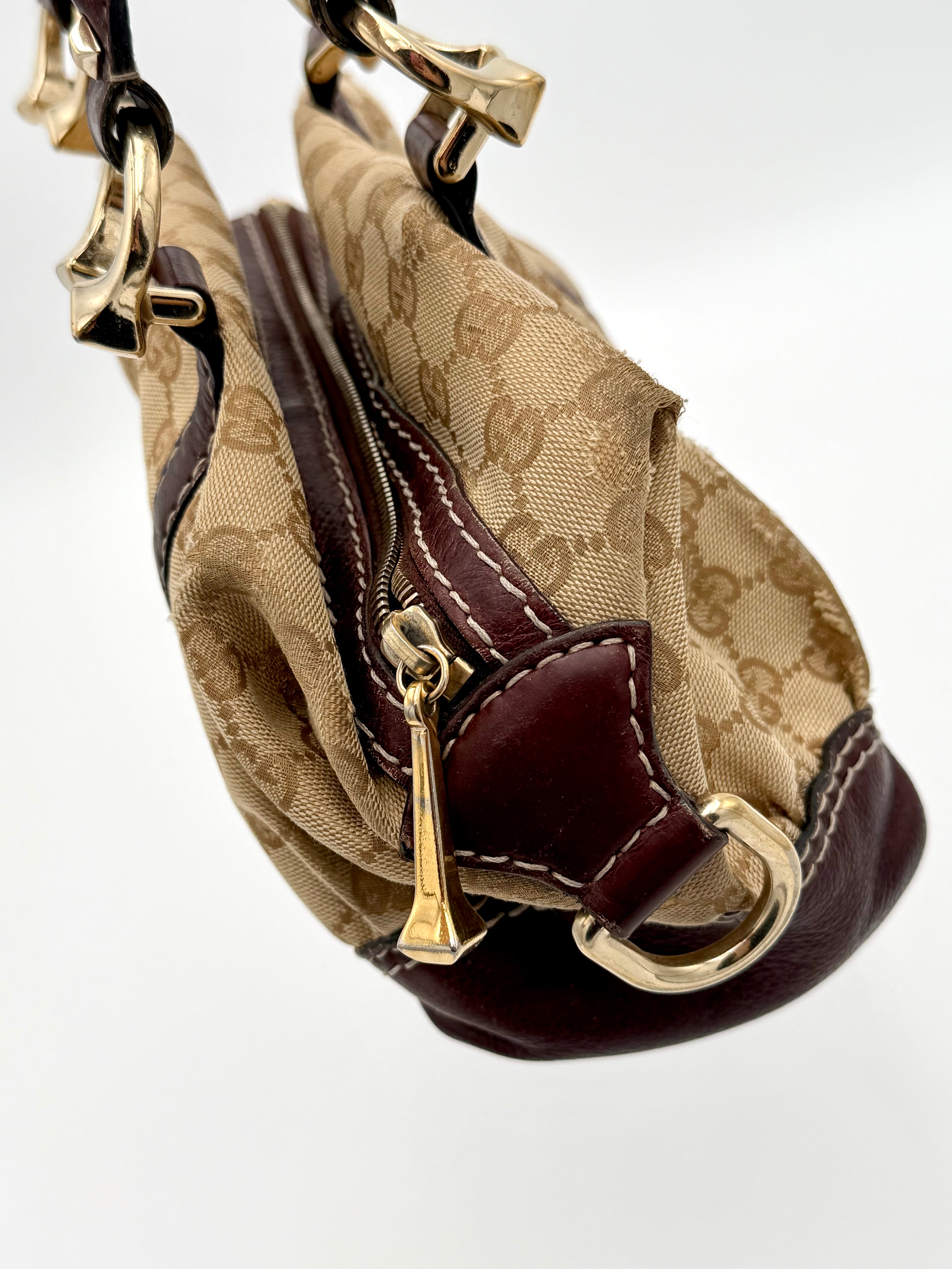 Tweedehands GUCCI bag in een beige kleur. De tas is van canvas met bordeaux leren hengsels en gouden hardware. De tas heeft één binnenvakje met rits en twee steekvakjes. Het item verkeert in een vintage staat, met algemene gebruikssporen. De tas wordt geleverd in onze mooie Moon flower dustbag.