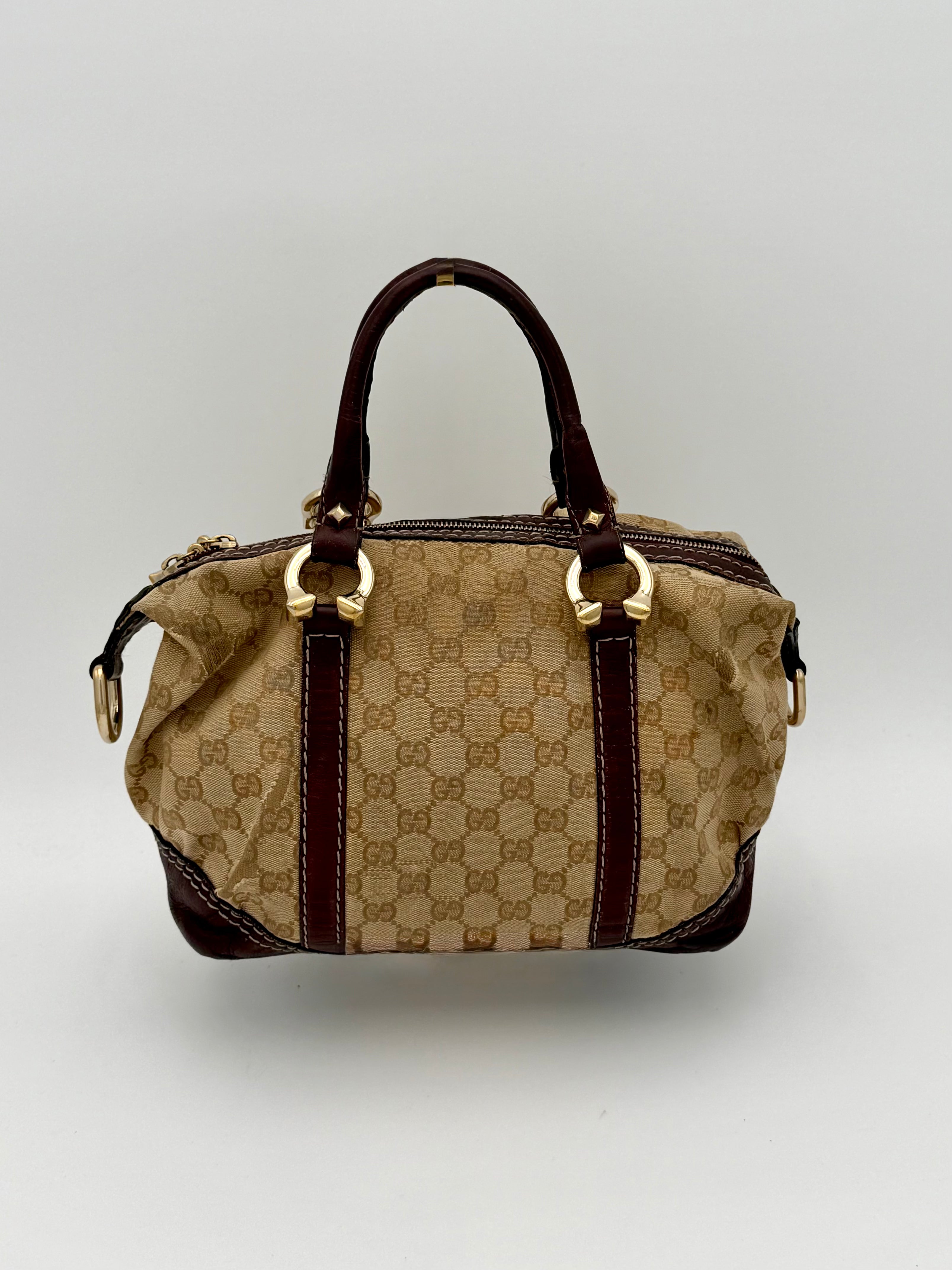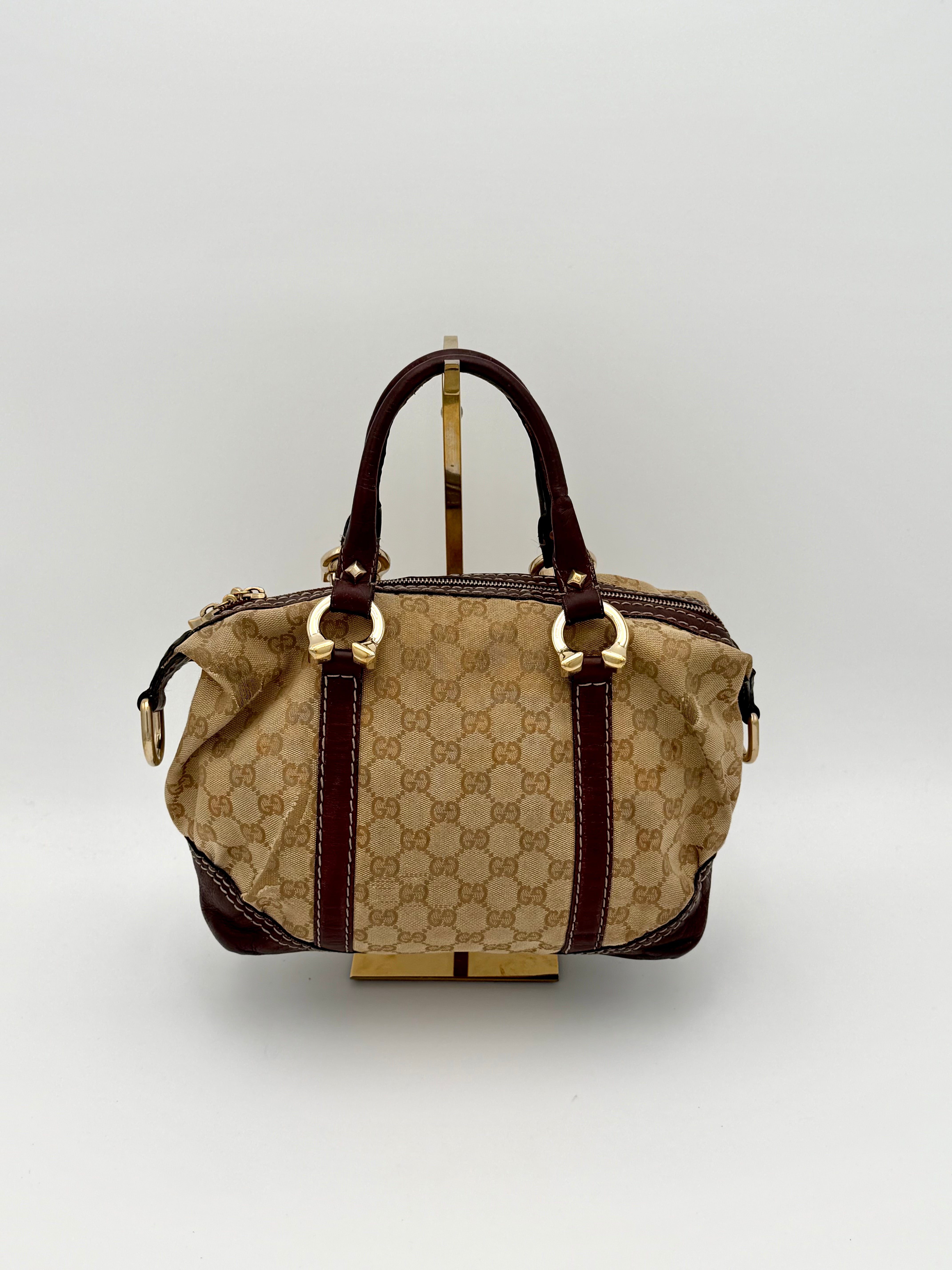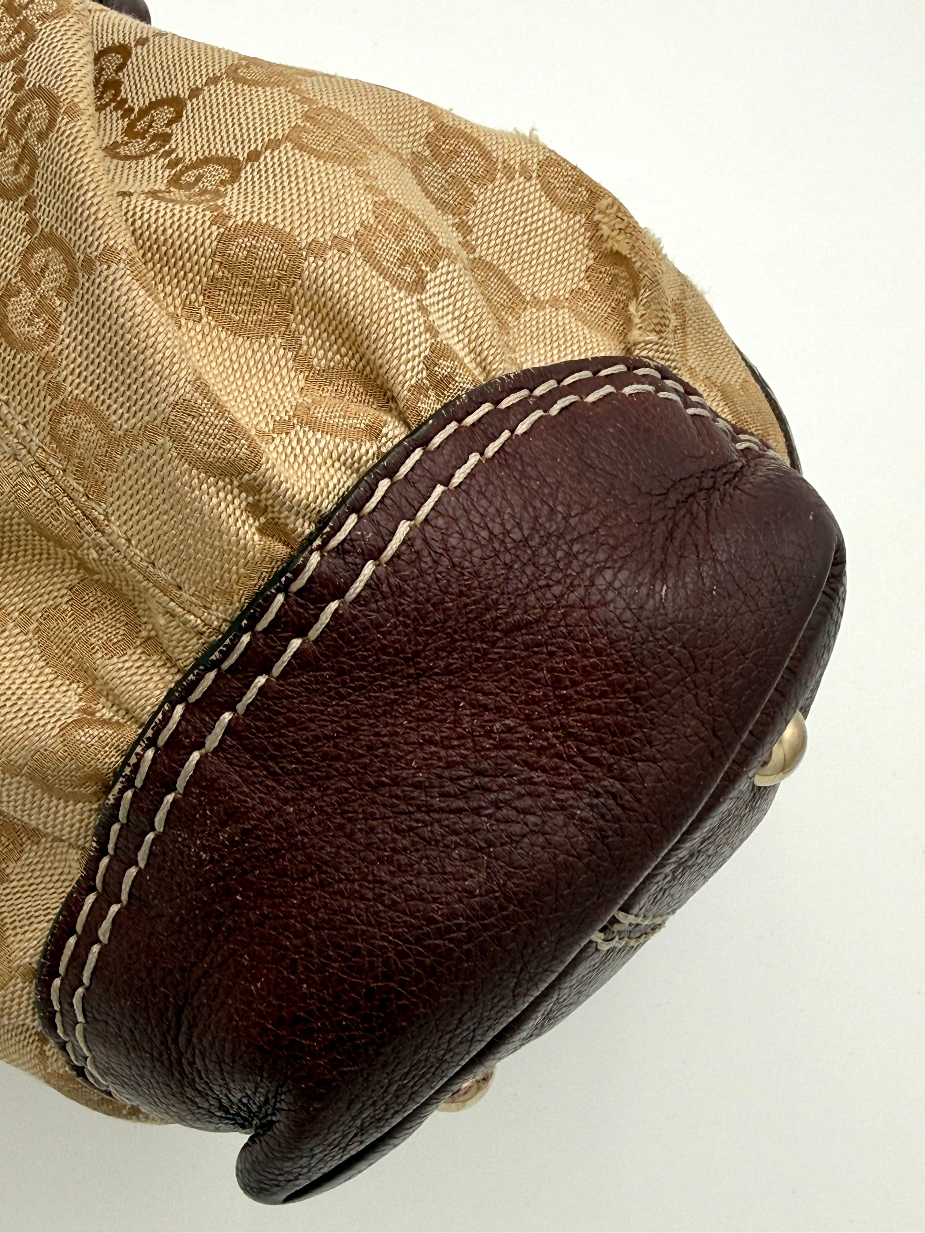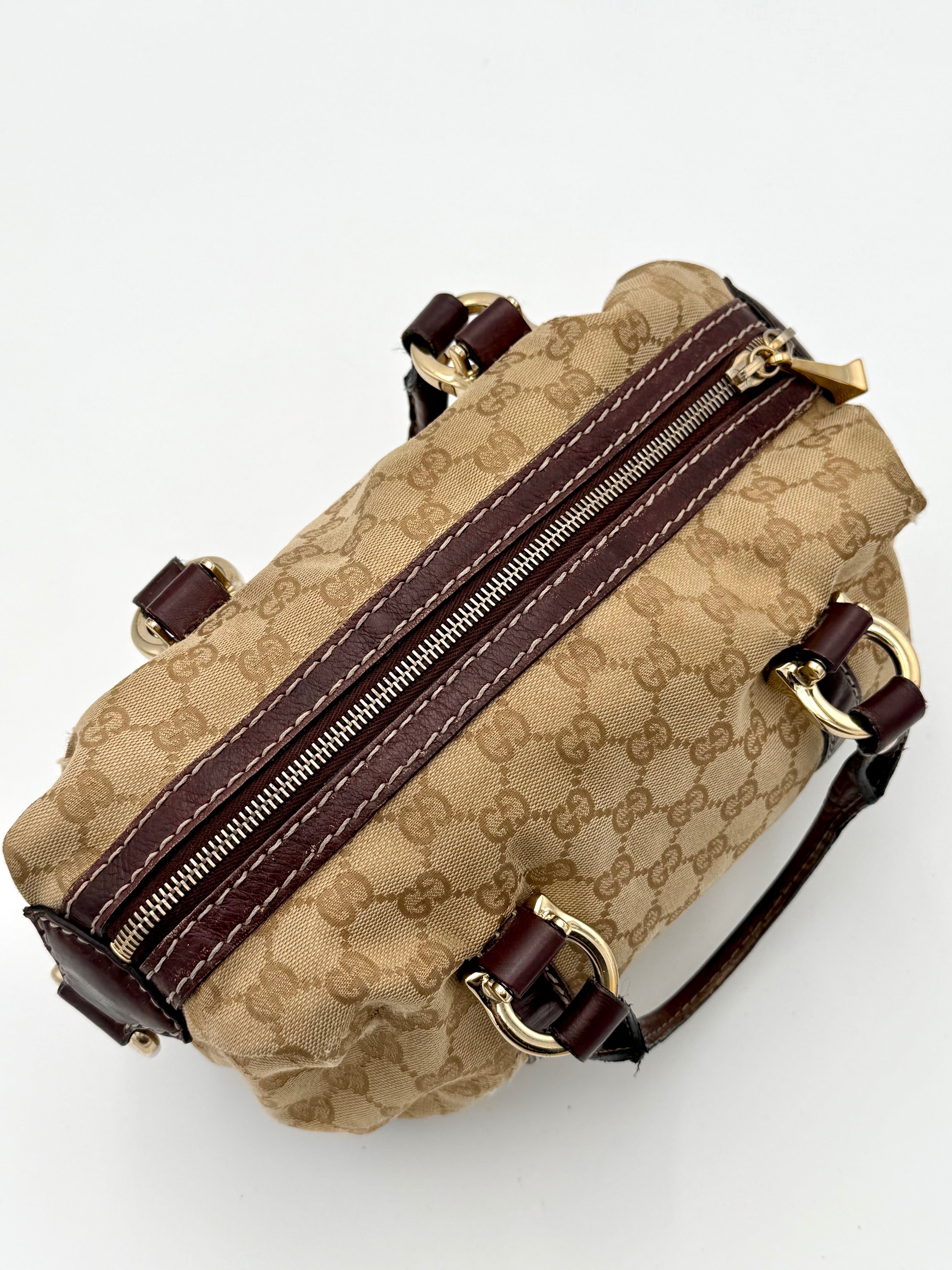 Tweedehands GUCCI bag in een beige kleur. De tas is van canvas met bordeaux leren hengsels en gouden hardware. De tas heeft één binnenvakje met rits en twee steekvakjes. Het item verkeert in een vintage staat, met algemene gebruikssporen. De tas wordt geleverd in onze mooie Moon flower dustbag.