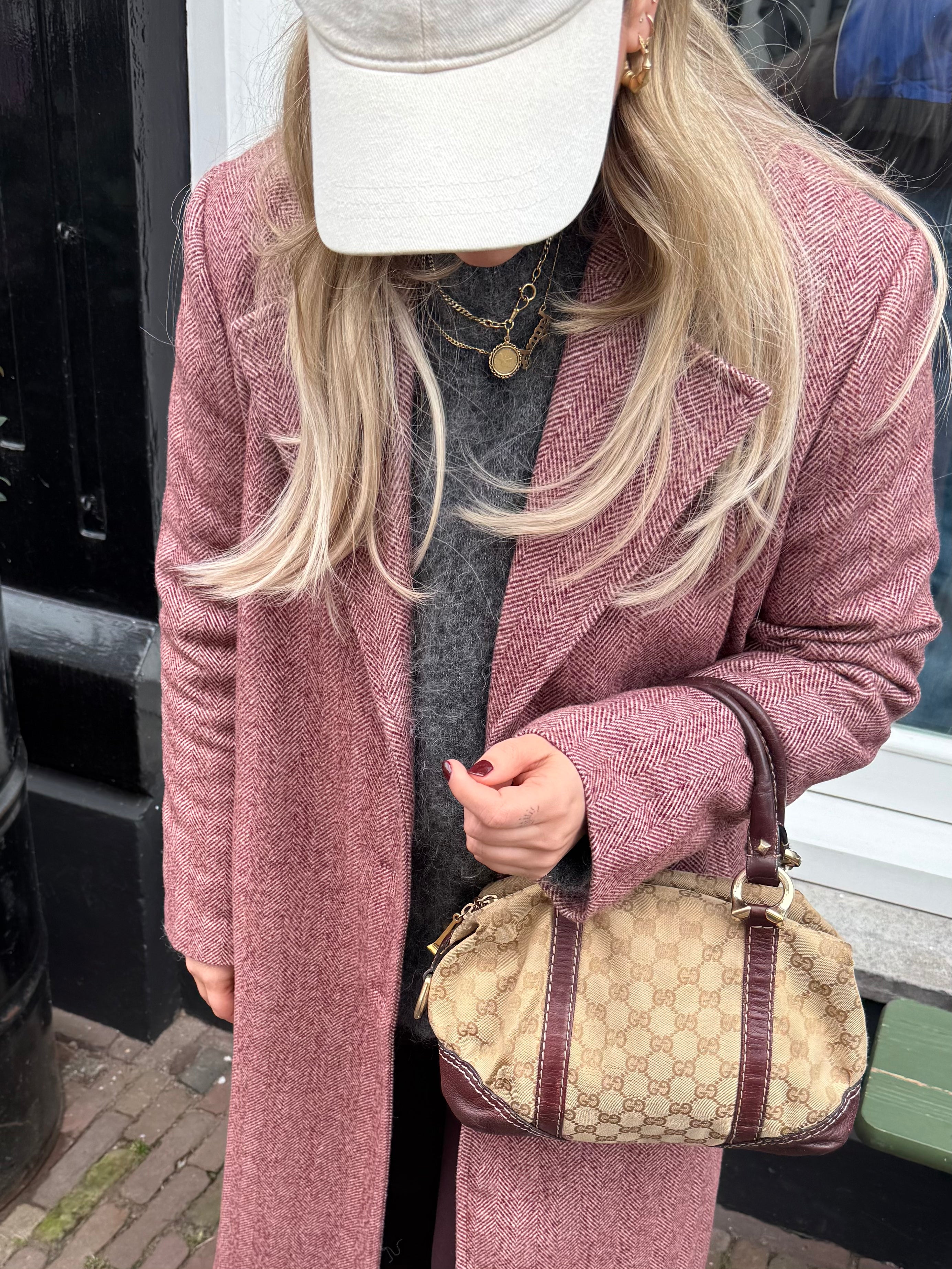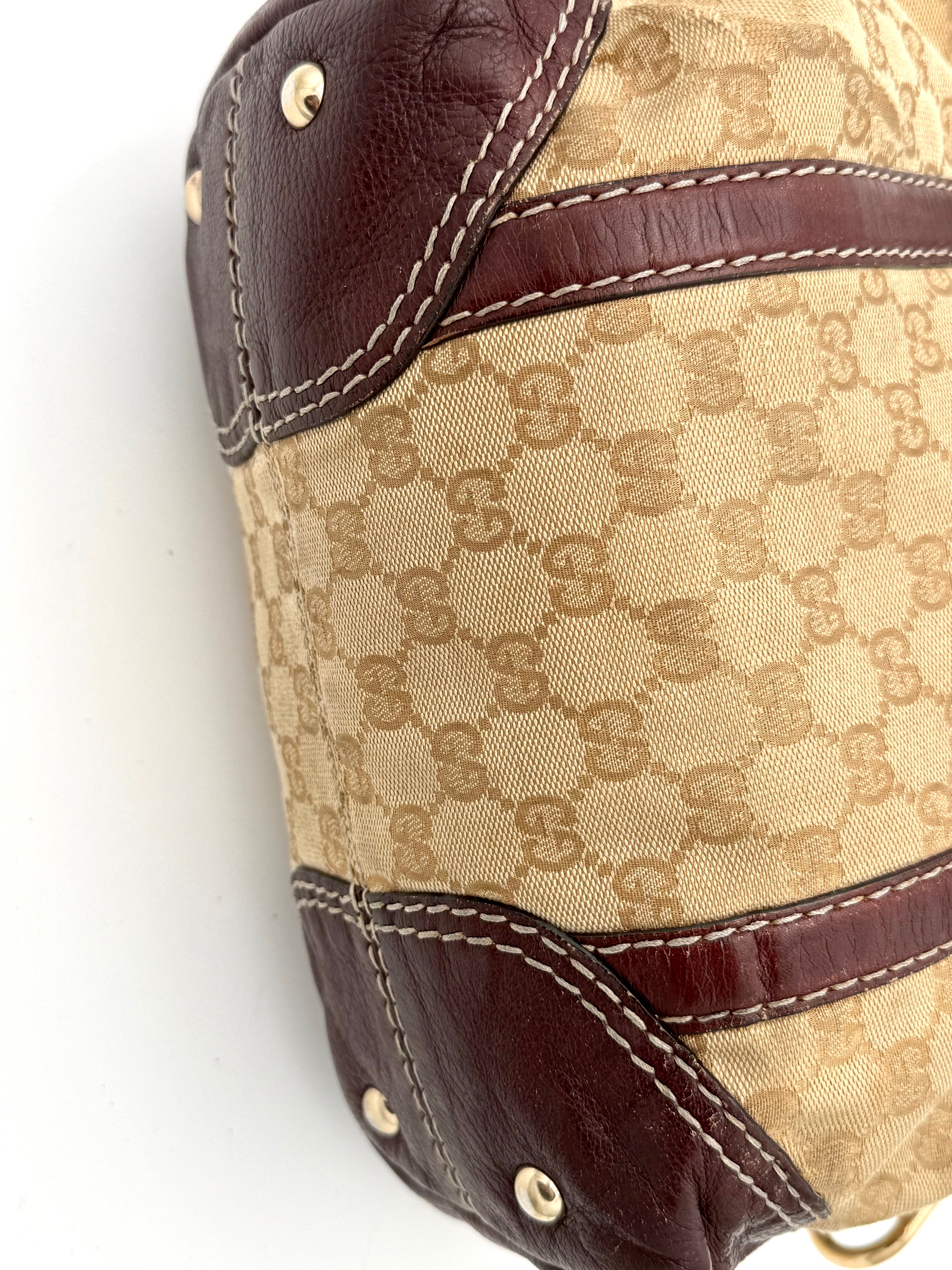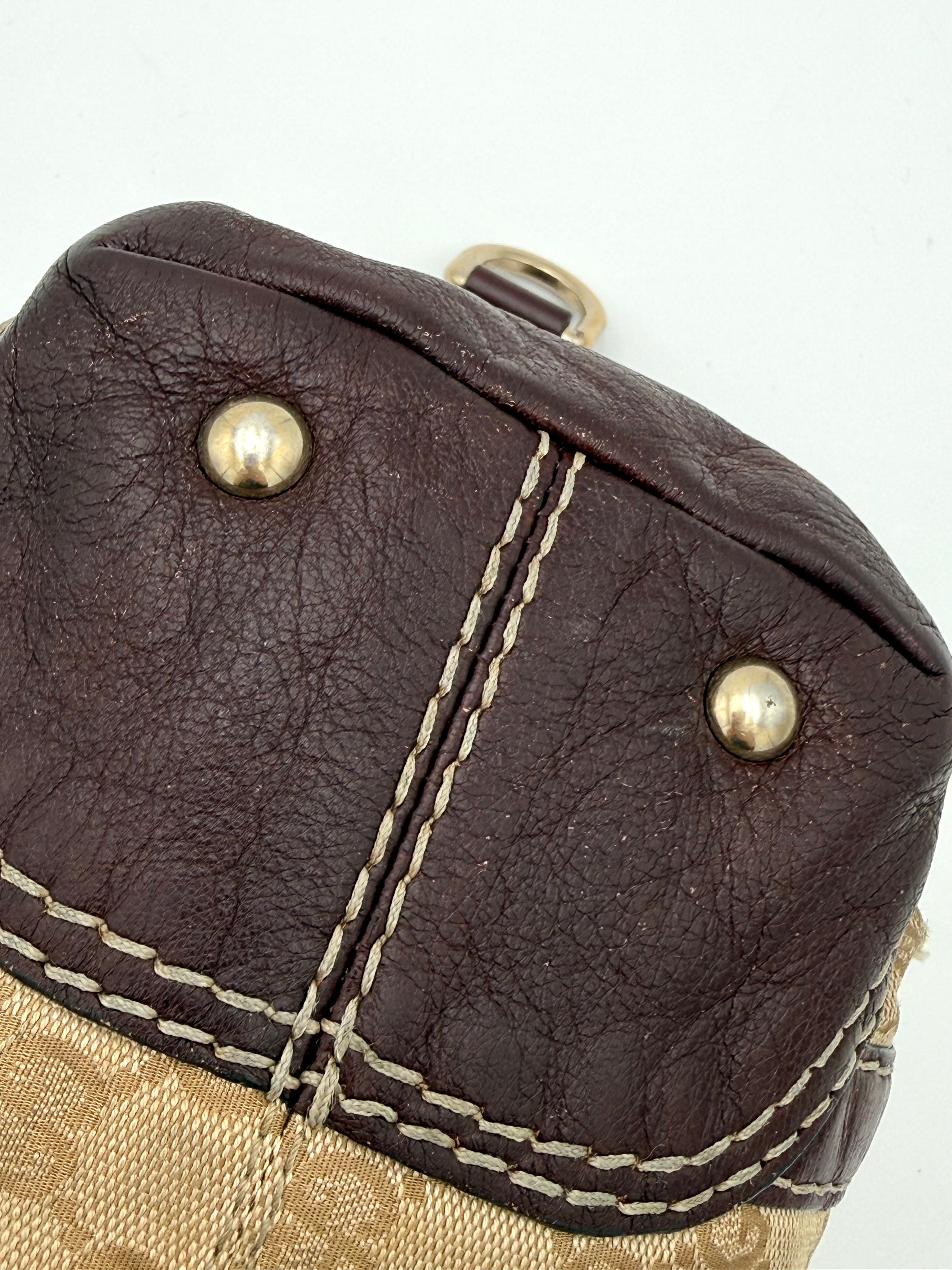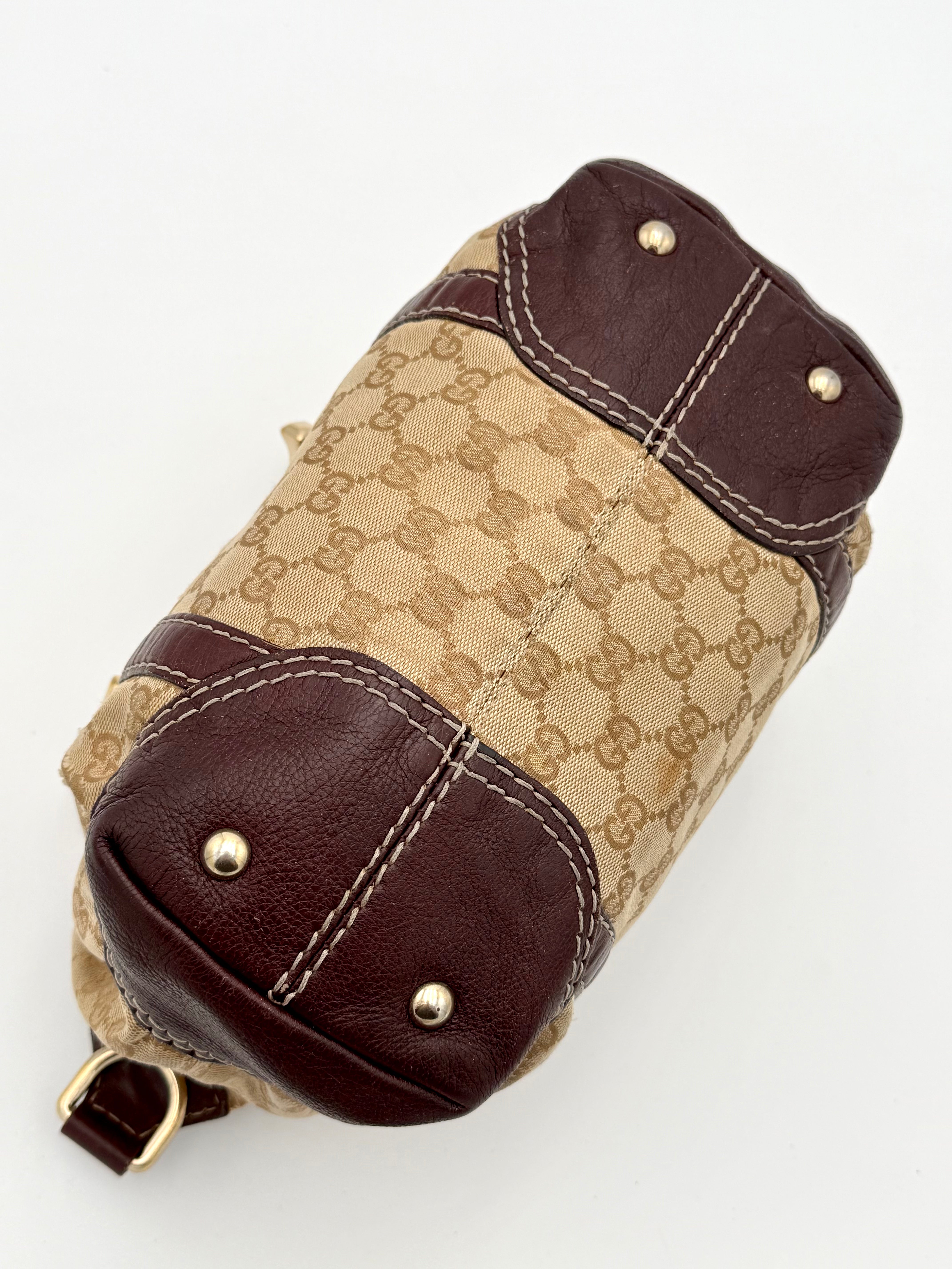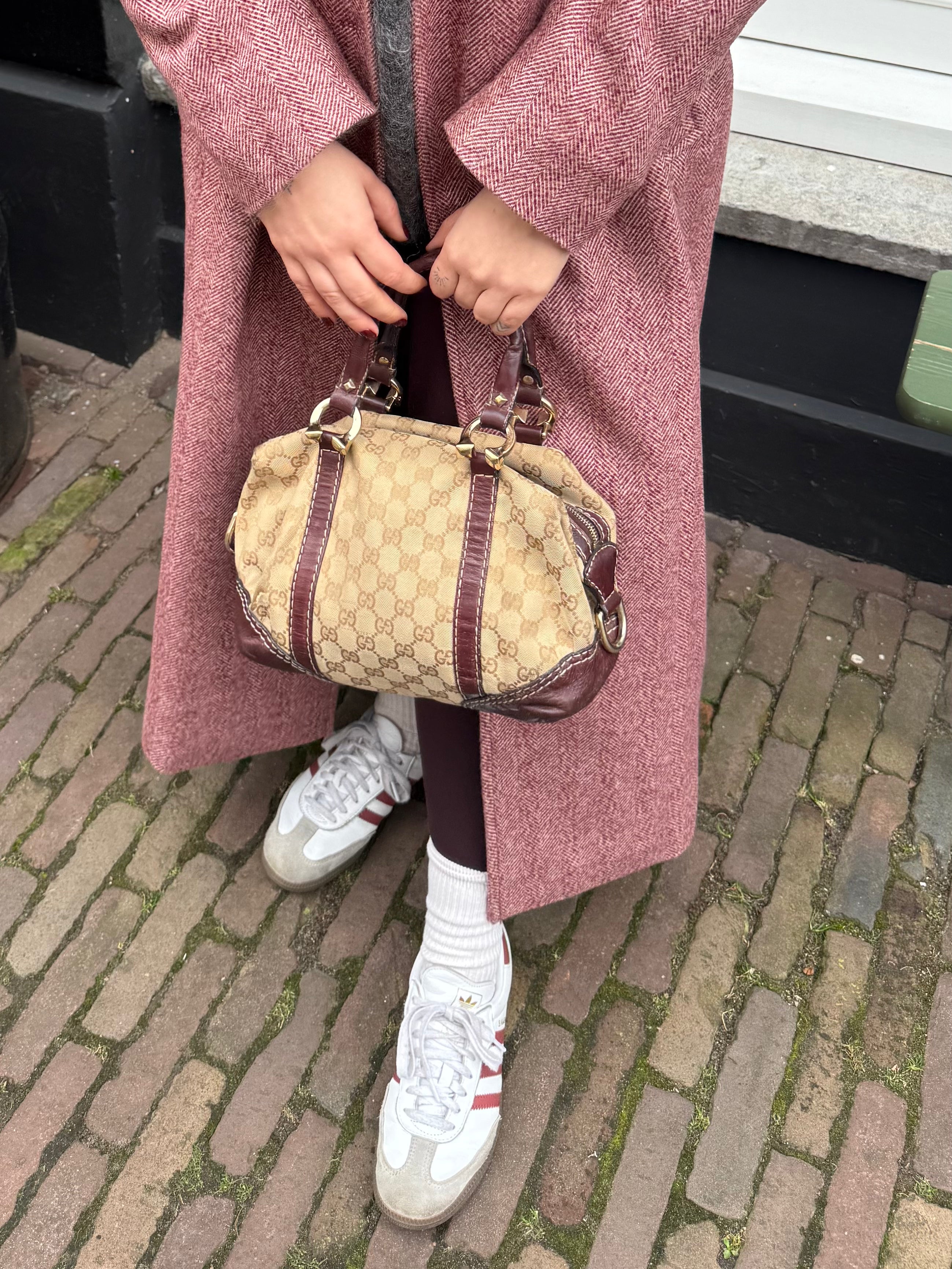 Tweedehands GUCCI bag in een beige kleur. De tas is van canvas met bordeaux leren hengsels en gouden hardware. De tas heeft één binnenvakje met rits en twee steekvakjes. Het item verkeert in een vintage staat, met algemene gebruikssporen. De tas wordt geleverd in onze mooie Moon flower dustbag.
