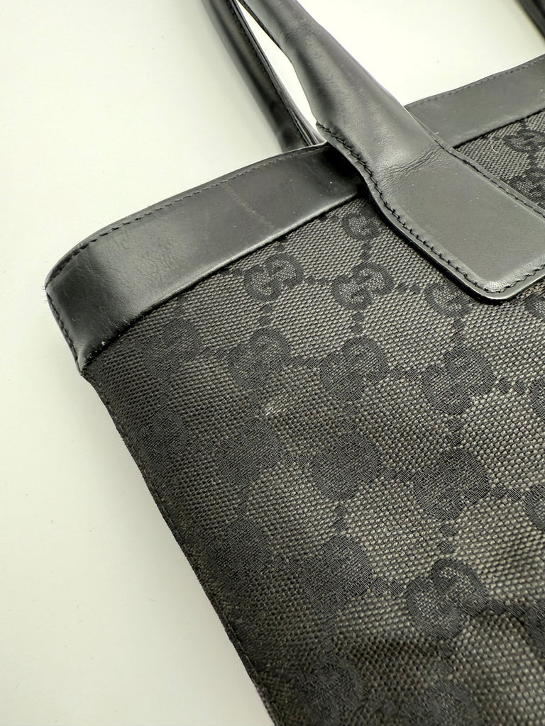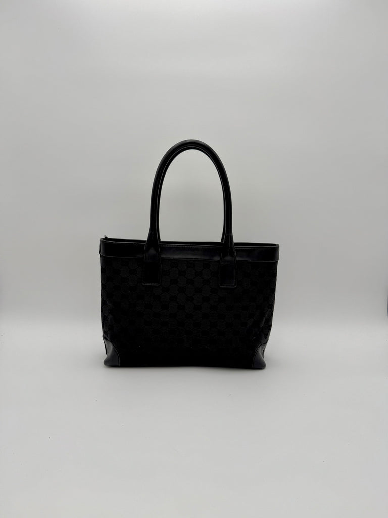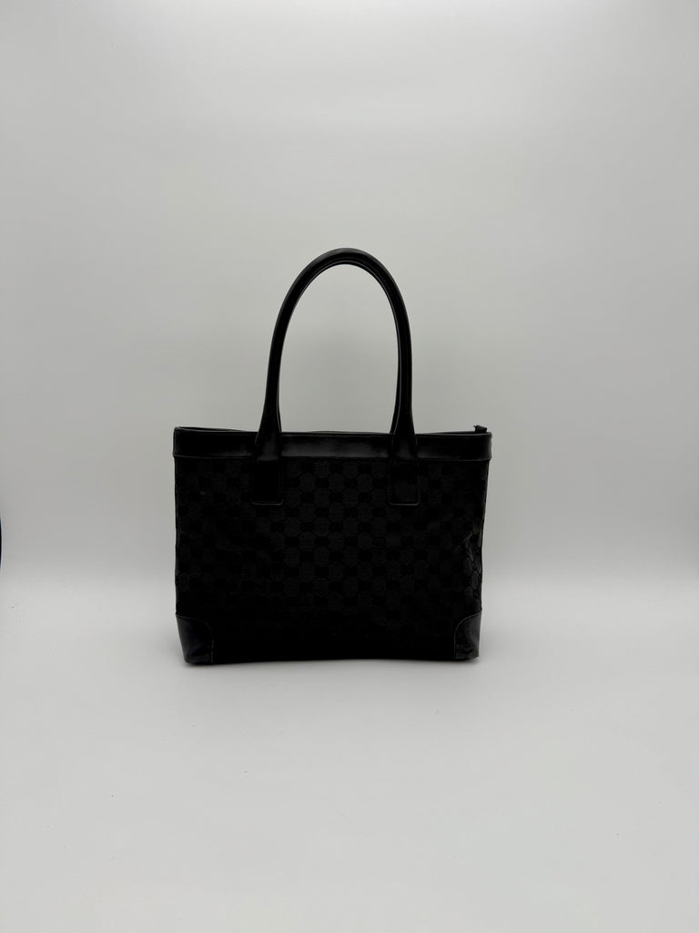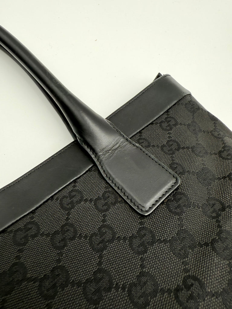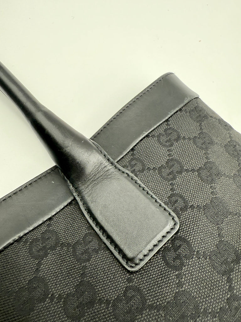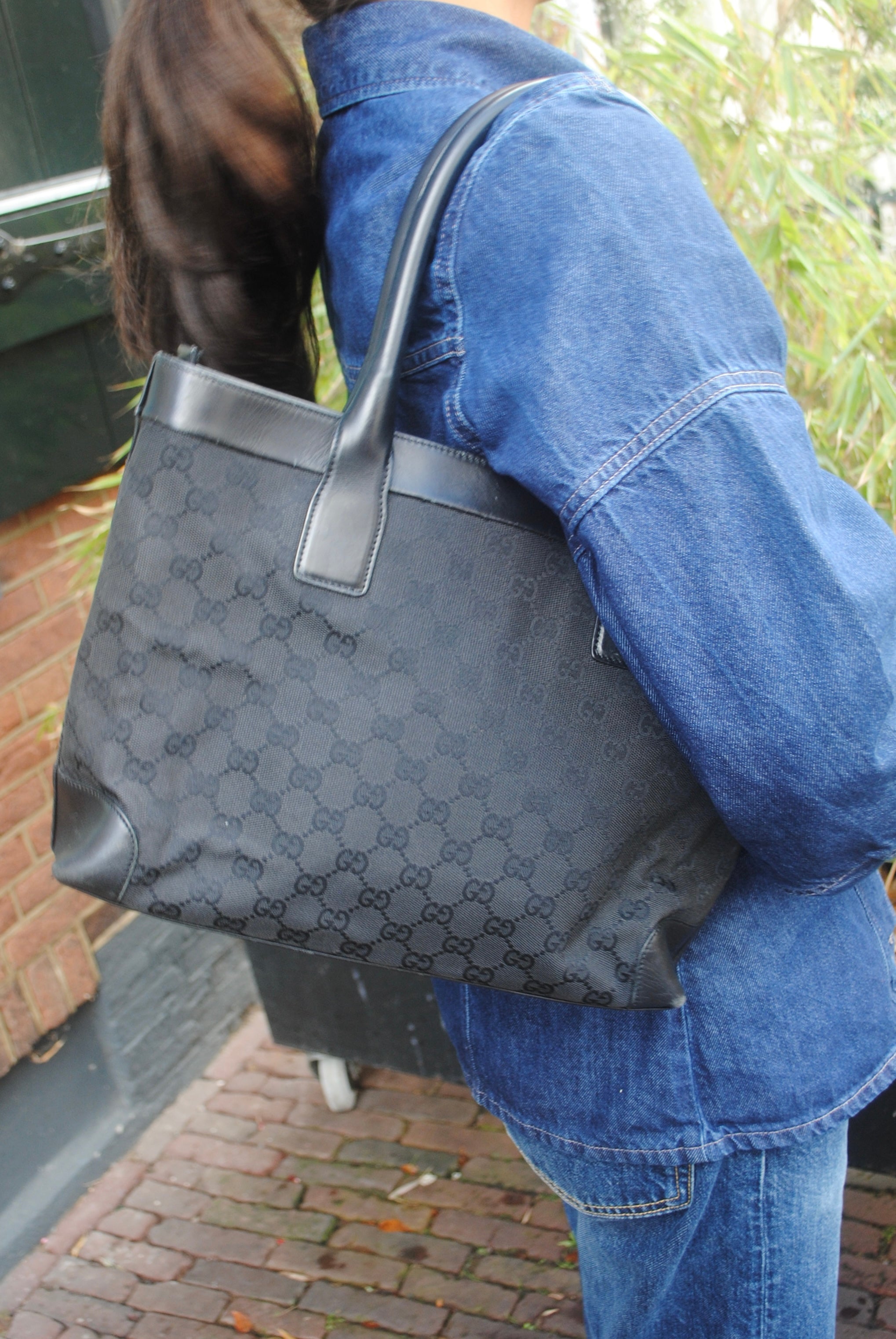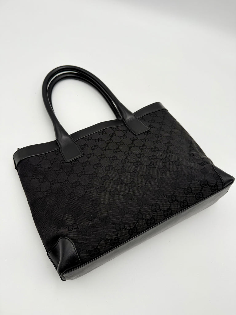 Tweedehands GUCCI Supreme canvas tote bag. De tas is van zwart canvas met een mooi leren hengsels. De tas sluit met een rits en beschikt over een binnenvak met rits. Het item verkeert in een mooie vintage staat, met algemene gebruikssporen. De tas wordt geleverd in onze mooie Moon flower dustbag.