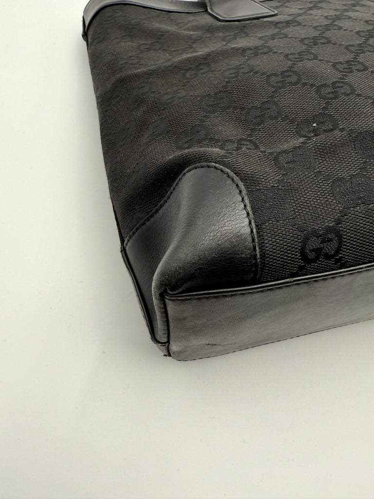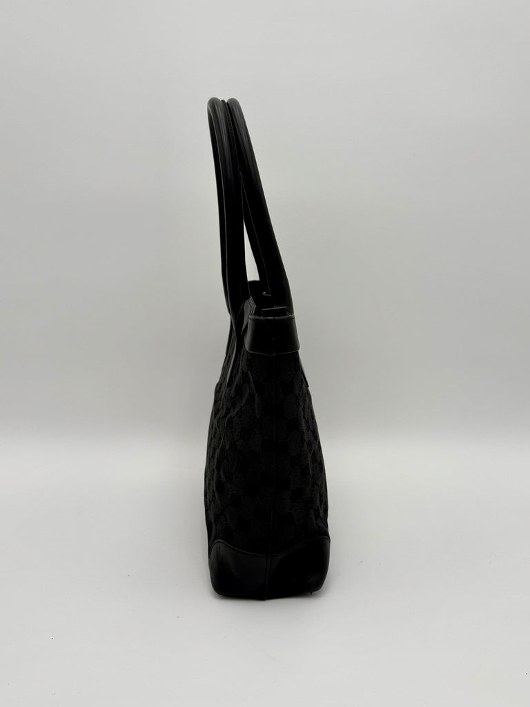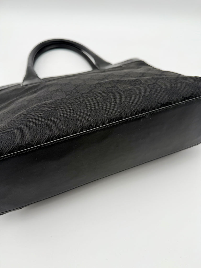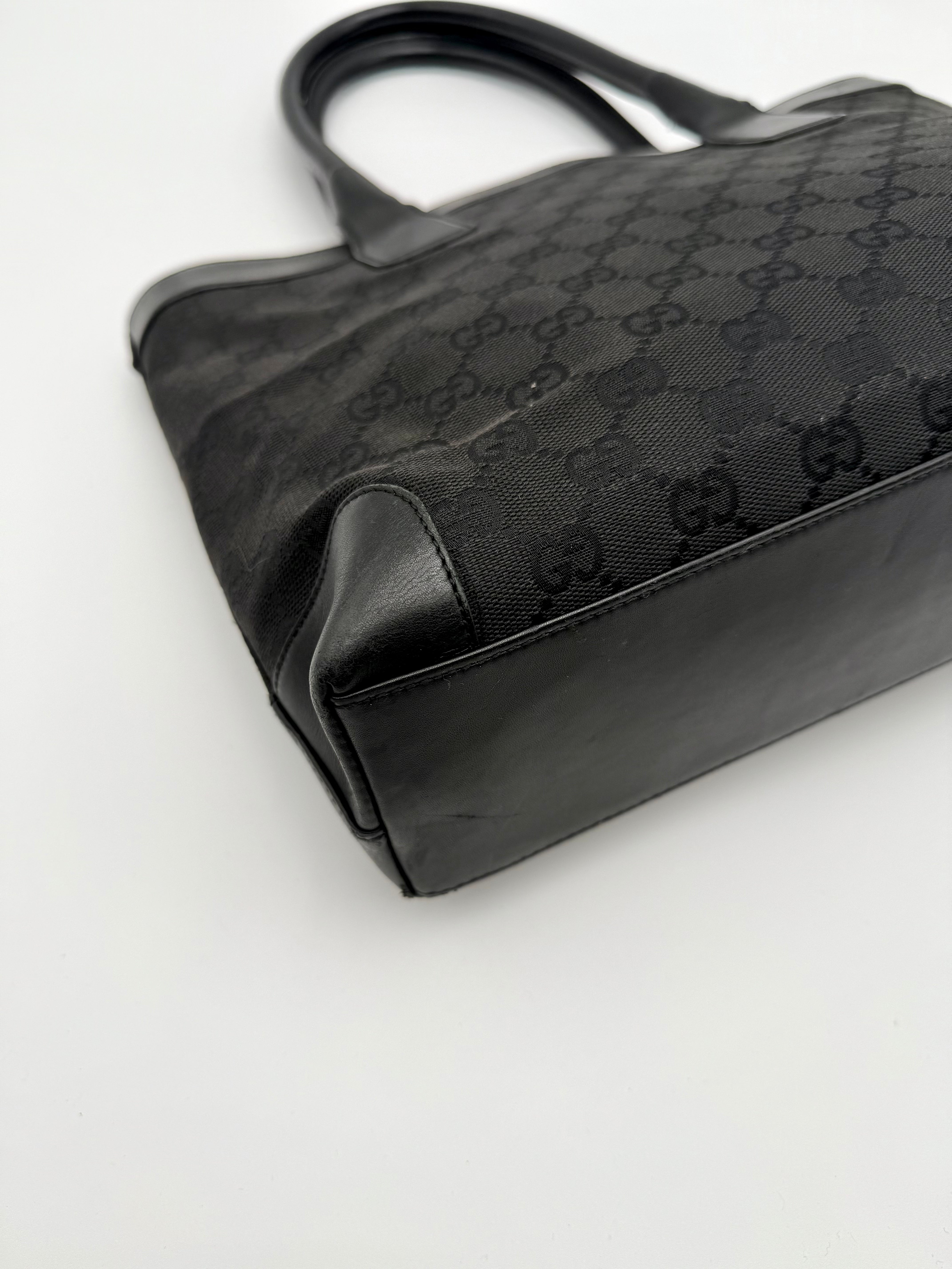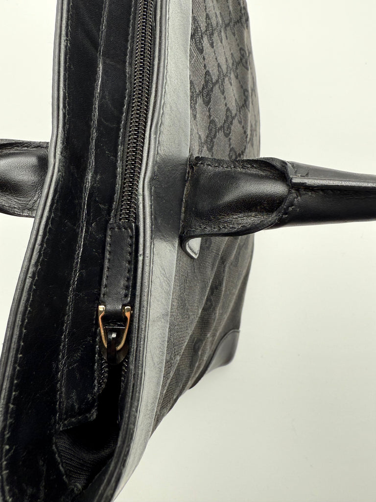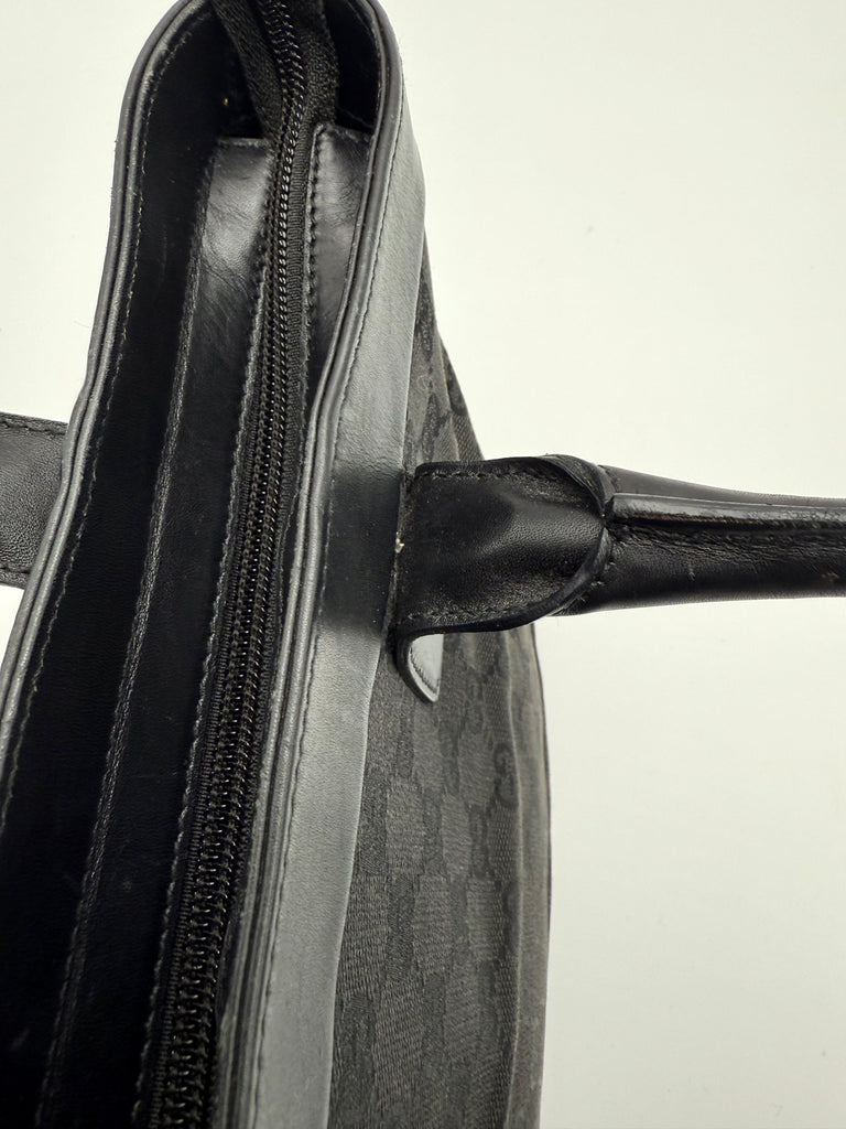 Tweedehands GUCCI Supreme canvas tote bag. De tas is van zwart canvas met een mooi leren hengsels. De tas sluit met een rits en beschikt over een binnenvak met rits. Het item verkeert in een mooie vintage staat, met algemene gebruikssporen. De tas wordt geleverd in onze mooie Moon flower dustbag.