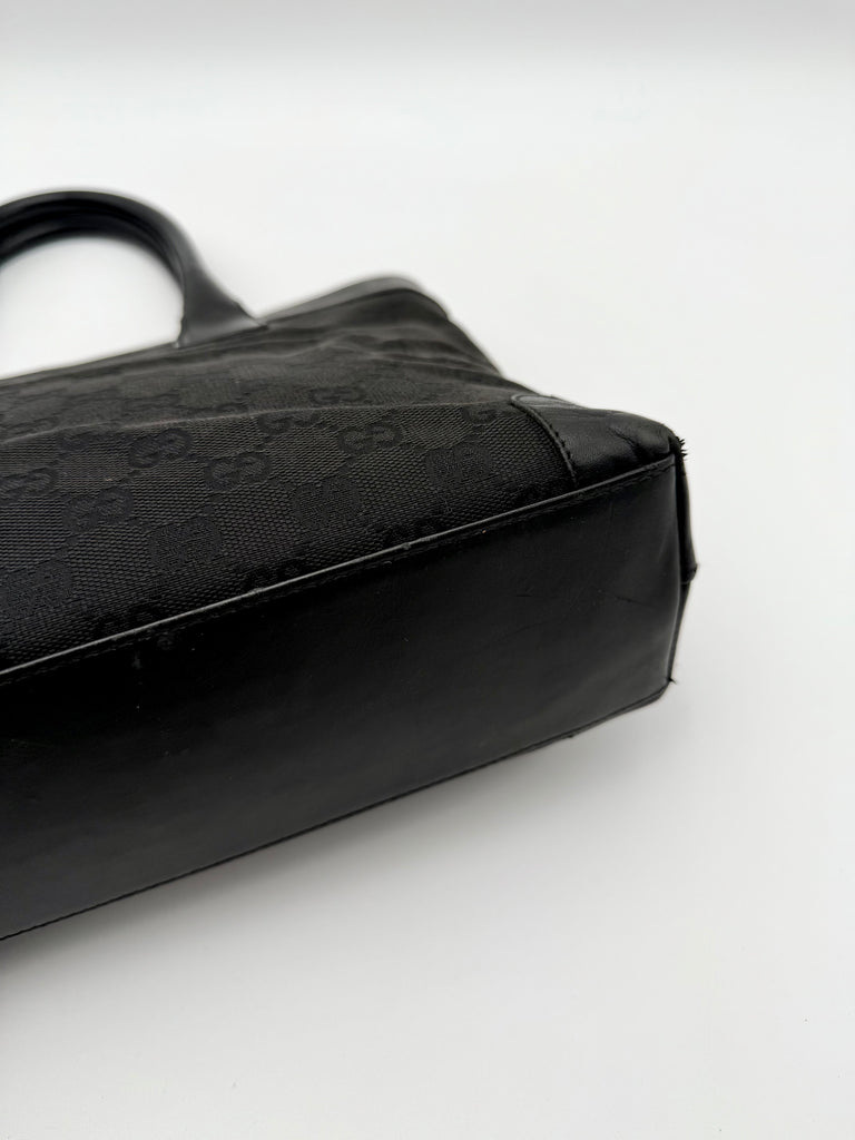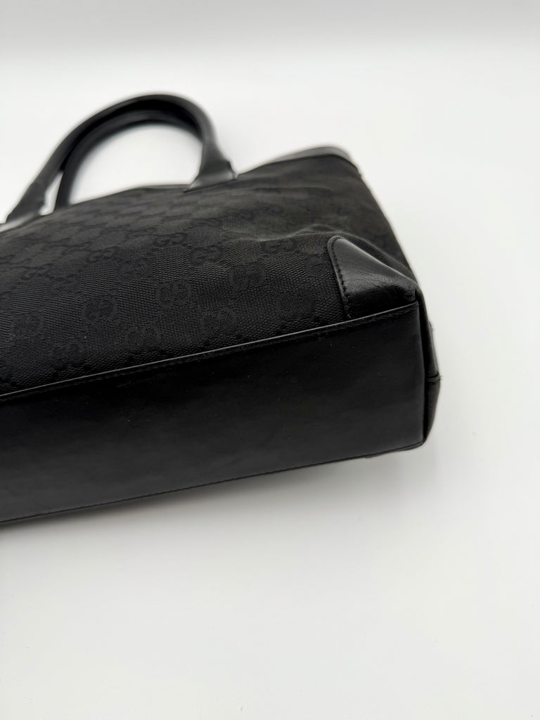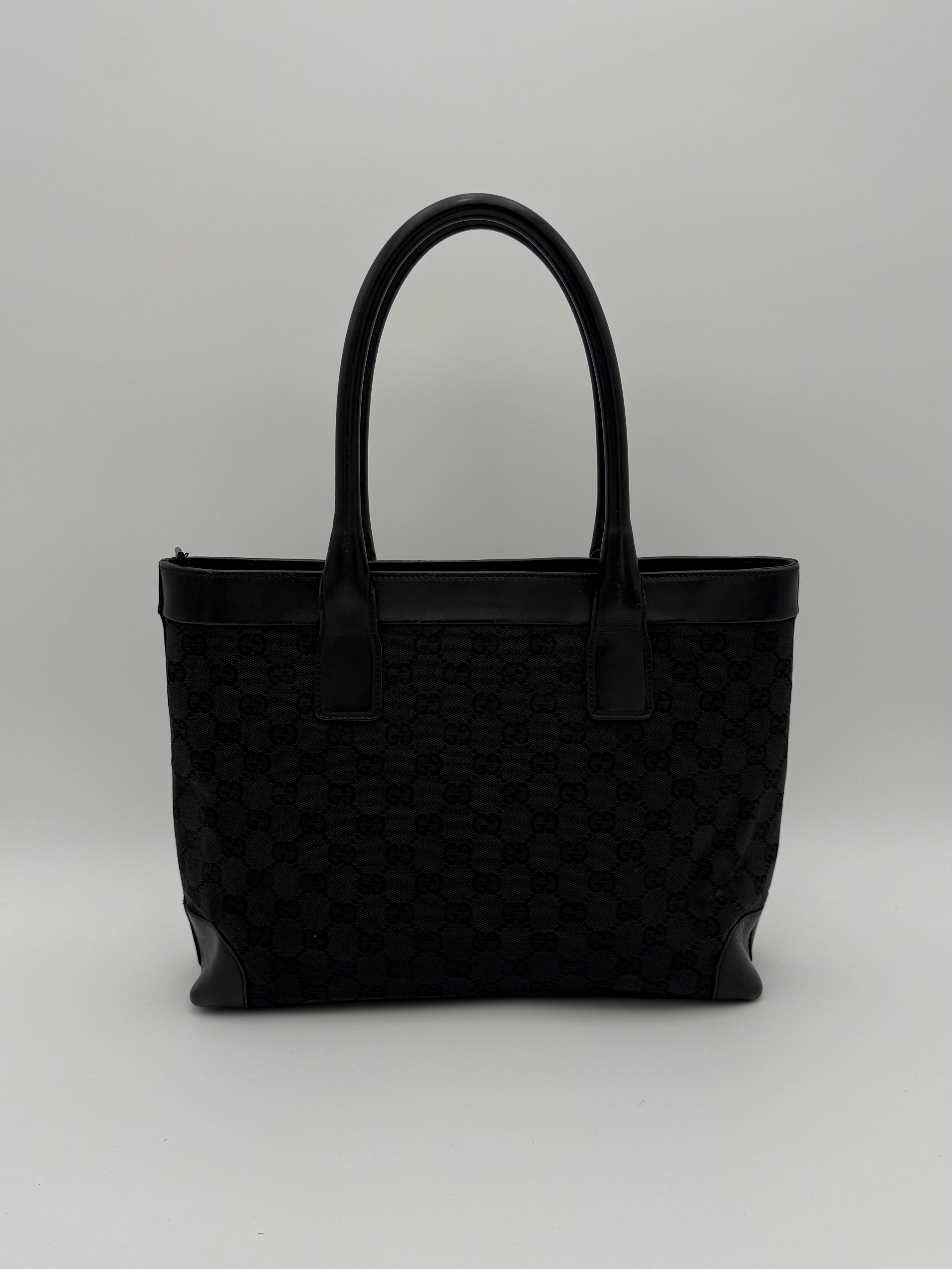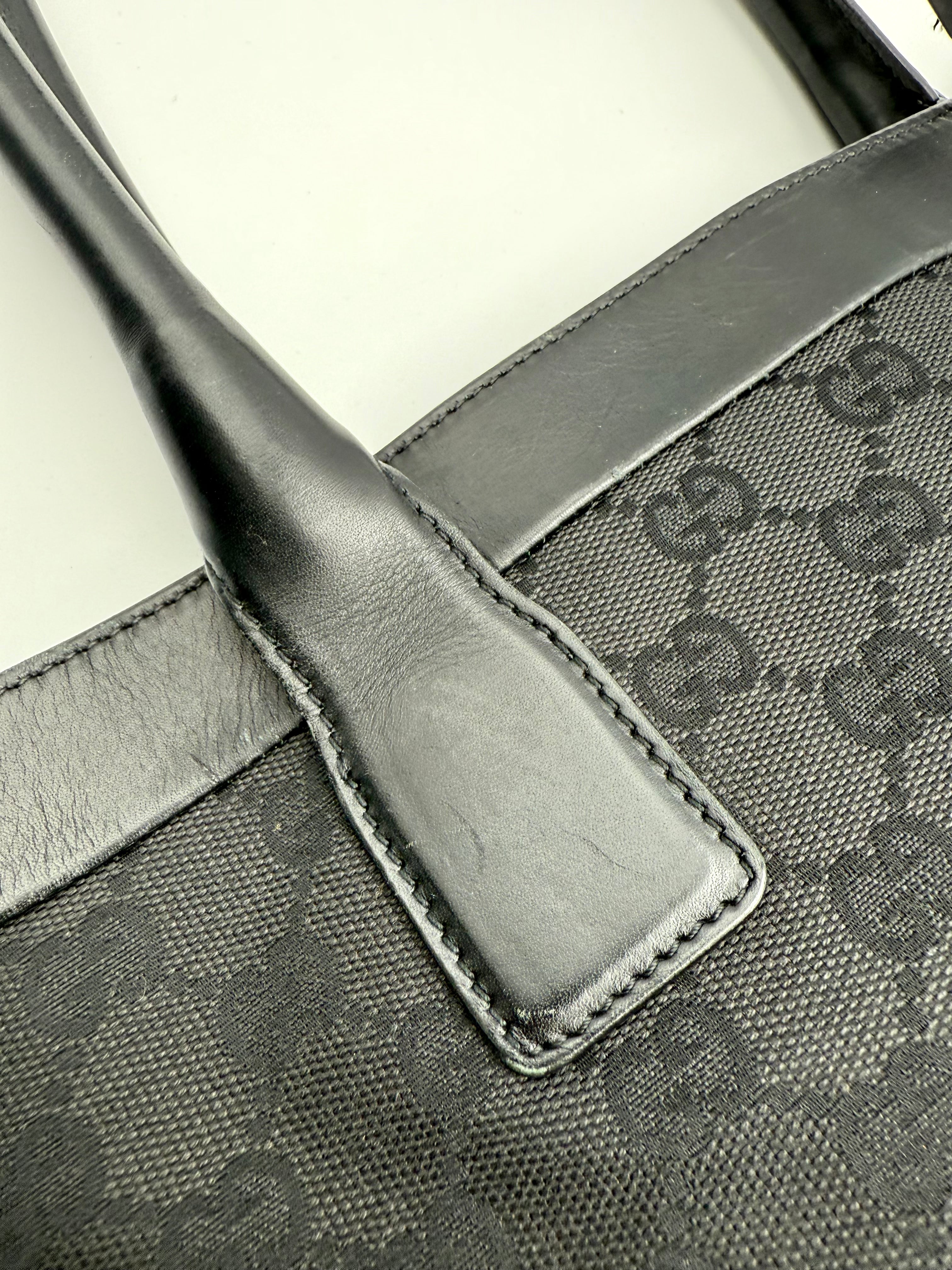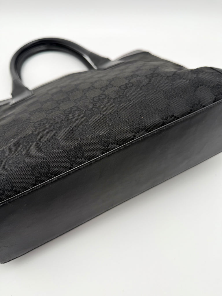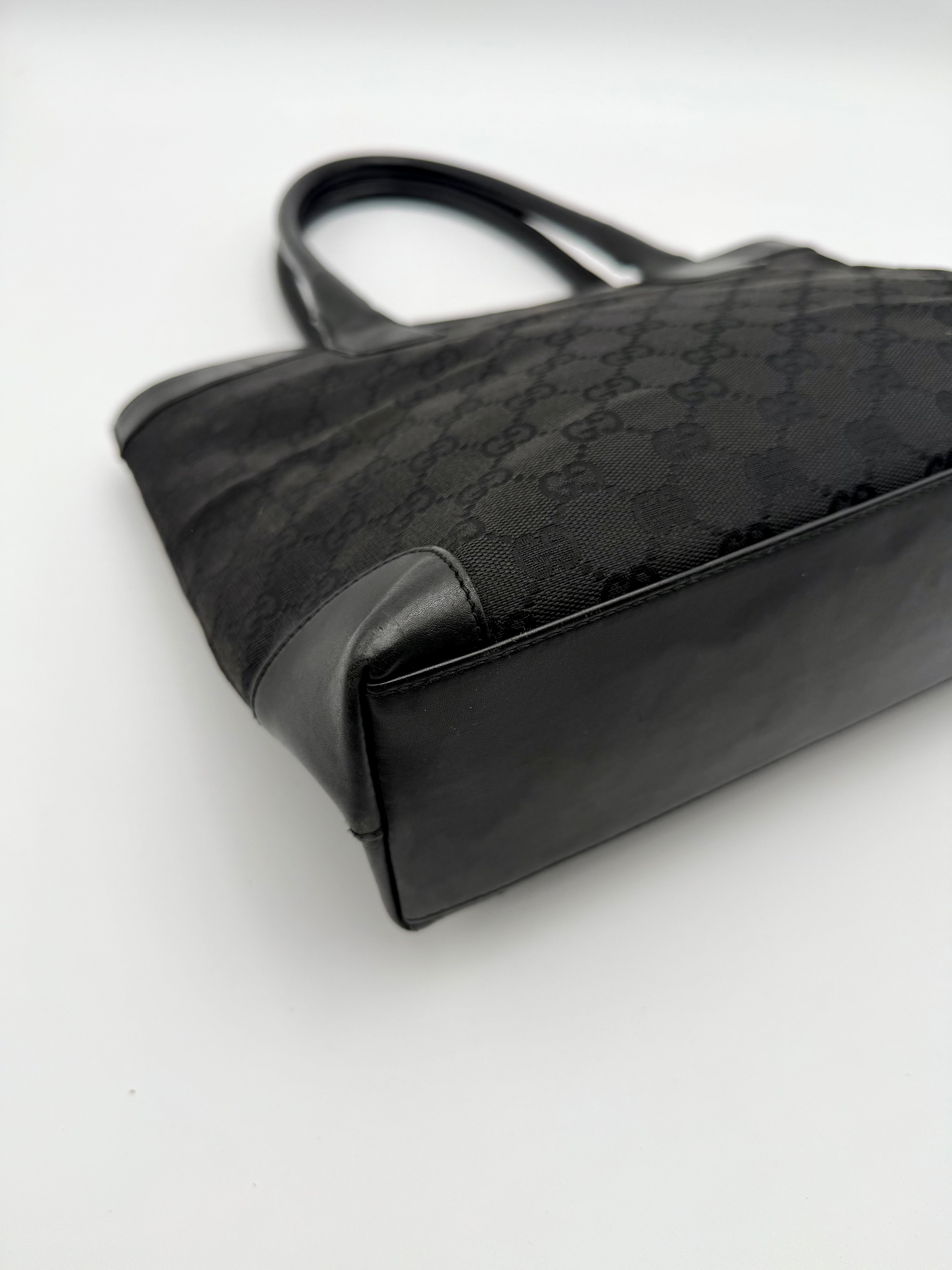 Tweedehands GUCCI Supreme canvas tote bag. De tas is van zwart canvas met een mooi leren hengsels. De tas sluit met een rits en beschikt over een binnenvak met rits. Het item verkeert in een mooie vintage staat, met algemene gebruikssporen. De tas wordt geleverd in onze mooie Moon flower dustbag.