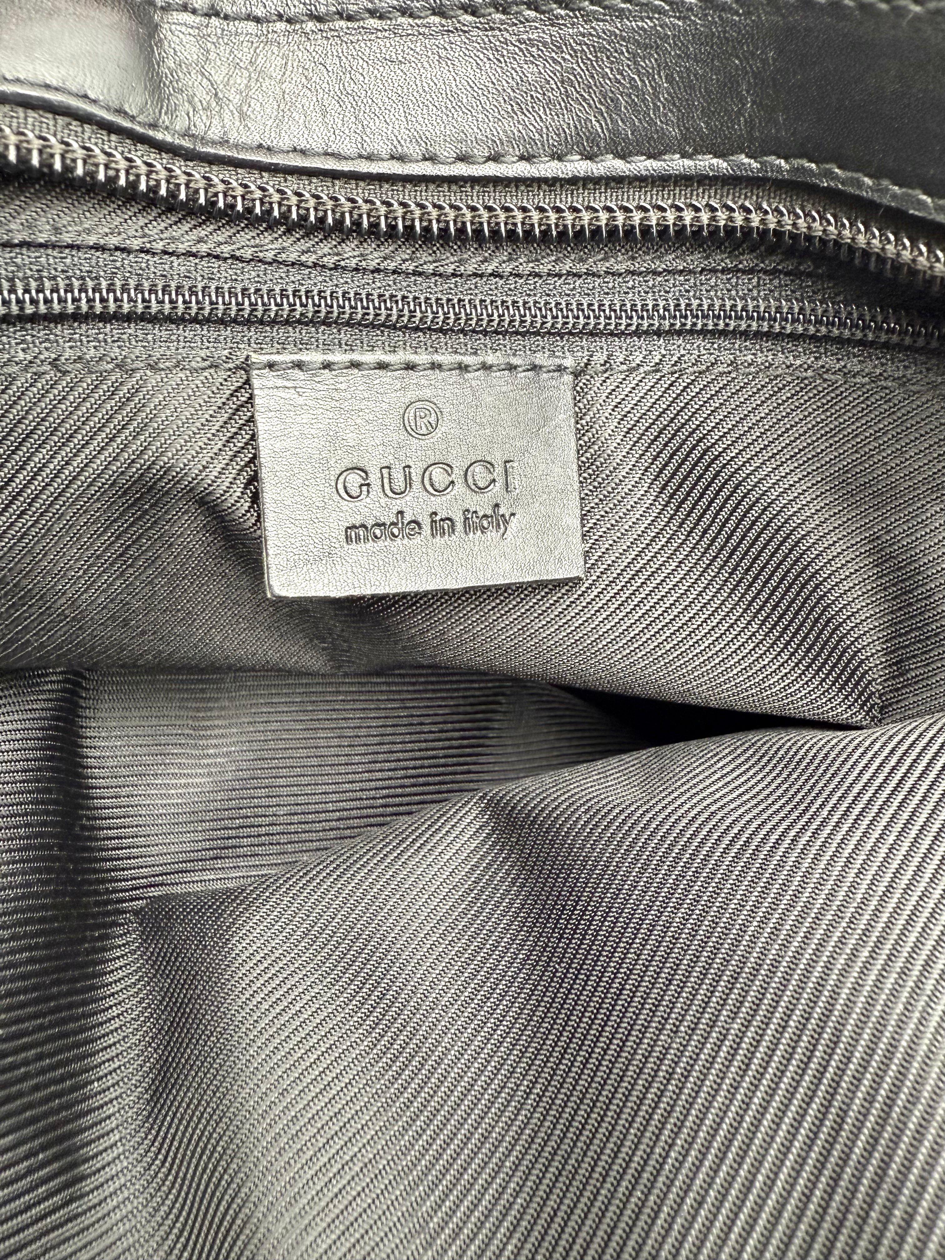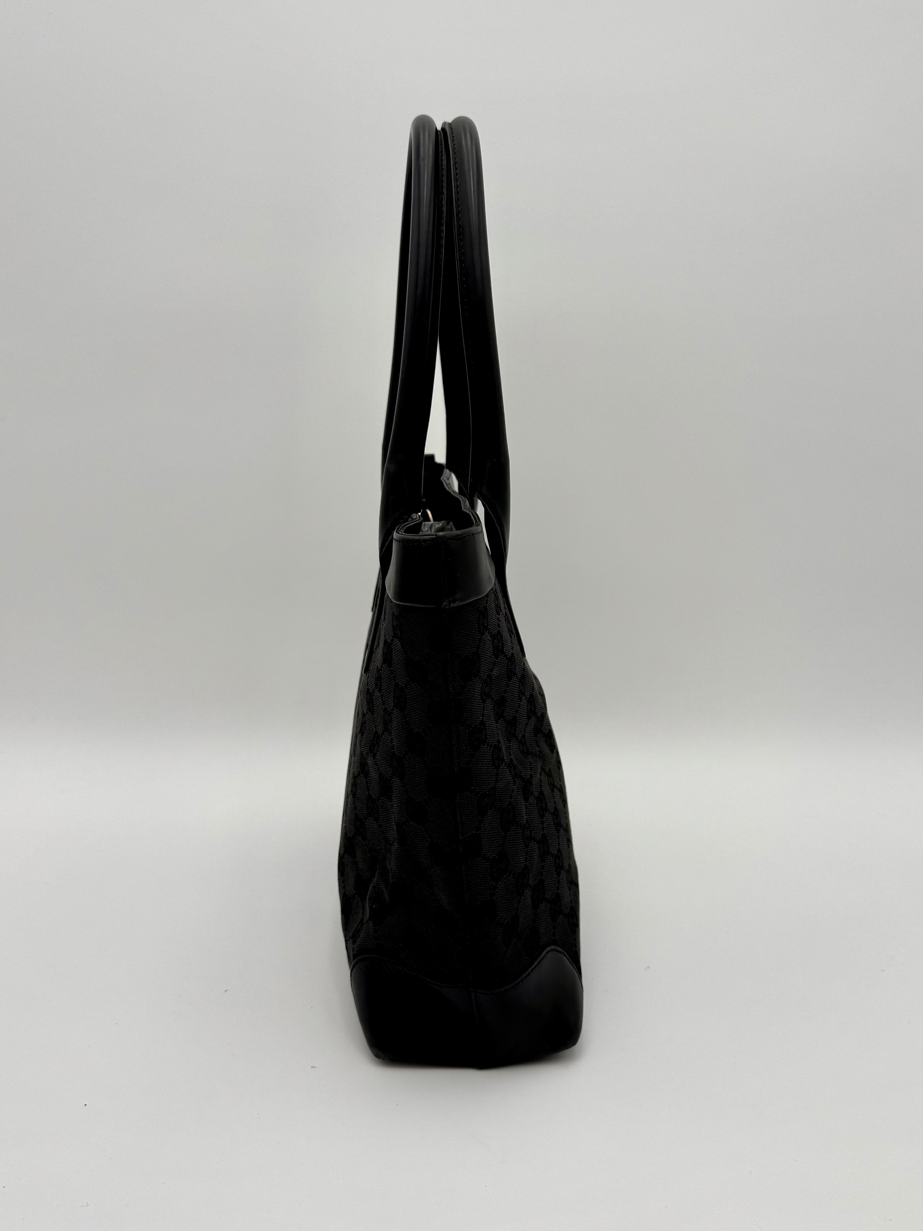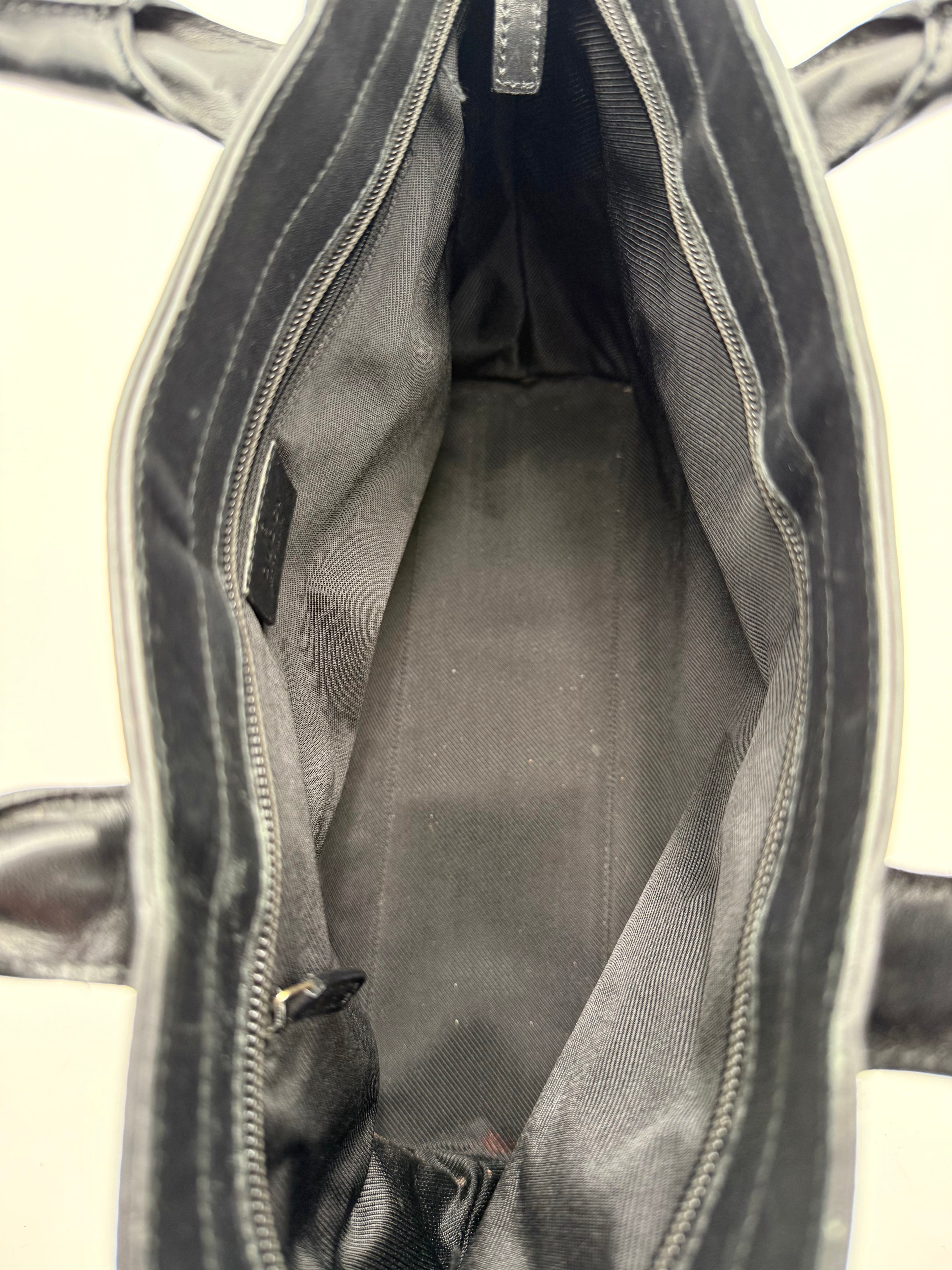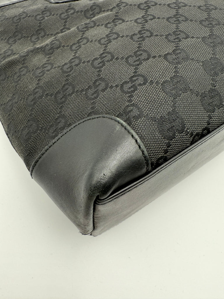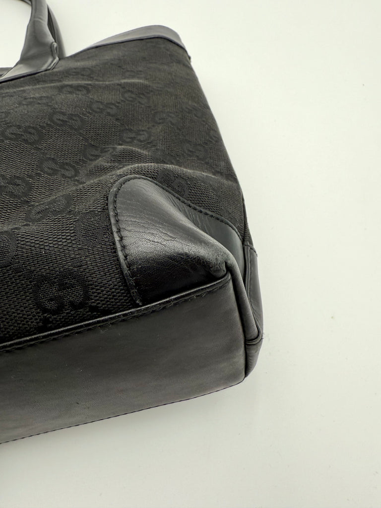 Tweedehands GUCCI Supreme canvas tote bag. De tas is van zwart canvas met een mooi leren hengsels. De tas sluit met een rits en beschikt over een binnenvak met rits. Het item verkeert in een mooie vintage staat, met algemene gebruikssporen. De tas wordt geleverd in onze mooie Moon flower dustbag.
