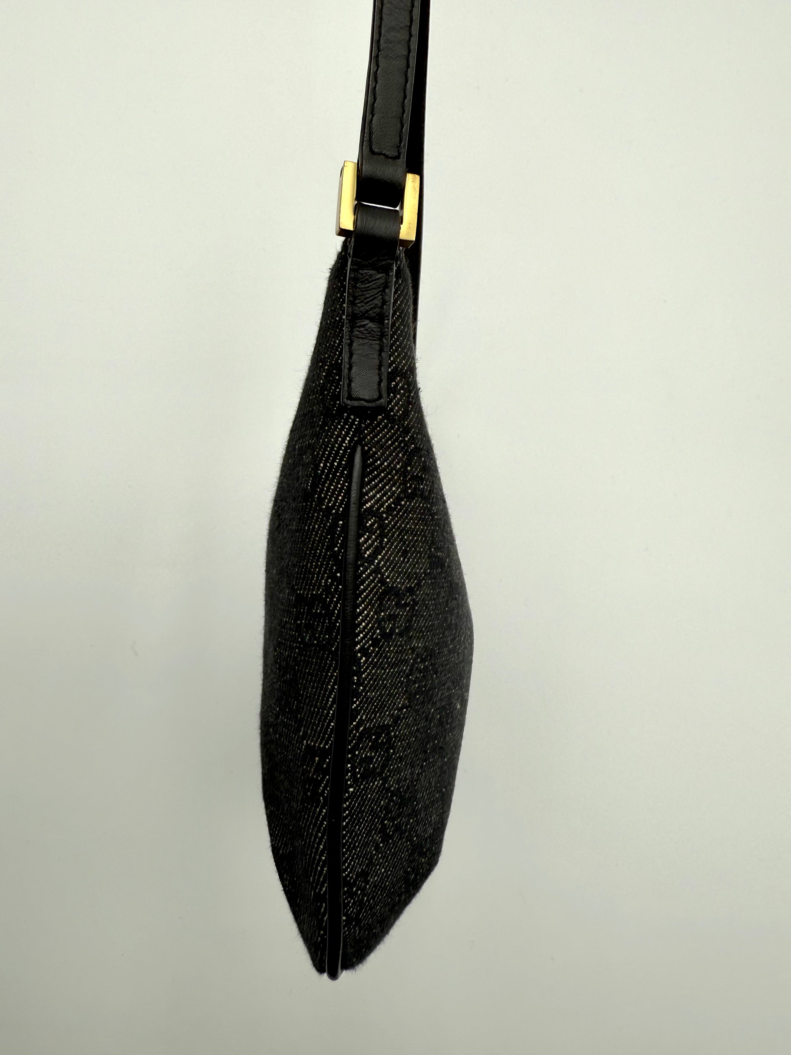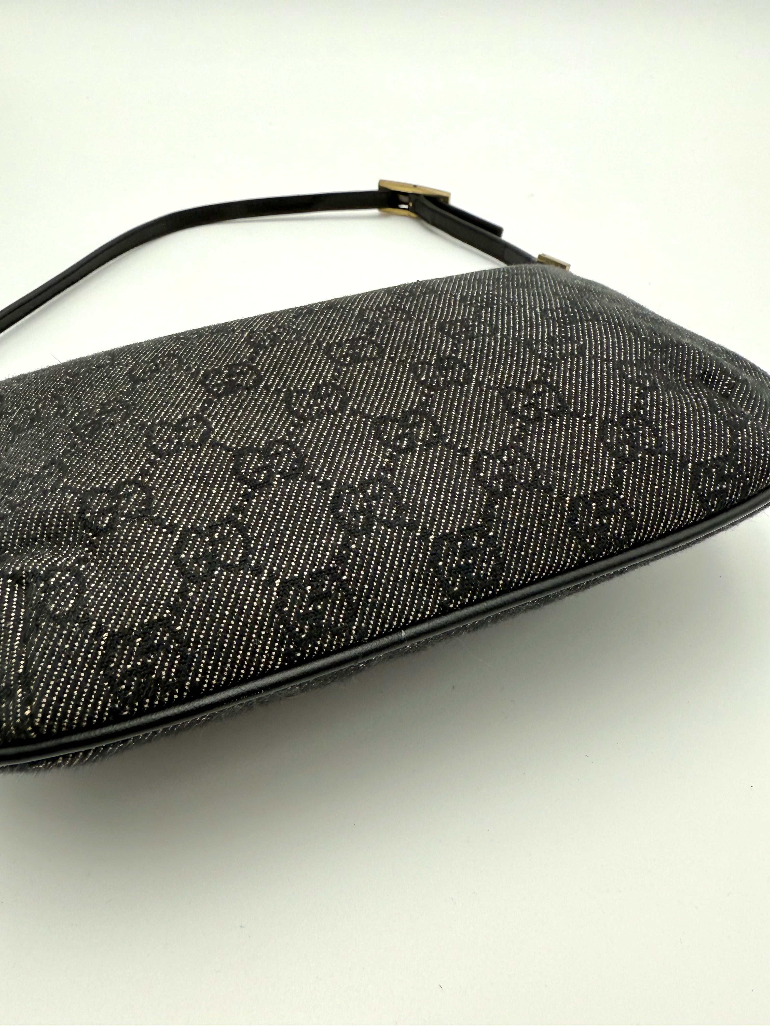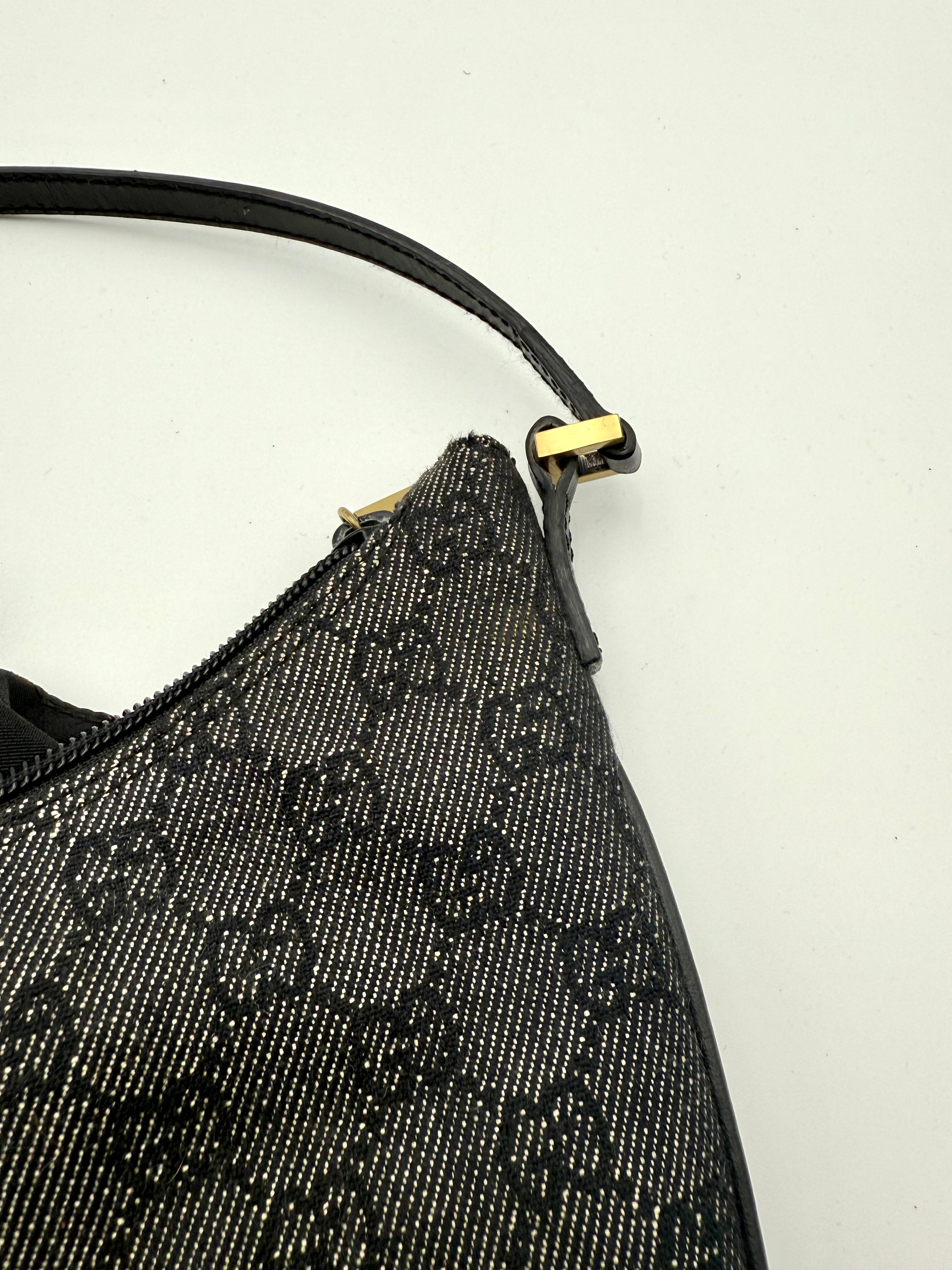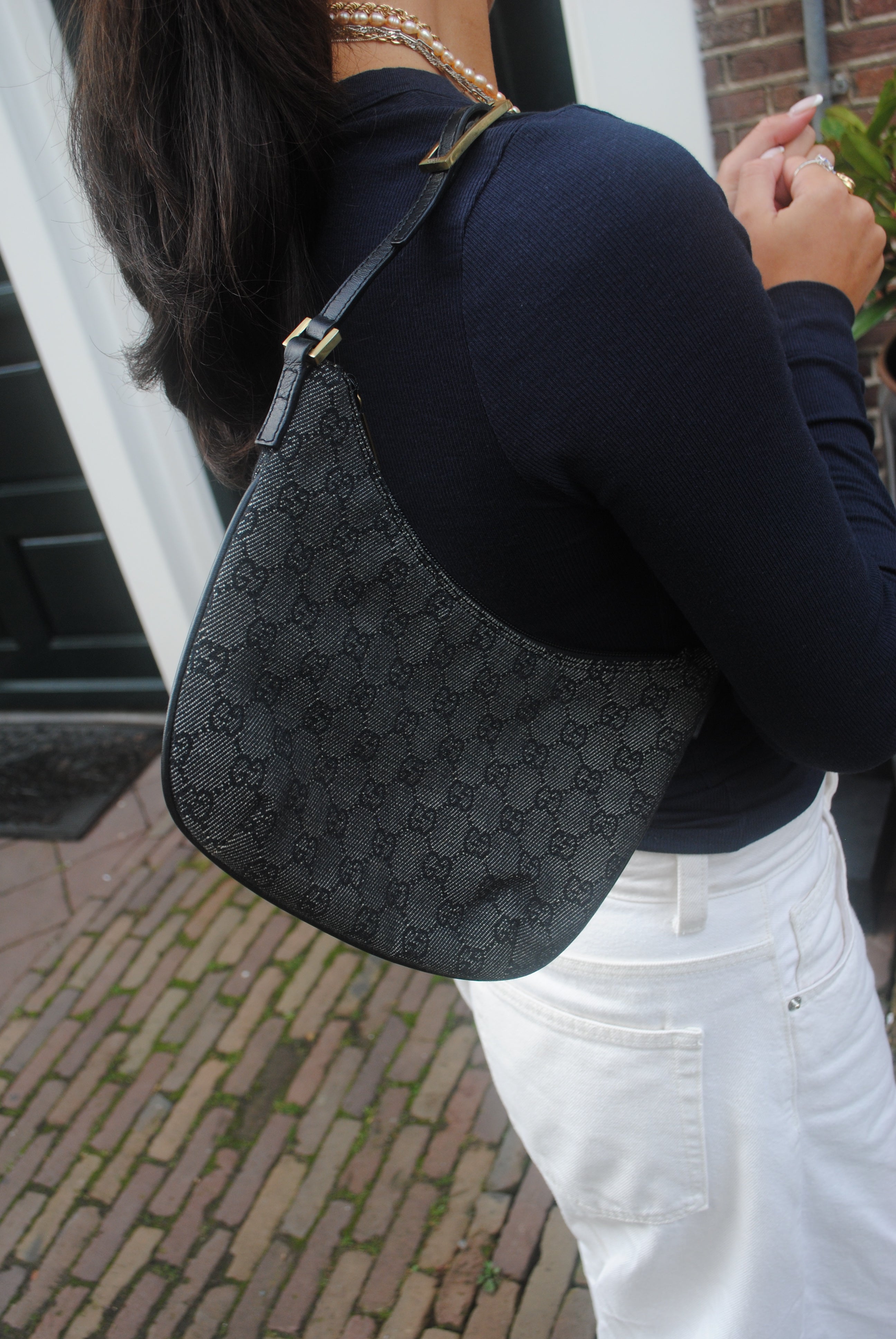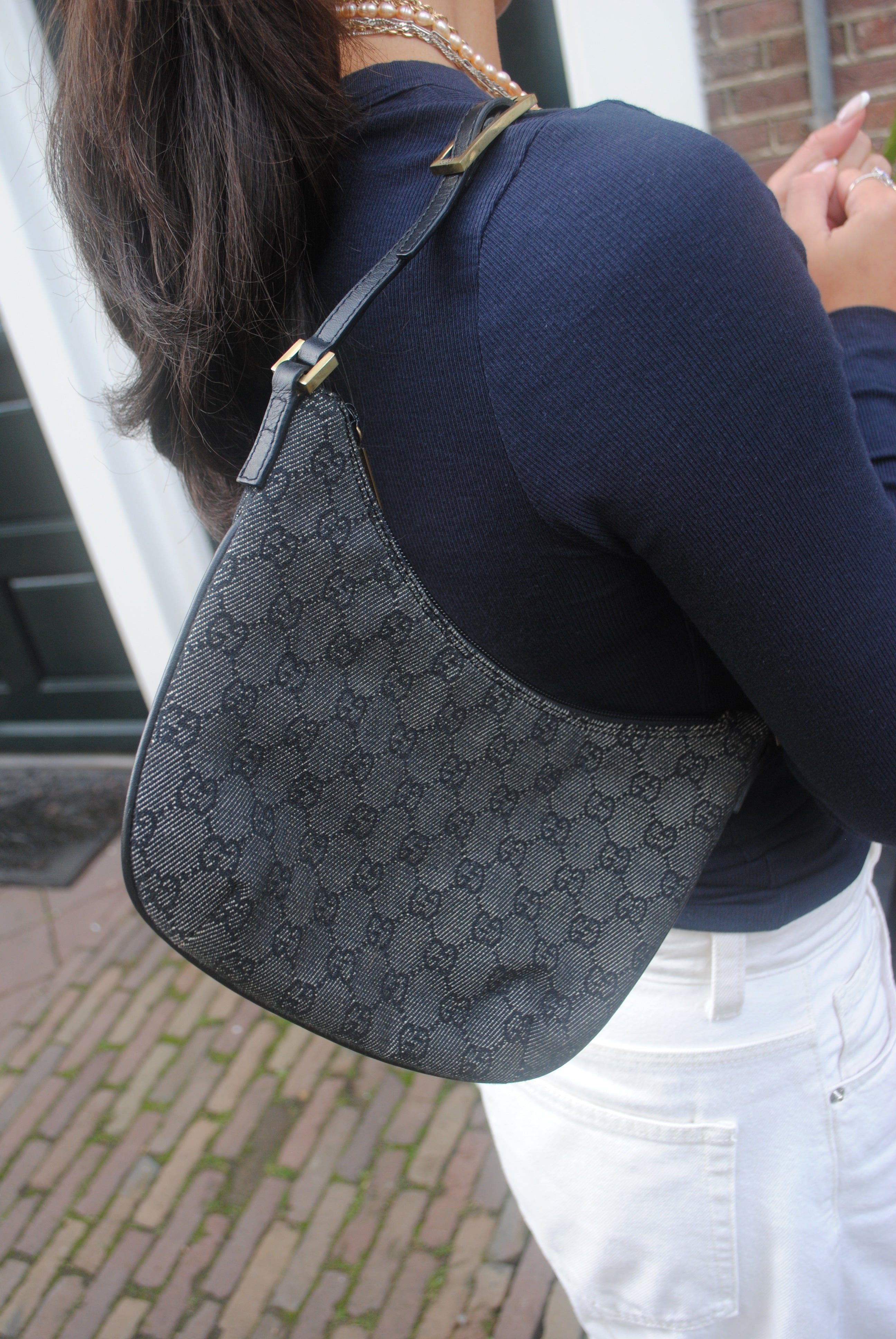 Tweedehands GUCCI canvas bag in een blauw/grijze denim kleur. De tas is van canvas met een leren hengsel en met gouden hardware. De tas beschikt over één binnenvakje. Het item verkeert in een zeer goede vintage staat, met algemene gebruikssporen. De tas wordt geleverd in onze mooie Moon flower dustbag.