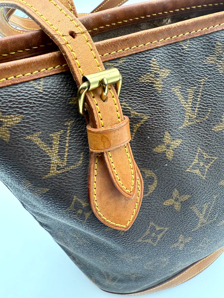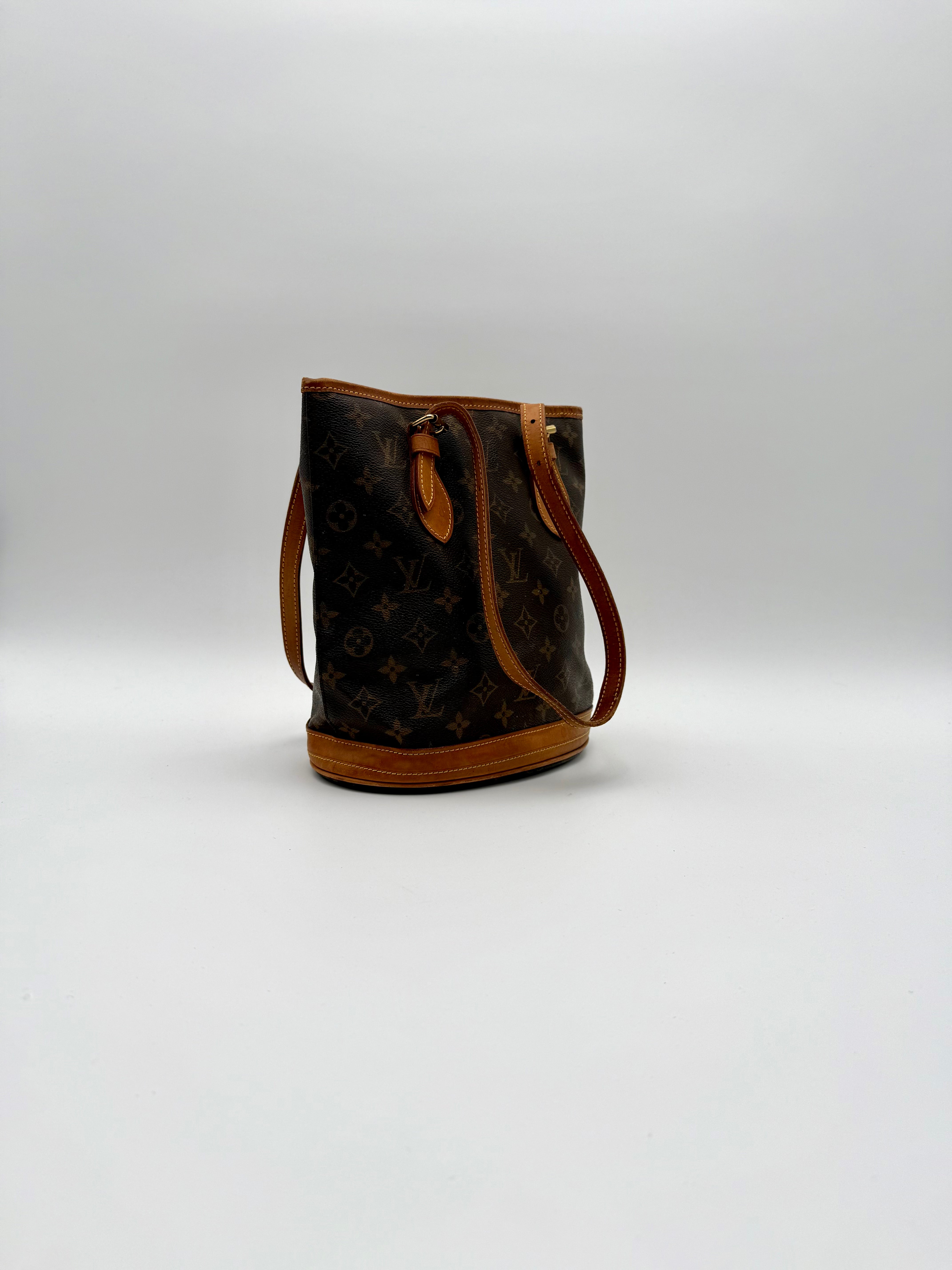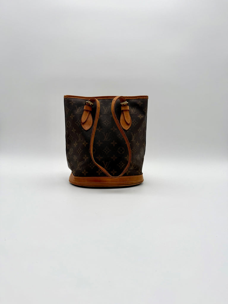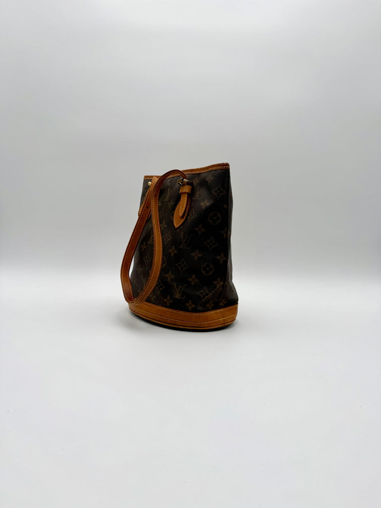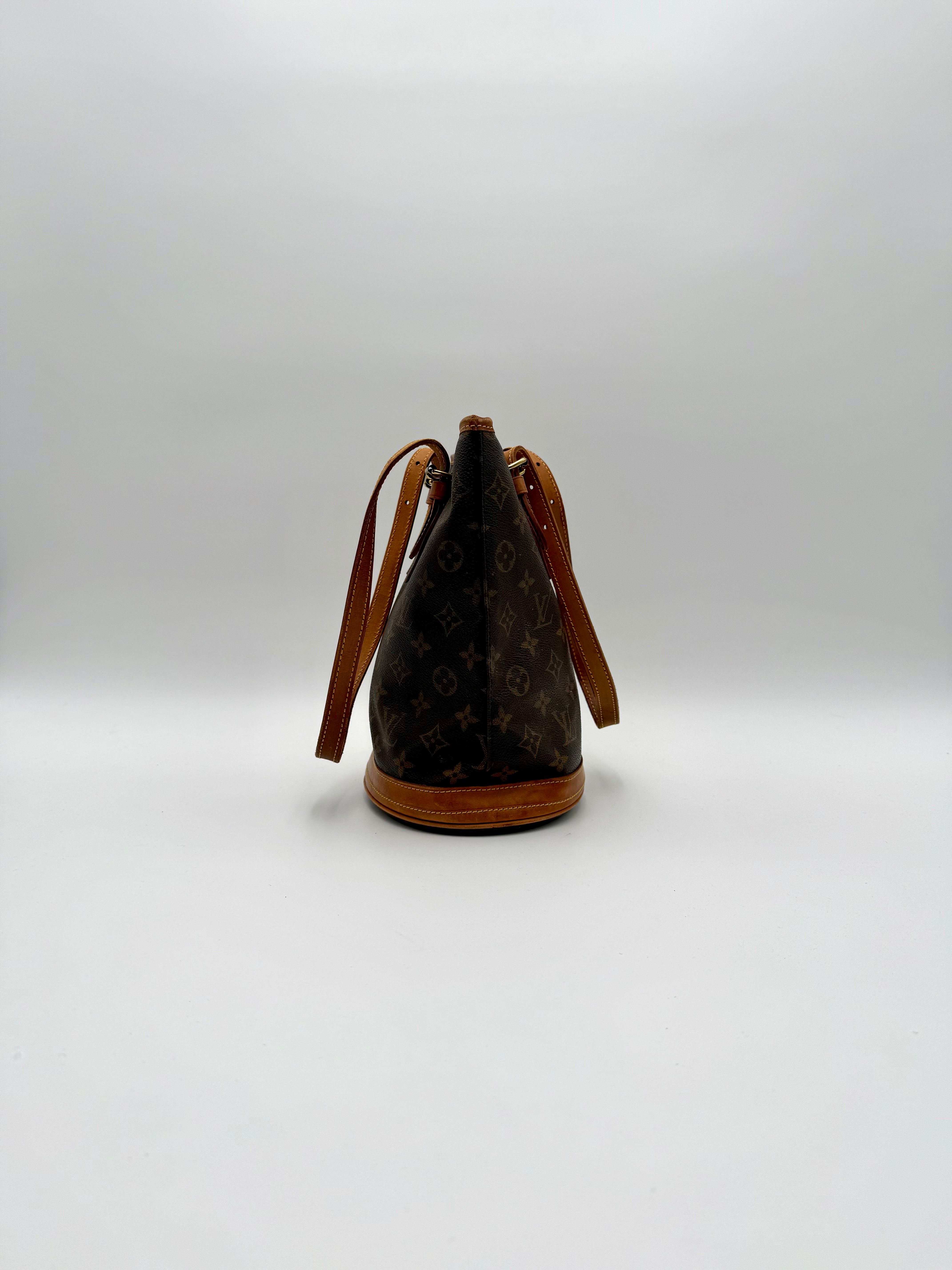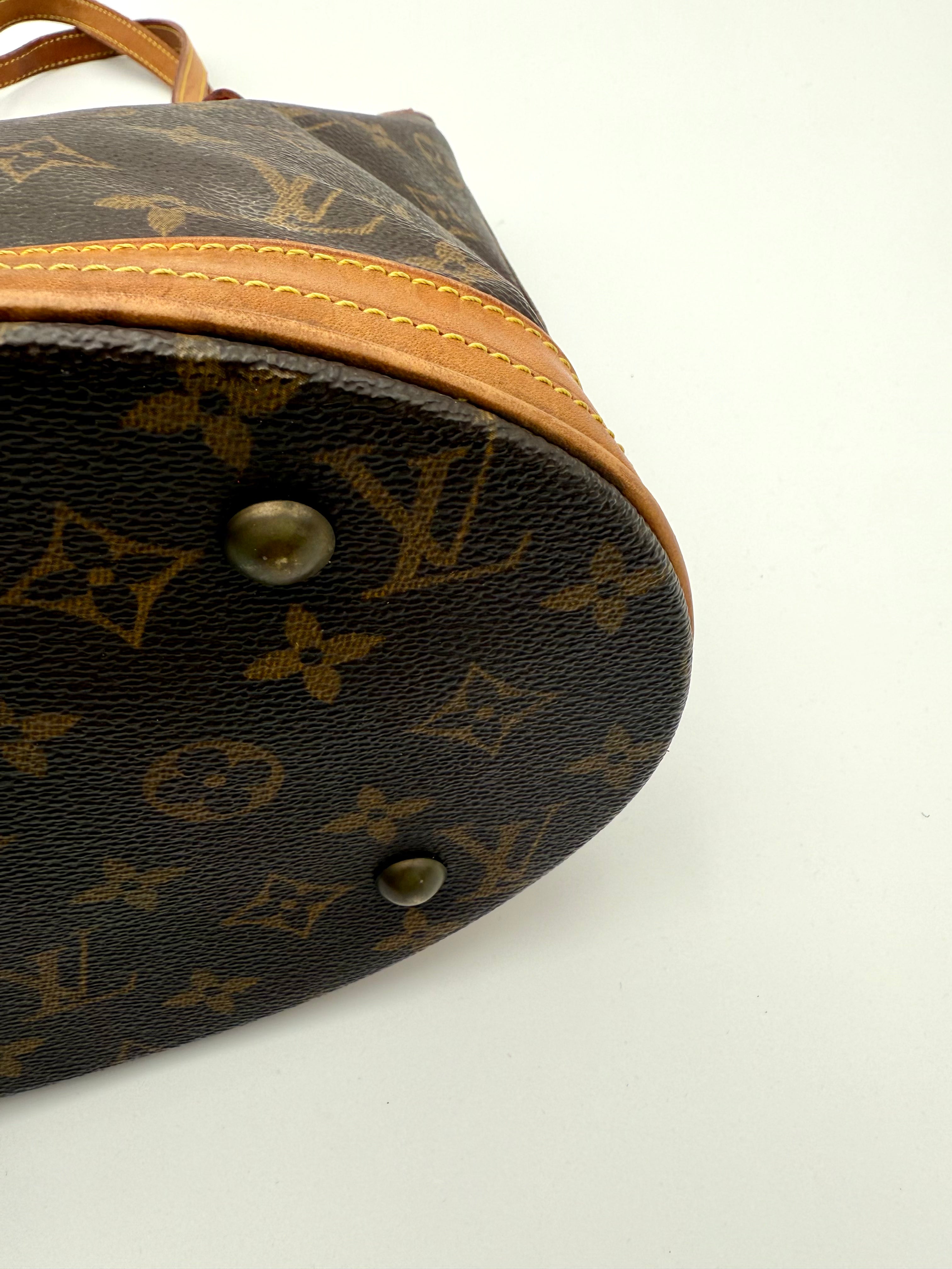 Tweedehands LOUIS VUITTON Monogram bucket PM bag en gouden hardware. De perfecte alledaagse tas! De tas heeft twee binnenvakjes waarvan één met rits en een gouden sleutelketting. Het item verkeert in een zeer goede vintage staat, met algemene gebruikssporen. De tas wordt geleverd in onze mooie Moon flower dustbag.