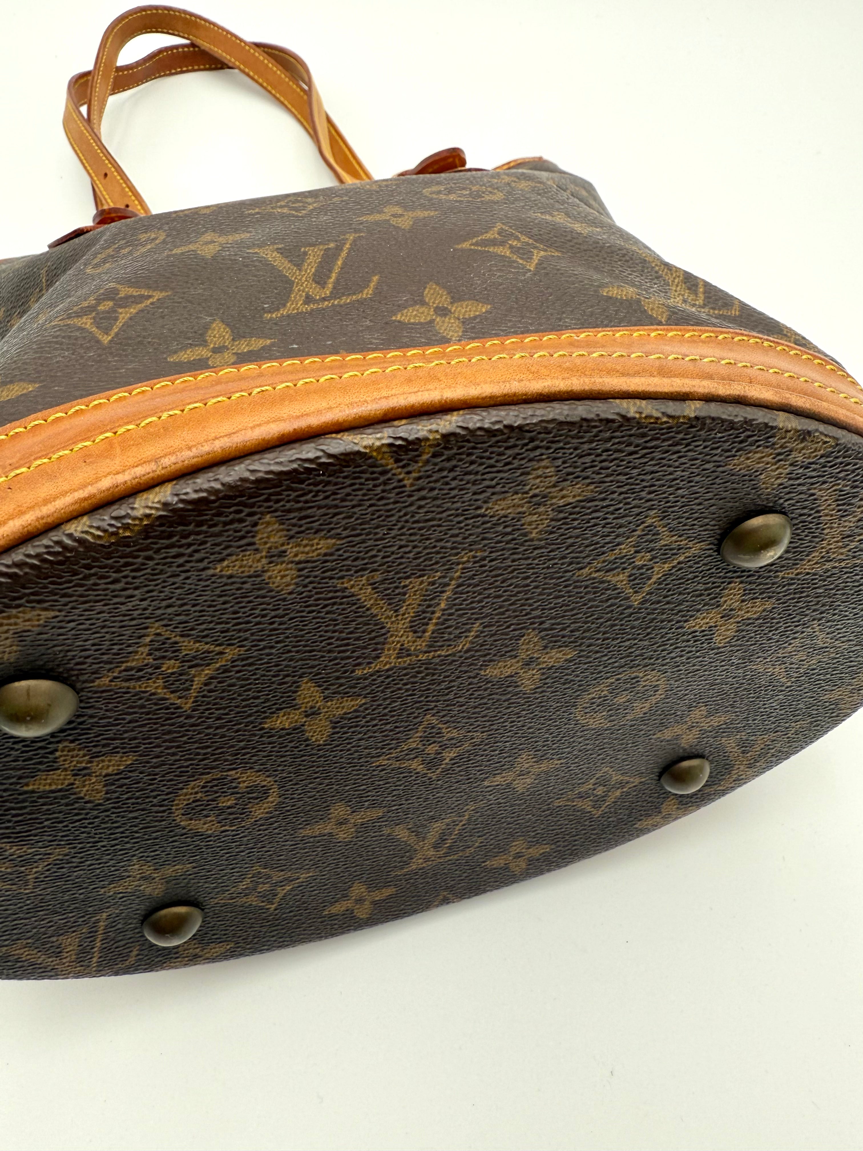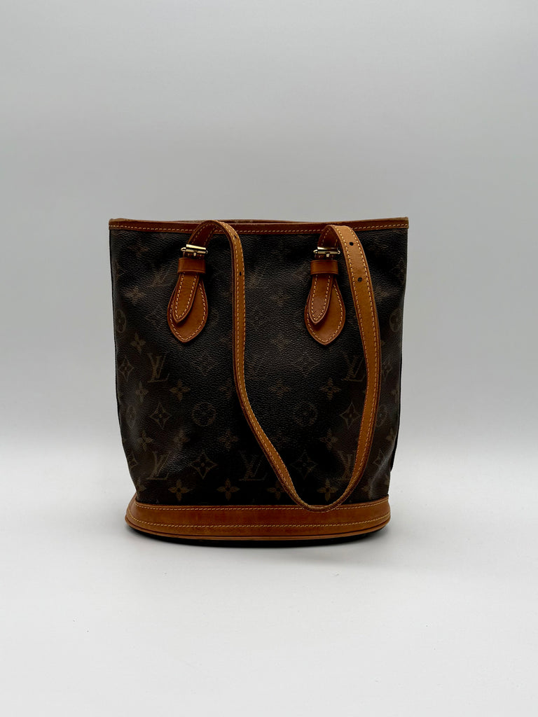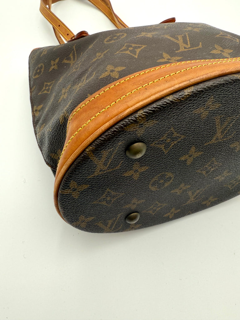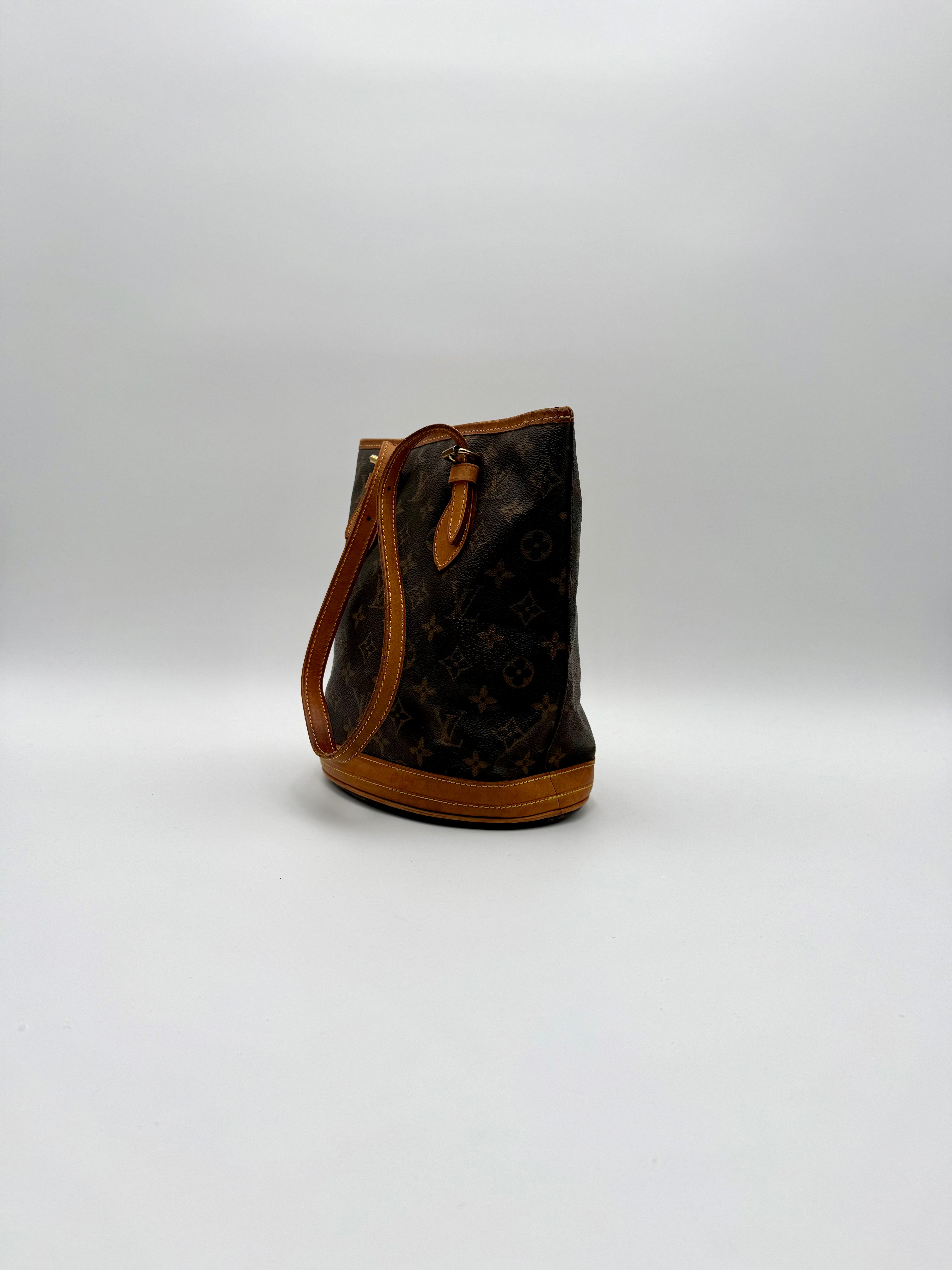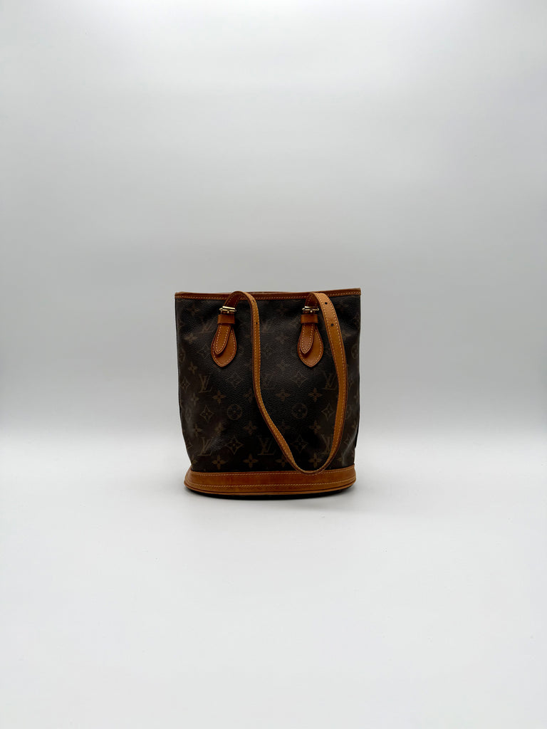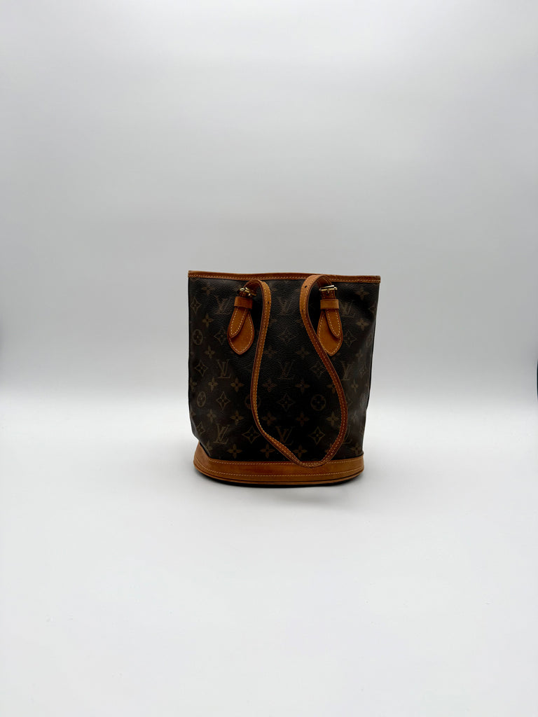 Tweedehands LOUIS VUITTON Monogram bucket PM bag en gouden hardware. De perfecte alledaagse tas! De tas heeft twee binnenvakjes waarvan één met rits en een gouden sleutelketting. Het item verkeert in een zeer goede vintage staat, met algemene gebruikssporen. De tas wordt geleverd in onze mooie Moon flower dustbag.
