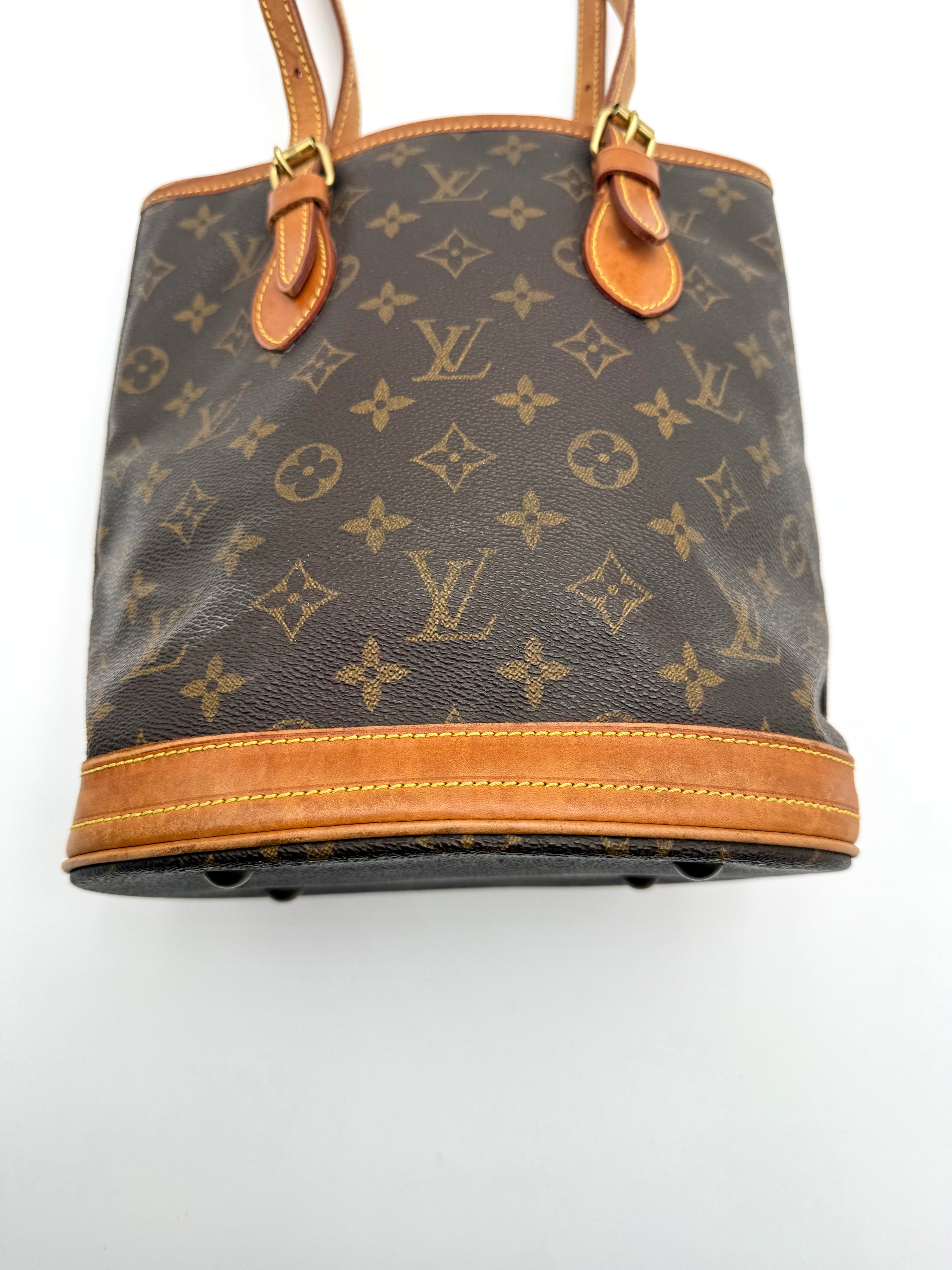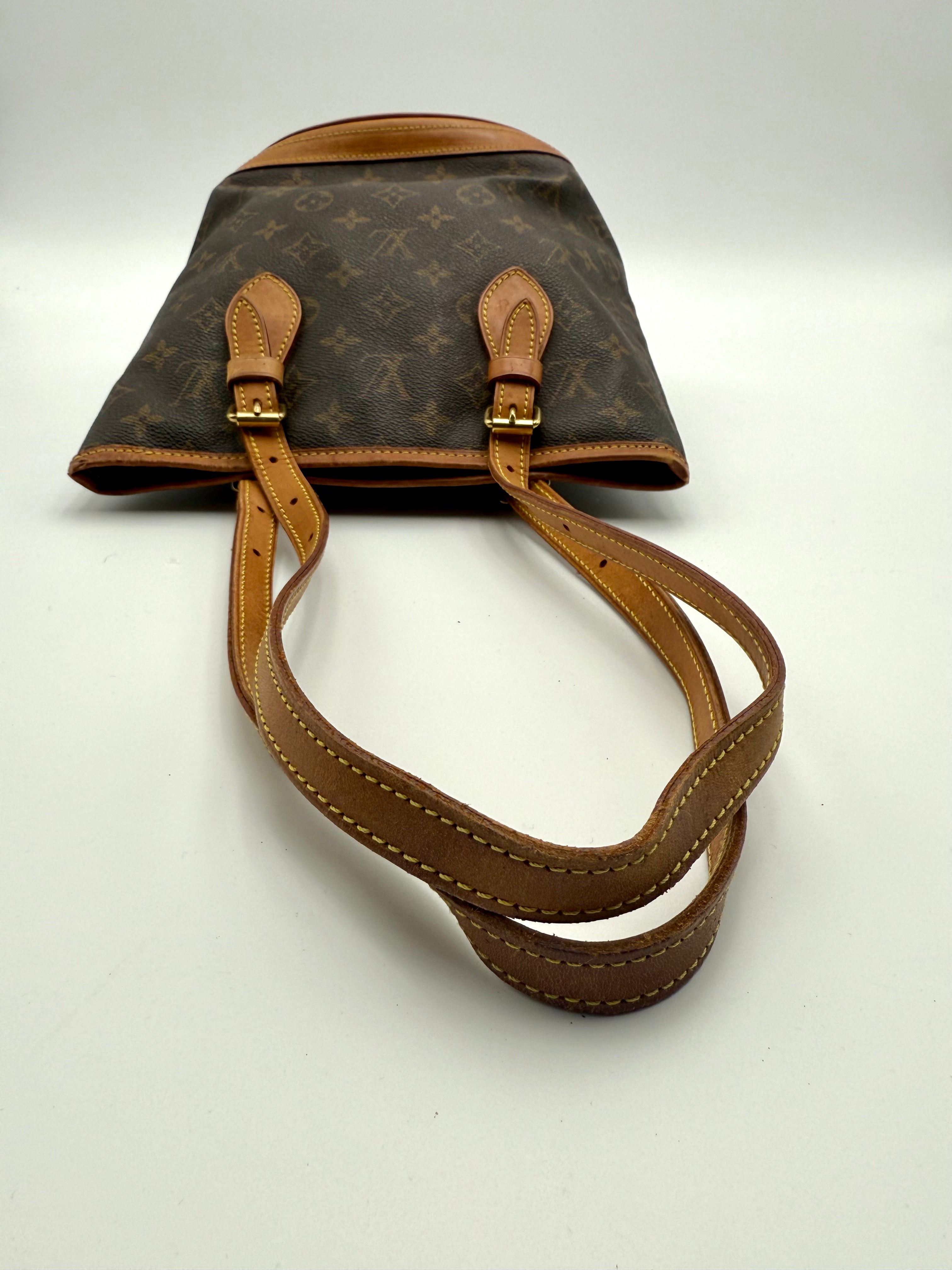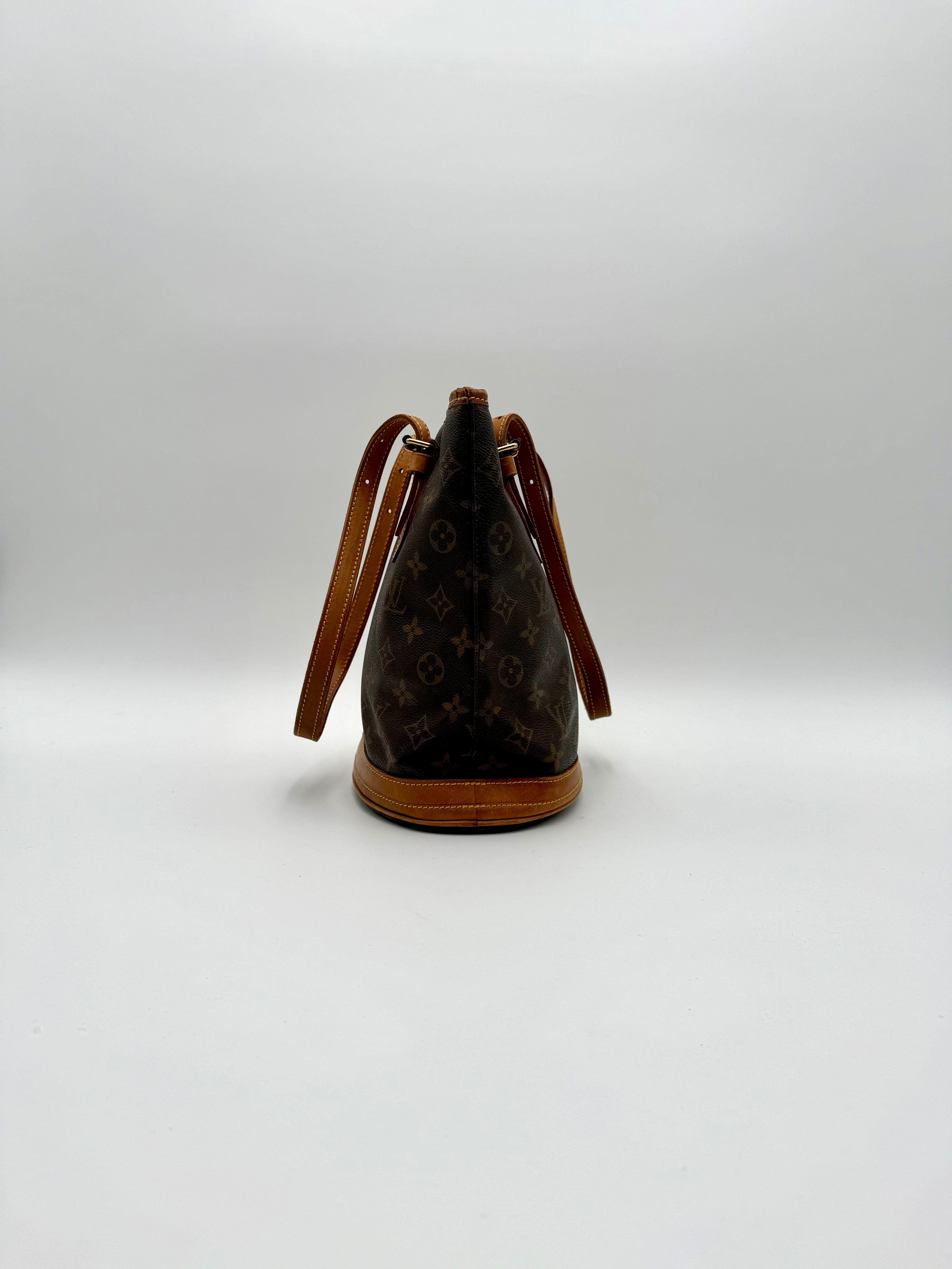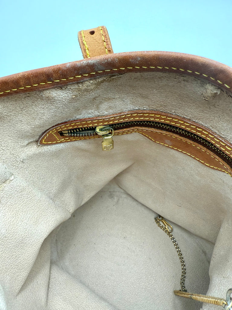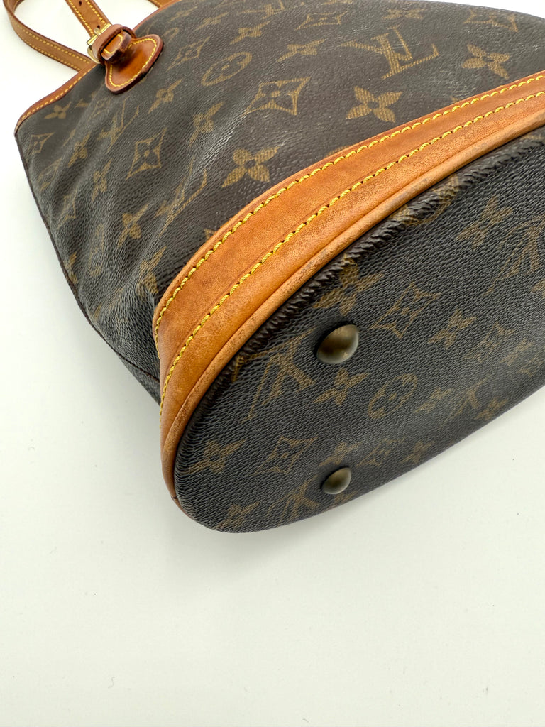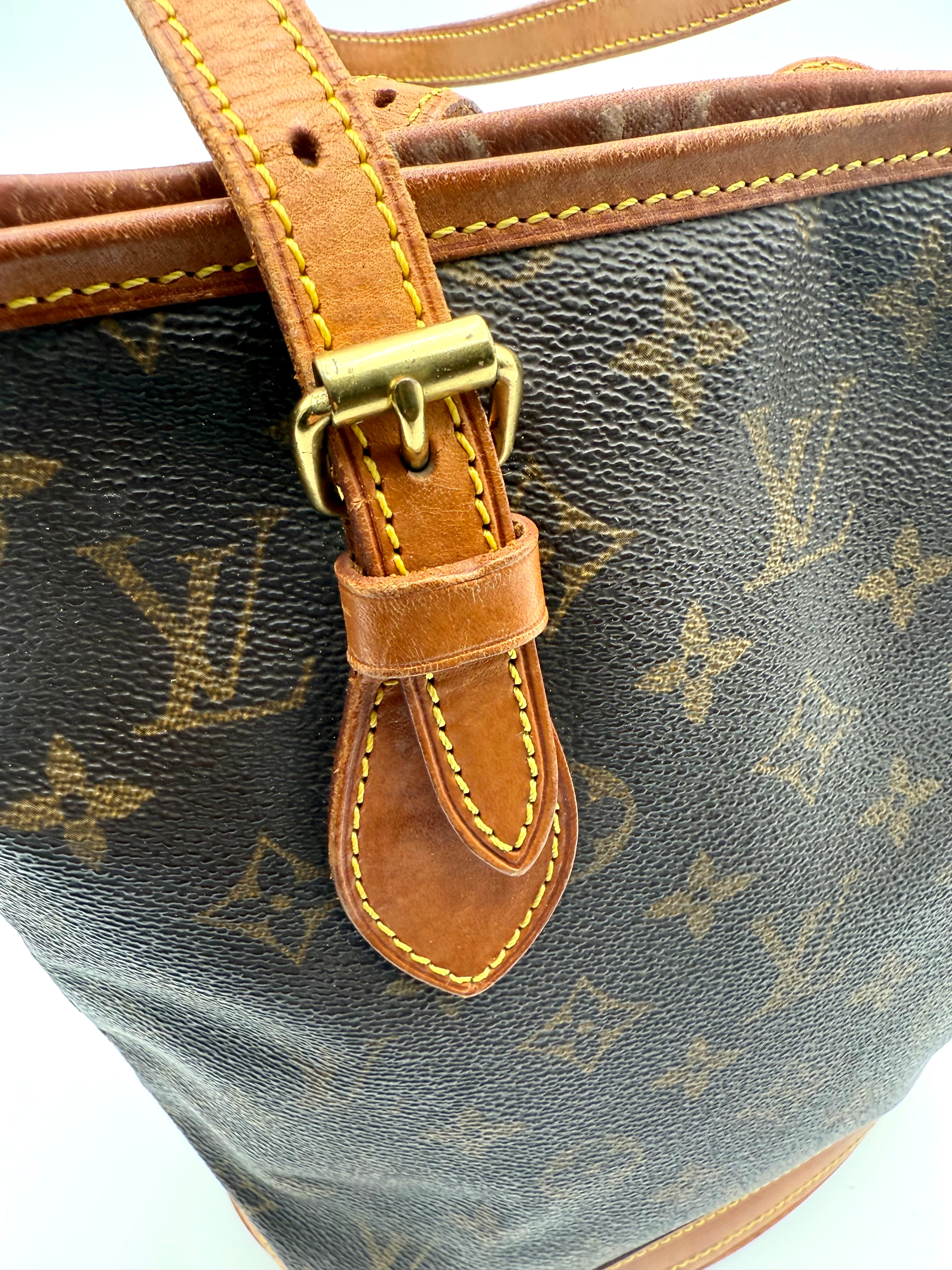 Tweedehands LOUIS VUITTON Monogram bucket PM bag en gouden hardware. De perfecte alledaagse tas! De tas heeft twee binnenvakjes waarvan één met rits en een gouden sleutelketting. Het item verkeert in een zeer goede vintage staat, met algemene gebruikssporen. De tas wordt geleverd in onze mooie Moon flower dustbag.