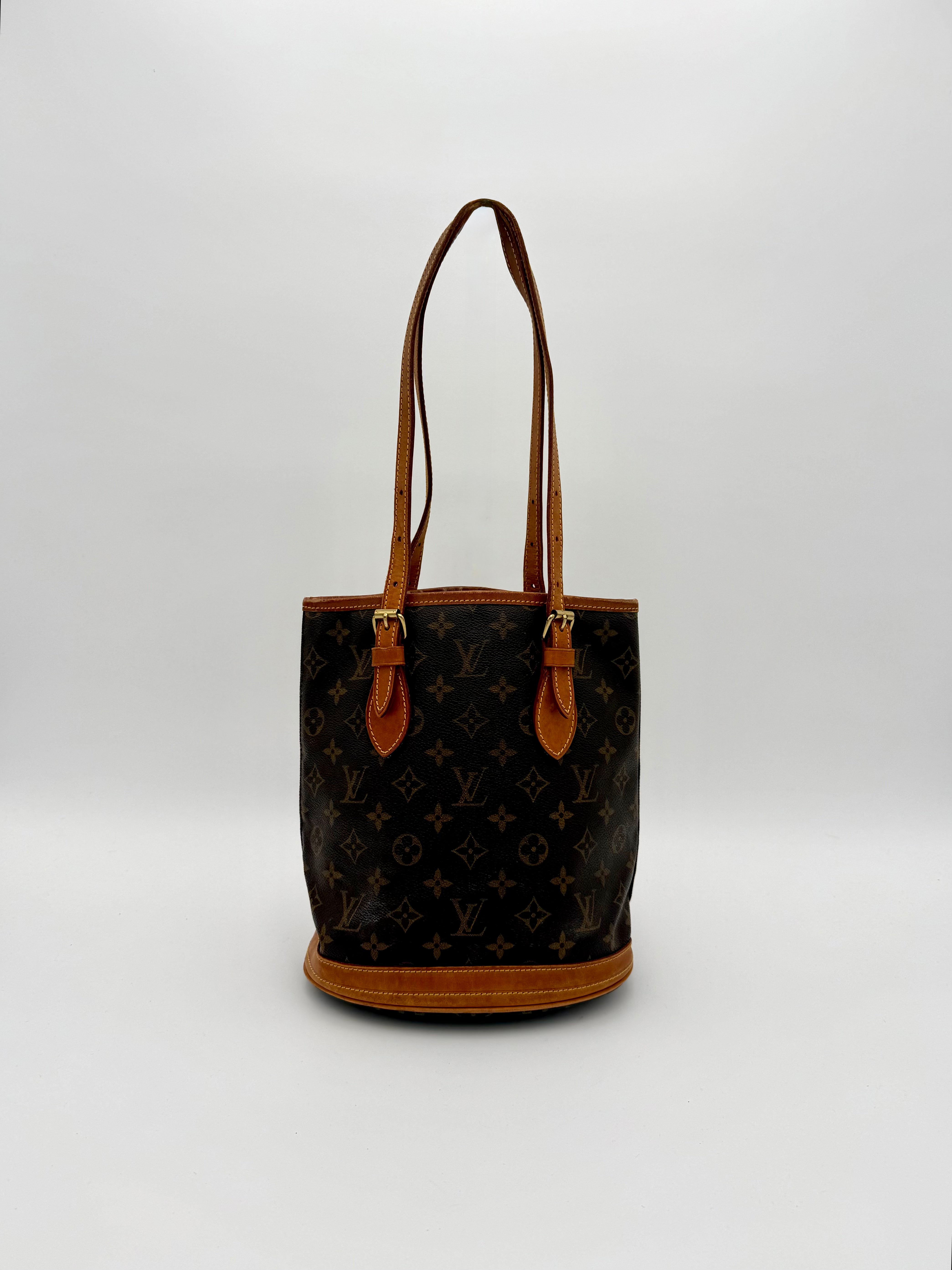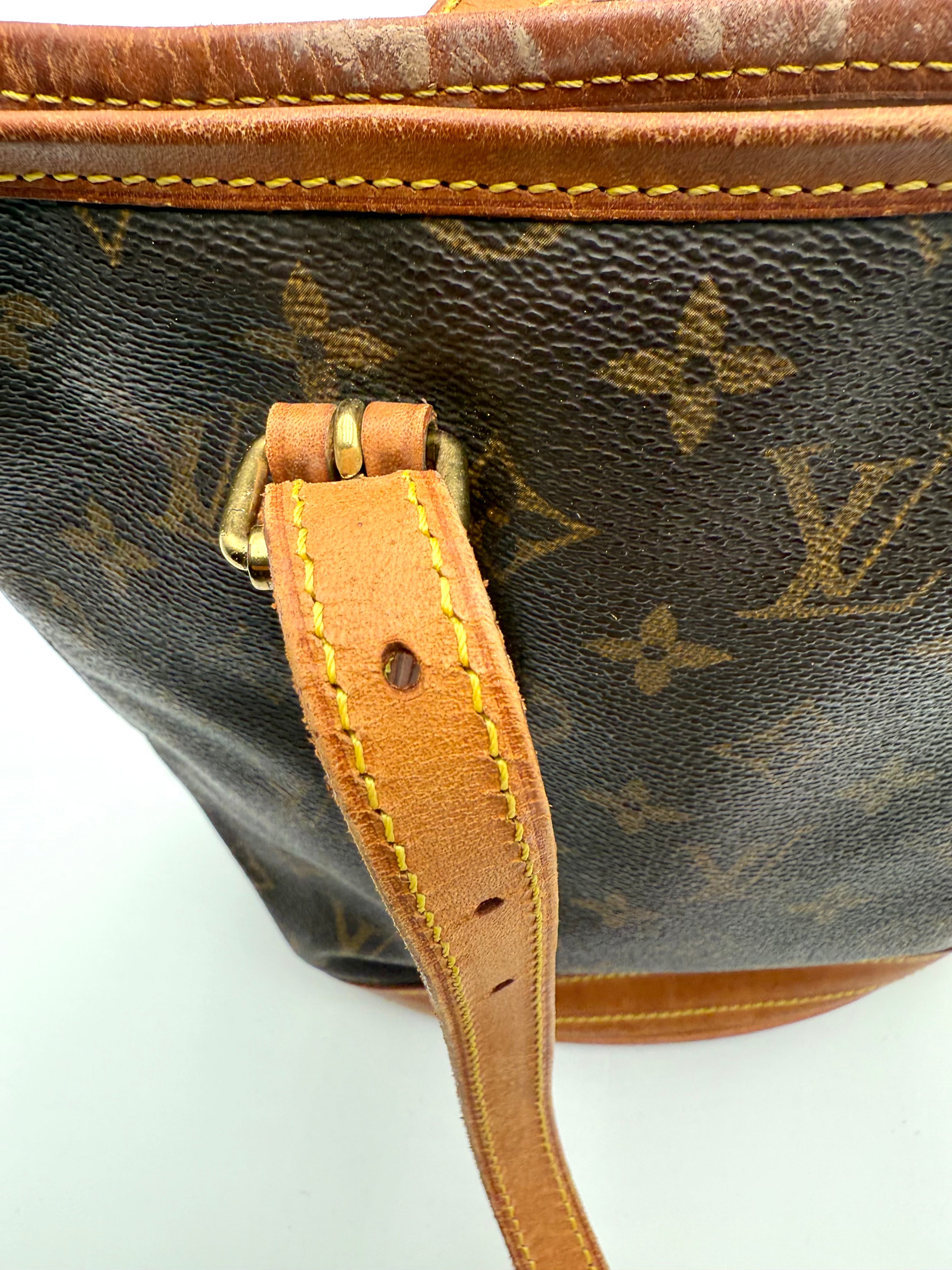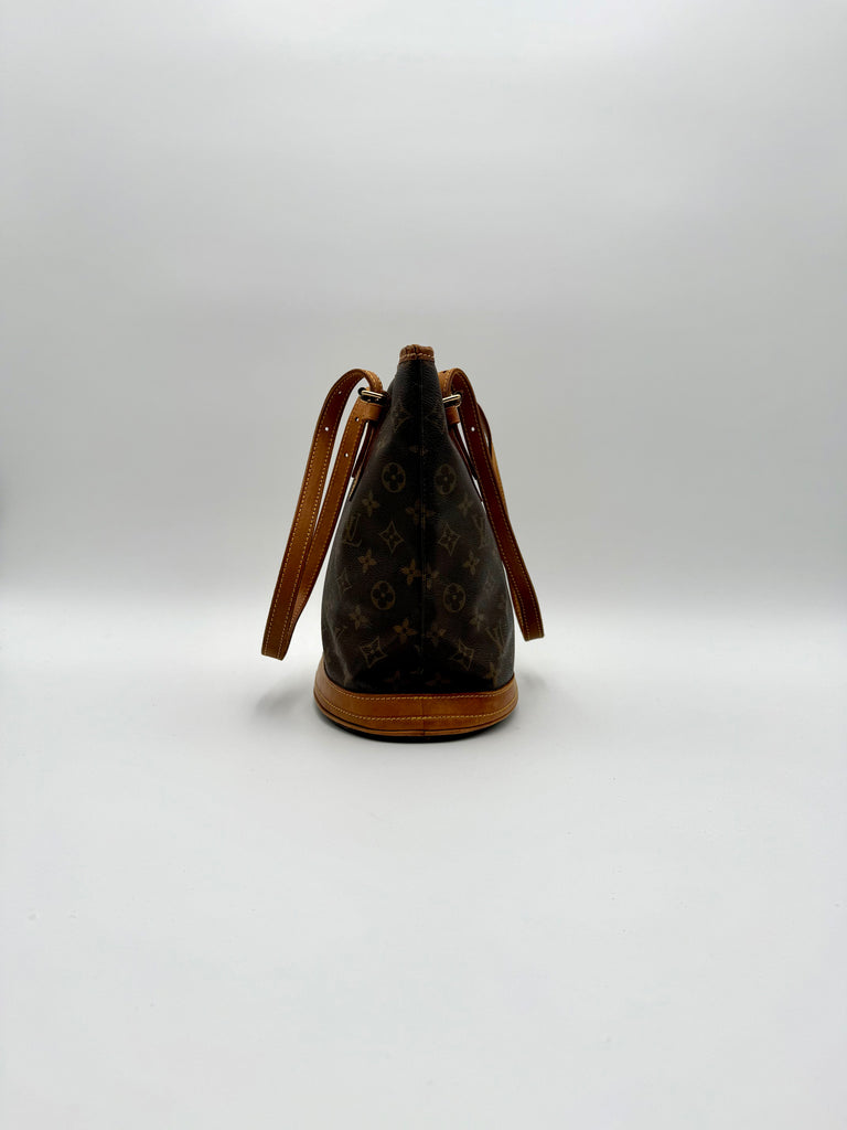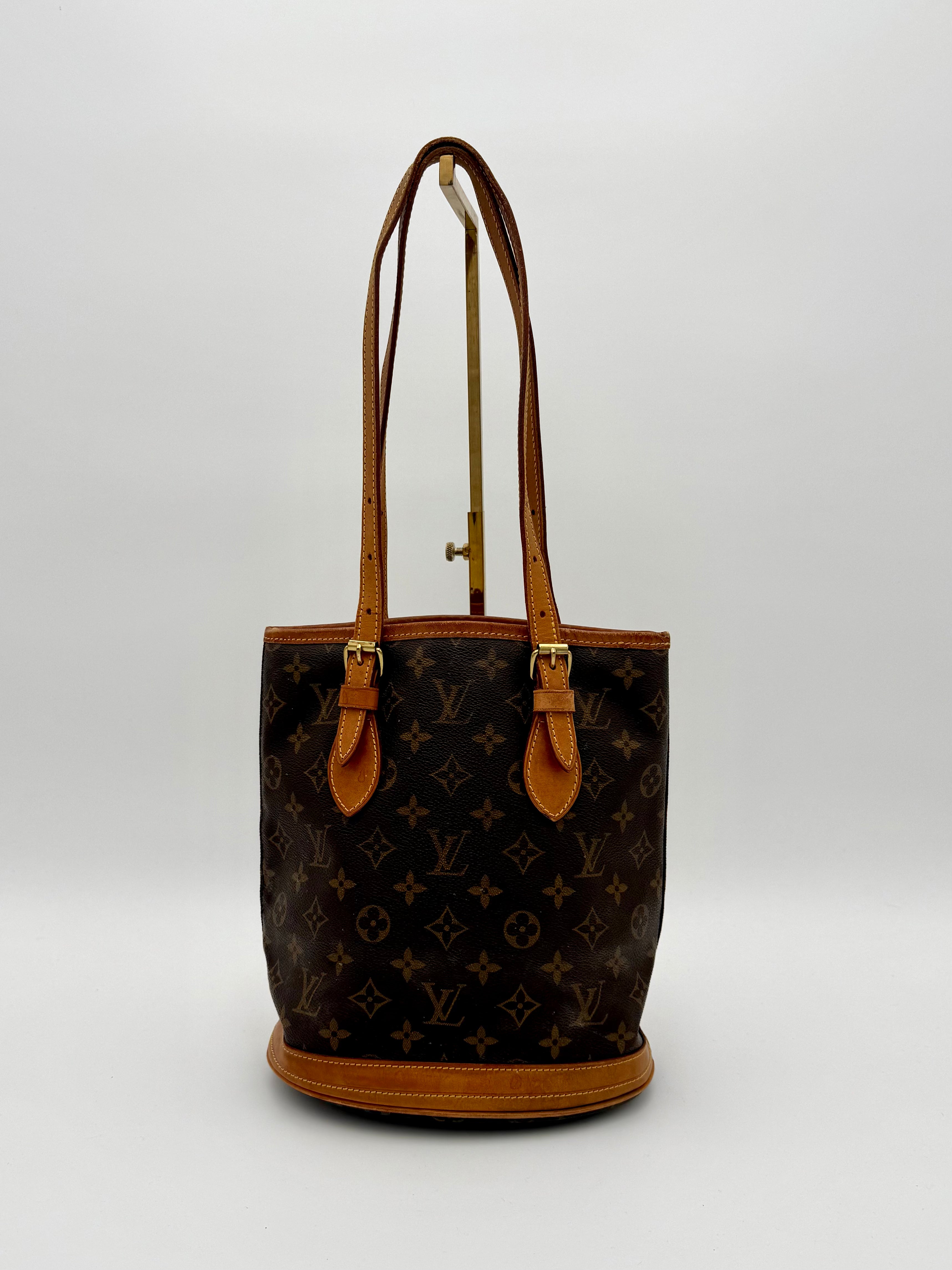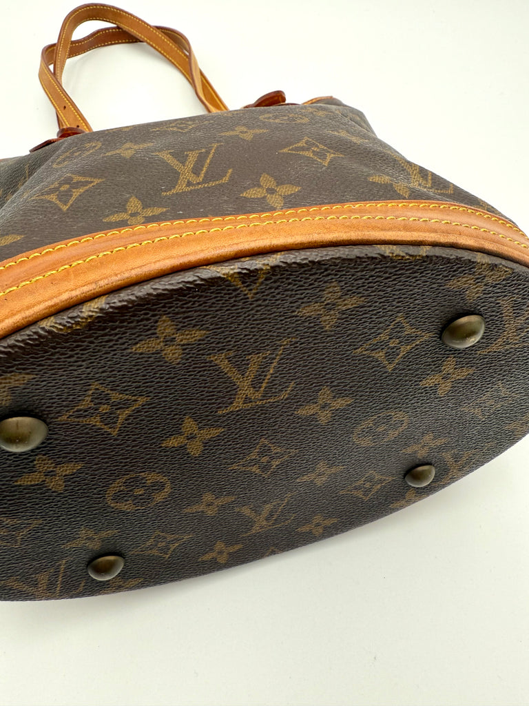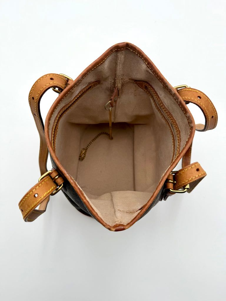 Tweedehands LOUIS VUITTON Monogram bucket PM bag en gouden hardware. De perfecte alledaagse tas! De tas heeft twee binnenvakjes waarvan één met rits en een gouden sleutelketting. Het item verkeert in een zeer goede vintage staat, met algemene gebruikssporen. De tas wordt geleverd in onze mooie Moon flower dustbag.