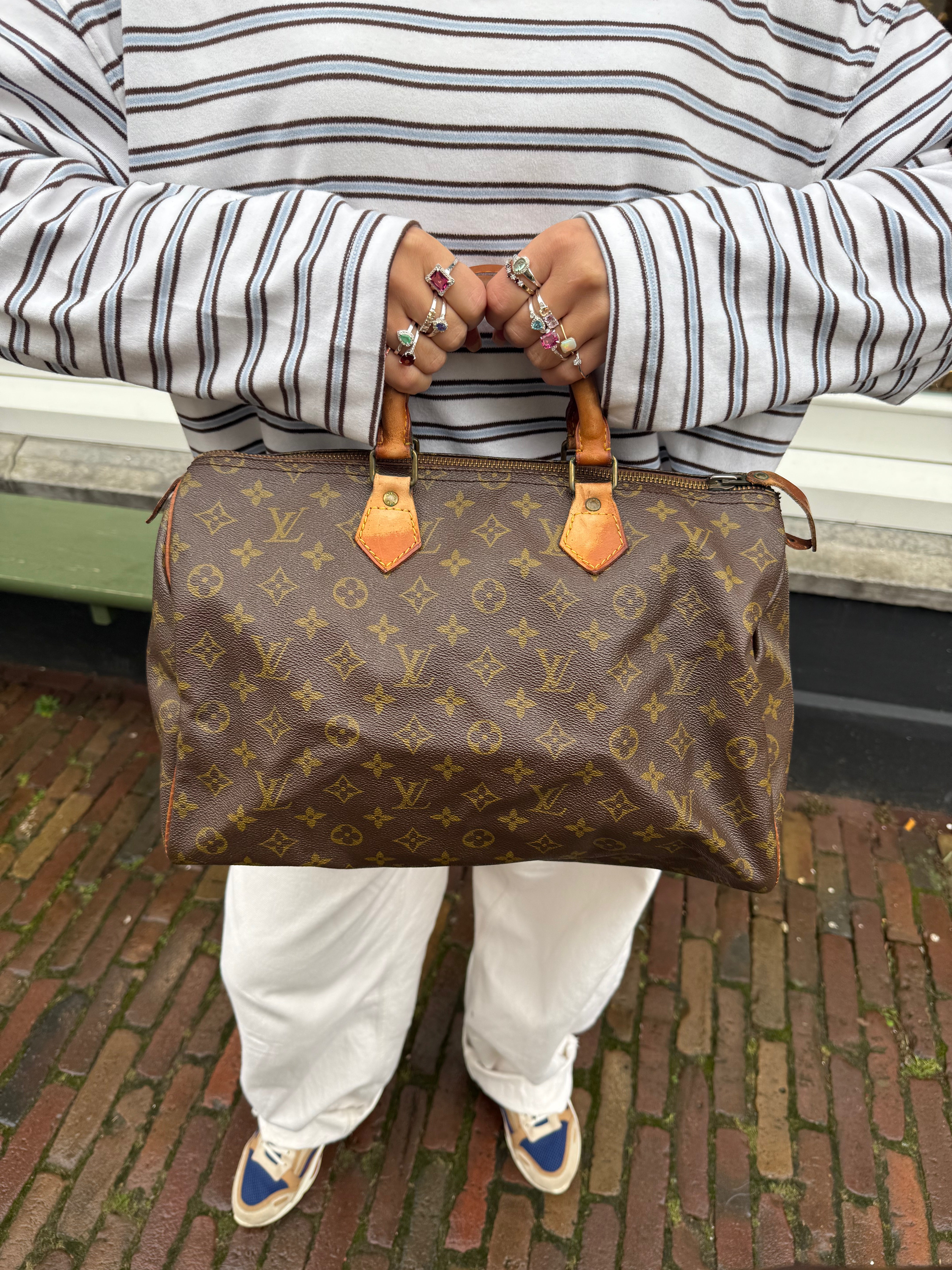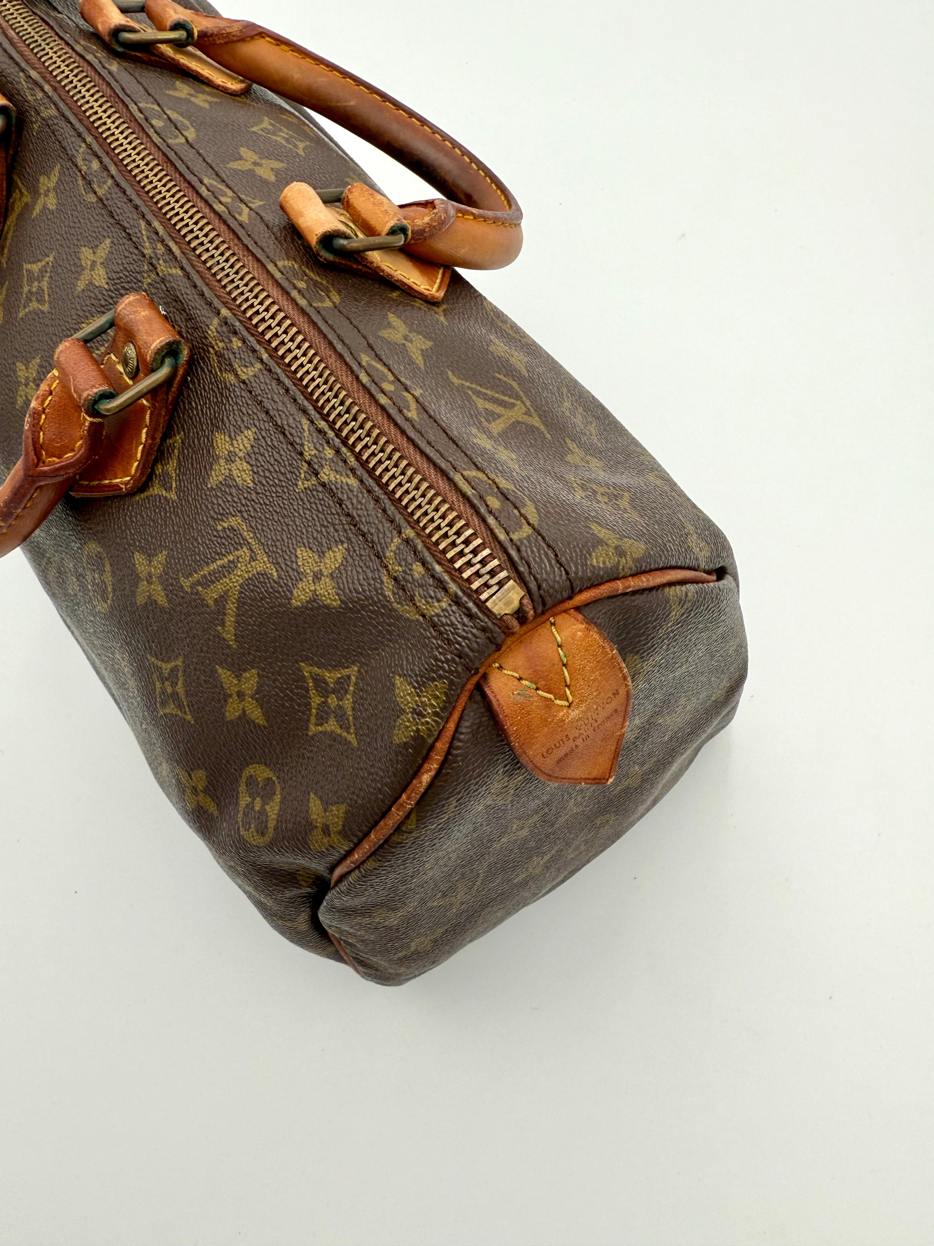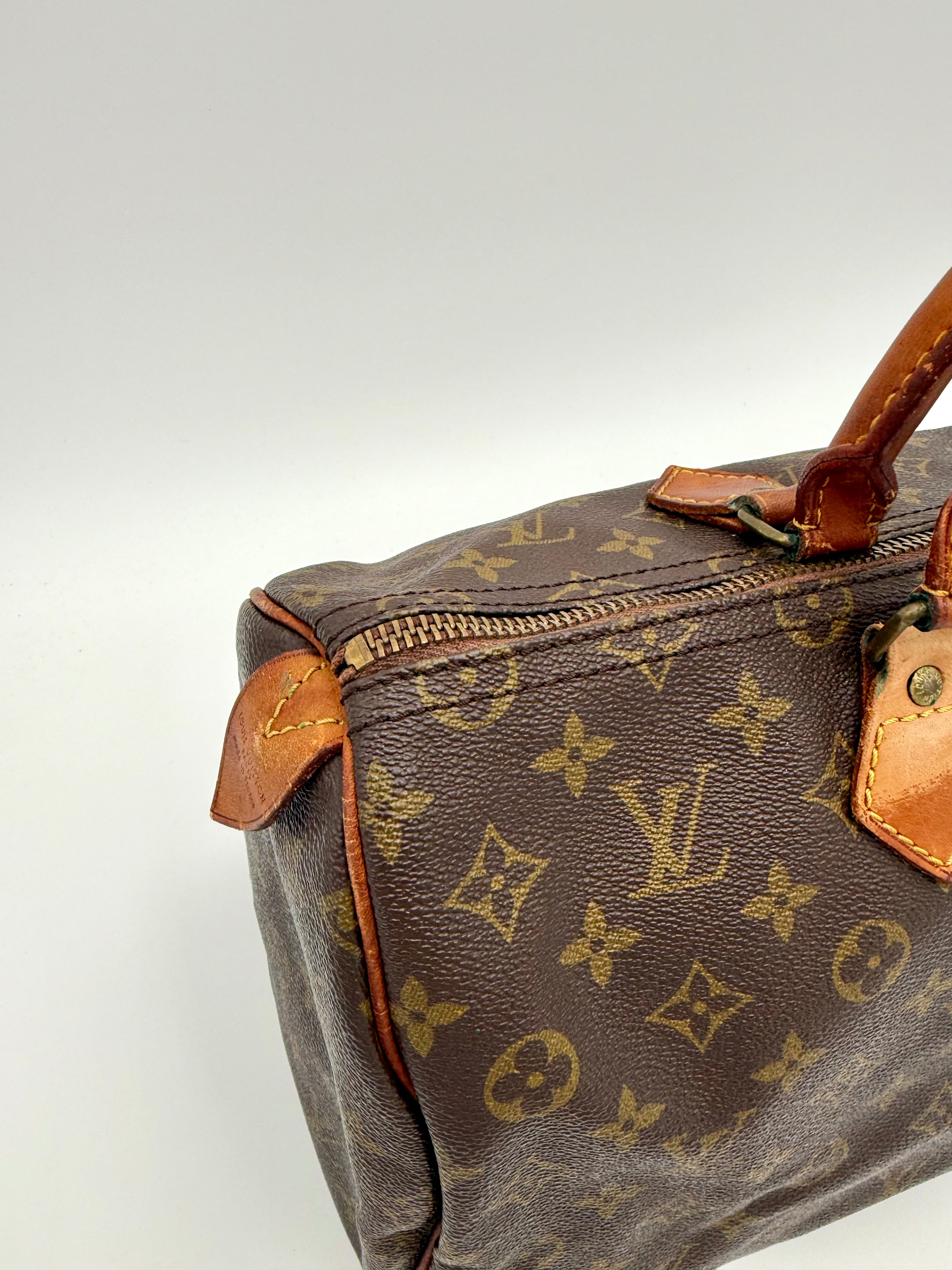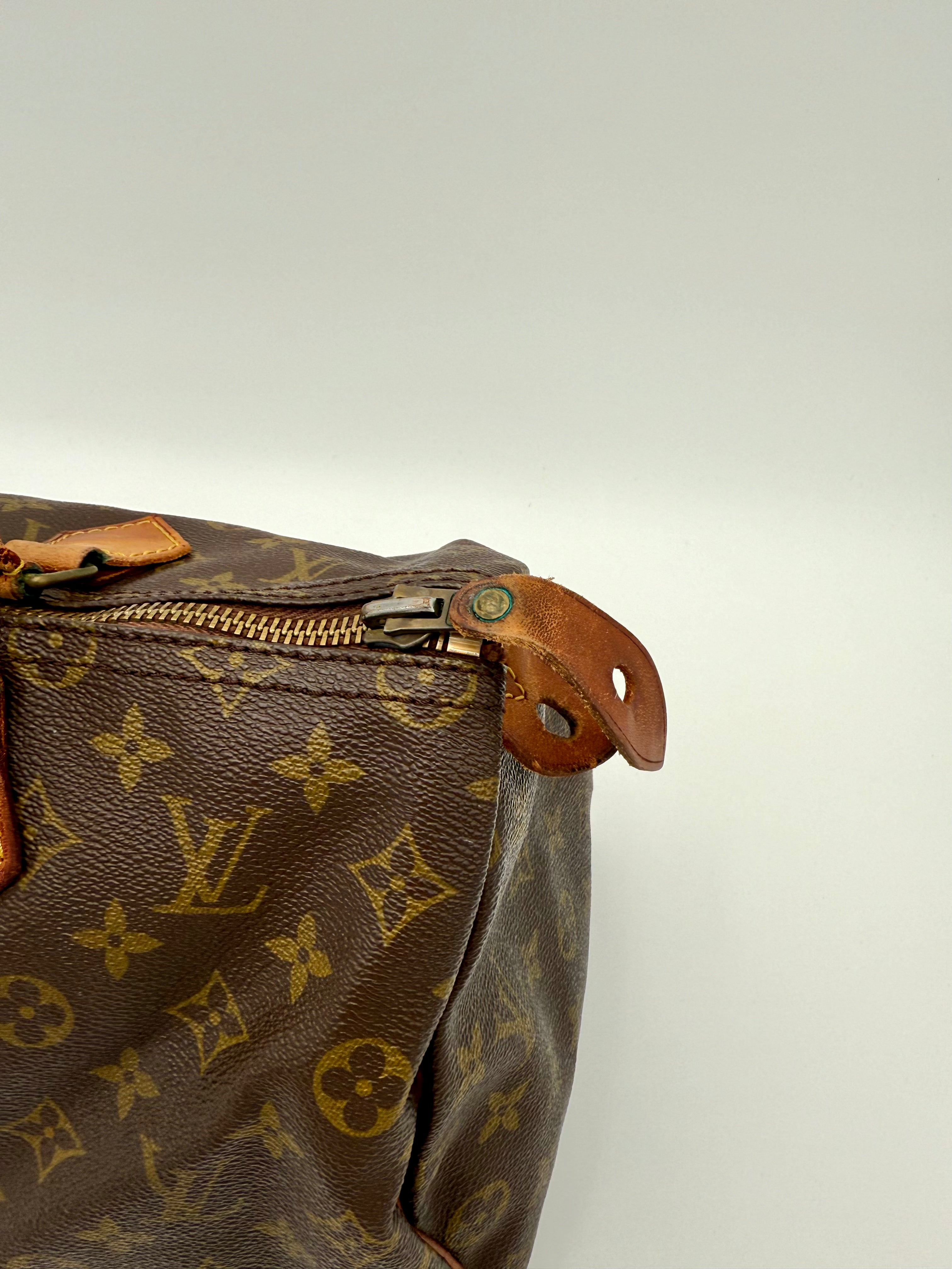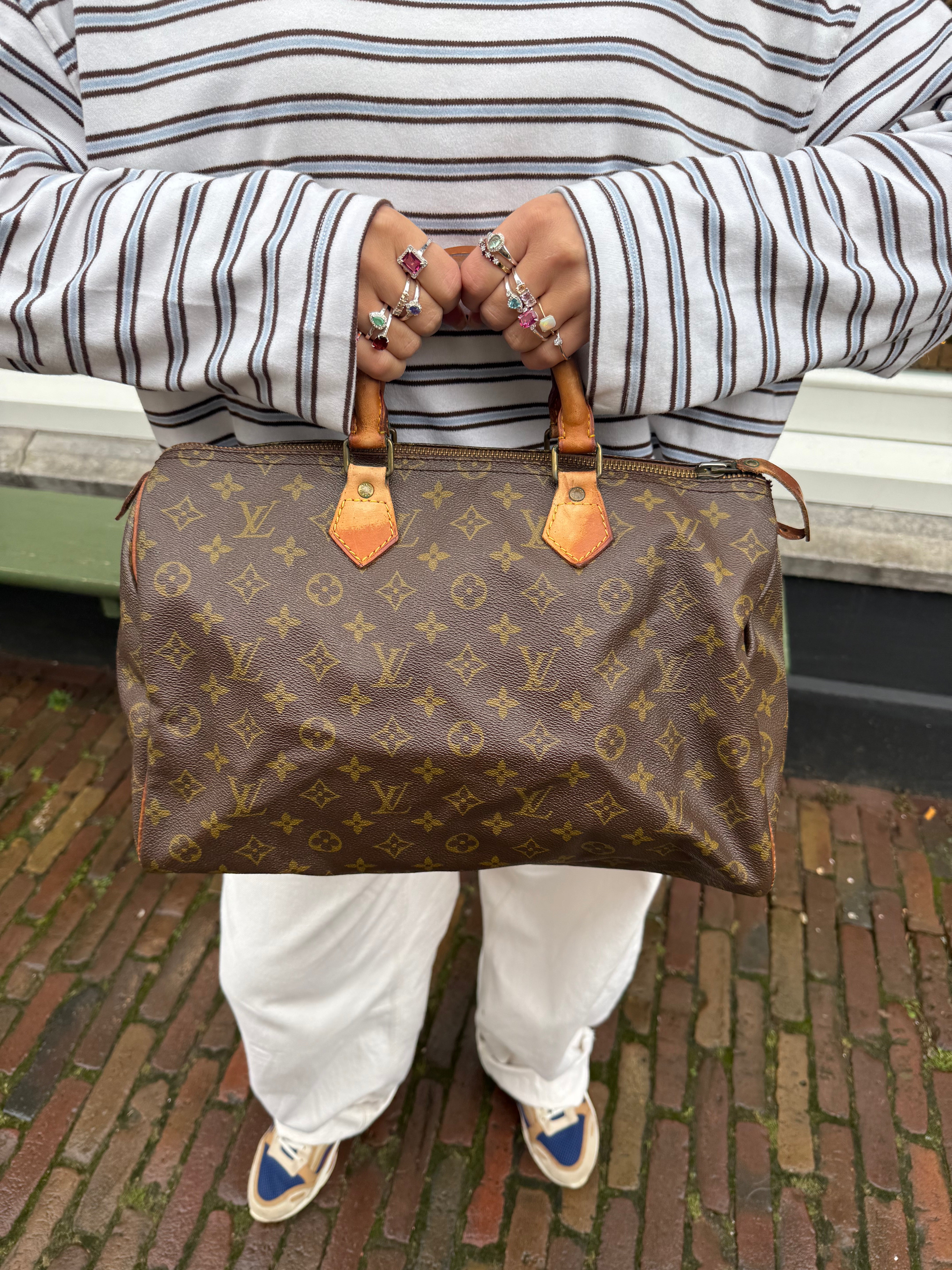 Tweedehands LOUIS VUITTON Monogram Speedy 35 bag en gouden hardware. Er past een kleine laptop in de tas en hij sluit met een rits. Het item verkeert in een vintage staat, met algemene gebruikssporen. De tas wordt geleverd in onze mooie Moon flower dustbag.