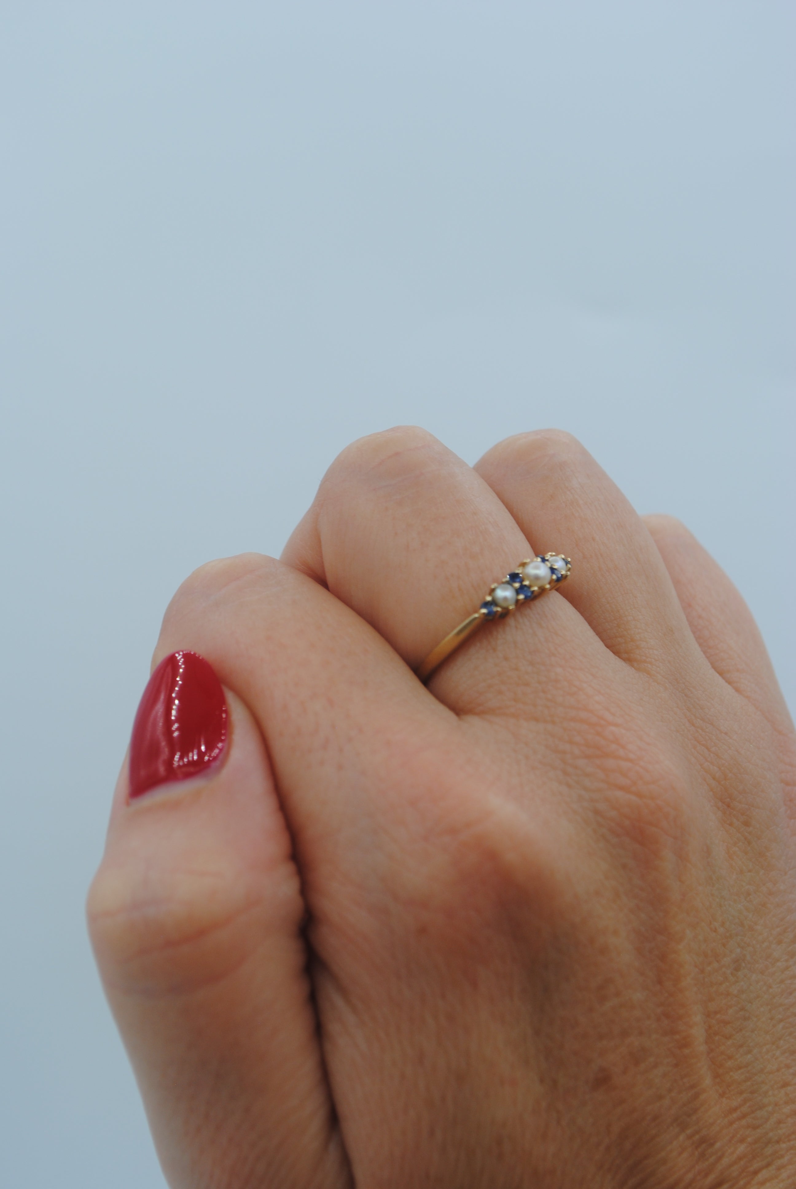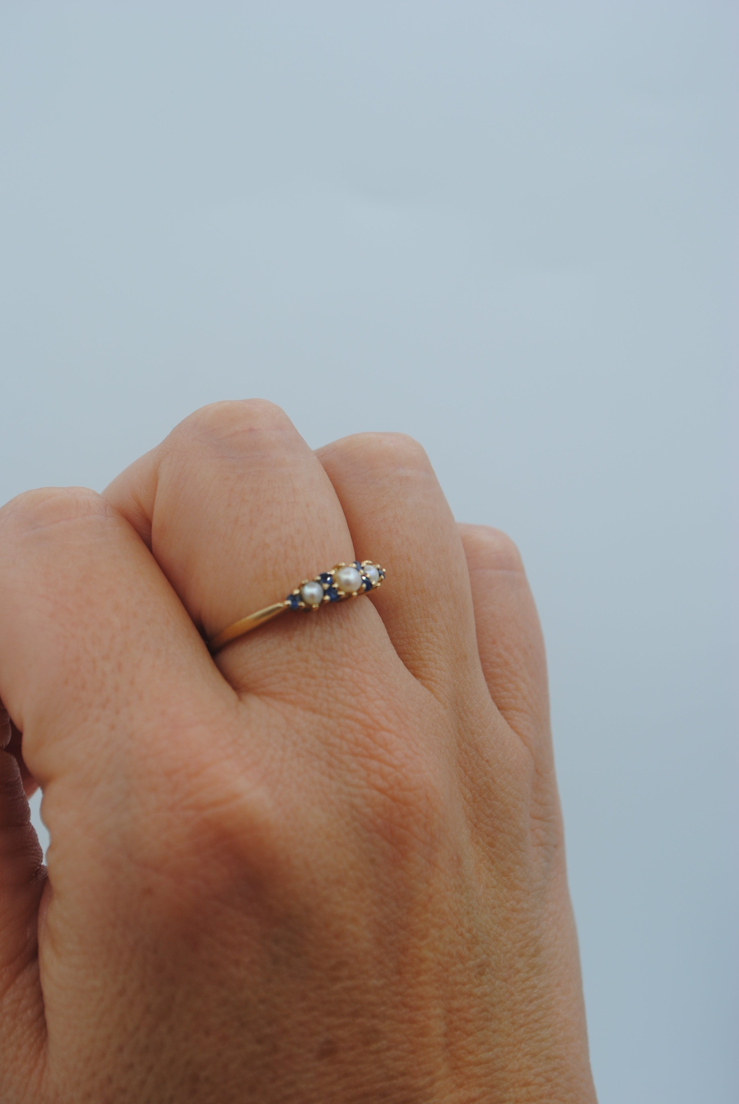 Vintage 9k ring met saffier & parel